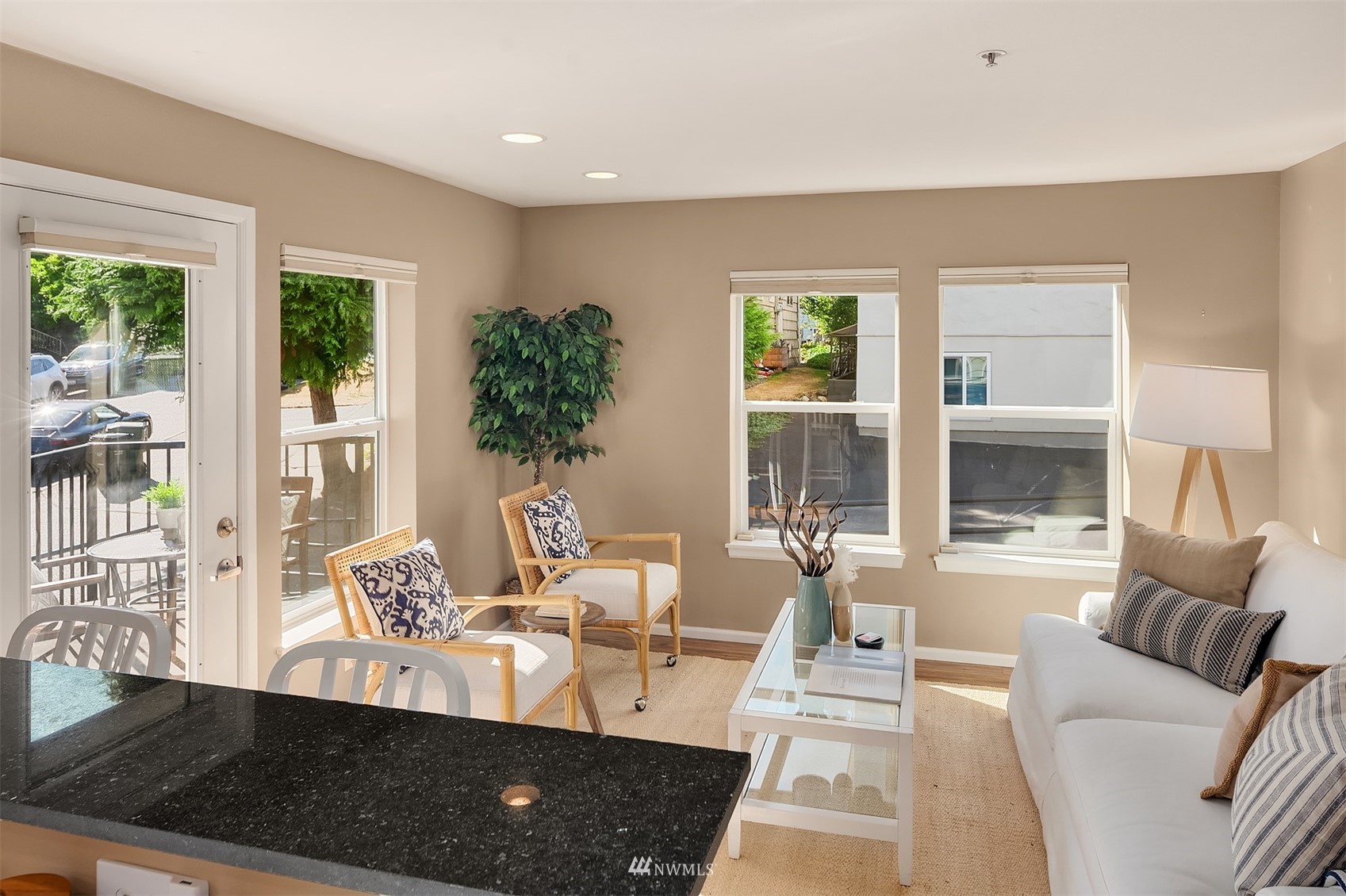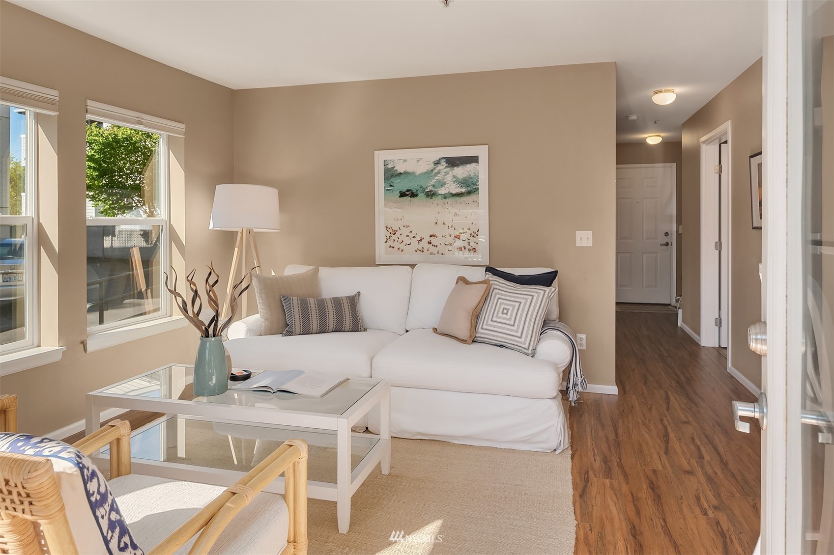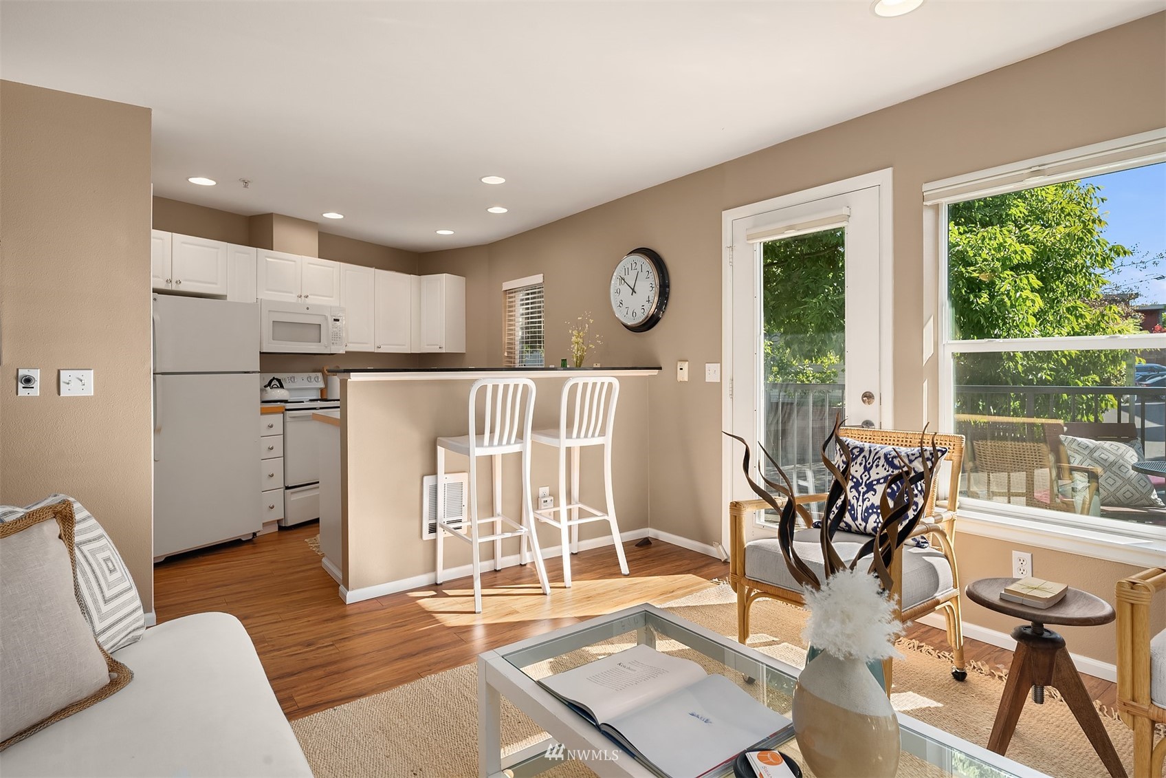 The perfect unit in the perfect Green lake neighborhood - This level accessible bright, airy corner unit is just blocks to the Lake, and around the corner from Tangle Town Zoka coffee, sushi, local pubs, Mighty-O donuts, & corner market. One bedroom w/closet built-ins, full bathroom, New W/D, open kitchen w/ bar seating, open living room + your own private balcony to enjoy. Bus & bike friendly area. Secure building & garage with assigned parking and dedicated storage. Secure entry & side door level access in rear of bldg right next to unit. Clean and move in ready - don't miss this one !