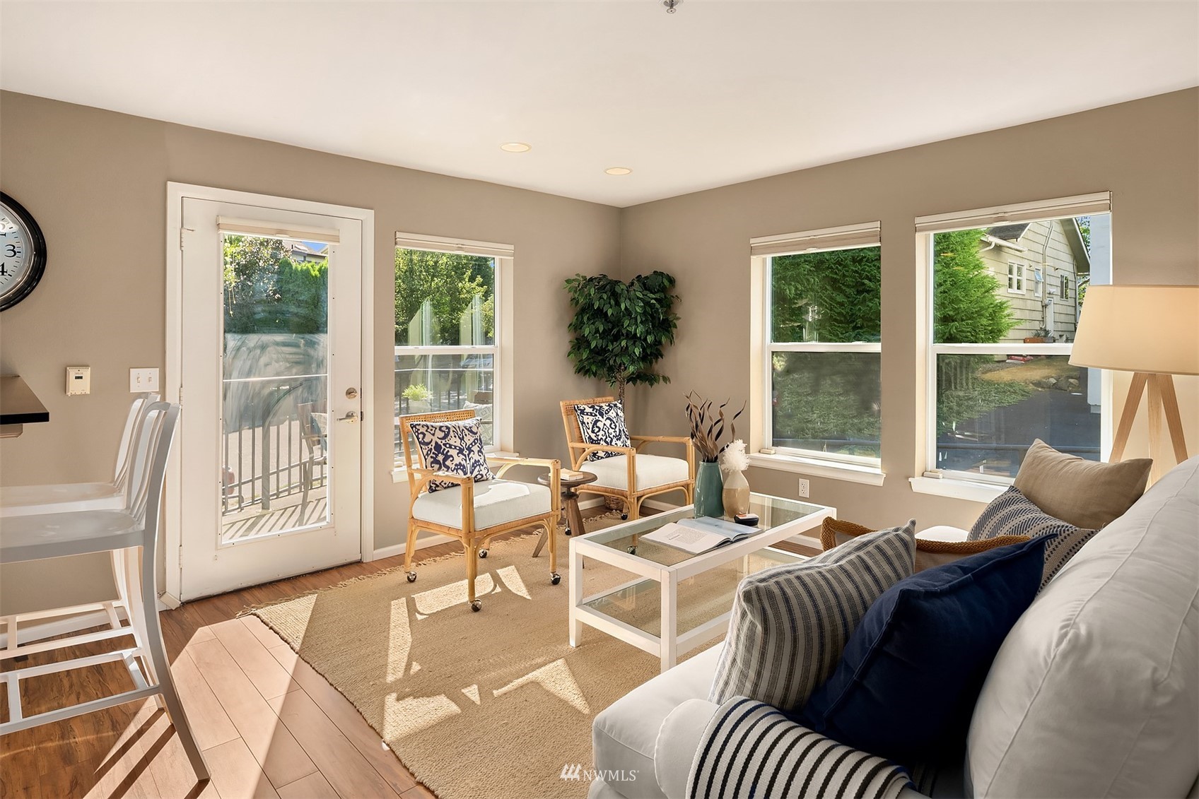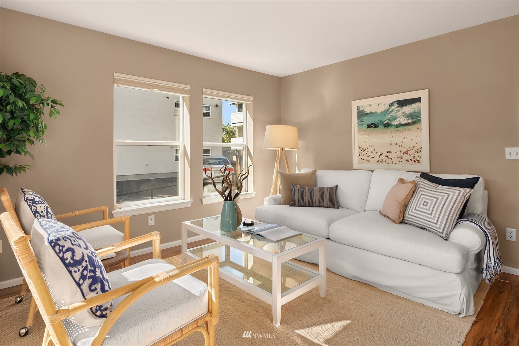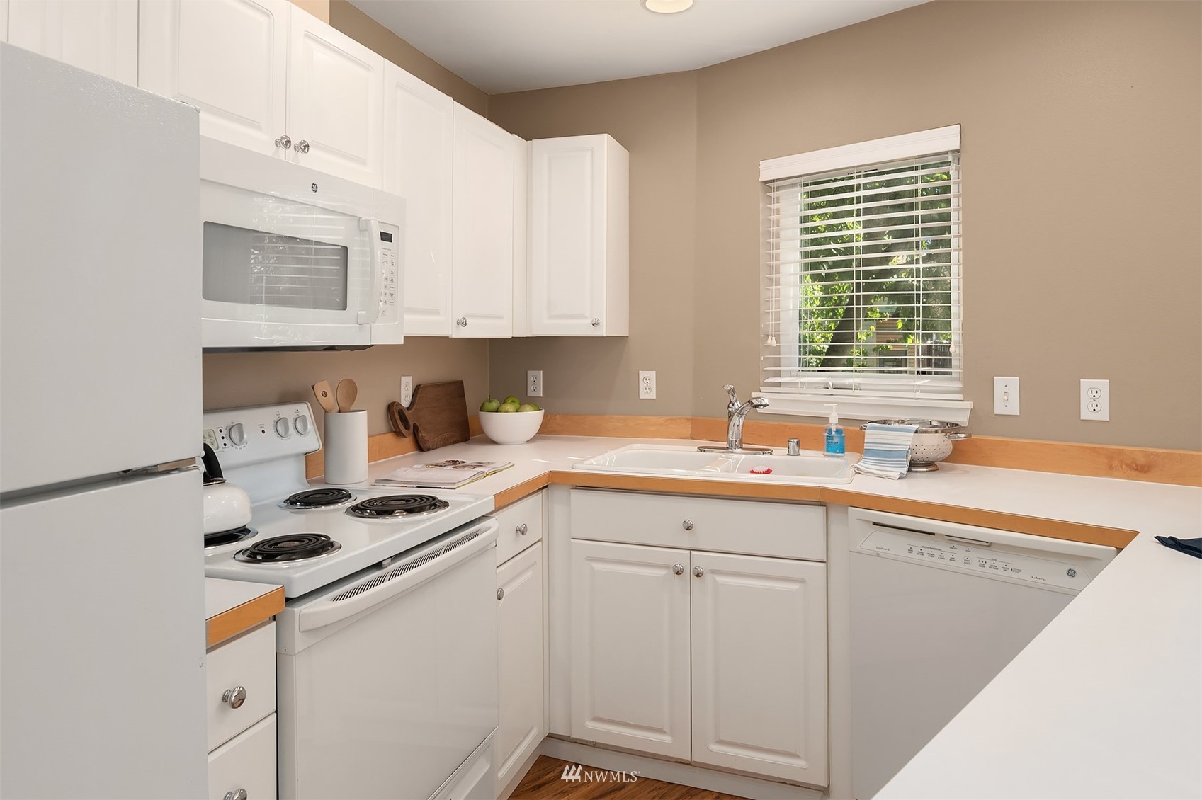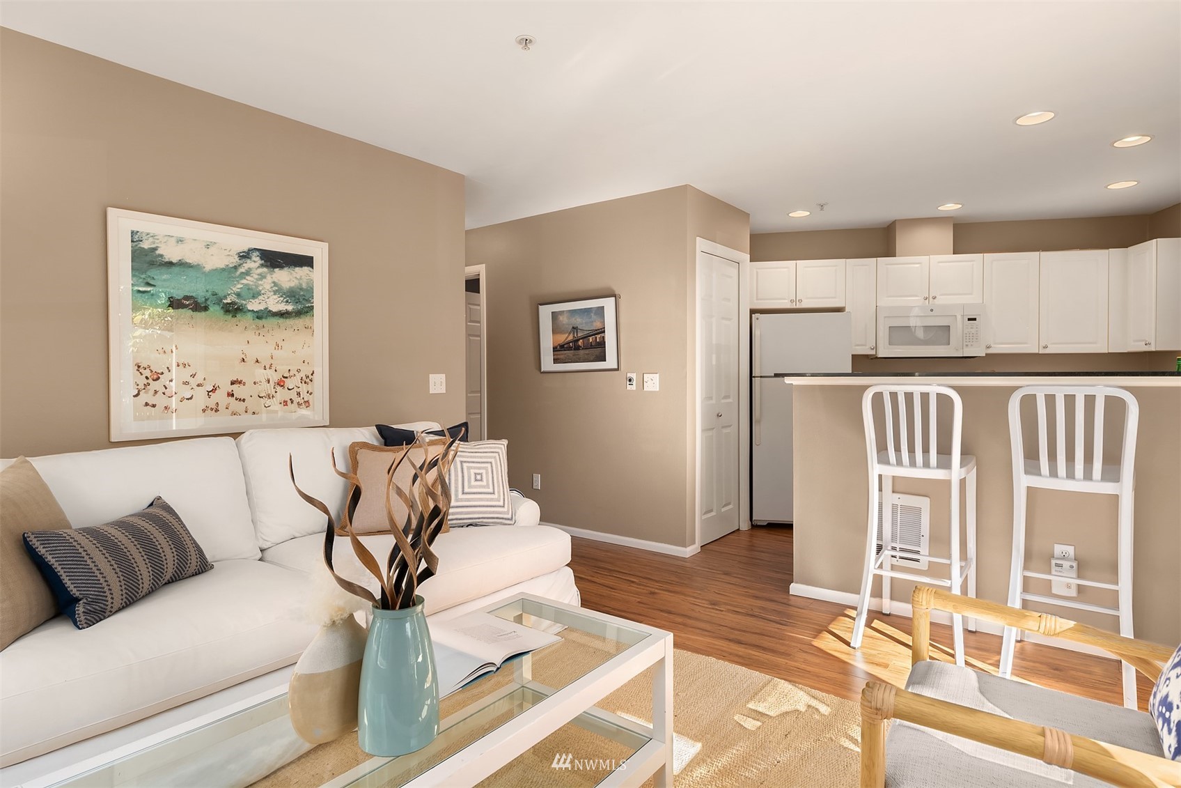 The perfect unit in the perfect Green lake neighborhood - This level accessible bright, airy corner unit is just blocks to the Lake, and around the corner from Tangle Town Zoka coffee, sushi, local pubs, Mighty-O donuts, & corner market. One bedroom w/closet built-ins, full bathroom, New W/D, open kitchen w/ bar seating, open living room + your own private balcony to enjoy. Bus & bike friendly area. Secure building & garage with assigned parking and dedicated storage. Secure entry & side door level access in rear of bldg right next to unit. Clean and move in ready - don't miss this one !