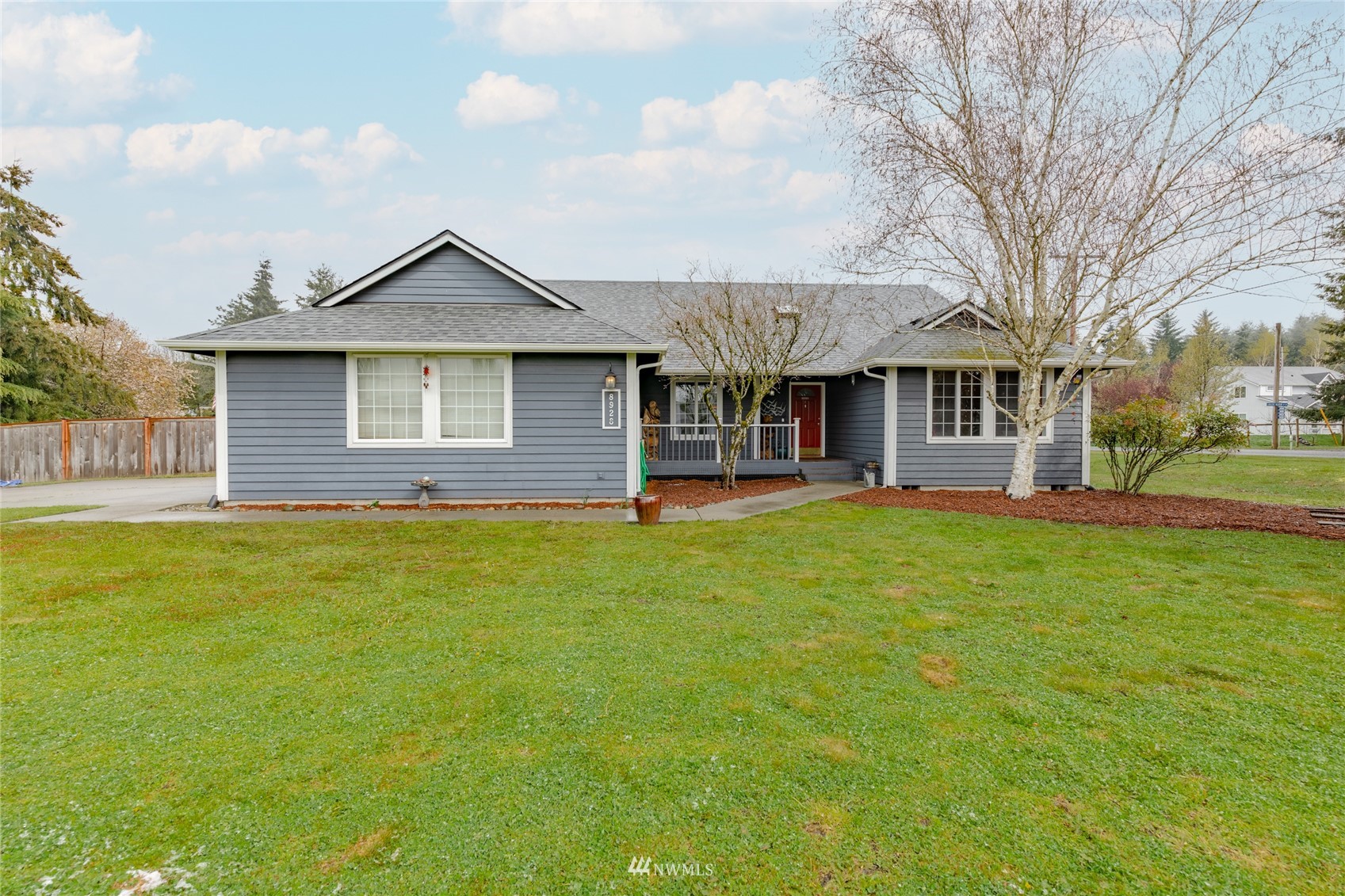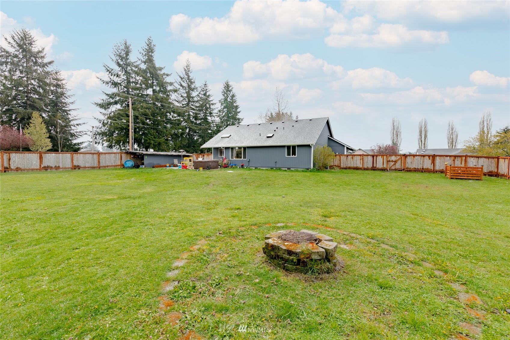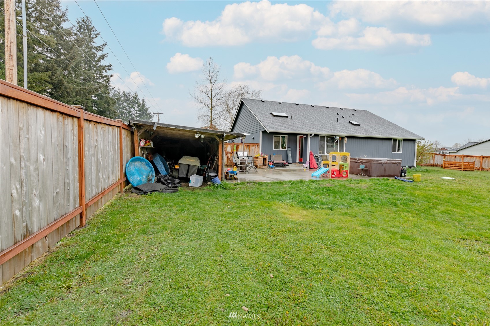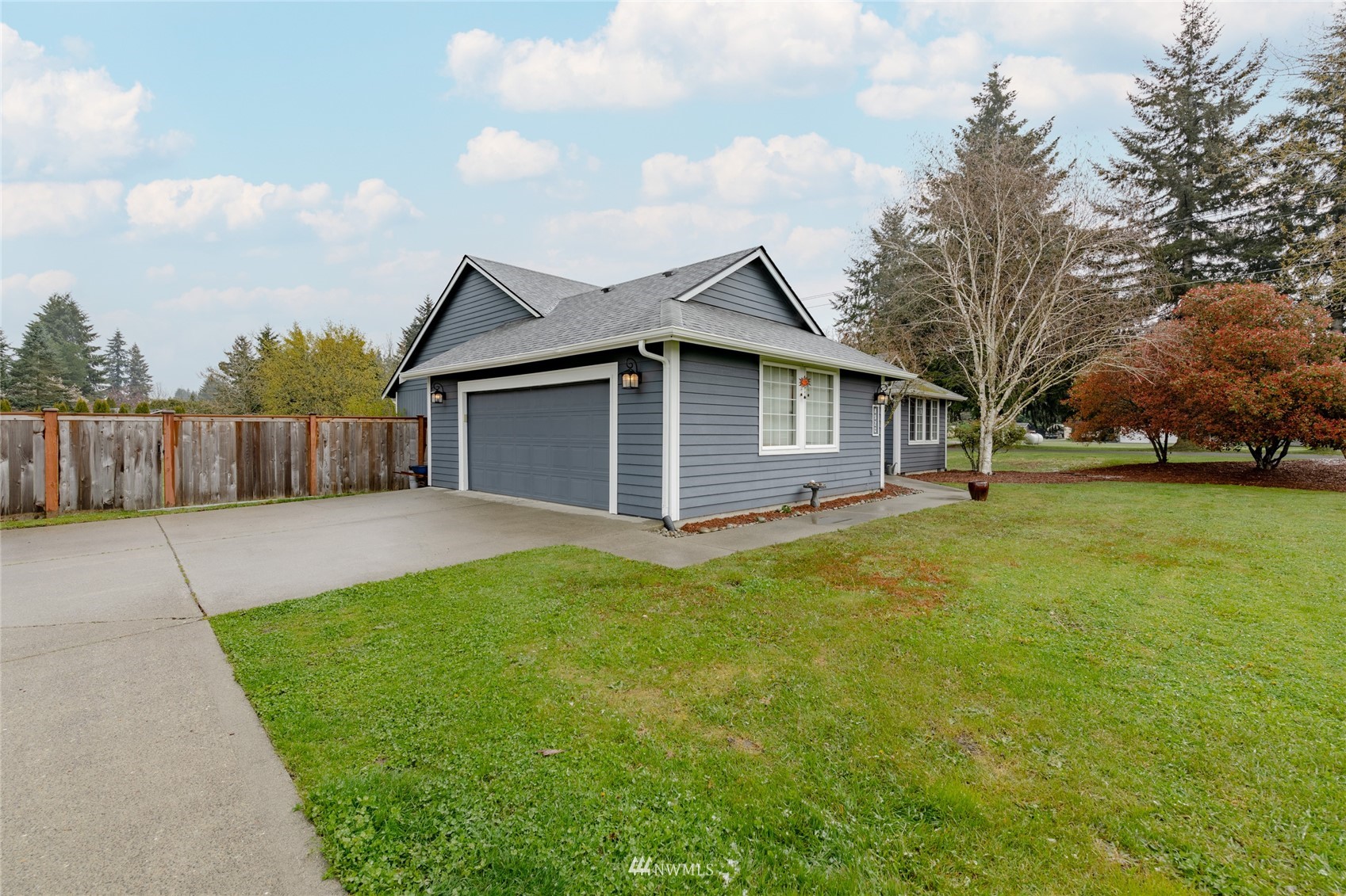 A Desirable open, bright & fully updated single story 3 bed, 2 bath rambler on a generously sized corner lot in a quiet Rochester neighborhood. Covered front porch welcomes you into vaulted ceilings, laminate flooring, propane fireplace w/ tile surround! Kitchen features white cabinets, slab counters, SS appliances & tile backsplash! Updated hall bathroom with tile and oversized tub. Primary suite features a fully remodeled tile shower and walk-in closet. Year round temperature control with AC/heat pump. Nicely landscaped, huge level fully fenced yard complete with hot tub, garden boxes, fire pit, extended patio, play-set, extra storage space and oversized 2 car garage. Plenty of space for RV parking. Close to trails, shopping and I-5.