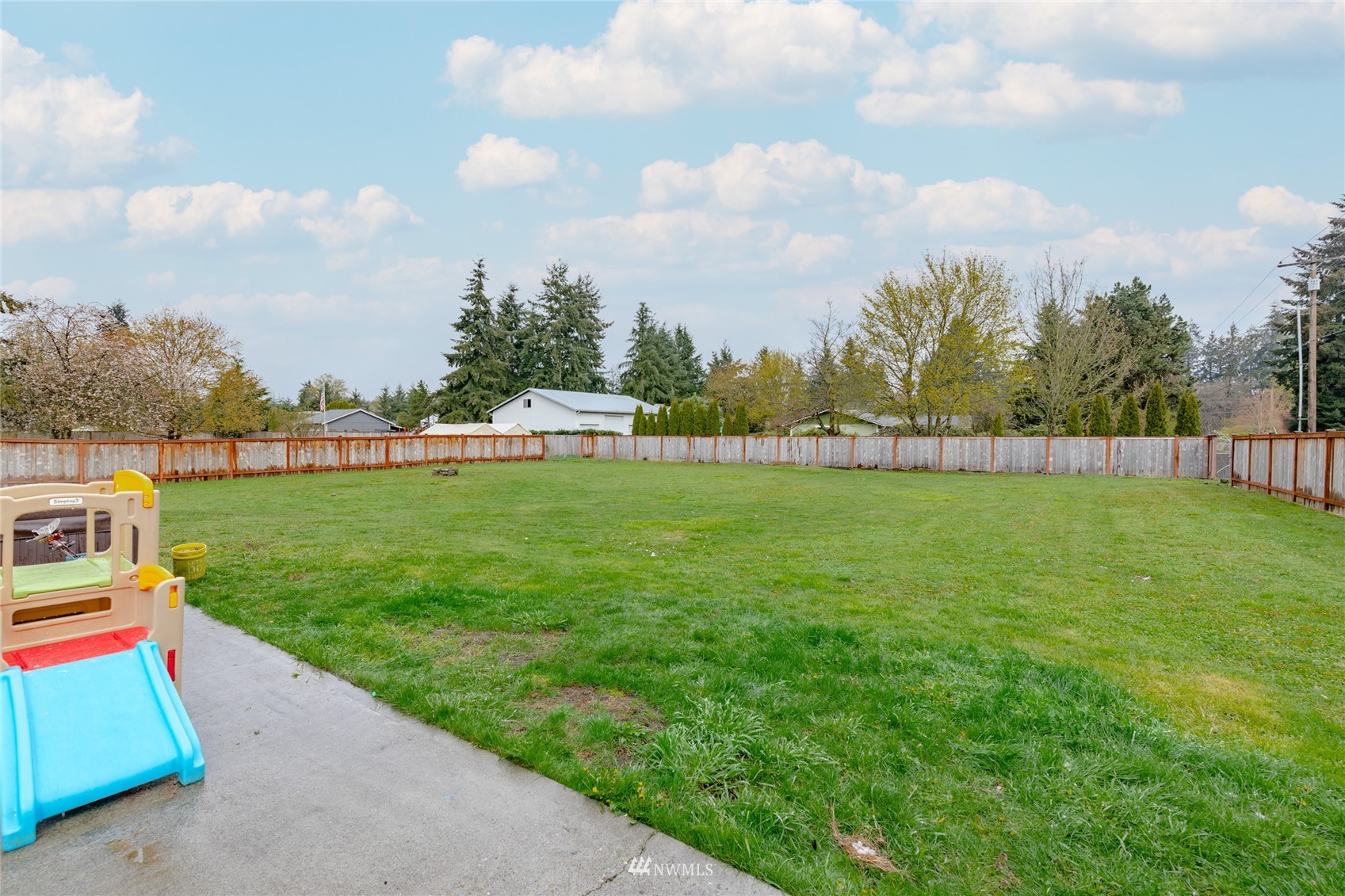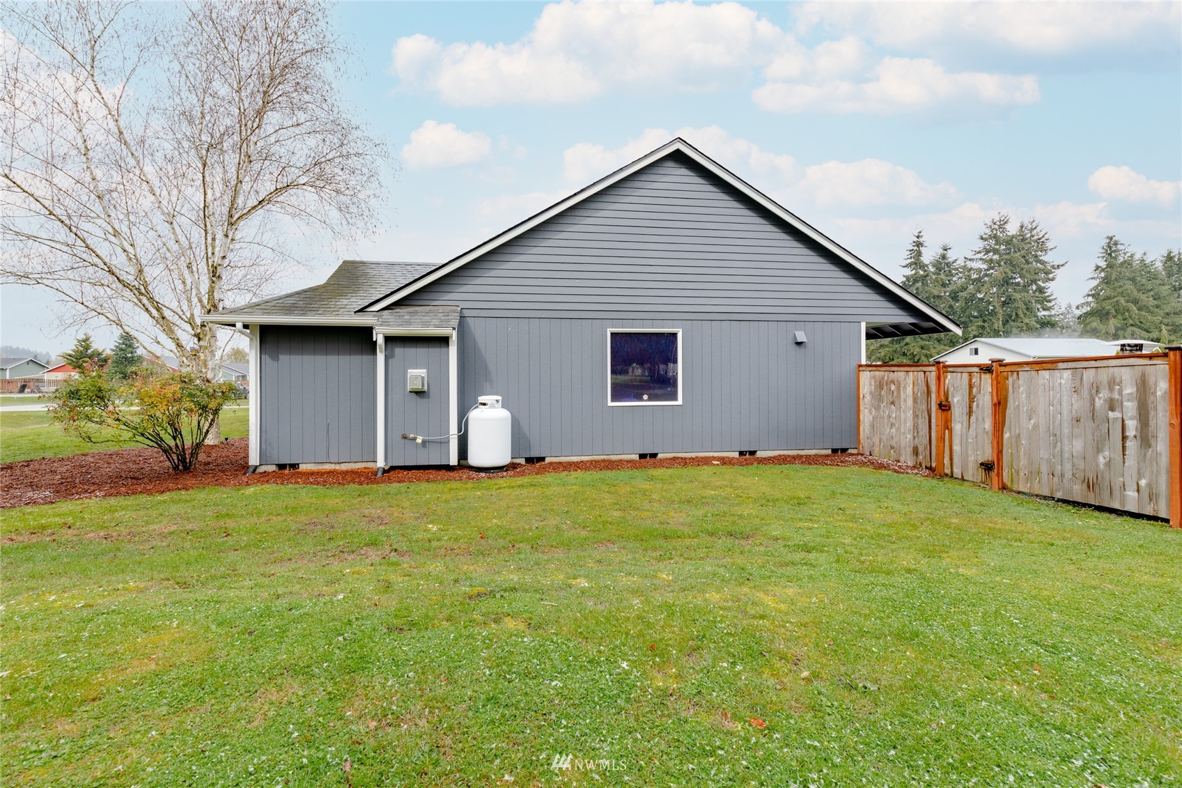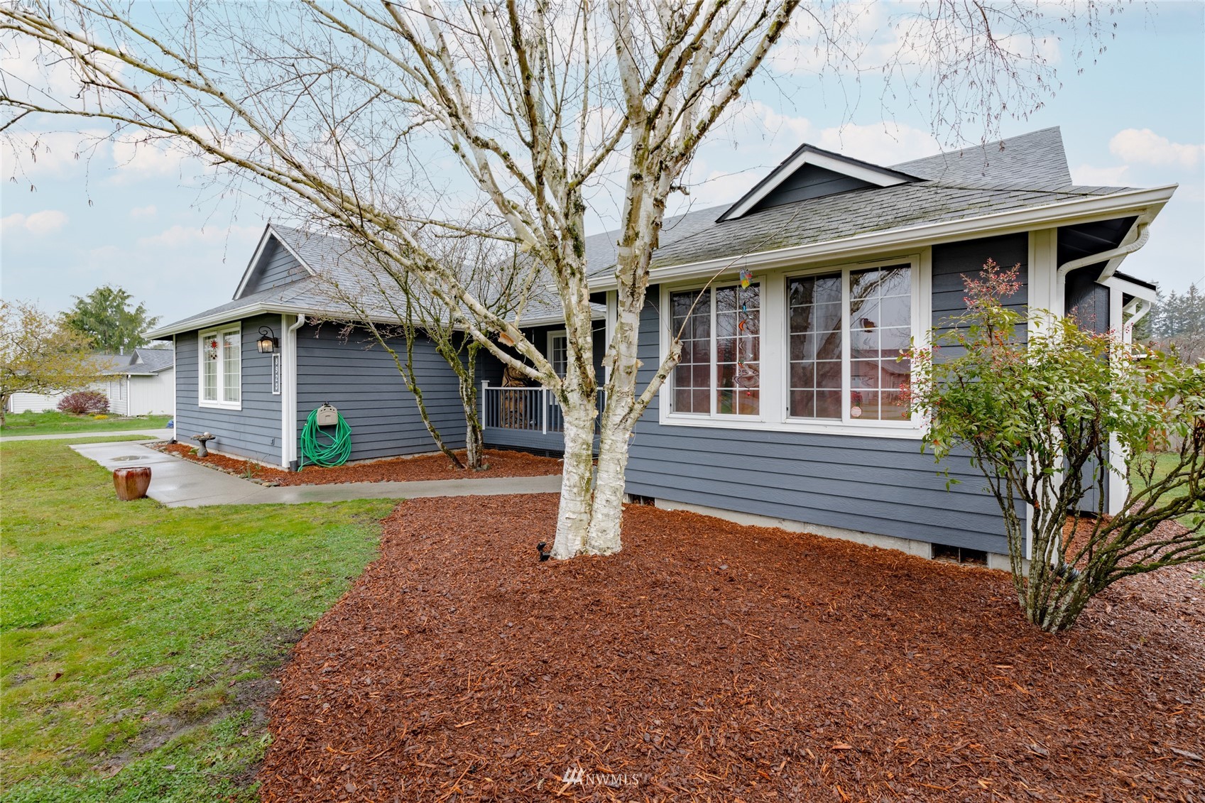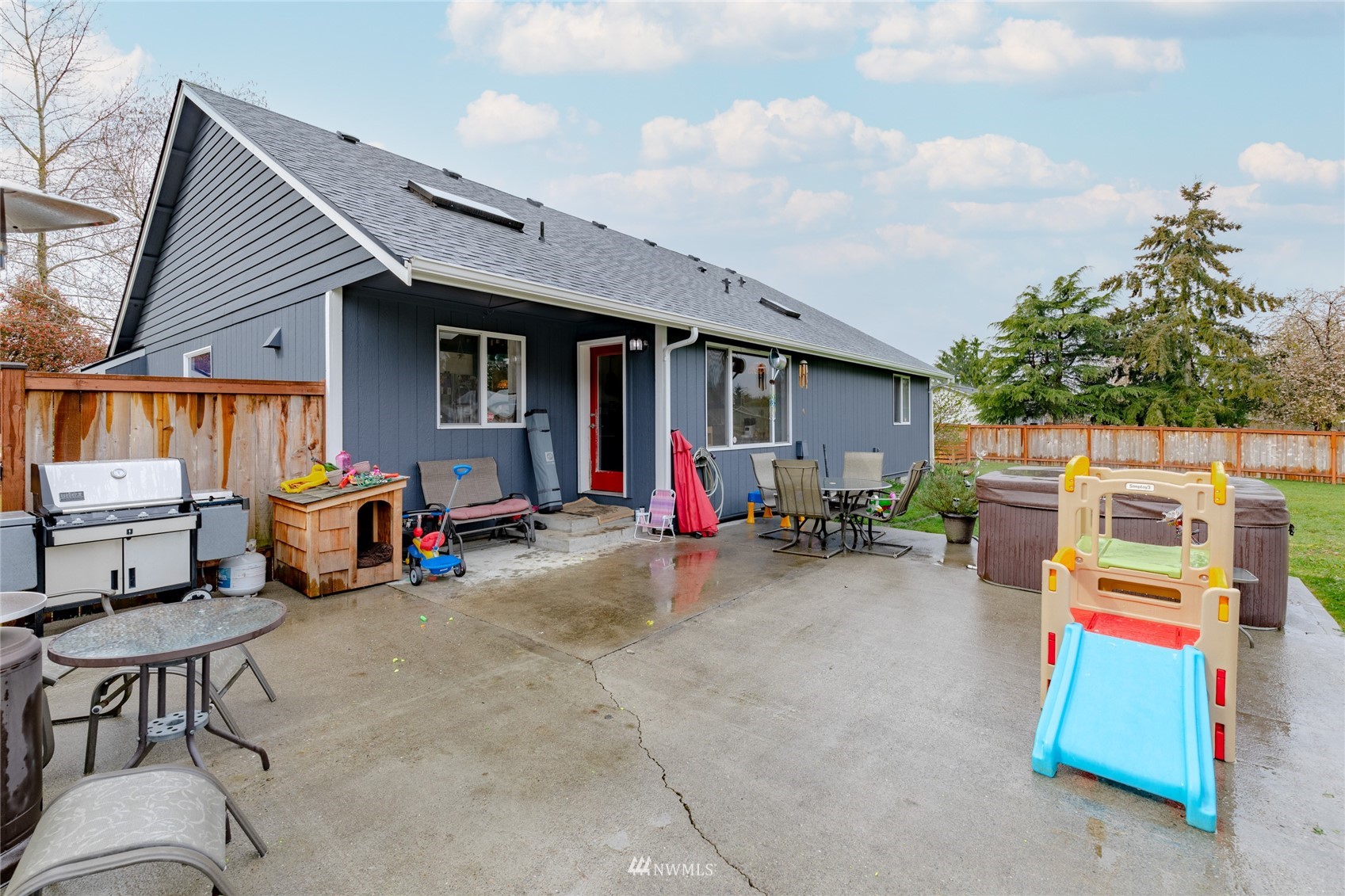 A Desirable open, bright & fully updated single story 3 bed, 2 bath rambler on a generously sized corner lot in a quiet Rochester neighborhood. Covered front porch welcomes you into vaulted ceilings, laminate flooring, propane fireplace w/ tile surround! Kitchen features white cabinets, slab counters, SS appliances & tile backsplash! Updated hall bathroom with tile and oversized tub. Primary suite features a fully remodeled tile shower and walk-in closet. Year round temperature control with AC/heat pump. Nicely landscaped, huge level fully fenced yard complete with hot tub, garden boxes, fire pit, extended patio, play-set, extra storage space and oversized 2 car garage. Plenty of space for RV parking. Close to trails, shopping and I-5.