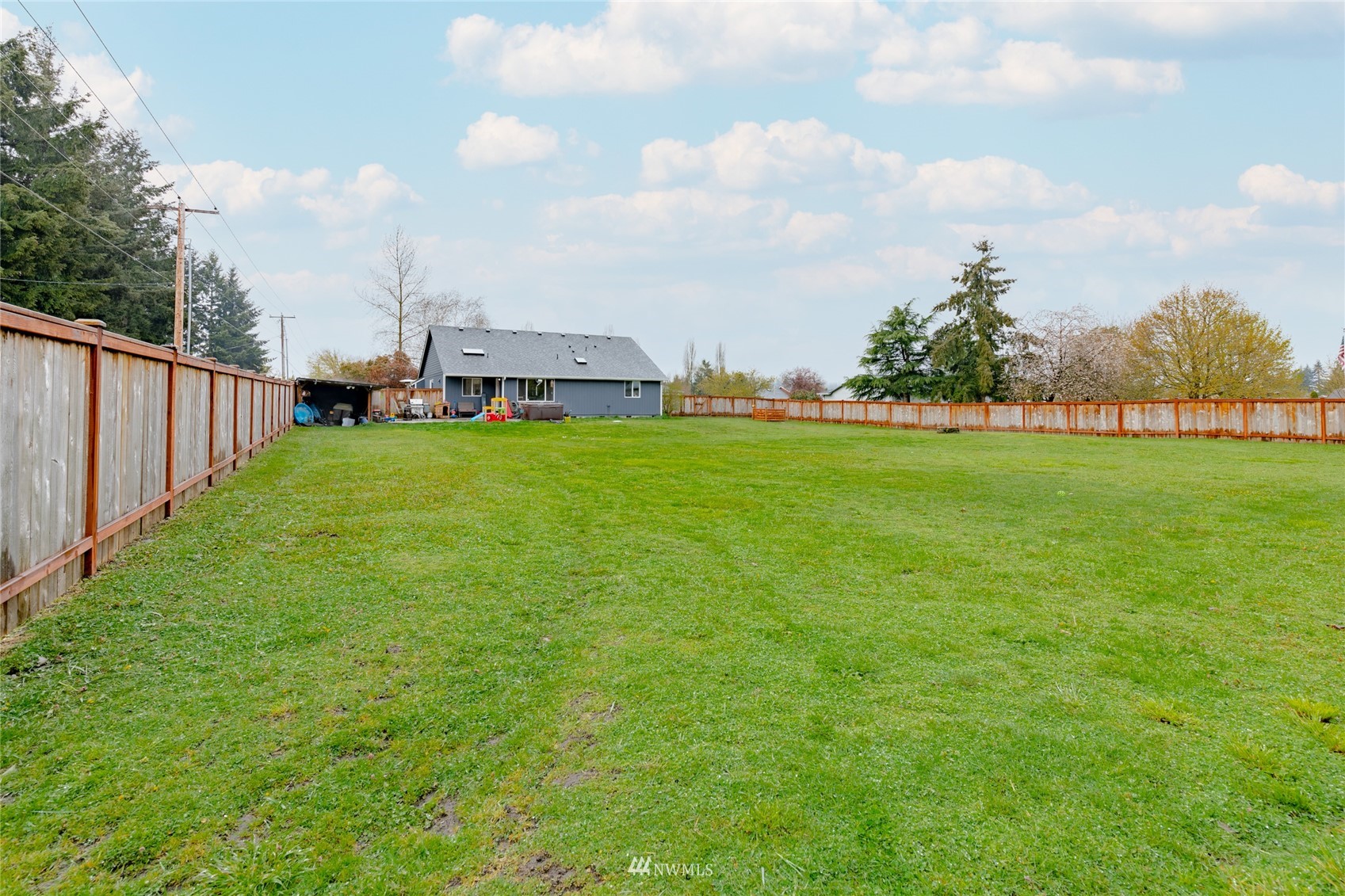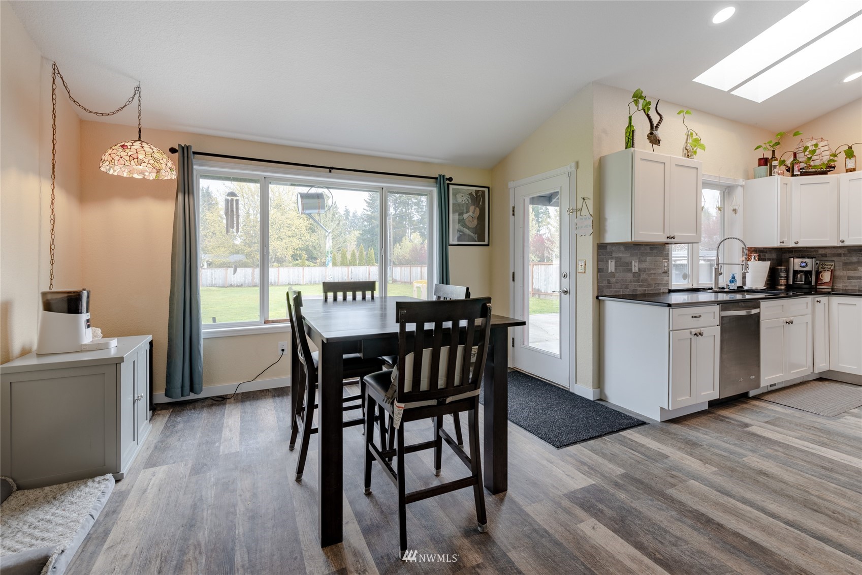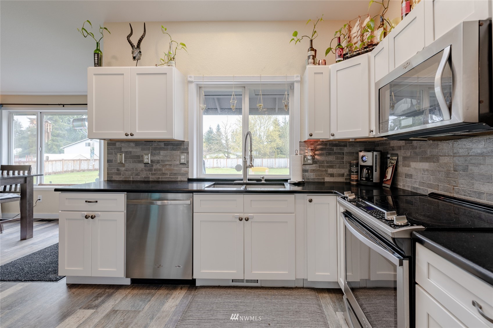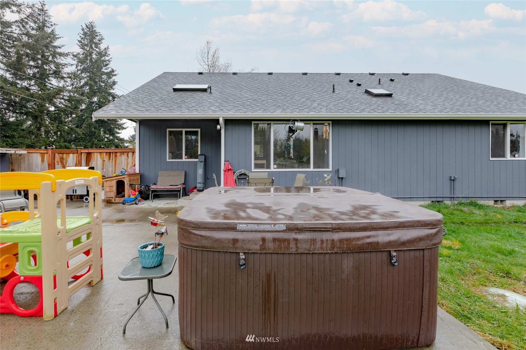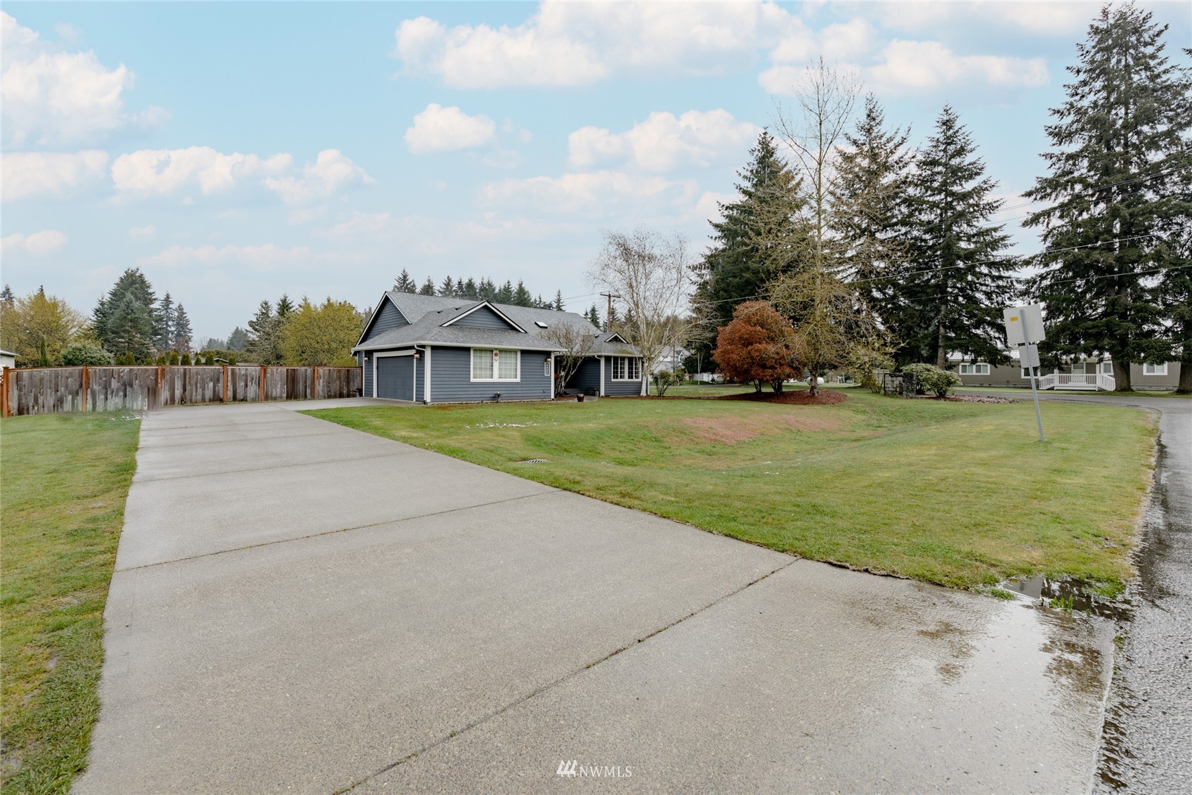 A Desirable open, bright & fully updated single story 3 bed, 2 bath rambler on a generously sized corner lot in a quiet Rochester neighborhood. Covered front porch welcomes you into vaulted ceilings, laminate flooring, propane fireplace w/ tile surround! Kitchen features white cabinets, slab counters, SS appliances & tile backsplash! Updated hall bathroom with tile and oversized tub. Primary suite features a fully remodeled tile shower and walk-in closet. Year round temperature control with AC/heat pump. Nicely landscaped, huge level fully fenced yard complete with hot tub, garden boxes, fire pit, extended patio, play-set, extra storage space and oversized 2 car garage. Plenty of space for RV parking. Close to trails, shopping and I-5.