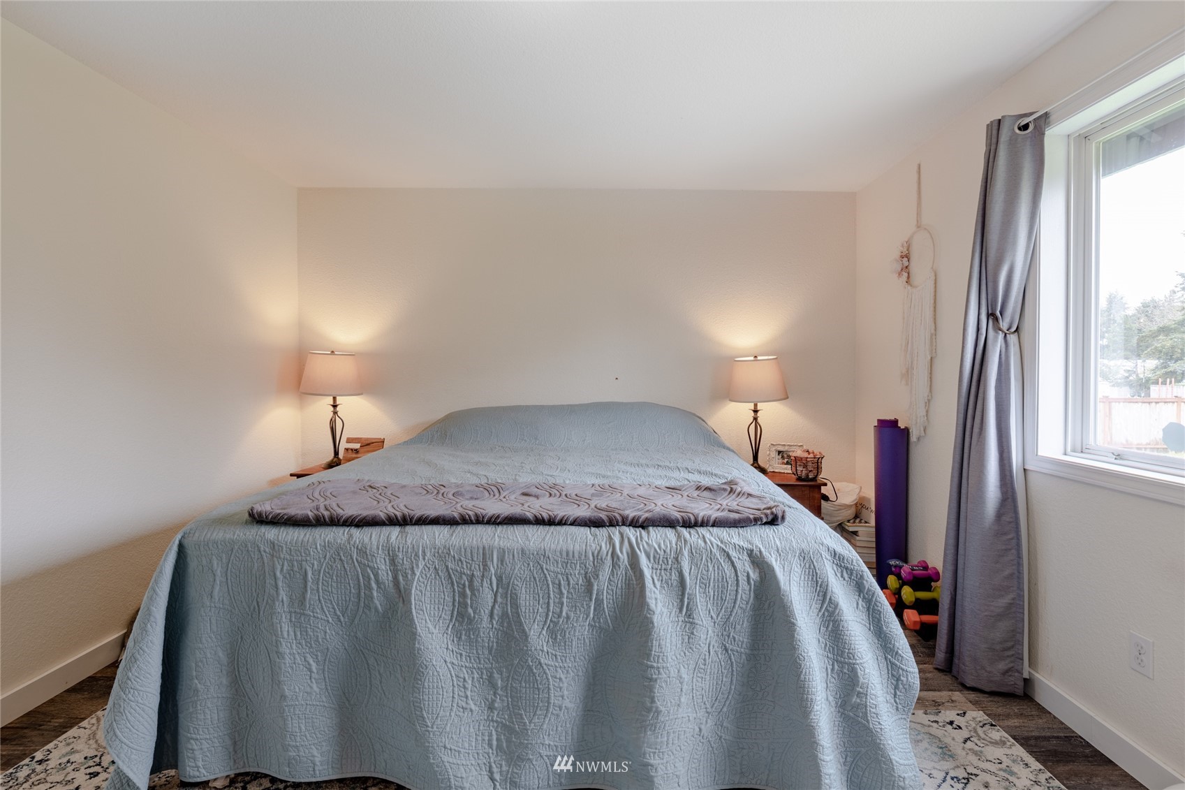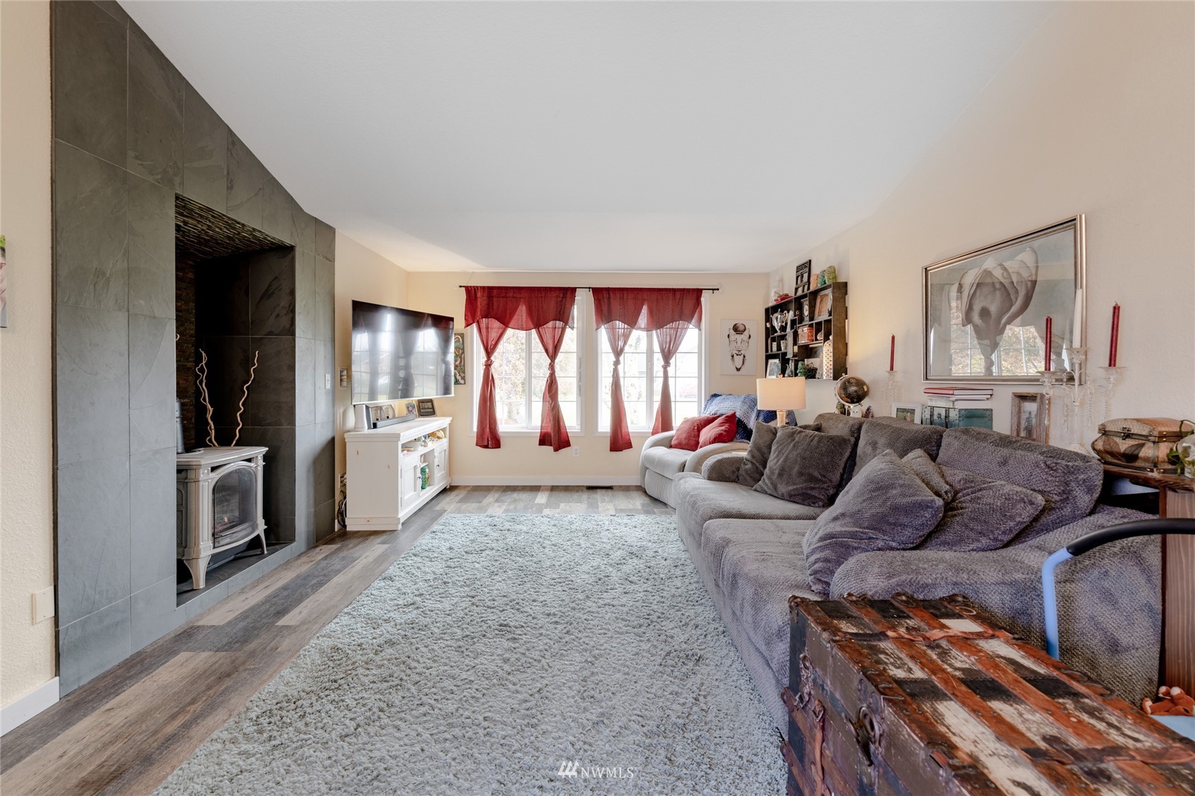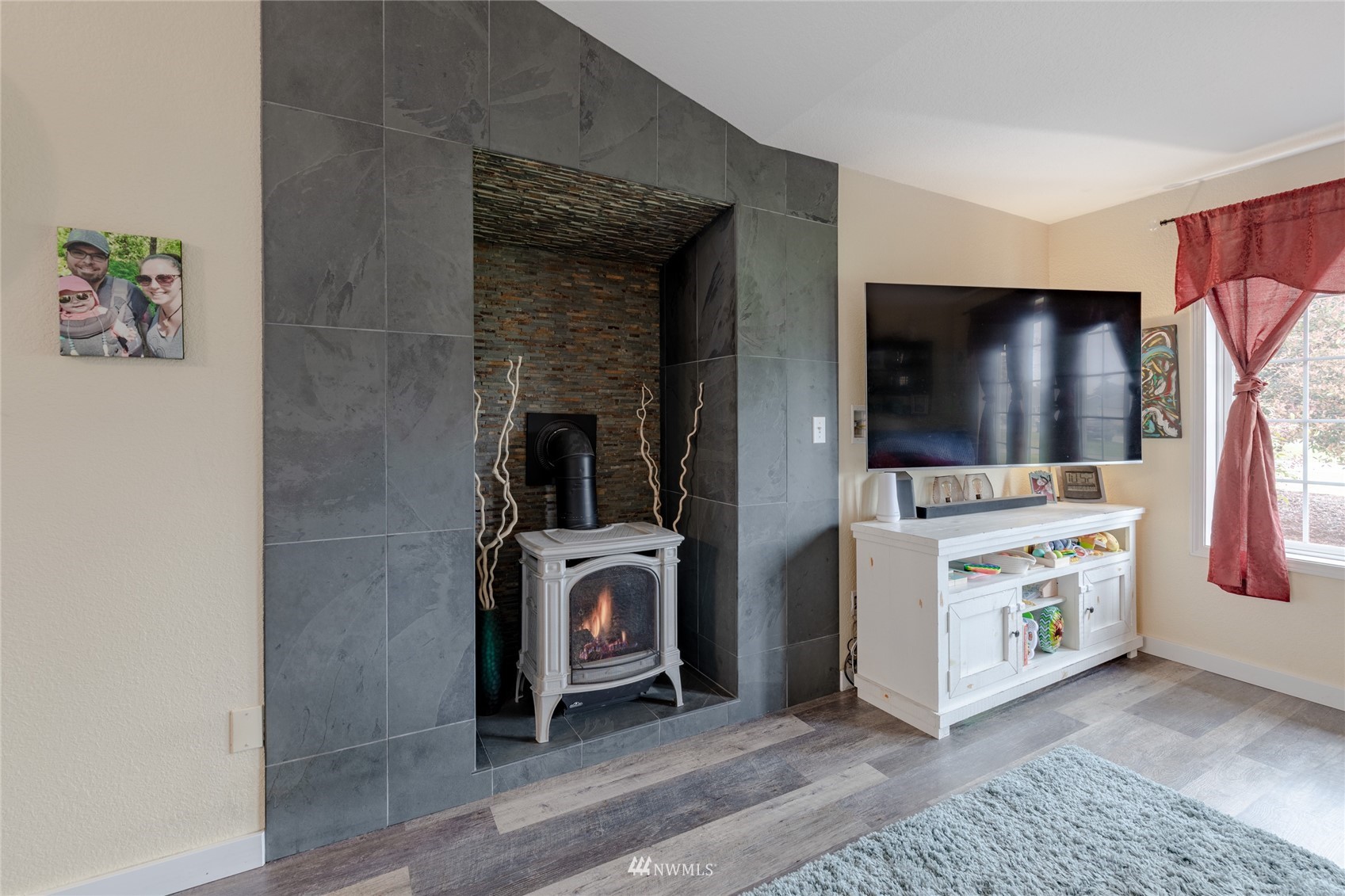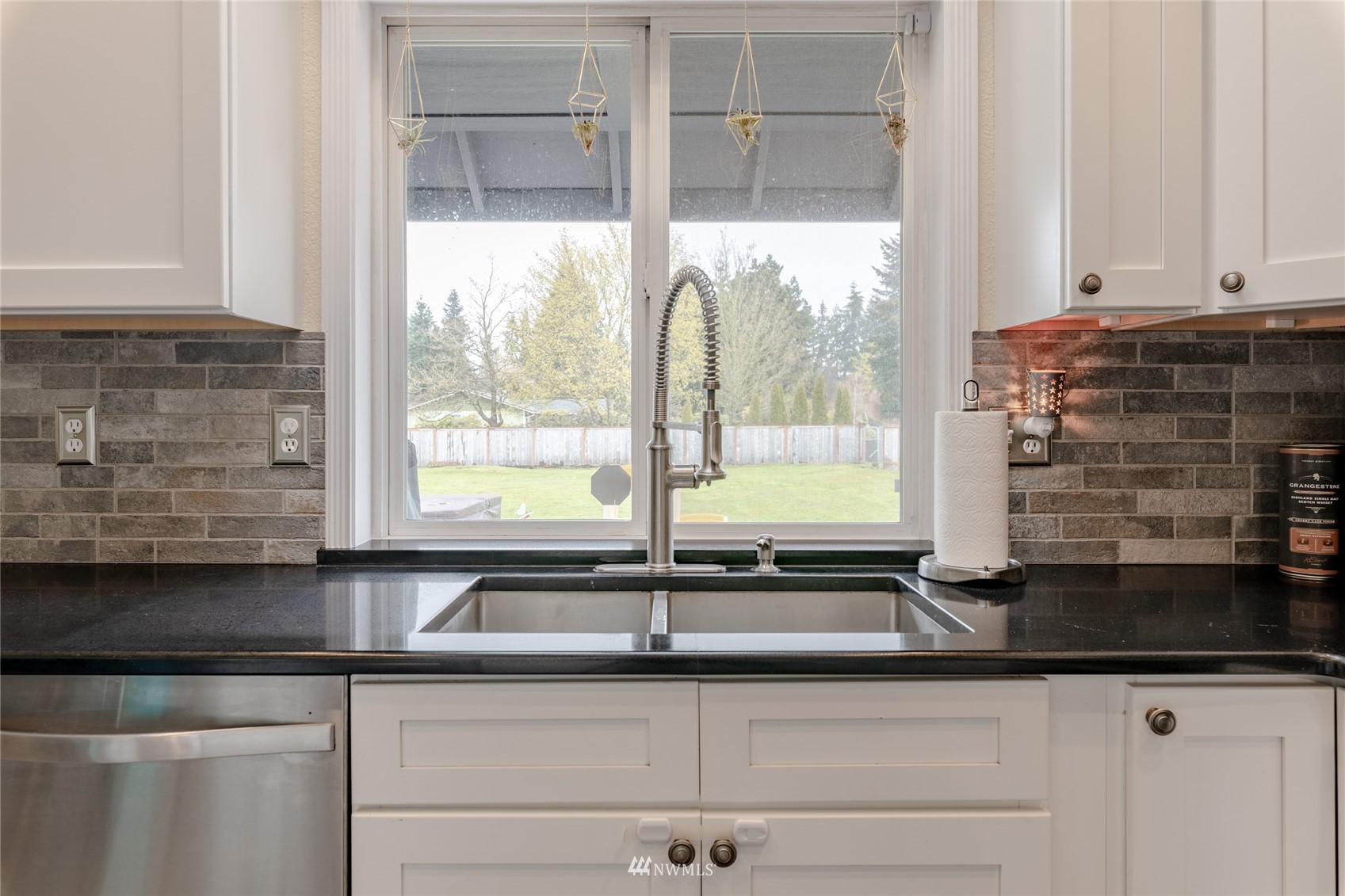 A Desirable open, bright & fully updated single story 3 bed, 2 bath rambler on a generously sized corner lot in a quiet Rochester neighborhood. Covered front porch welcomes you into vaulted ceilings, laminate flooring, propane fireplace w/ tile surround! Kitchen features white cabinets, slab counters, SS appliances & tile backsplash! Updated hall bathroom with tile and oversized tub. Primary suite features a fully remodeled tile shower and walk-in closet. Year round temperature control with AC/heat pump. Nicely landscaped, huge level fully fenced yard complete with hot tub, garden boxes, fire pit, extended patio, play-set, extra storage space and oversized 2 car garage. Plenty of space for RV parking. Close to trails, shopping and I-5.