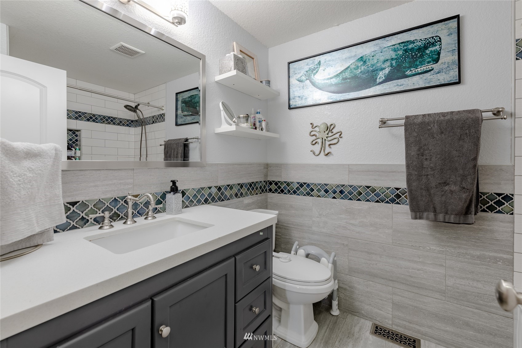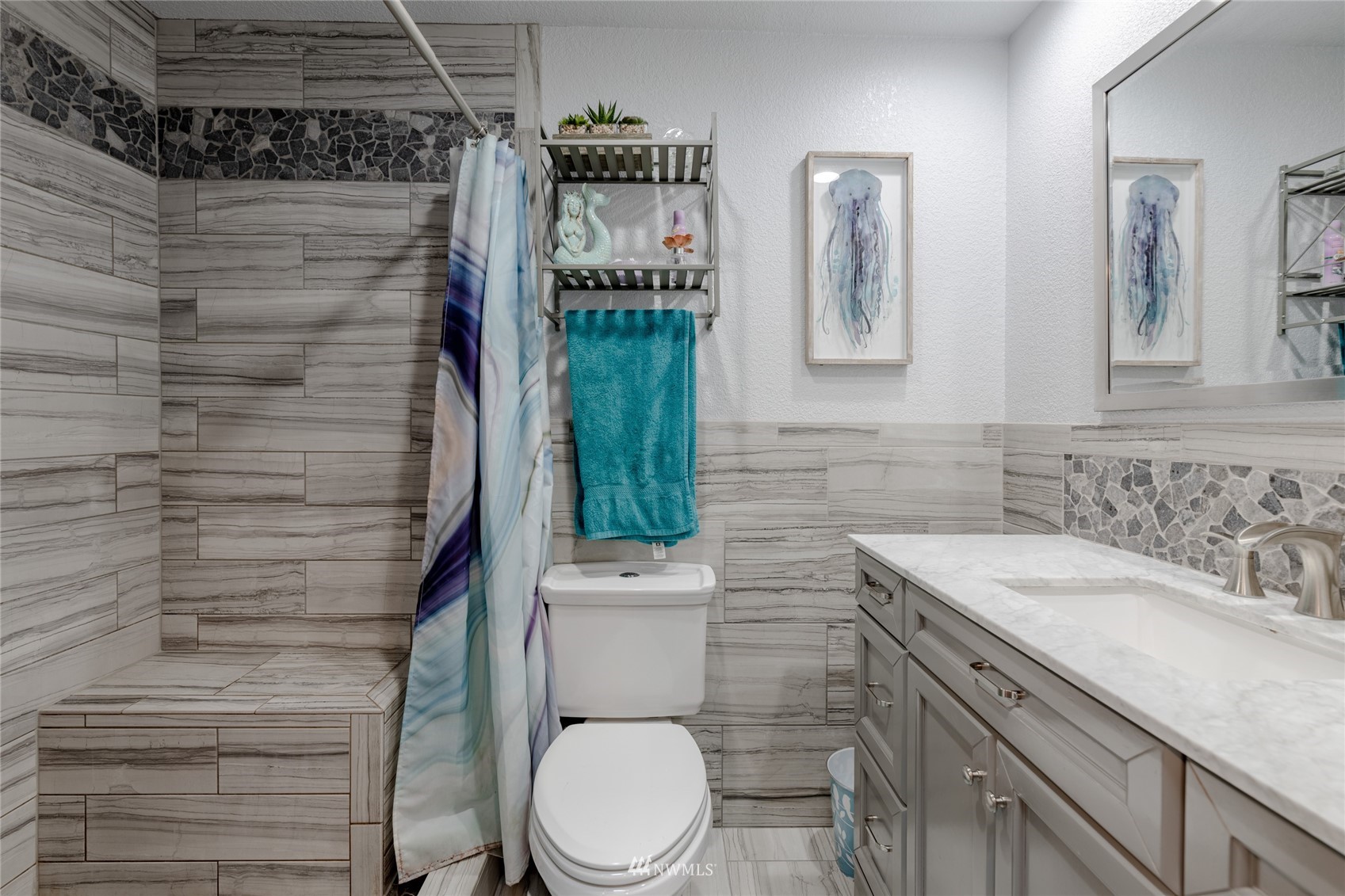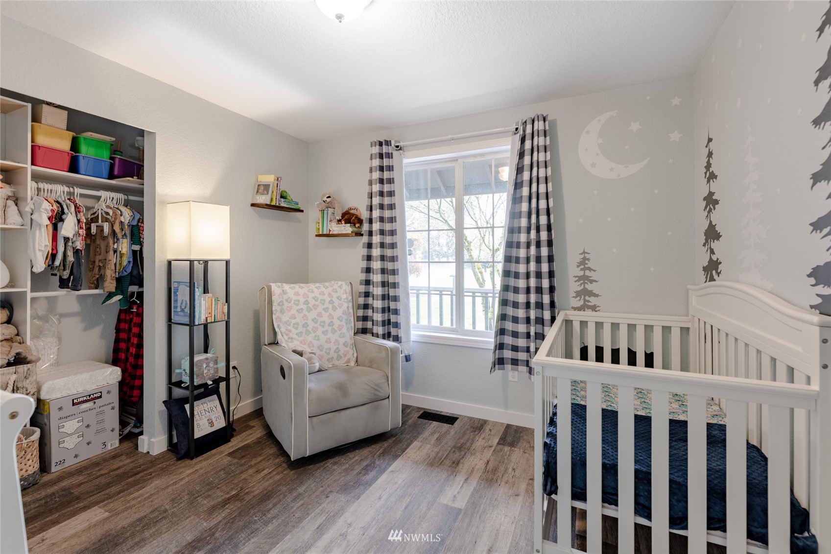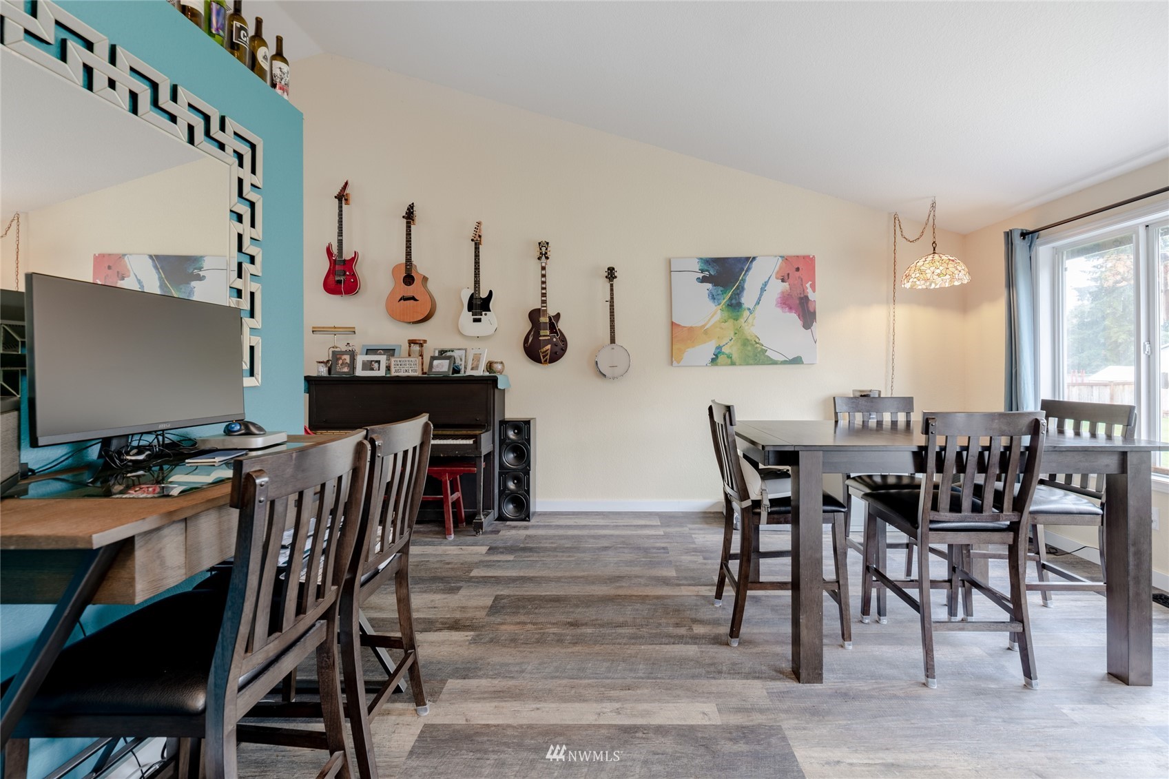 A Desirable open, bright & fully updated single story 3 bed, 2 bath rambler on a generously sized corner lot in a quiet Rochester neighborhood. Covered front porch welcomes you into vaulted ceilings, laminate flooring, propane fireplace w/ tile surround! Kitchen features white cabinets, slab counters, SS appliances & tile backsplash! Updated hall bathroom with tile and oversized tub. Primary suite features a fully remodeled tile shower and walk-in closet. Year round temperature control with AC/heat pump. Nicely landscaped, huge level fully fenced yard complete with hot tub, garden boxes, fire pit, extended patio, play-set, extra storage space and oversized 2 car garage. Plenty of space for RV parking. Close to trails, shopping and I-5.