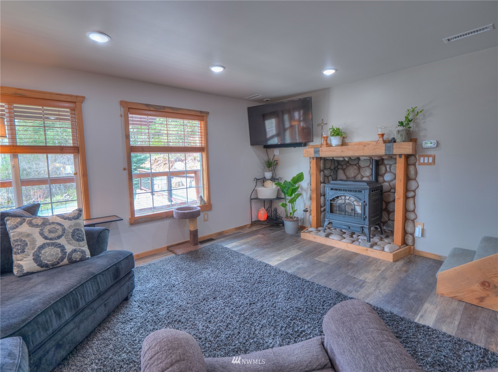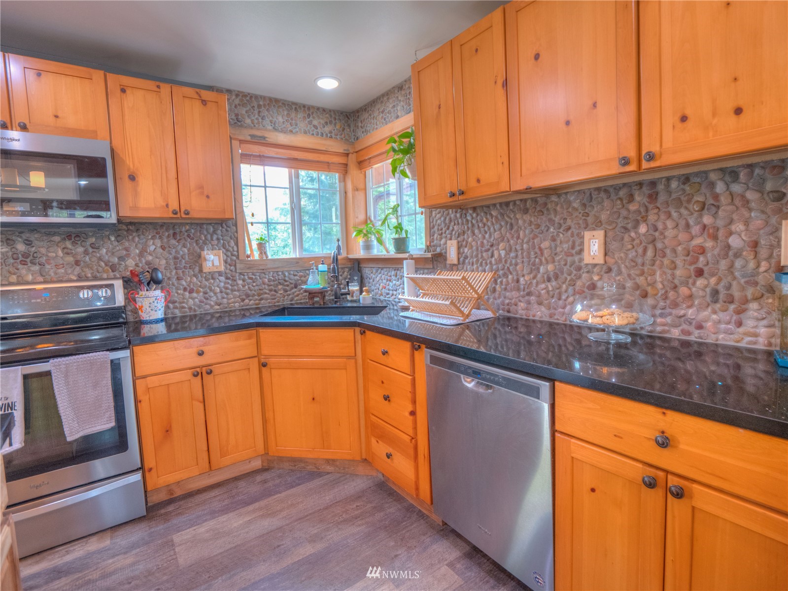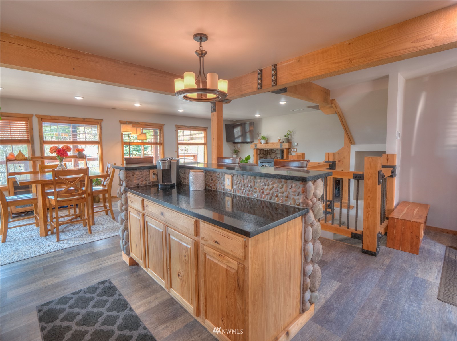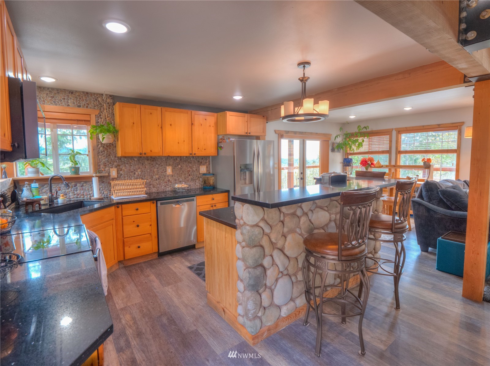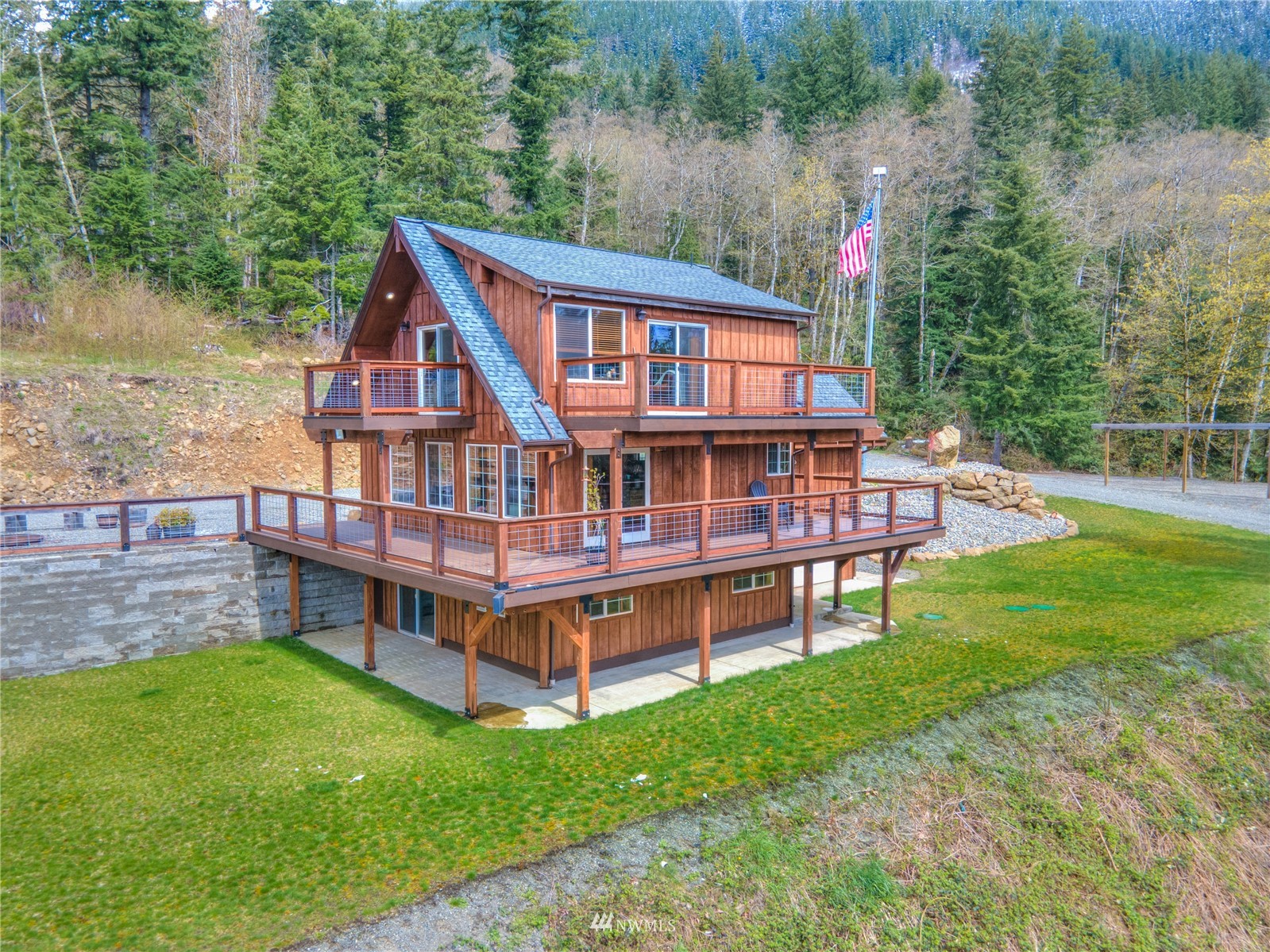 2 PARCELS, SHY 10 ACRES Stunning territorial & sunset views from this meticulously refinished 3 bedroom, 2 bath home on 4.9 acres. LVP flooring throughout. Updated kitchen w/ Quartz counters, SS appliances & bar height island seating. Adjacent living room w/ pellet stove. Primary suite w/ vaulted tongue & groove ceiling, 2 view balconies & a private .75 bath w/ custom tile shower, walk-in closet and dual sink vanity. Forced air furnace w/ heat pump & AC. 2 bedrooms, a rec room & .75 bath in the fully finished daylight basement. Streaming capable internet service. Newer wrap around TimberTech decking on the main. New well in 2017. New roof in 2021. The ultimate private setting yet close to Maple Valley/Covington amenities.