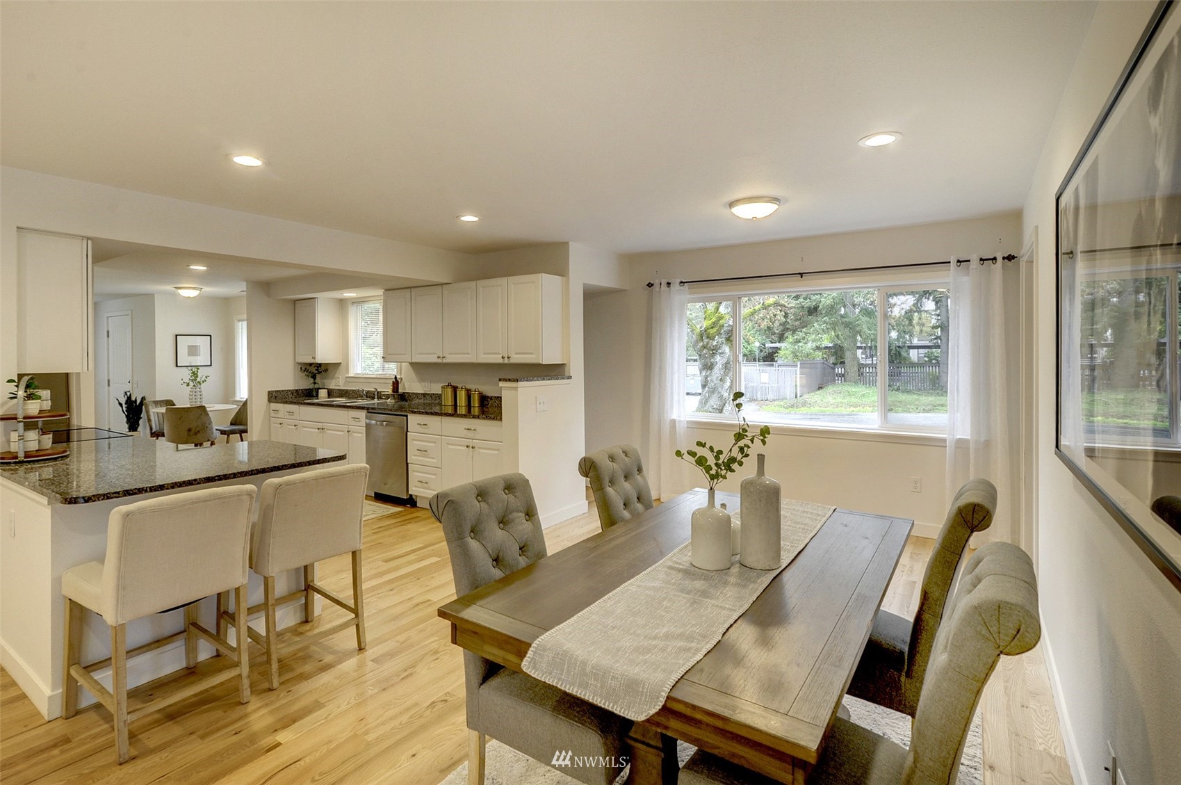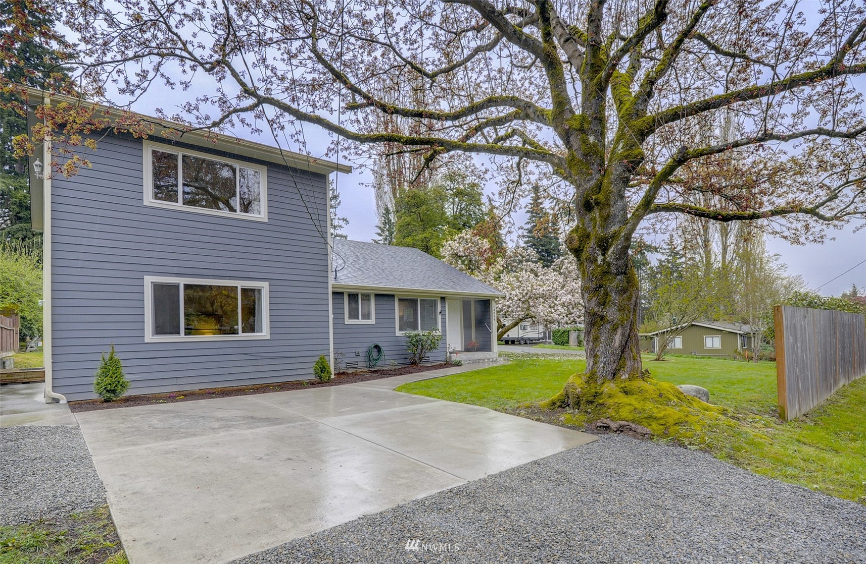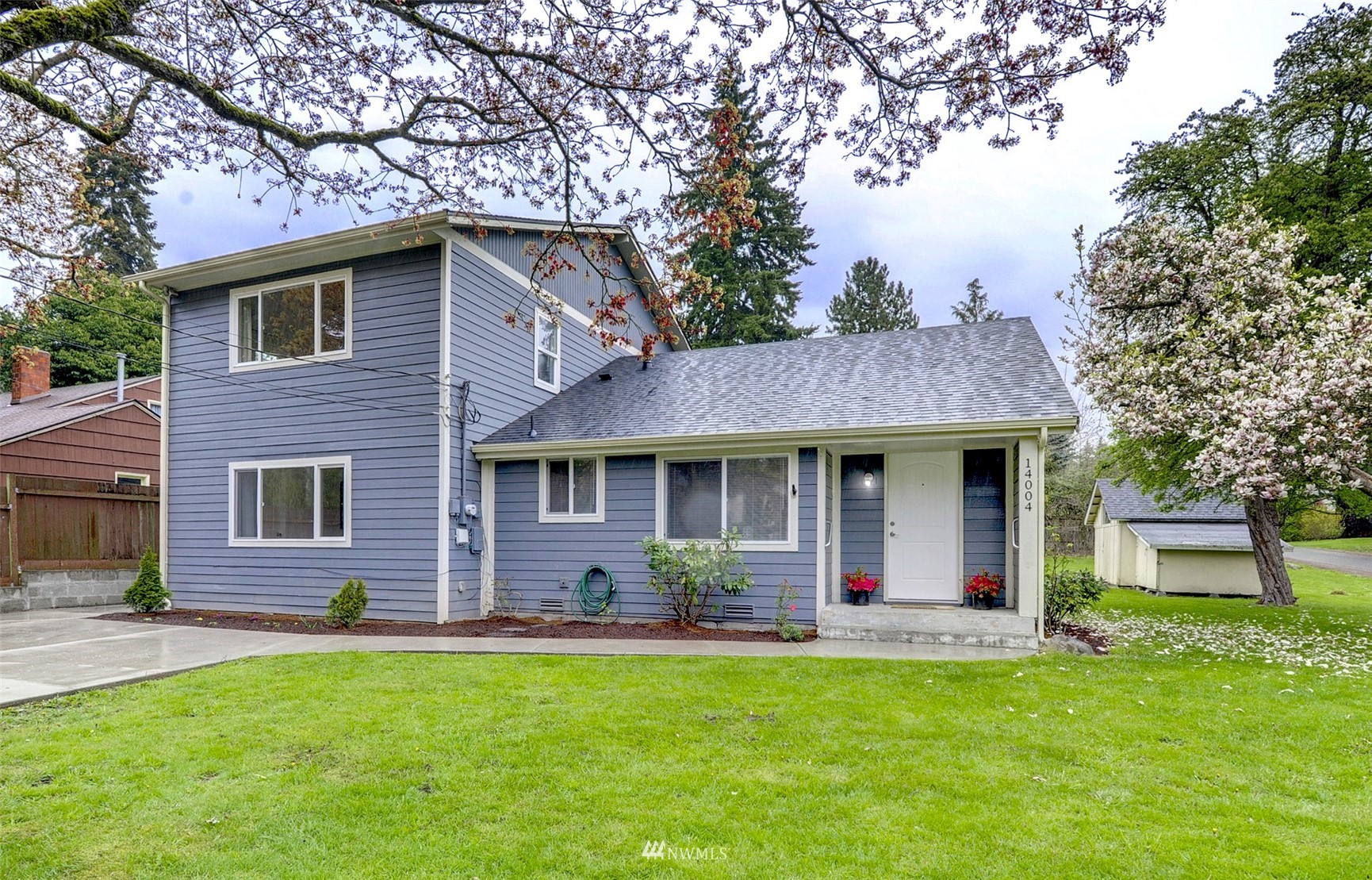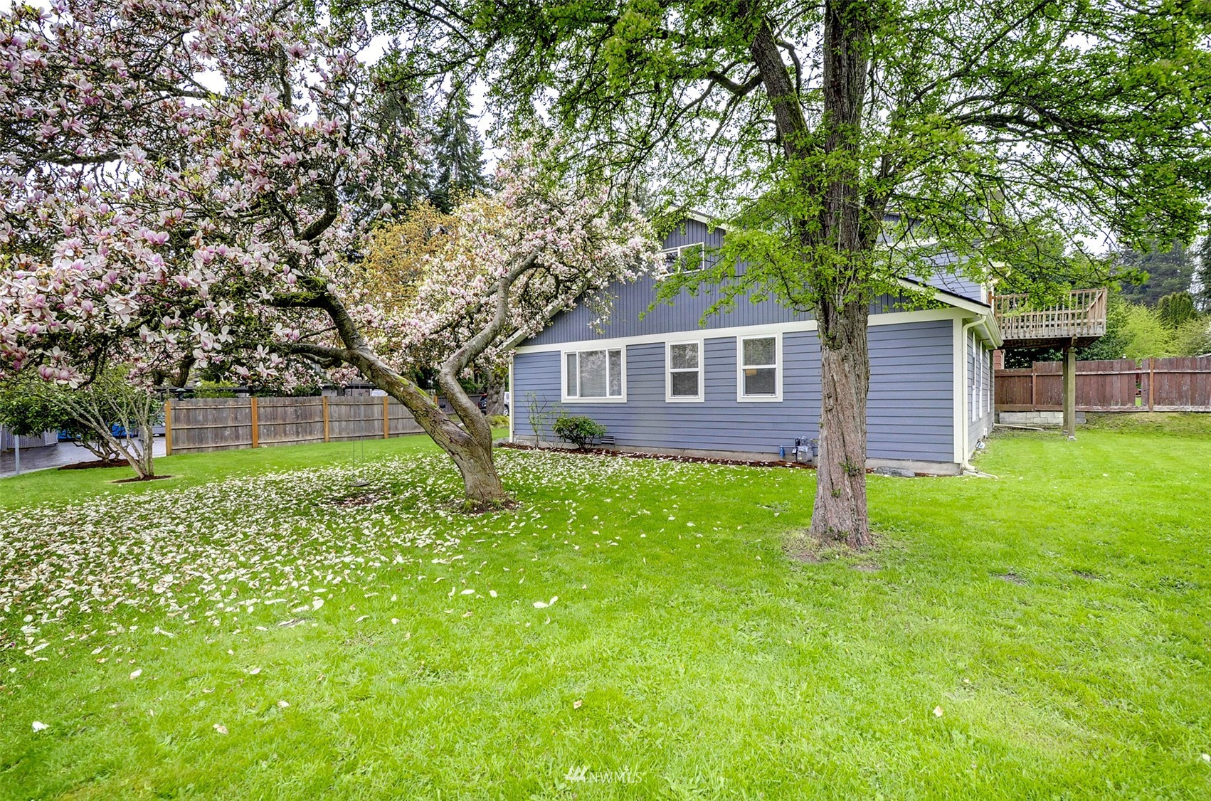 Beautifully remodeled 3 bedroom, 3 bath home on just shy .25 acre corner lot in the Olympic Hills neighborhood of North Seattle. On the main level you will find gorgeous hardwood floors throughout, updated kitchen w/ white shaker cabinets, granite counters and stainless appliances, oversized living room, dining room, optional main floor primary w/ en-suite bath, bedroom, additional guest bathroom, and utility room. Upstairs features an additional primary w/ ensuite bath, private deck and loft space. Upstairs is plumbed for wet bar, and may be used for a MIL space! Plenty of storage throughout. Large flat yard with garden space, gorgeous mature flowering trees, and outbuildings! Close to all amenities including the new light rail!