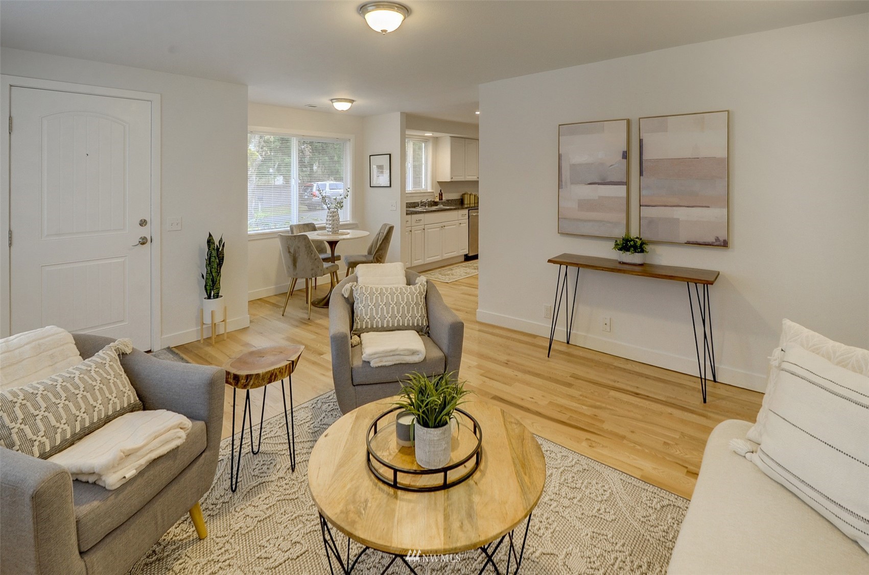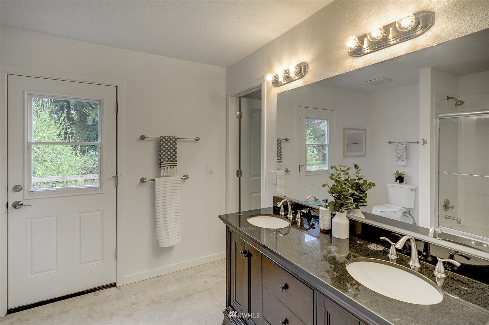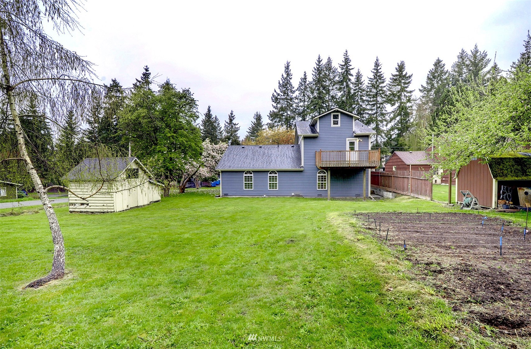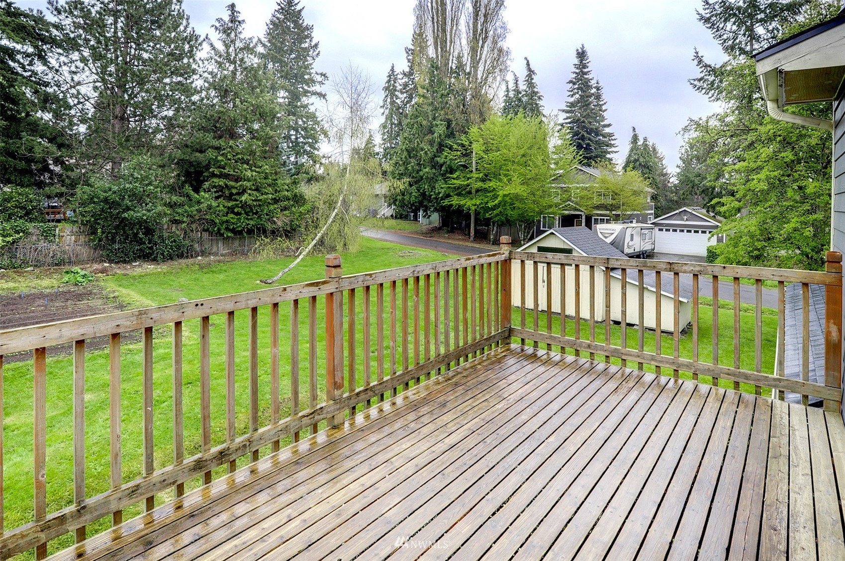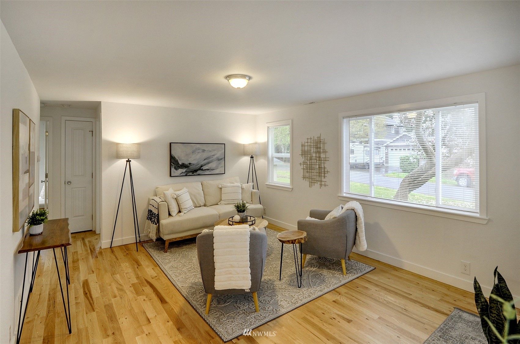 Beautifully remodeled 3 bedroom, 3 bath home on just shy .25 acre corner lot in the Olympic Hills neighborhood of North Seattle. On the main level you will find gorgeous hardwood floors throughout, updated kitchen w/ white shaker cabinets, granite counters and stainless appliances, oversized living room, dining room, optional main floor primary w/ en-suite bath, bedroom, additional guest bathroom, and utility room. Upstairs features an additional primary w/ ensuite bath, private deck and loft space. Upstairs is plumbed for wet bar, and may be used for a MIL space! Plenty of storage throughout. Large flat yard with garden space, gorgeous mature flowering trees, and outbuildings! Close to all amenities including the new light rail!