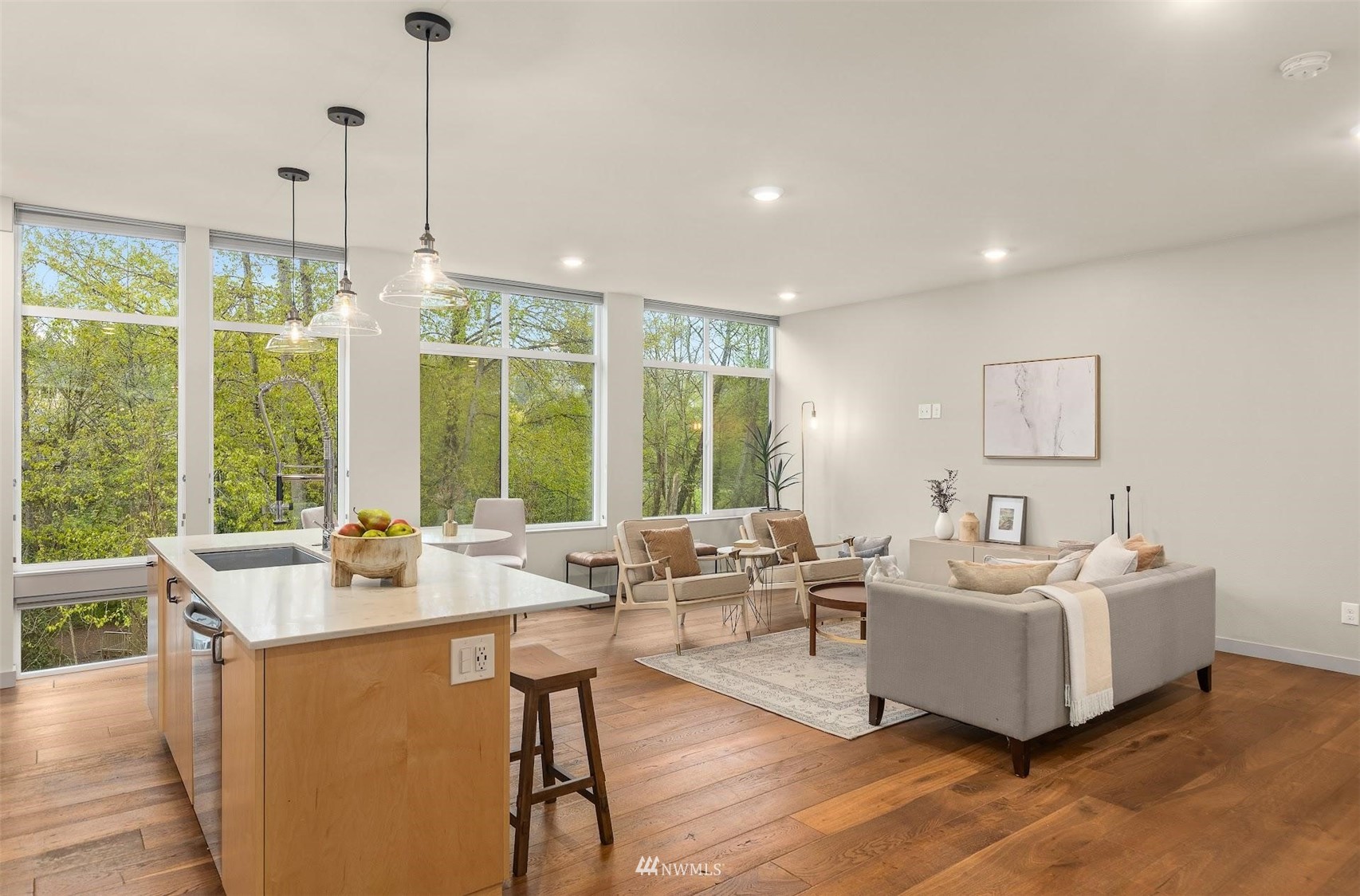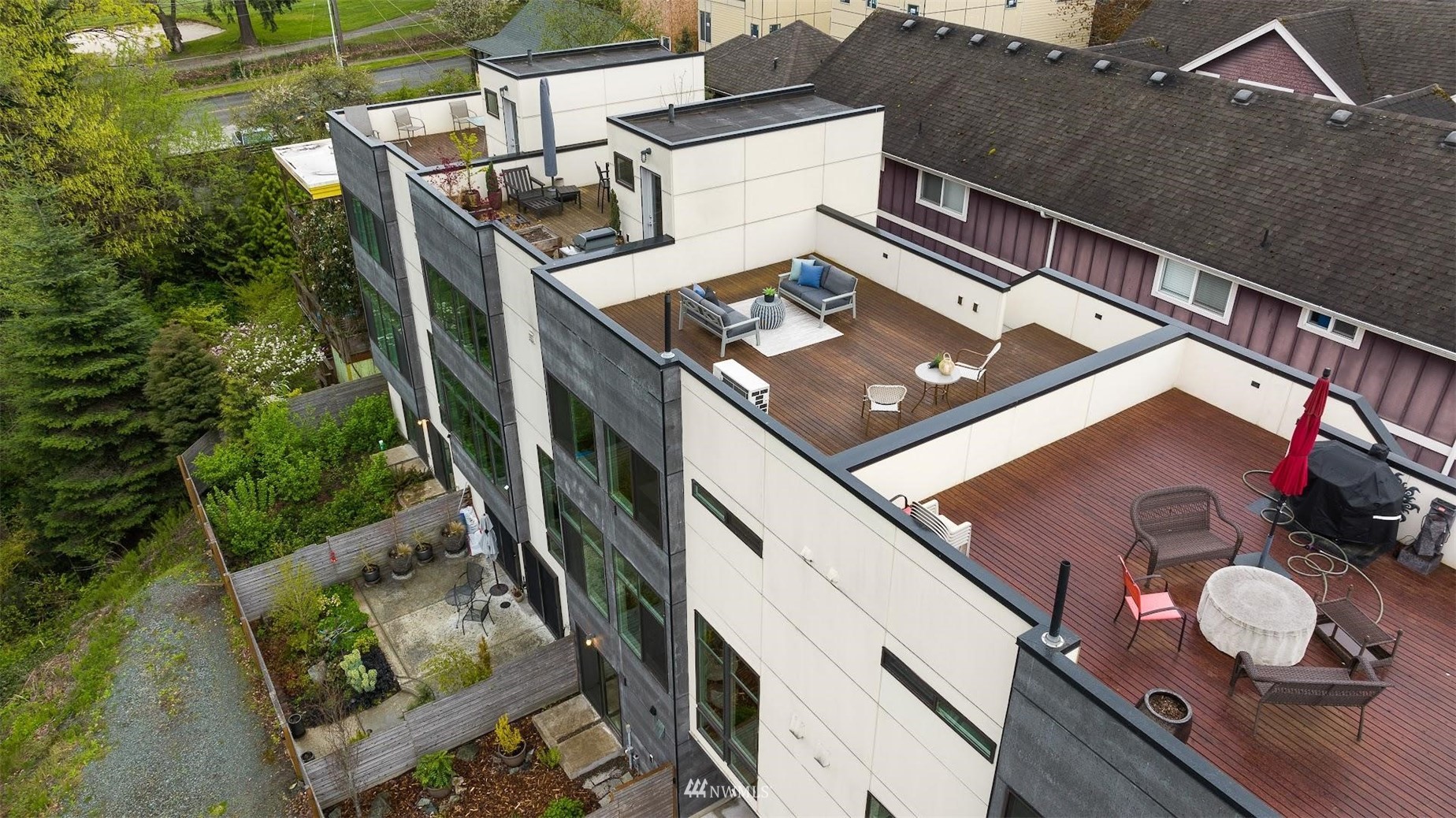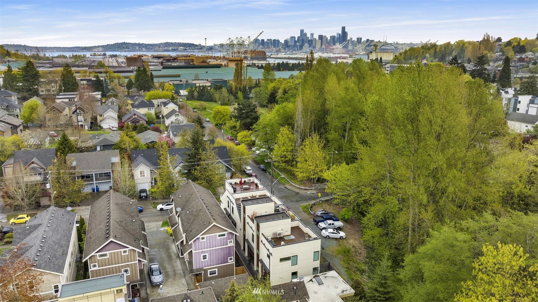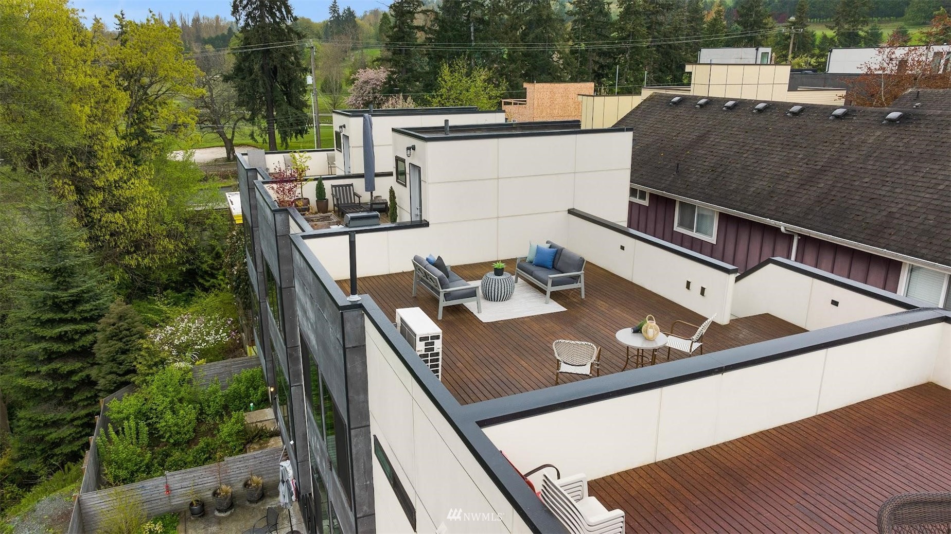 Come and see this modern and ultra-efficient 3-bedroom townhome! Natural light filters into the open kitchen & living room from a wall of windows overlooking the adjacent greenbelt and creek. The main suite (w/ large walk-in shower) and 2nd bedroom are located upstairs w/ access to the rooftop deck overlooking the golf course + views of downtown. The lower level has a bedroom/office with ensuite bathroom including radiant heat - perfect for a home office! Engineered hardwood floors on main floor & upstairs, top down blinds/fully fenced yard/Ring cameras/Smart light switches that control all the lights in the house/4-star Built Green cert/mini-splits & HRV systems. Attached garage. Located minutes to downtown Seattle!