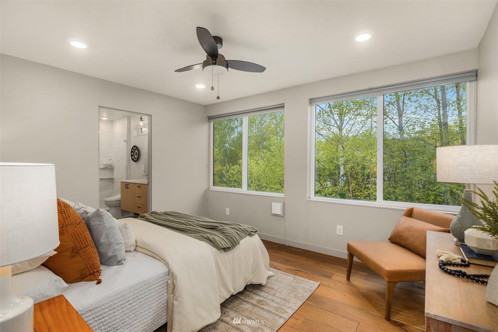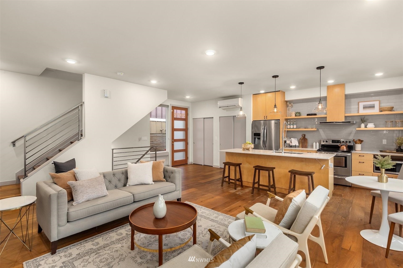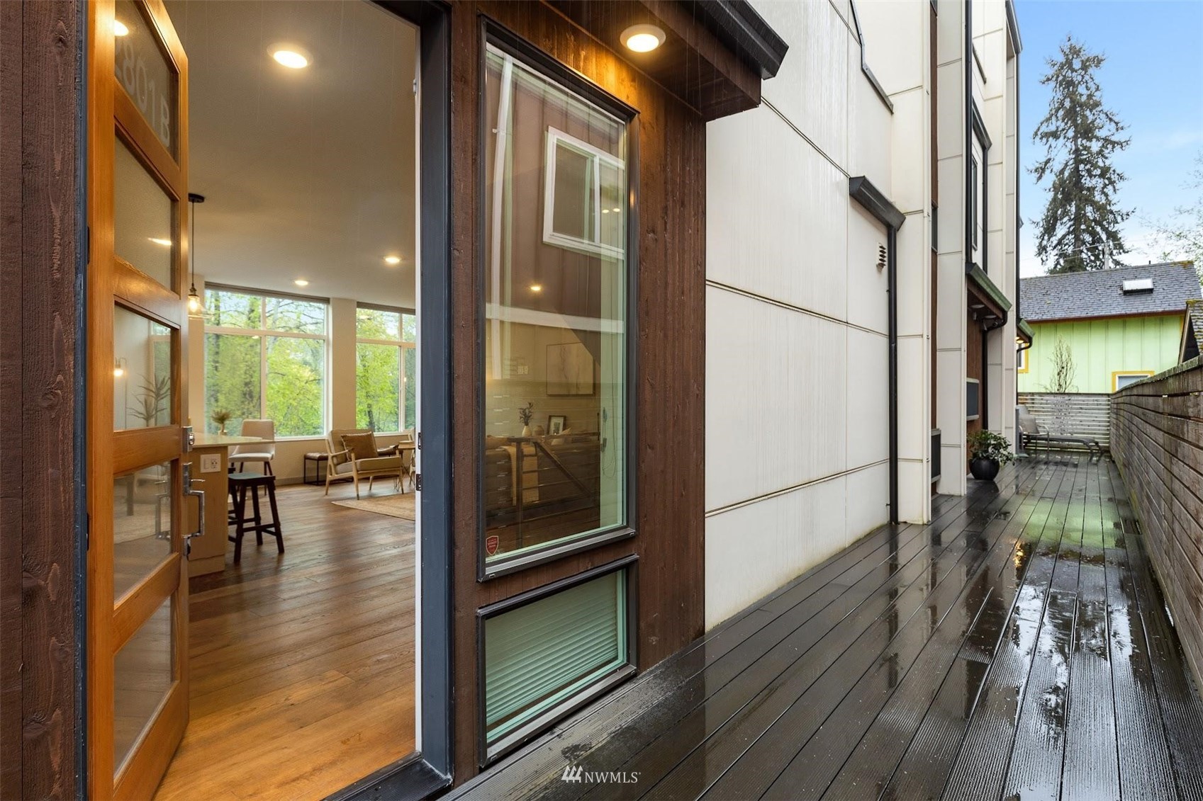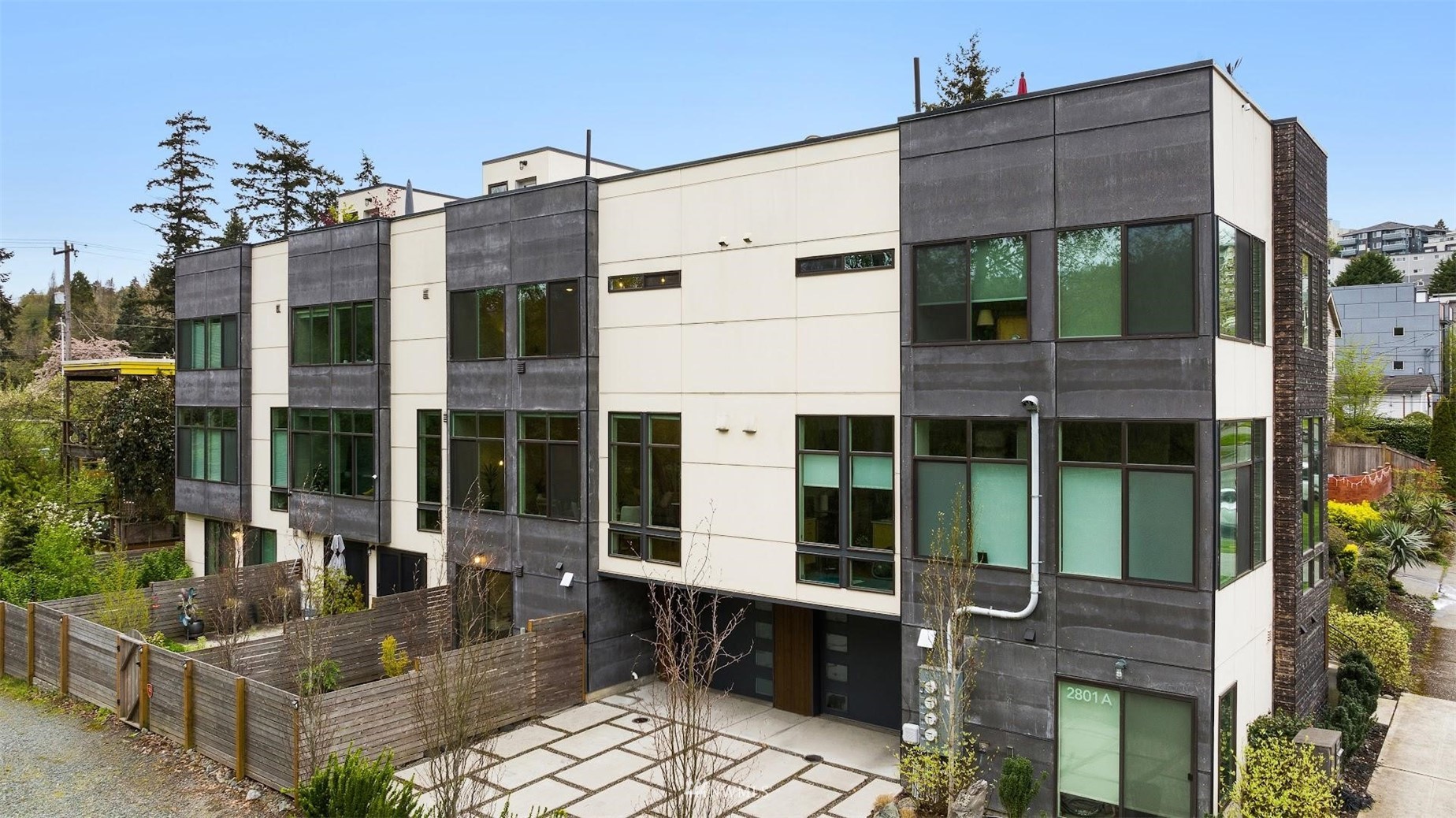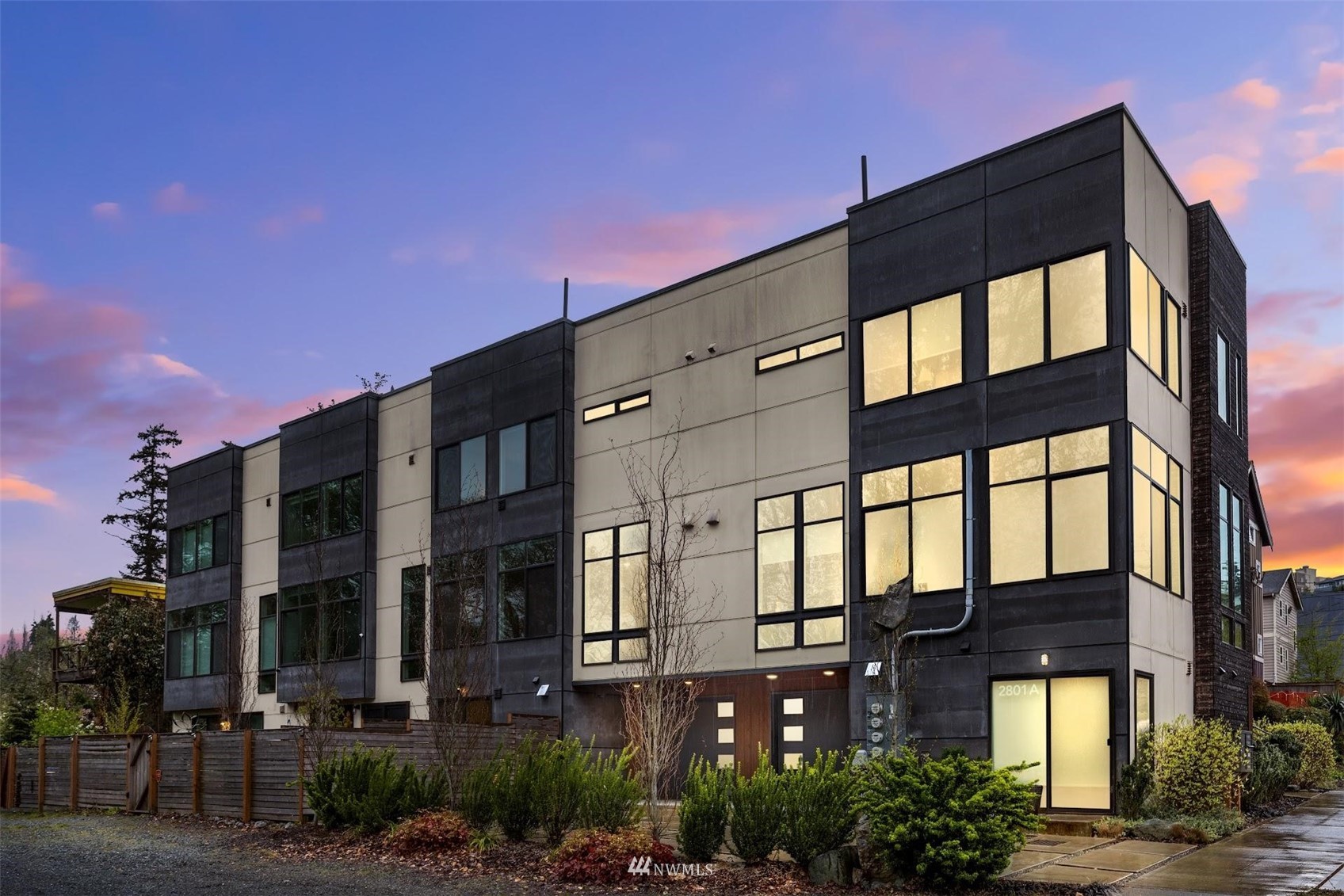 Come and see this modern and ultra-efficient 3-bedroom townhome! Natural light filters into the open kitchen & living room from a wall of windows overlooking the adjacent greenbelt and creek. The main suite (w/ large walk-in shower) and 2nd bedroom are located upstairs w/ access to the rooftop deck overlooking the golf course + views of downtown. The lower level has a bedroom/office with ensuite bathroom including radiant heat - perfect for a home office! Engineered hardwood floors on main floor & upstairs, top down blinds/fully fenced yard/Ring cameras/Smart light switches that control all the lights in the house/4-star Built Green cert/mini-splits & HRV systems. Attached garage. Located minutes to downtown Seattle!