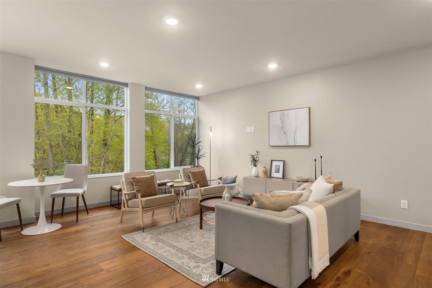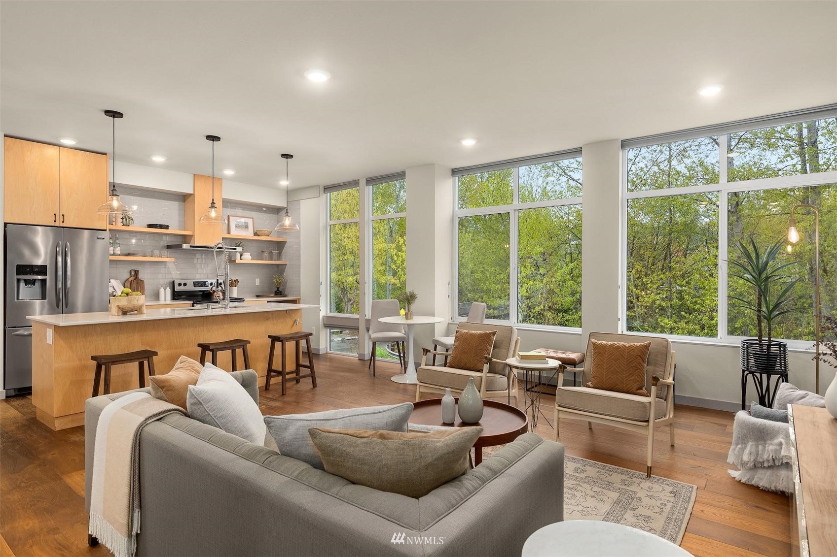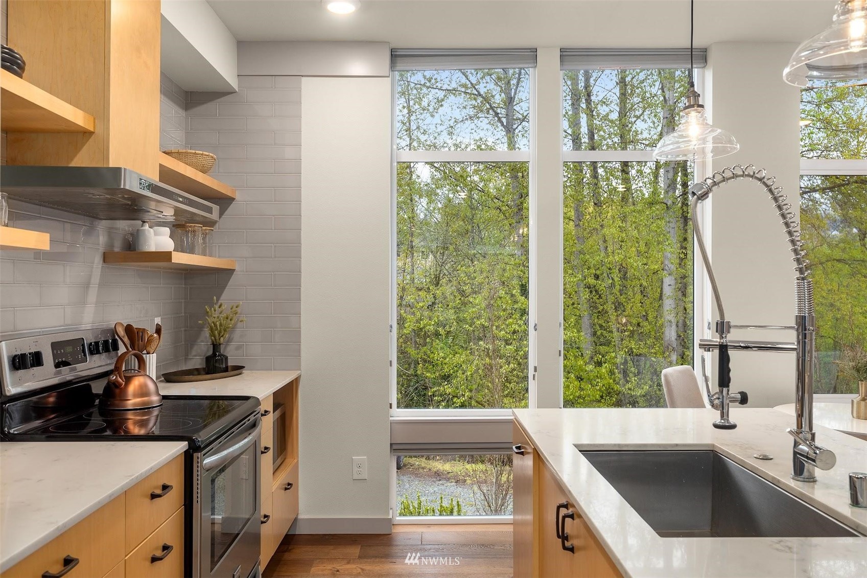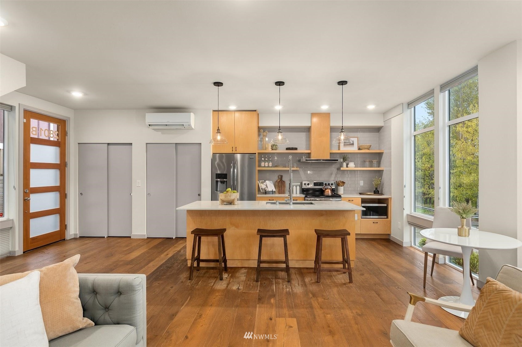 Come and see this modern and ultra-efficient 3-bedroom townhome! Natural light filters into the open kitchen & living room from a wall of windows overlooking the adjacent greenbelt and creek. The main suite (w/ large walk-in shower) and 2nd bedroom are located upstairs w/ access to the rooftop deck overlooking the golf course + views of downtown. The lower level has a bedroom/office with ensuite bathroom including radiant heat - perfect for a home office! Engineered hardwood floors on main floor & upstairs, top down blinds/fully fenced yard/Ring cameras/Smart light switches that control all the lights in the house/4-star Built Green cert/mini-splits & HRV systems. Attached garage. Located minutes to downtown Seattle!