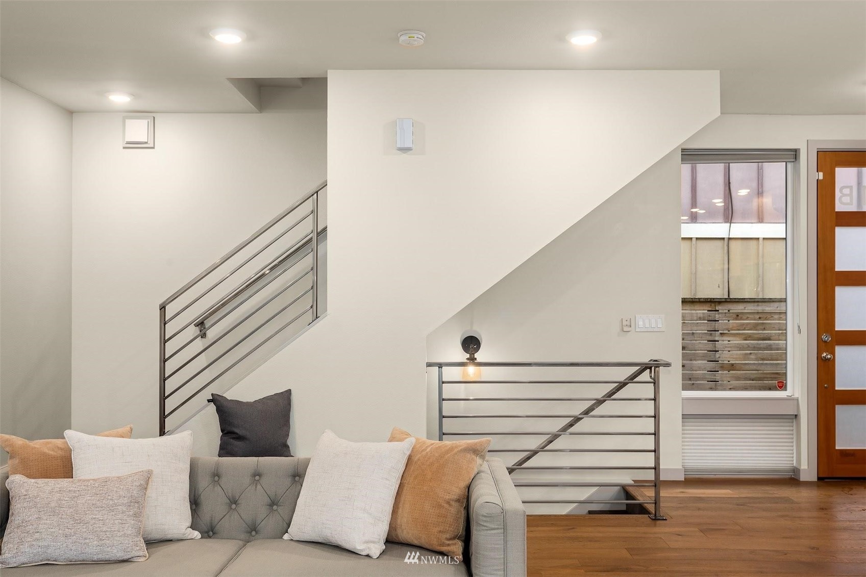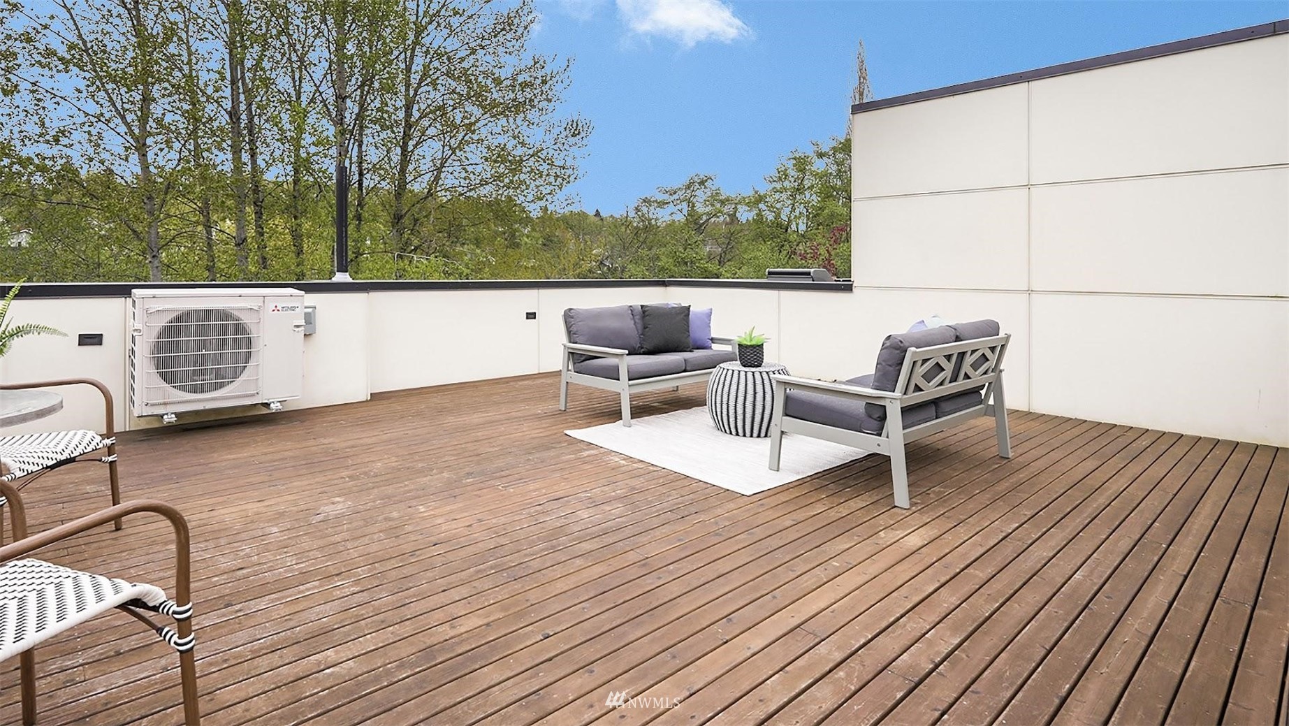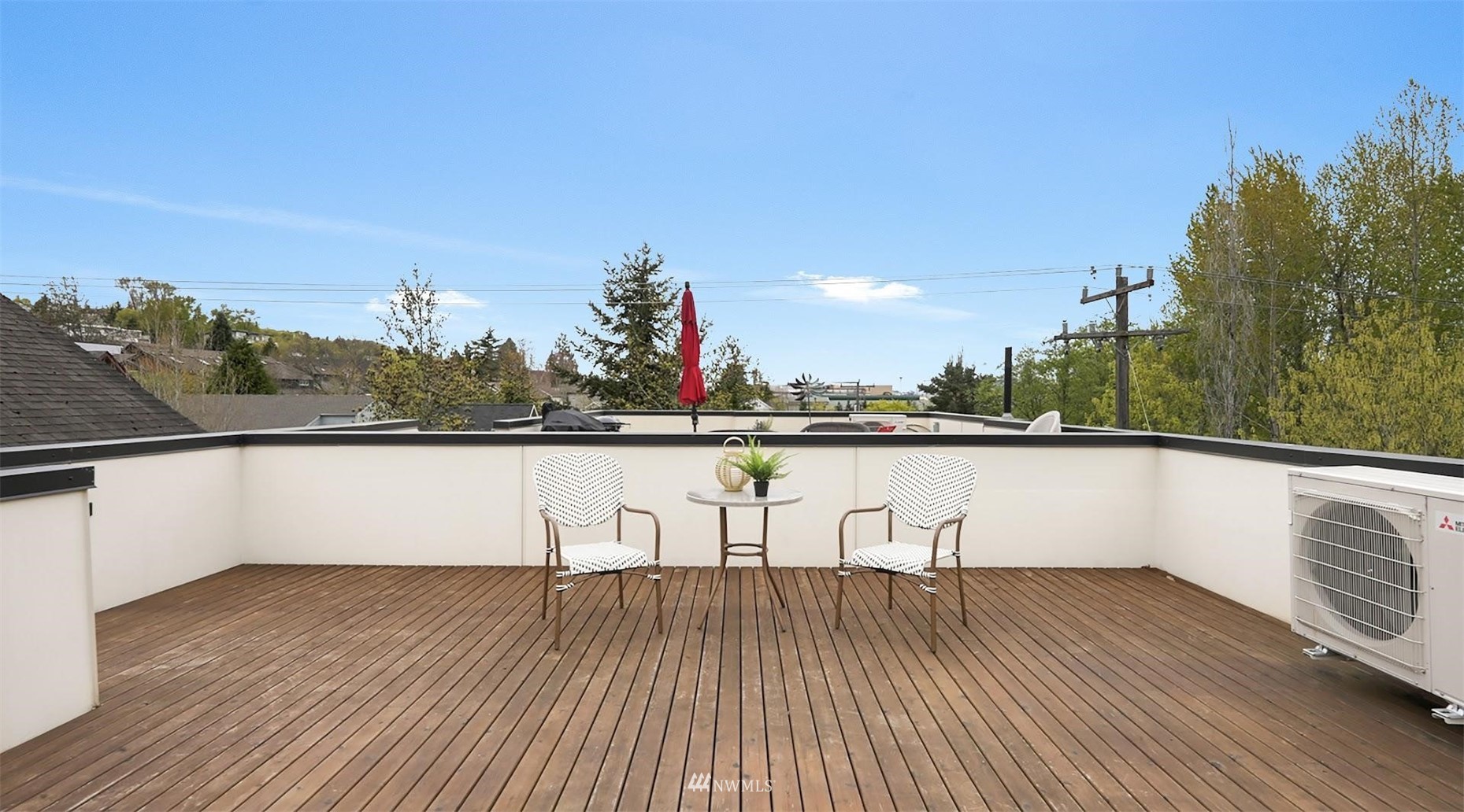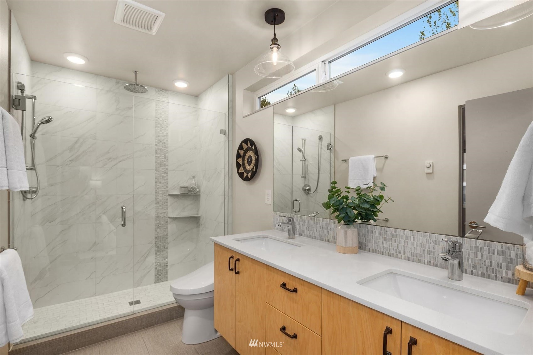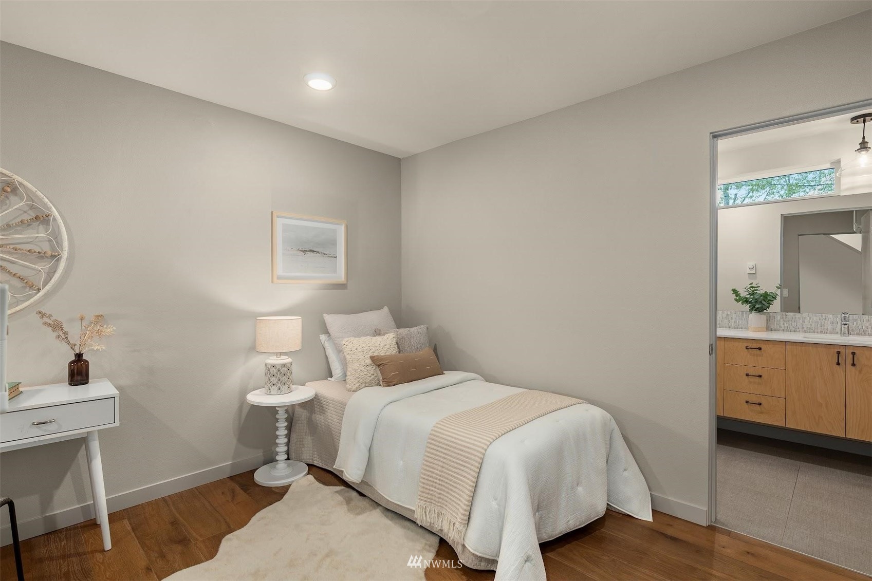 Come and see this modern and ultra-efficient 3-bedroom townhome! Natural light filters into the open kitchen & living room from a wall of windows overlooking the adjacent greenbelt and creek. The main suite (w/ large walk-in shower) and 2nd bedroom are located upstairs w/ access to the rooftop deck overlooking the golf course + views of downtown. The lower level has a bedroom/office with ensuite bathroom including radiant heat - perfect for a home office! Engineered hardwood floors on main floor & upstairs, top down blinds/fully fenced yard/Ring cameras/Smart light switches that control all the lights in the house/4-star Built Green cert/mini-splits & HRV systems. Attached garage. Located minutes to downtown Seattle!