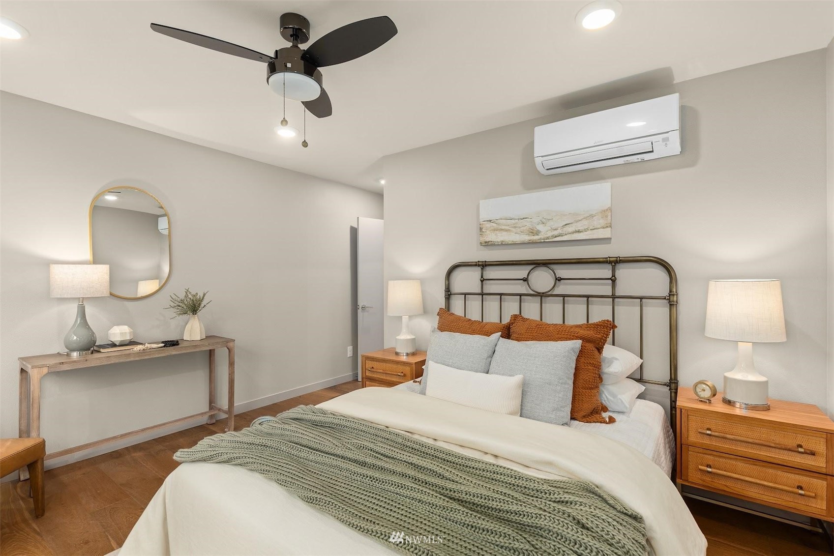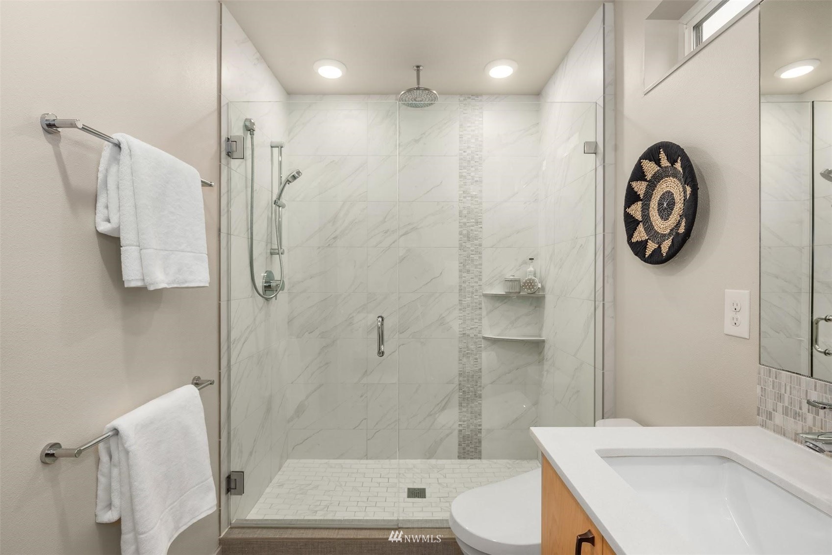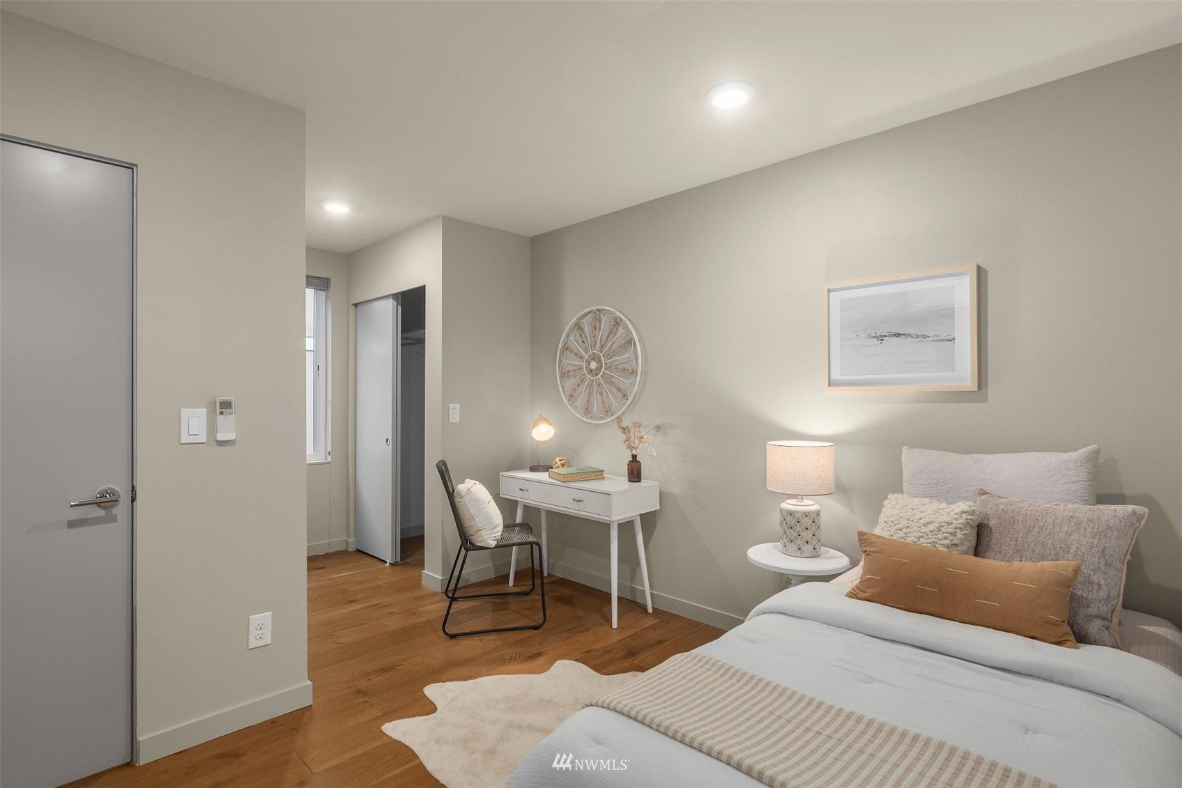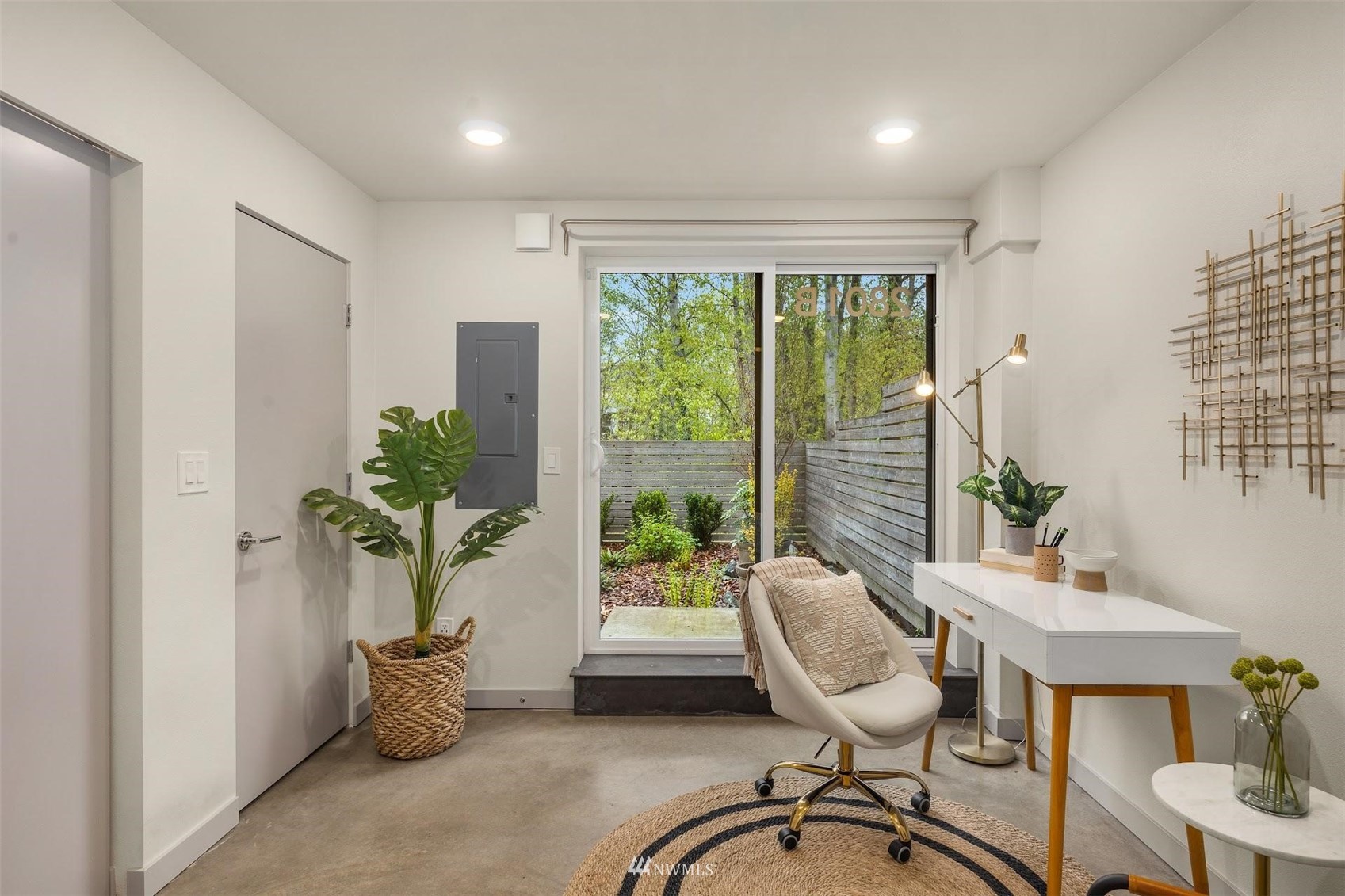Come and see this modern and ultra-efficient 3-bedroom townhome! Natural light filters into the open kitchen & living room from a wall of windows overlooking the adjacent greenbelt and creek. The main suite (w/ large walk-in shower) and 2nd bedroom are located upstairs w/ access to the rooftop deck overlooking the golf course + views of downtown. The lower level has a bedroom/office with ensuite bathroom including radiant heat - perfect for a home office! Engineered hardwood floors on main floor & upstairs, top down blinds/fully fenced yard/Ring cameras/Smart light switches that control all the lights in the house/4-star Built Green cert/mini-splits & HRV systems. Attached garage. Located minutes to downtown Seattle!