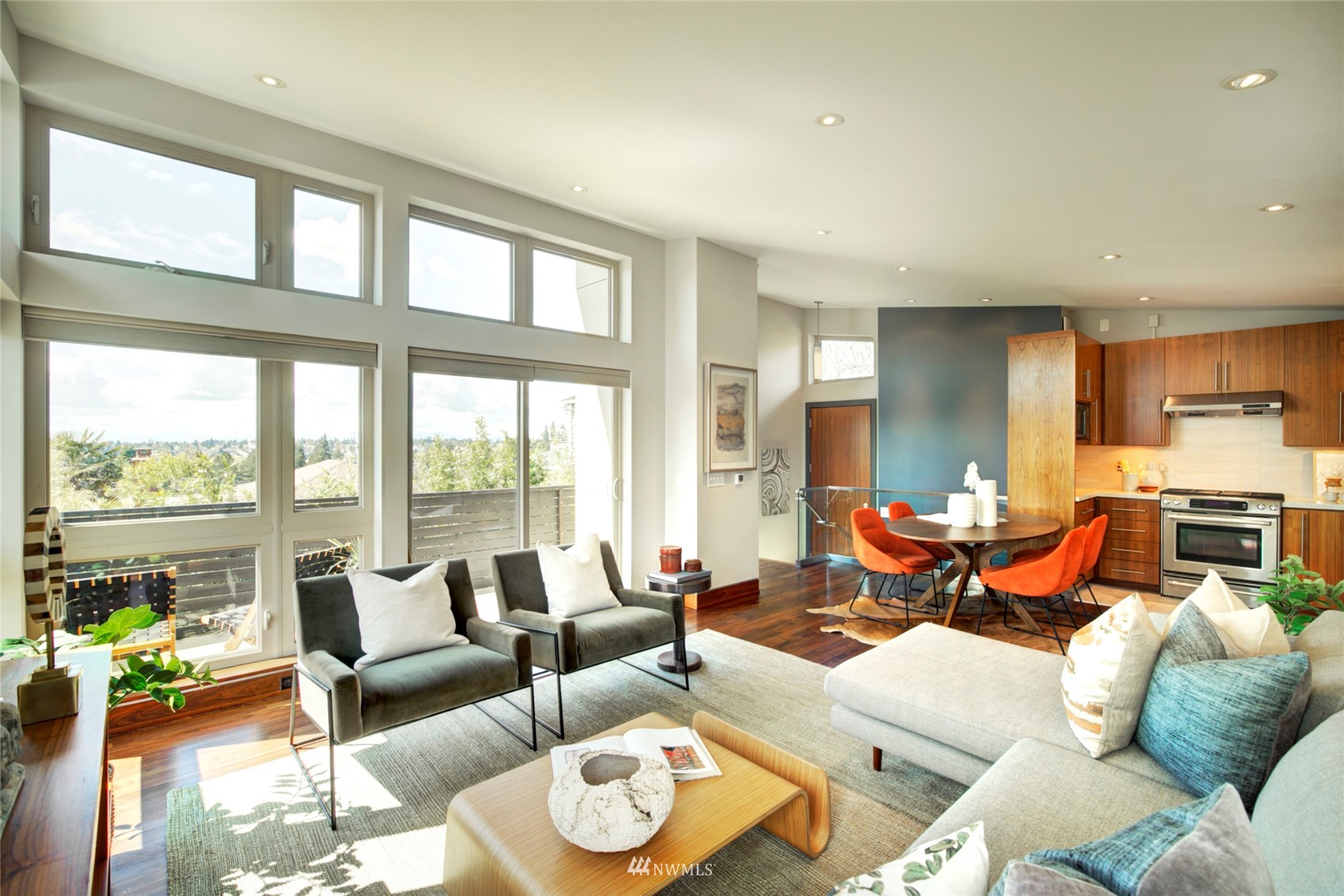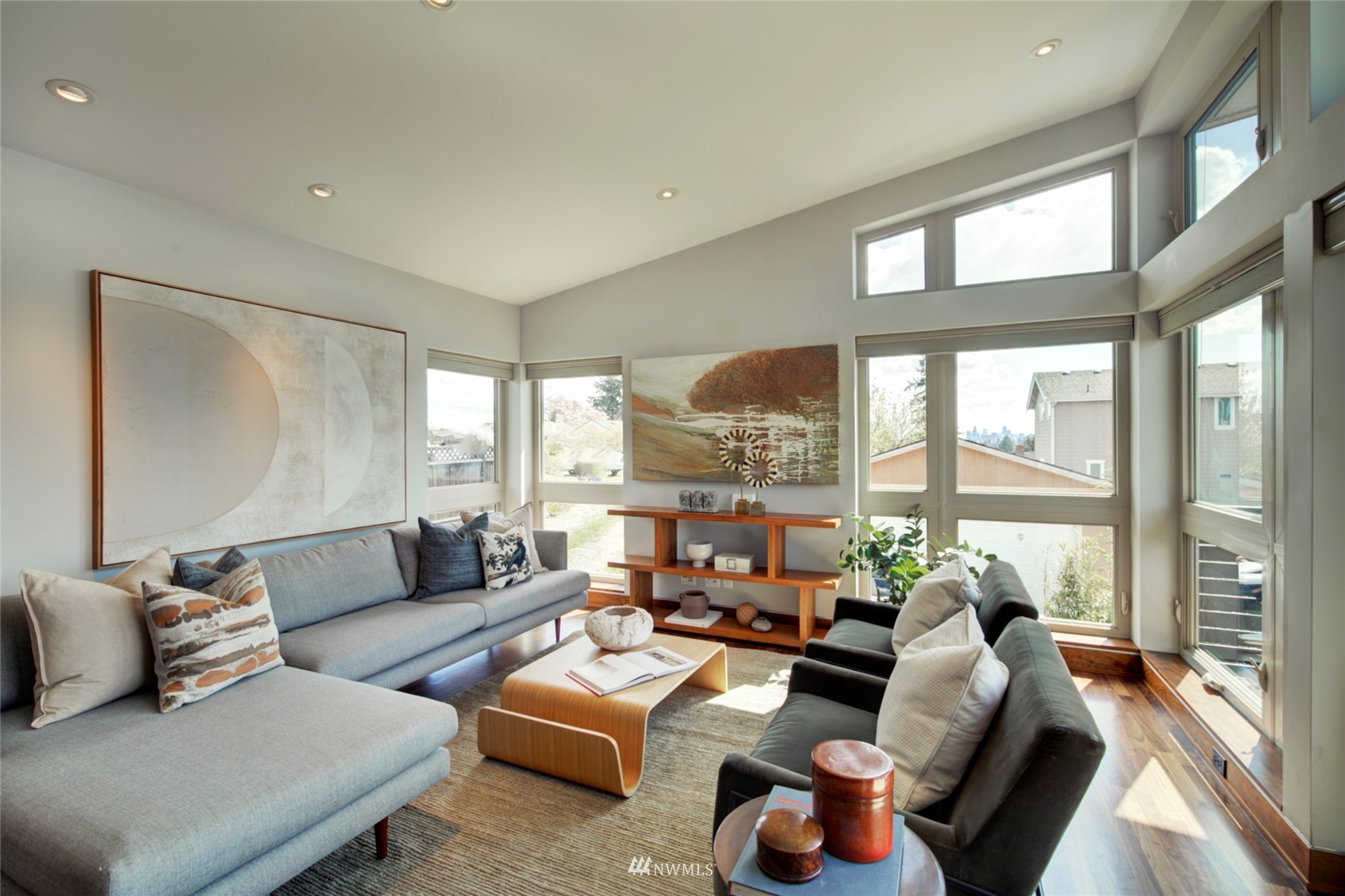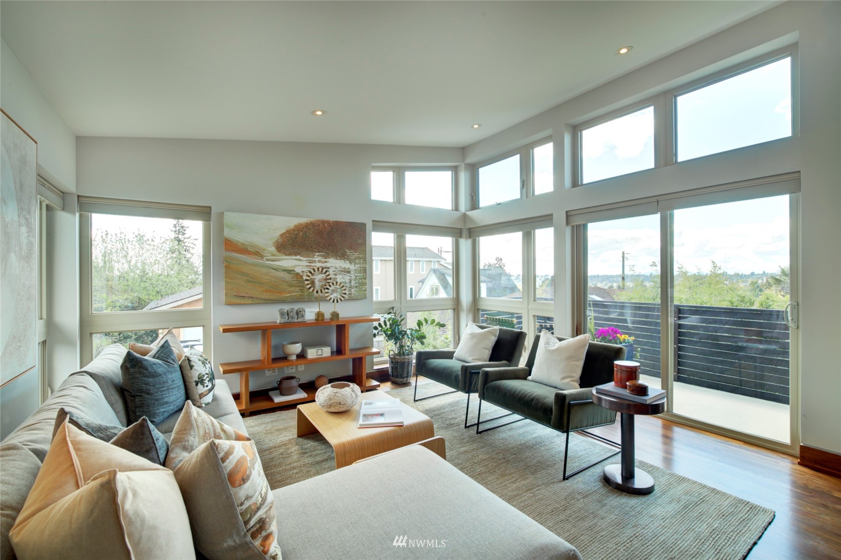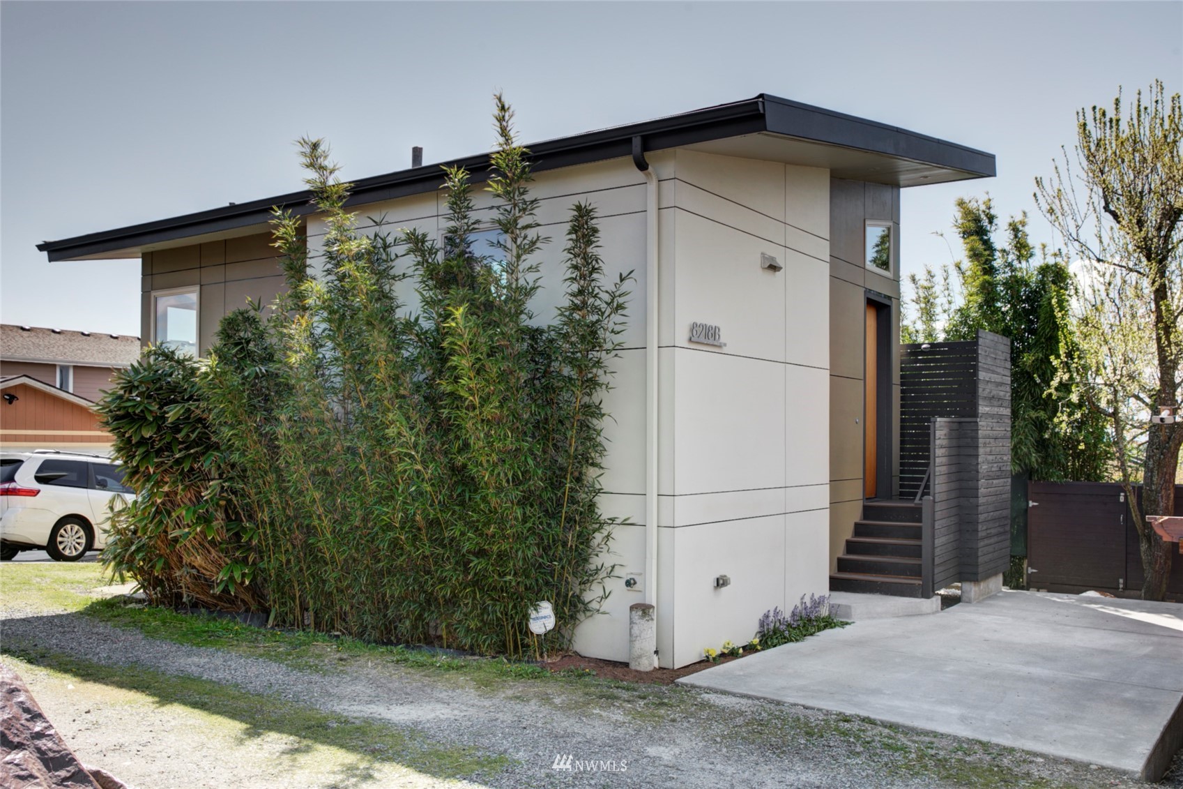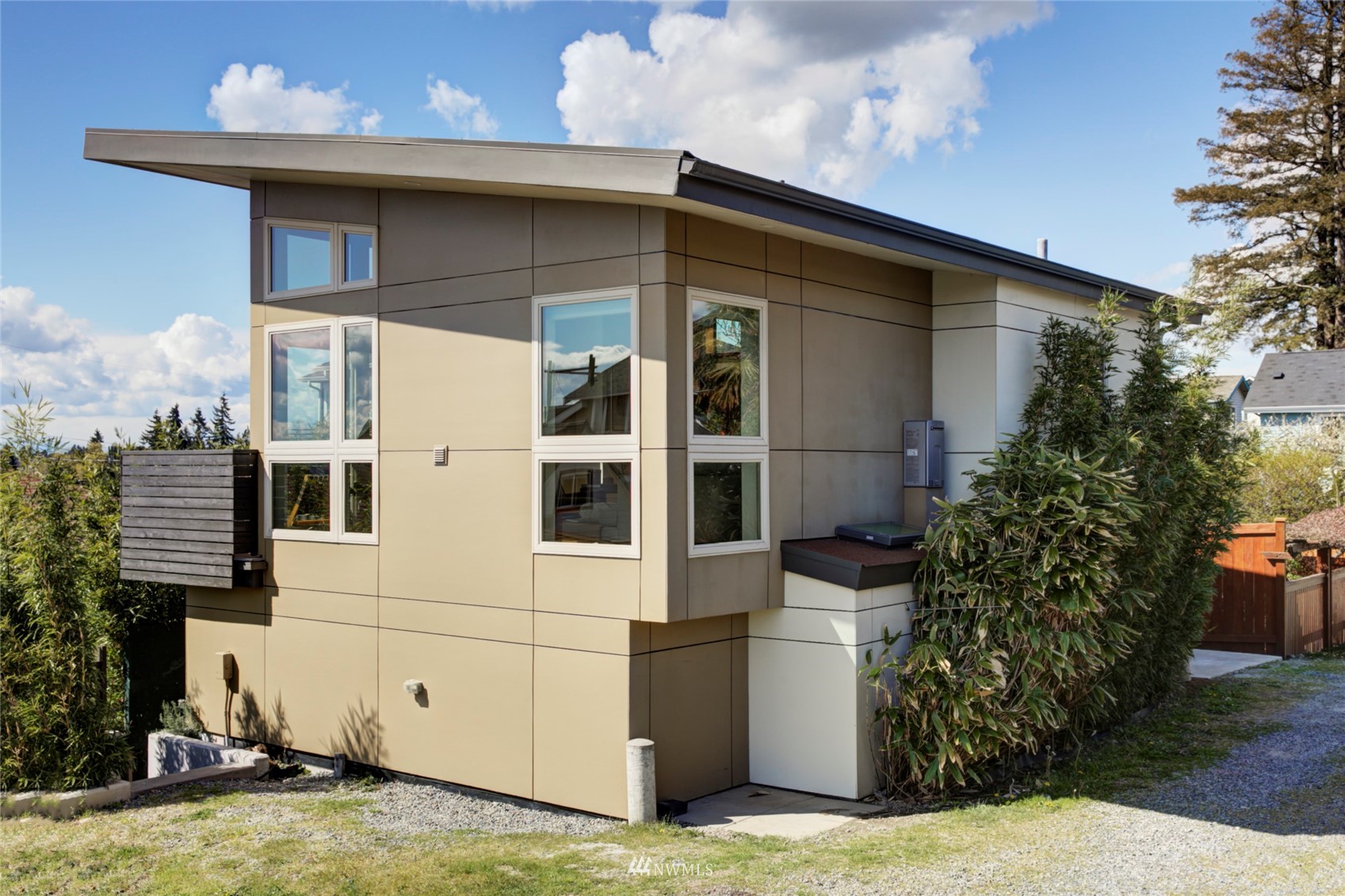 Sophisticated. Unique. Views. Immerse yourself in the seductive splendor of this 2 bed, 2 bath home with unmatched privacy & comfort. Relax in unparalleled luxury w/newly finished solid walnut floors up & tiled floors down; Both with in floor radiant heat with A.I. thermostats. Protected, western Olympic views for magical sunsets. Seattle City views too. Thoughtful design, fit, & finish throughout W/exclusive features. One-year warranty. KitchenAid fridge & gas stove, Bosch dishwasher. One ample parking space plus shared guest parking space. Large, private patio. Spacious deck. Storage shed. Ultra-high energy efficiency. Power available for future AC-mini split and car charger. This home exudes true Modern luxury and is a must see.
