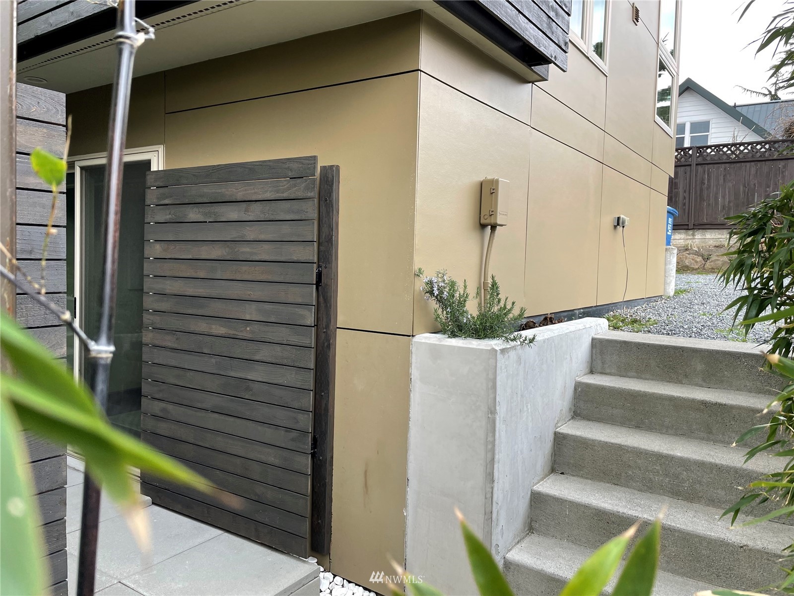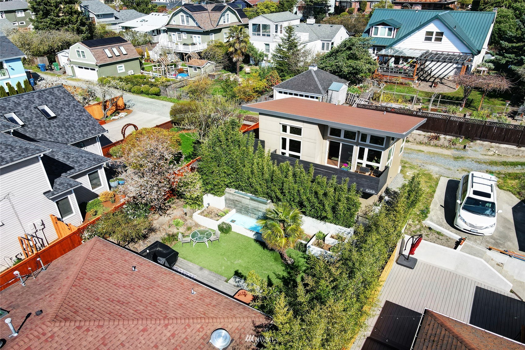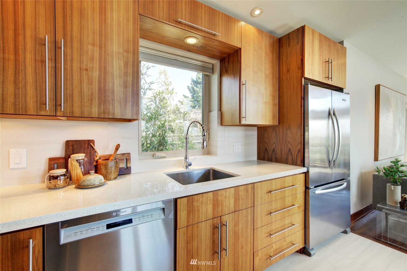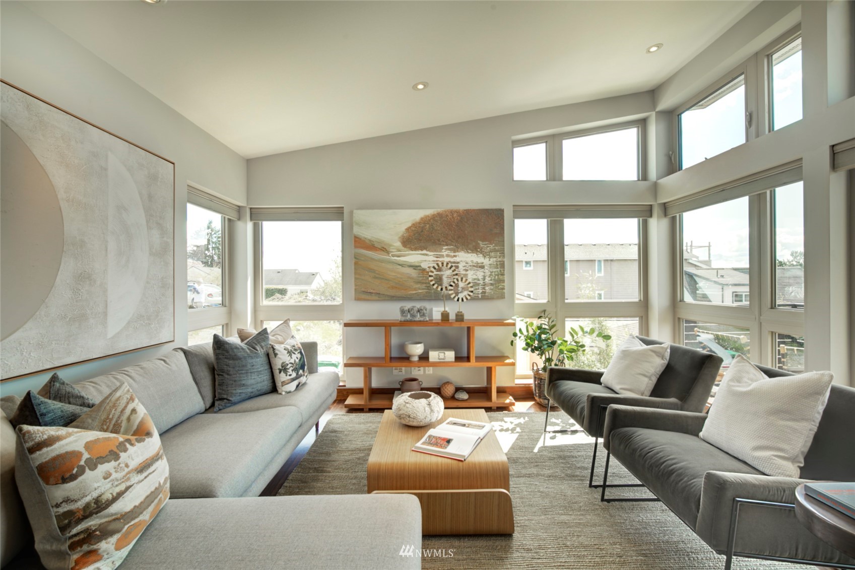 Sophisticated. Unique. Views. Immerse yourself in the seductive splendor of this 2 bed, 2 bath home with unmatched privacy & comfort. Relax in unparalleled luxury w/newly finished solid walnut floors up & tiled floors down; Both with in floor radiant heat with A.I. thermostats. Protected, western Olympic views for magical sunsets. Seattle City views too. Thoughtful design, fit, & finish throughout W/exclusive features. One-year warranty. KitchenAid fridge & gas stove, Bosch dishwasher. One ample parking space plus shared guest parking space. Large, private patio. Spacious deck. Storage shed. Ultra-high energy efficiency. Power available for future AC-mini split and car charger. This home exudes true Modern luxury and is a must see.