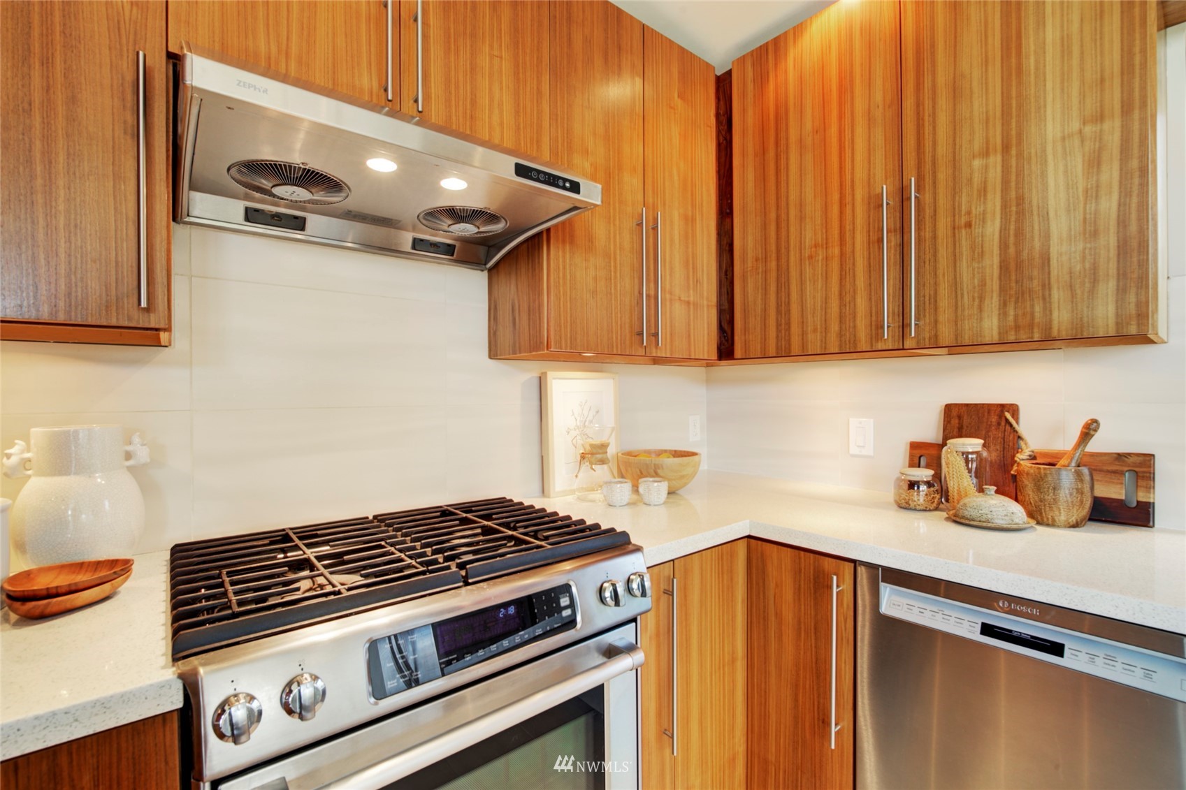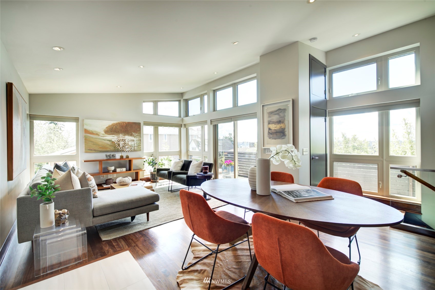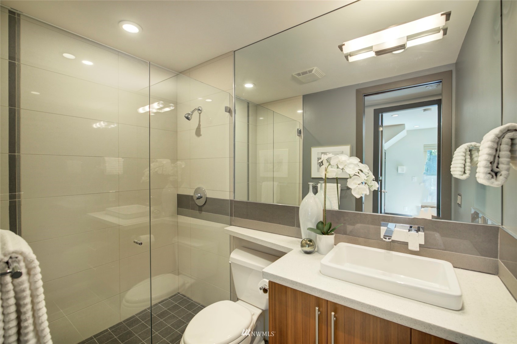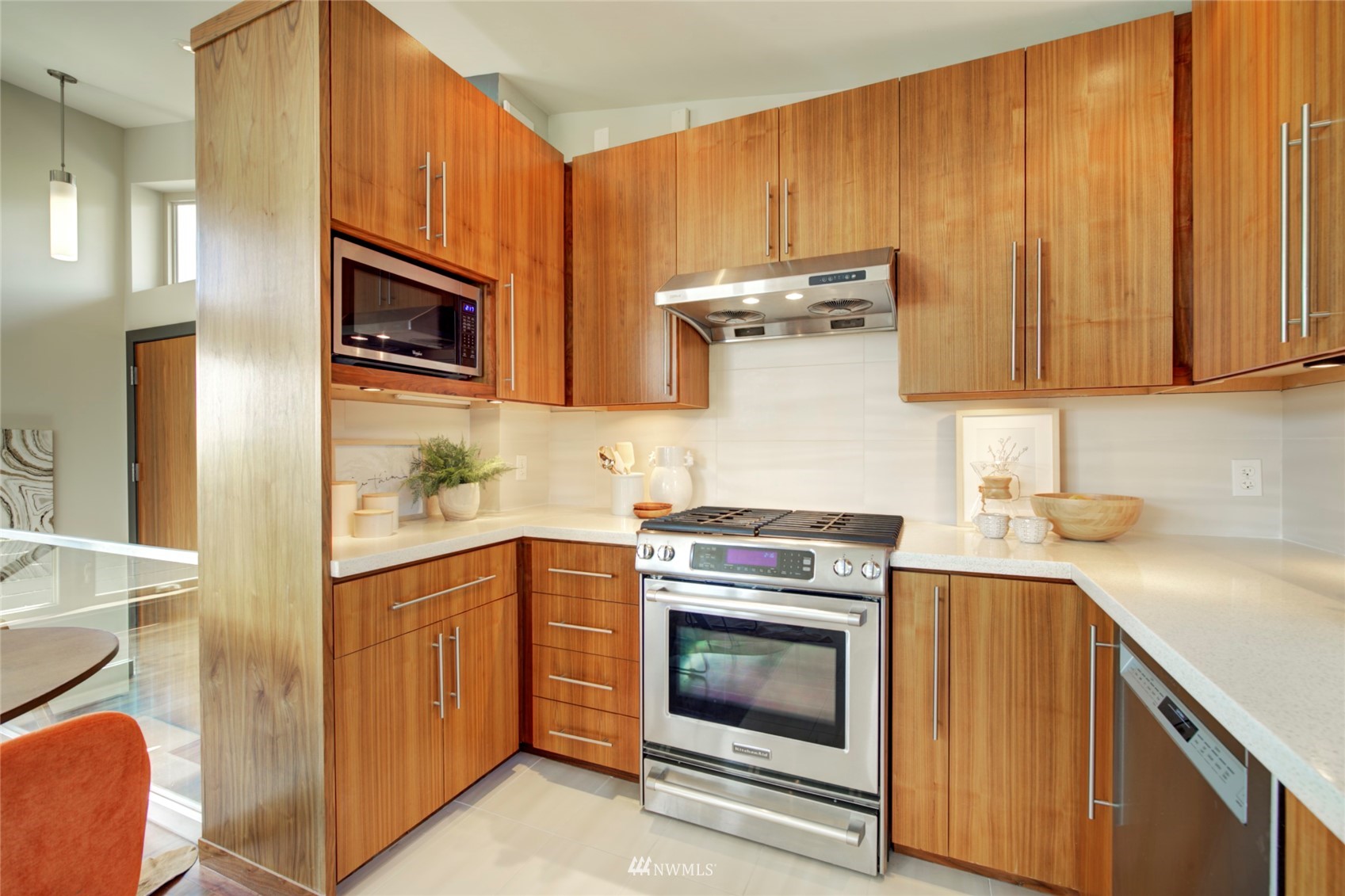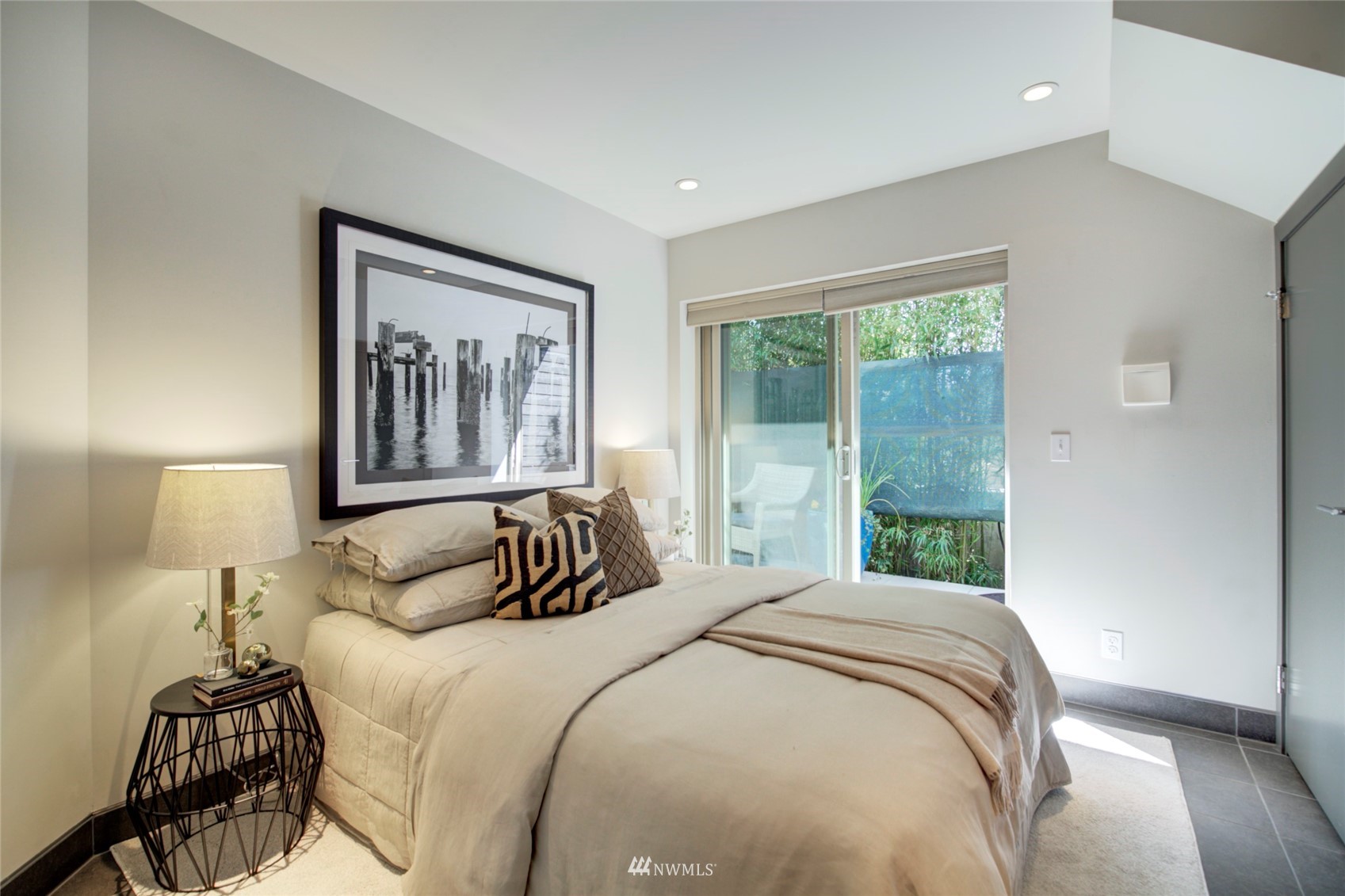 Sophisticated. Unique. Views. Immerse yourself in the seductive splendor of this 2 bed, 2 bath home with unmatched privacy & comfort. Relax in unparalleled luxury w/newly finished solid walnut floors up & tiled floors down; Both with in floor radiant heat with A.I. thermostats. Protected, western Olympic views for magical sunsets. Seattle City views too. Thoughtful design, fit, & finish throughout W/exclusive features. One-year warranty. KitchenAid fridge & gas stove, Bosch dishwasher. One ample parking space plus shared guest parking space. Large, private patio. Spacious deck. Storage shed. Ultra-high energy efficiency. Power available for future AC-mini split and car charger. This home exudes true Modern luxury and is a must see.