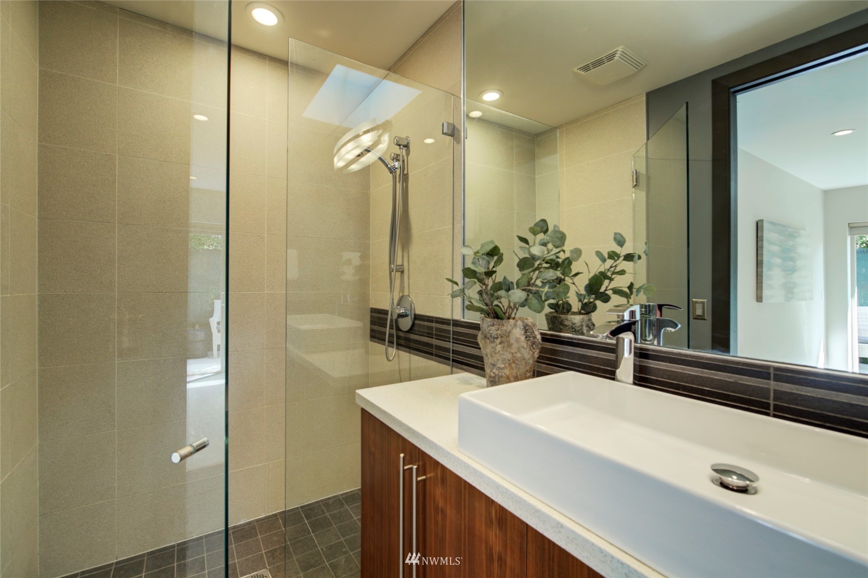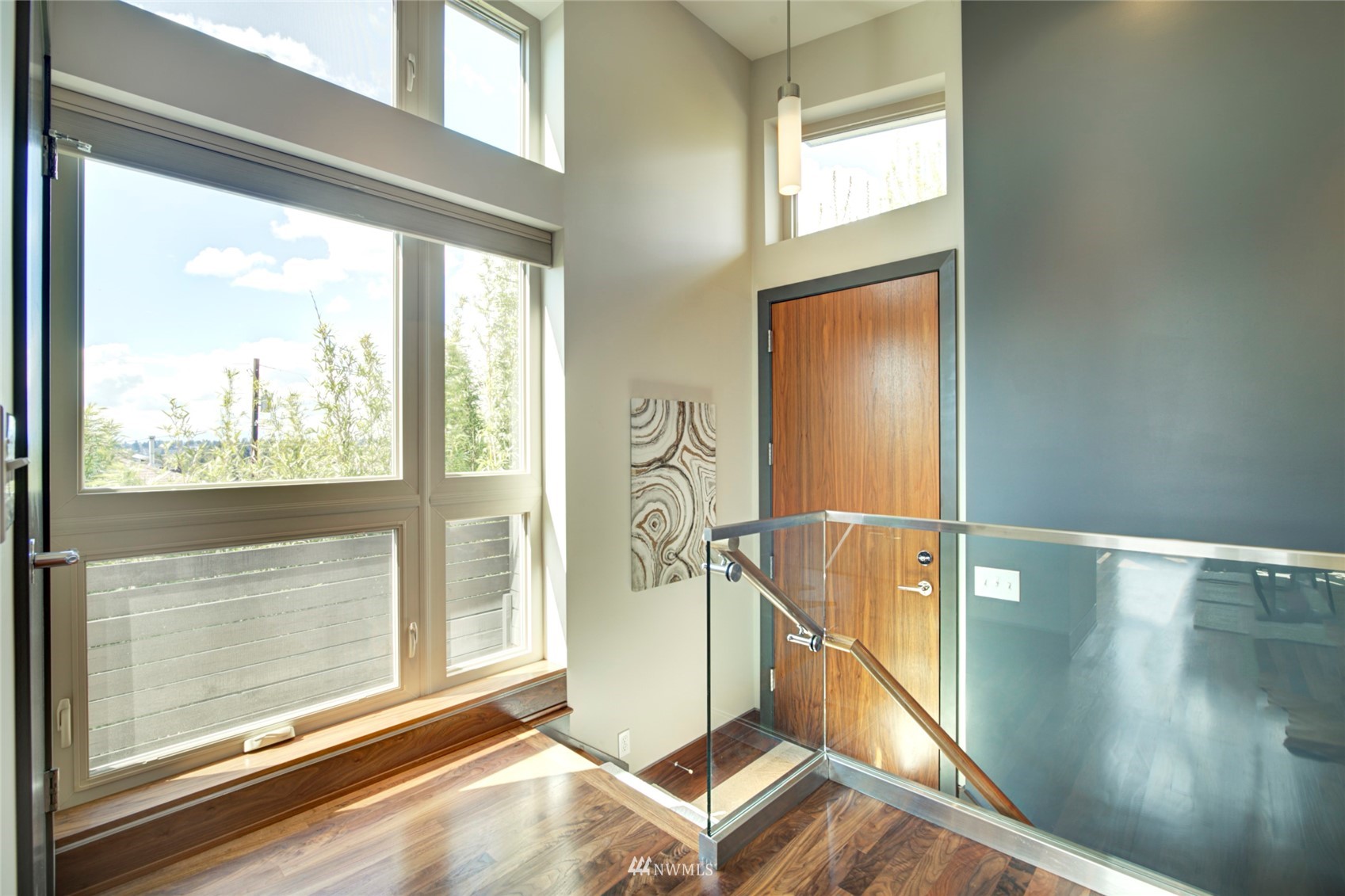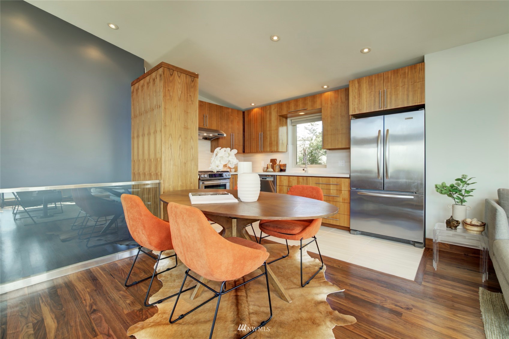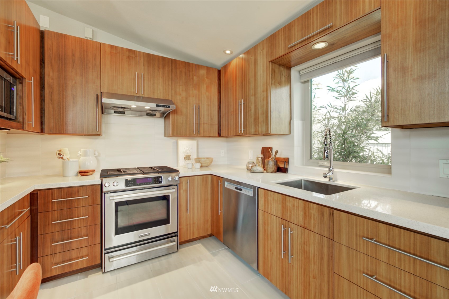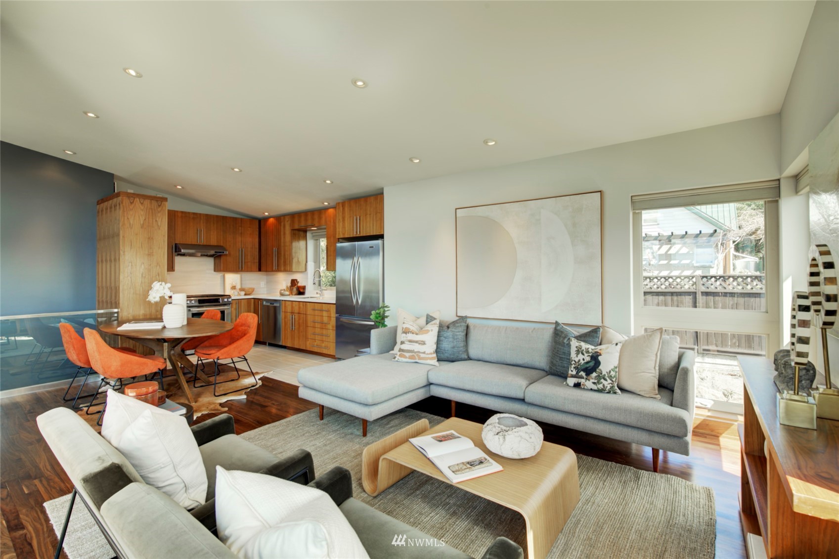 Sophisticated. Unique. Views. Immerse yourself in the seductive splendor of this 2 bed, 2 bath home with unmatched privacy & comfort. Relax in unparalleled luxury w/newly finished solid walnut floors up & tiled floors down; Both with in floor radiant heat with A.I. thermostats. Protected, western Olympic views for magical sunsets. Seattle City views too. Thoughtful design, fit, & finish throughout W/exclusive features. One-year warranty. KitchenAid fridge & gas stove, Bosch dishwasher. One ample parking space plus shared guest parking space. Large, private patio. Spacious deck. Storage shed. Ultra-high energy efficiency. Power available for future AC-mini split and car charger. This home exudes true Modern luxury and is a must see.