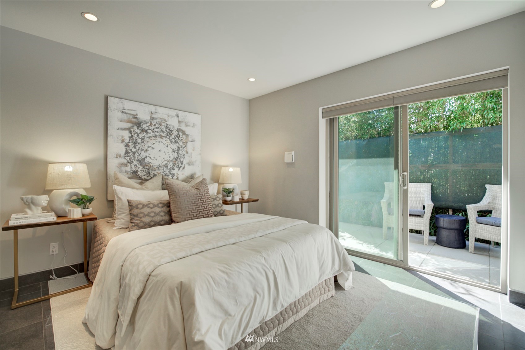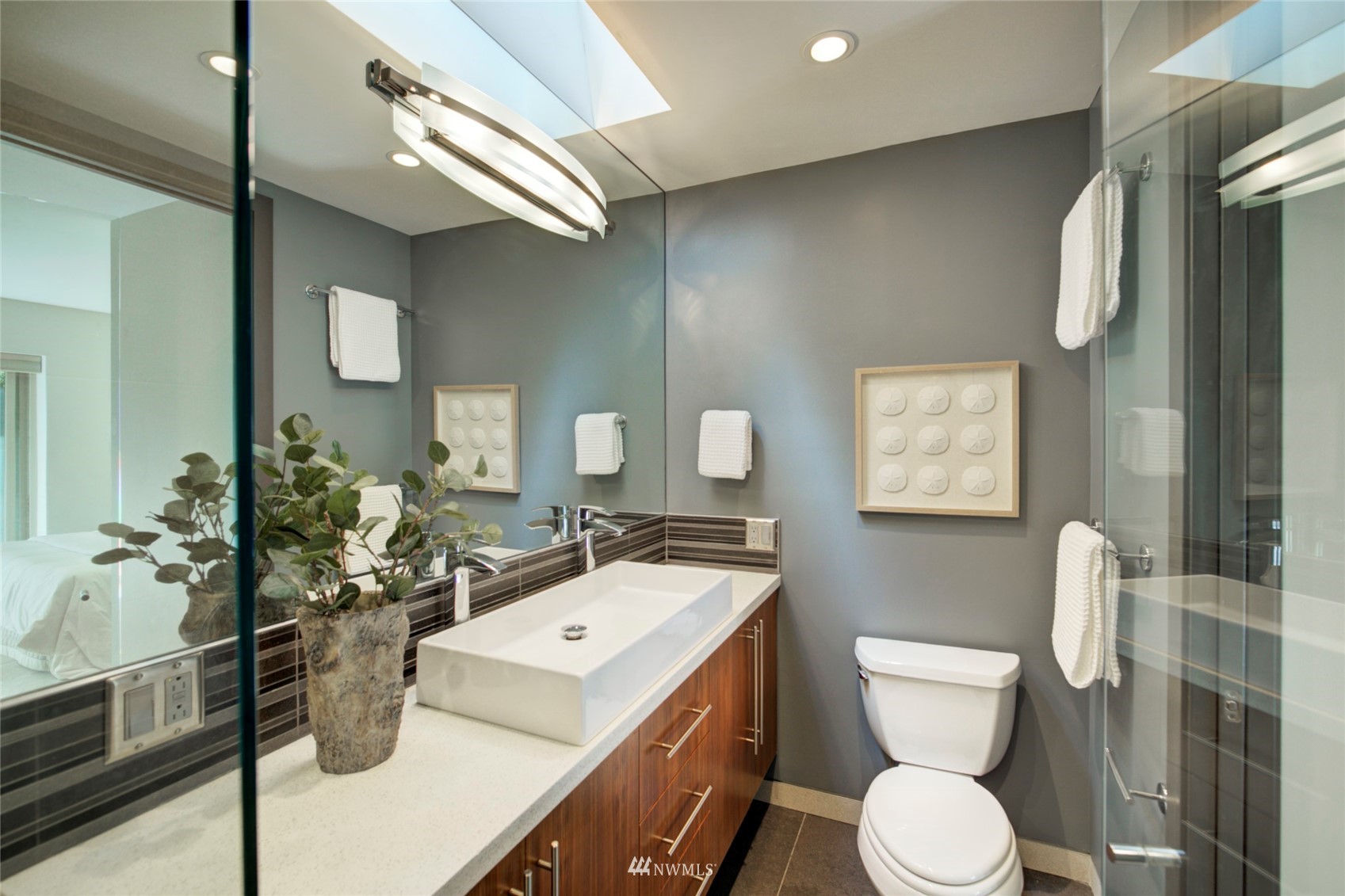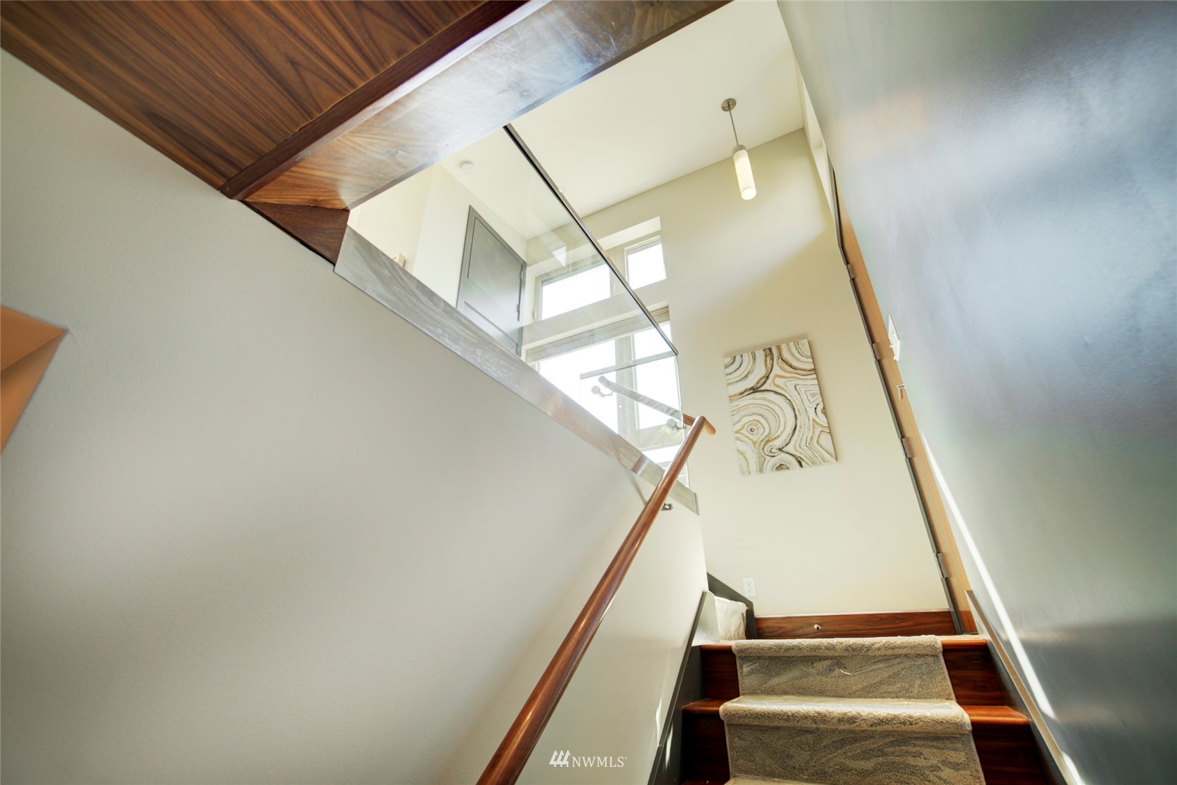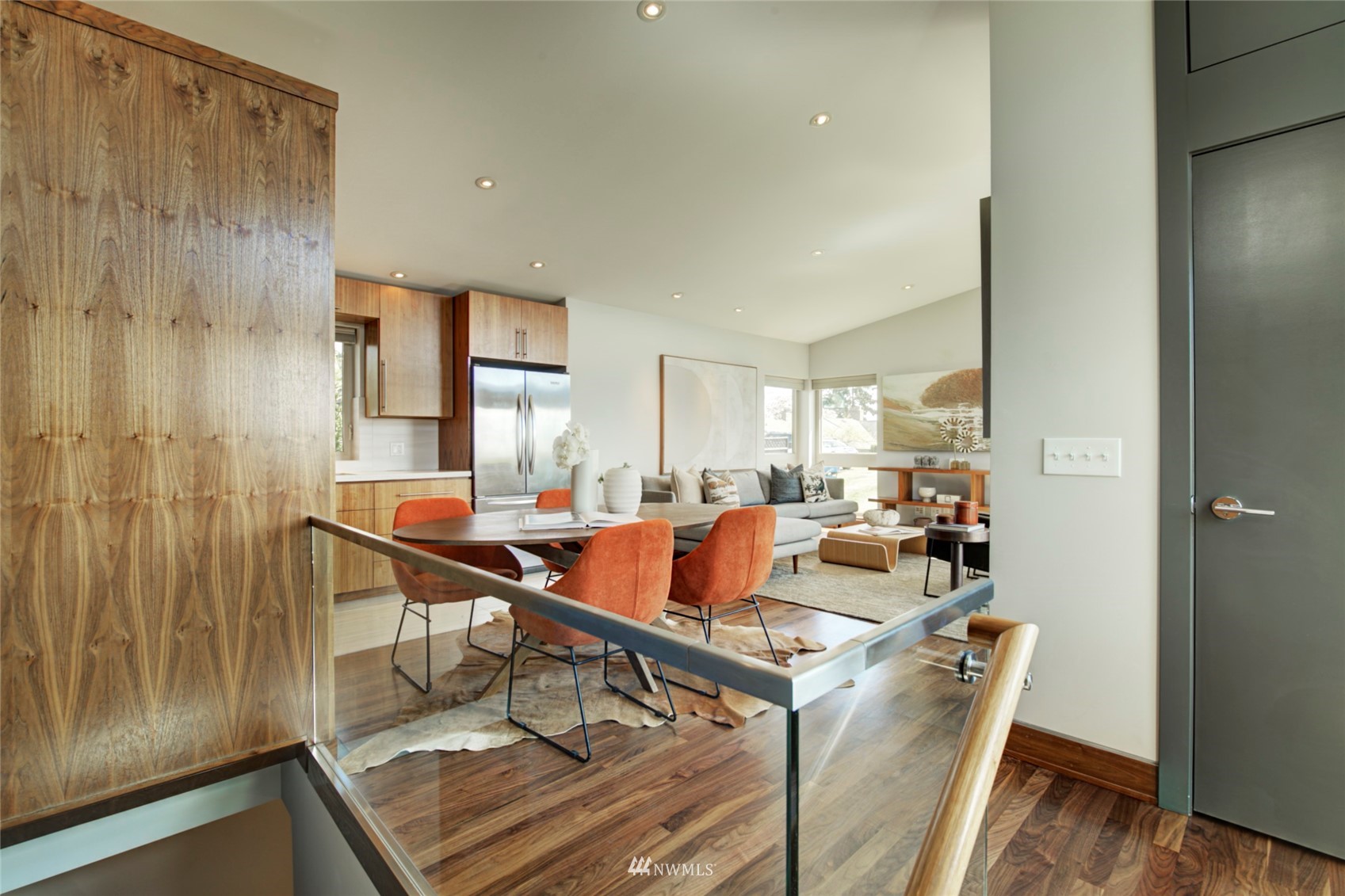 Sophisticated. Unique. Views. Immerse yourself in the seductive splendor of this 2 bed, 2 bath home with unmatched privacy & comfort. Relax in unparalleled luxury w/newly finished solid walnut floors up & tiled floors down; Both with in floor radiant heat with A.I. thermostats. Protected, western Olympic views for magical sunsets. Seattle City views too. Thoughtful design, fit, & finish throughout W/exclusive features. One-year warranty. KitchenAid fridge & gas stove, Bosch dishwasher. One ample parking space plus shared guest parking space. Large, private patio. Spacious deck. Storage shed. Ultra-high energy efficiency. Power available for future AC-mini split and car charger. This home exudes true Modern luxury and is a must see.