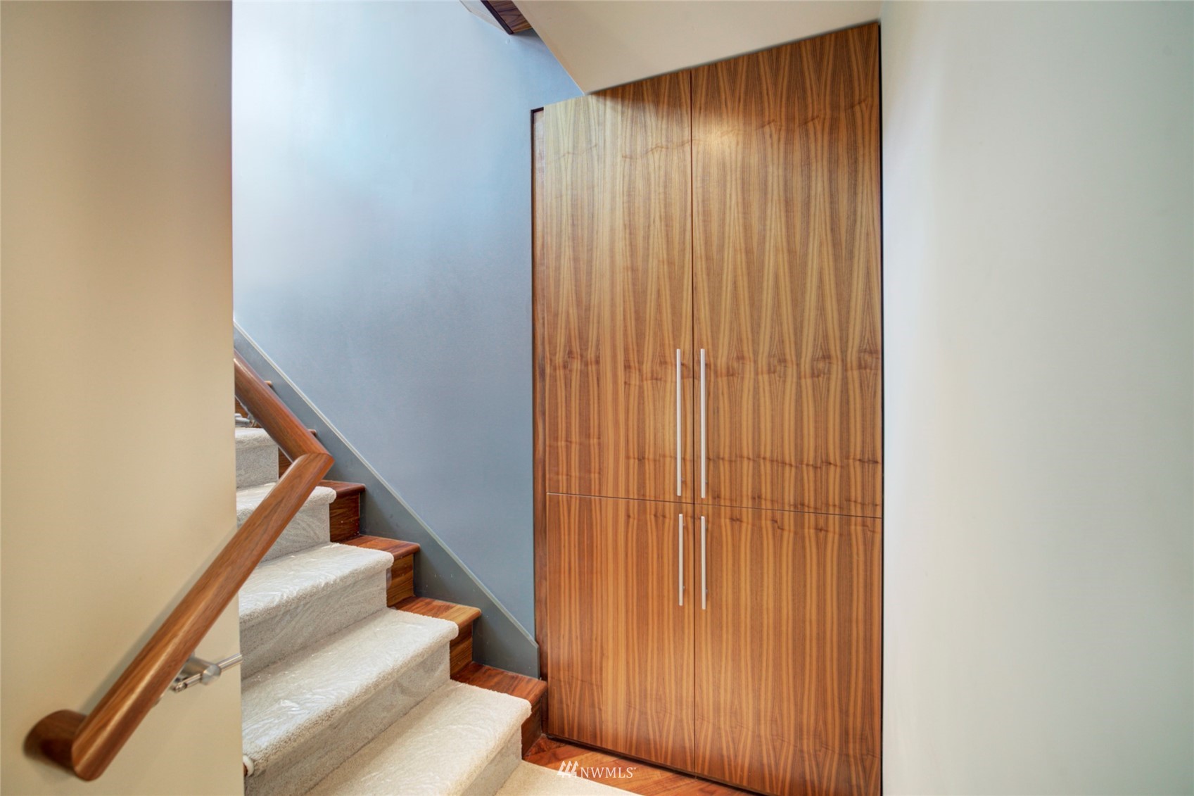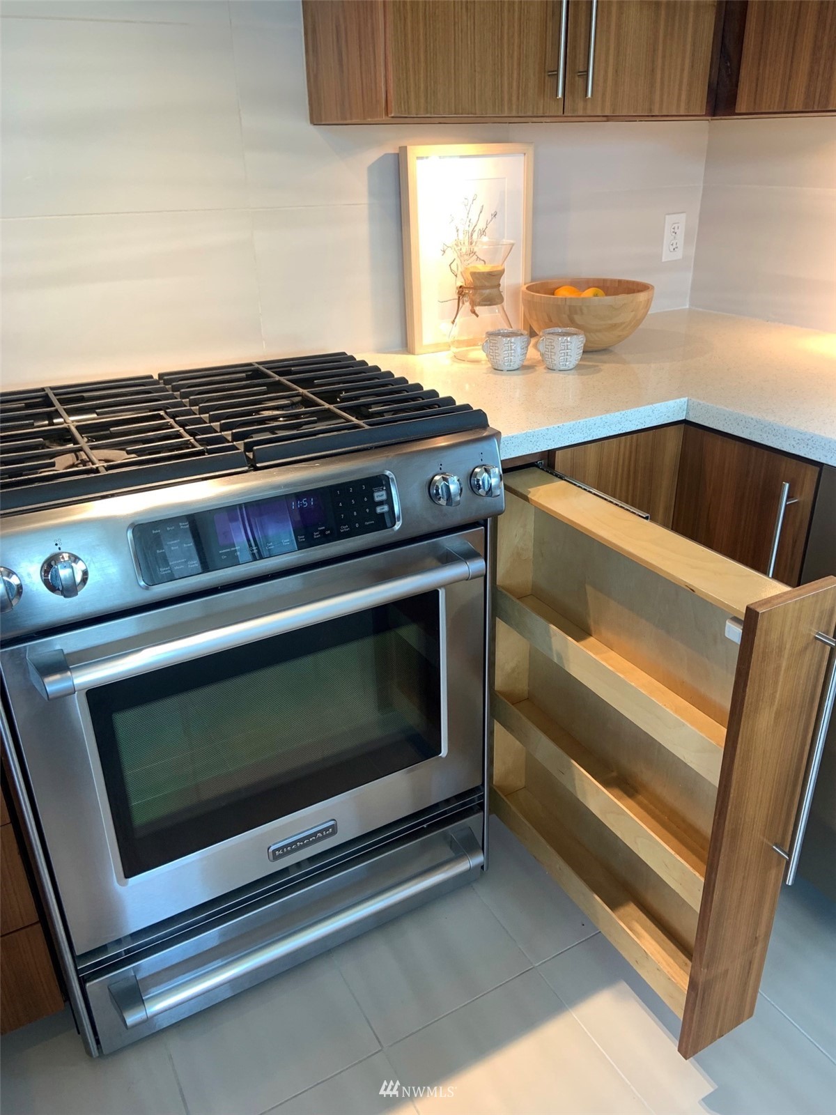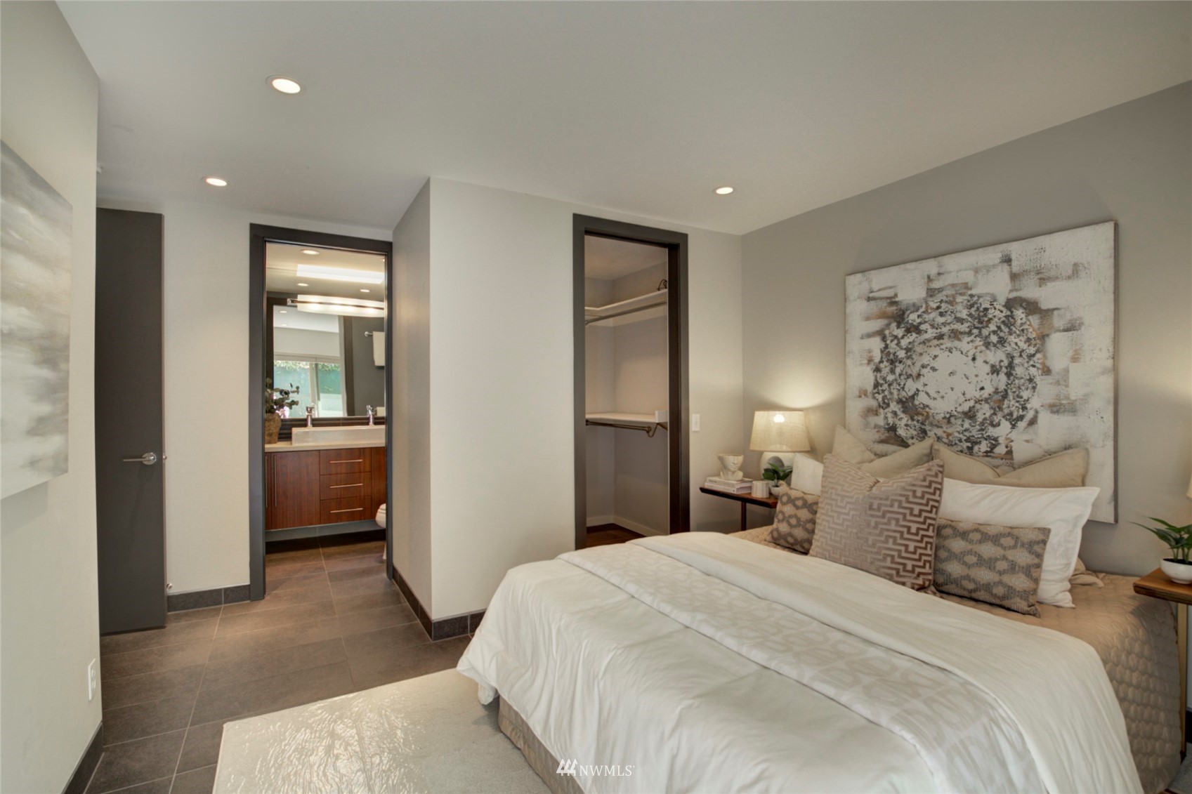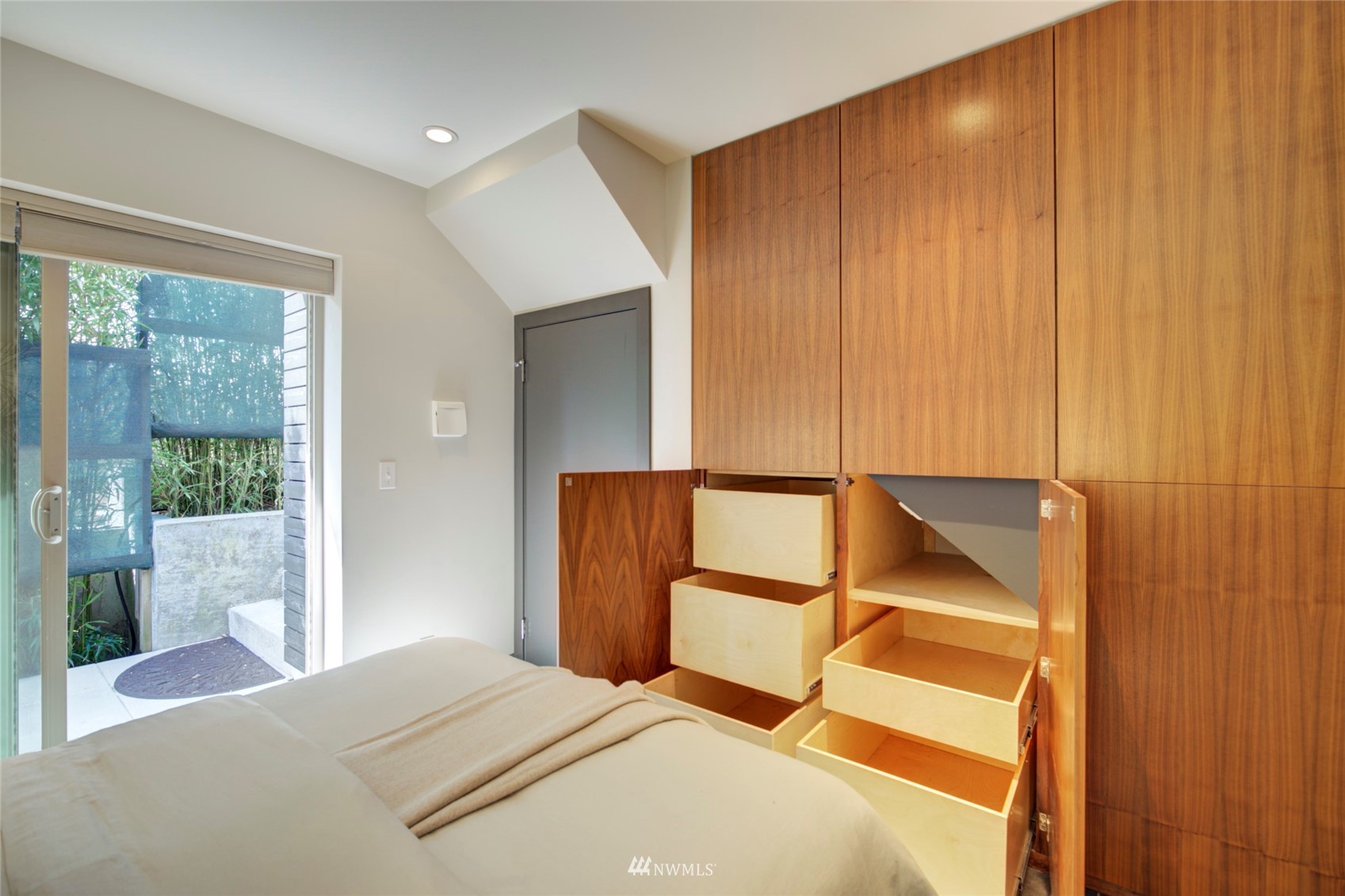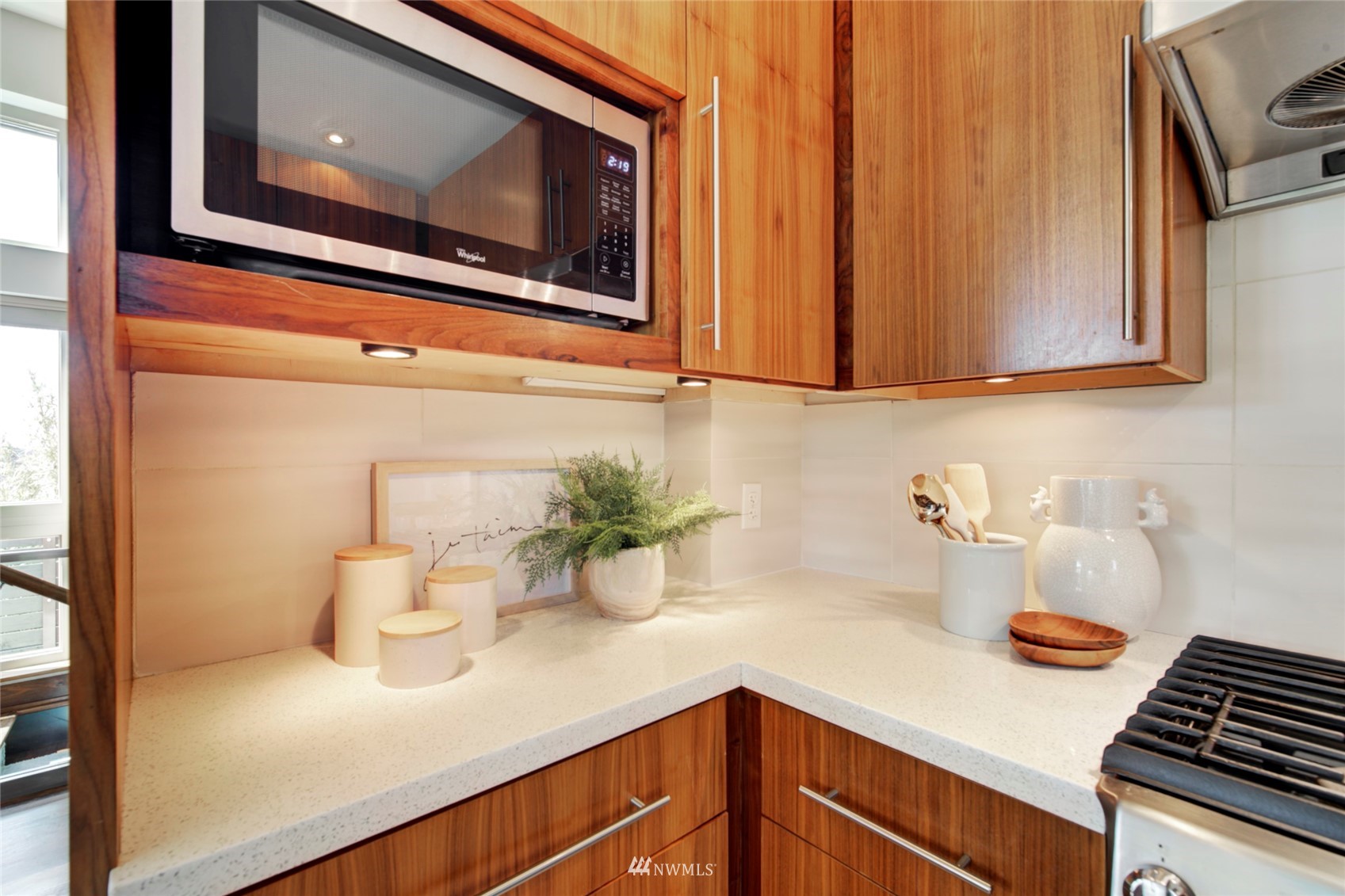 Sophisticated. Unique. Views. Immerse yourself in the seductive splendor of this 2 bed, 2 bath home with unmatched privacy & comfort. Relax in unparalleled luxury w/newly finished solid walnut floors up & tiled floors down; Both with in floor radiant heat with A.I. thermostats. Protected, western Olympic views for magical sunsets. Seattle City views too. Thoughtful design, fit, & finish throughout W/exclusive features. One-year warranty. KitchenAid fridge & gas stove, Bosch dishwasher. One ample parking space plus shared guest parking space. Large, private patio. Spacious deck. Storage shed. Ultra-high energy efficiency. Power available for future AC-mini split and car charger. This home exudes true Modern luxury and is a must see.