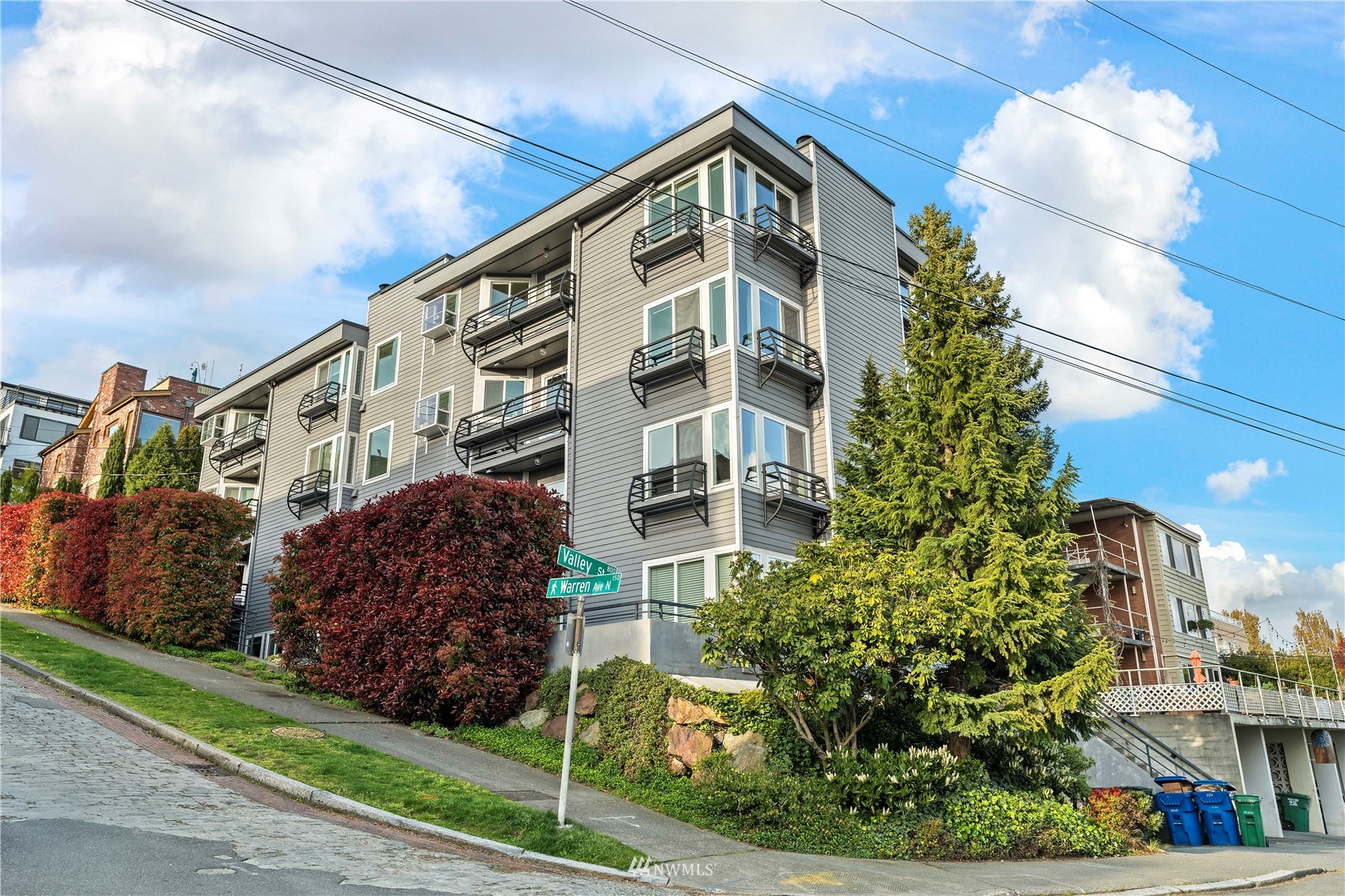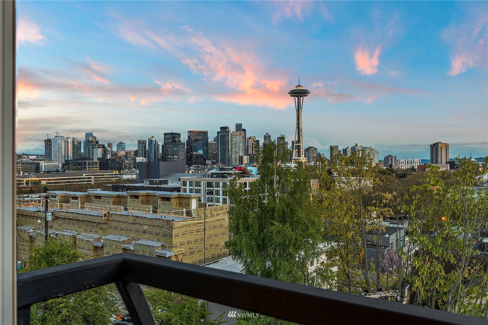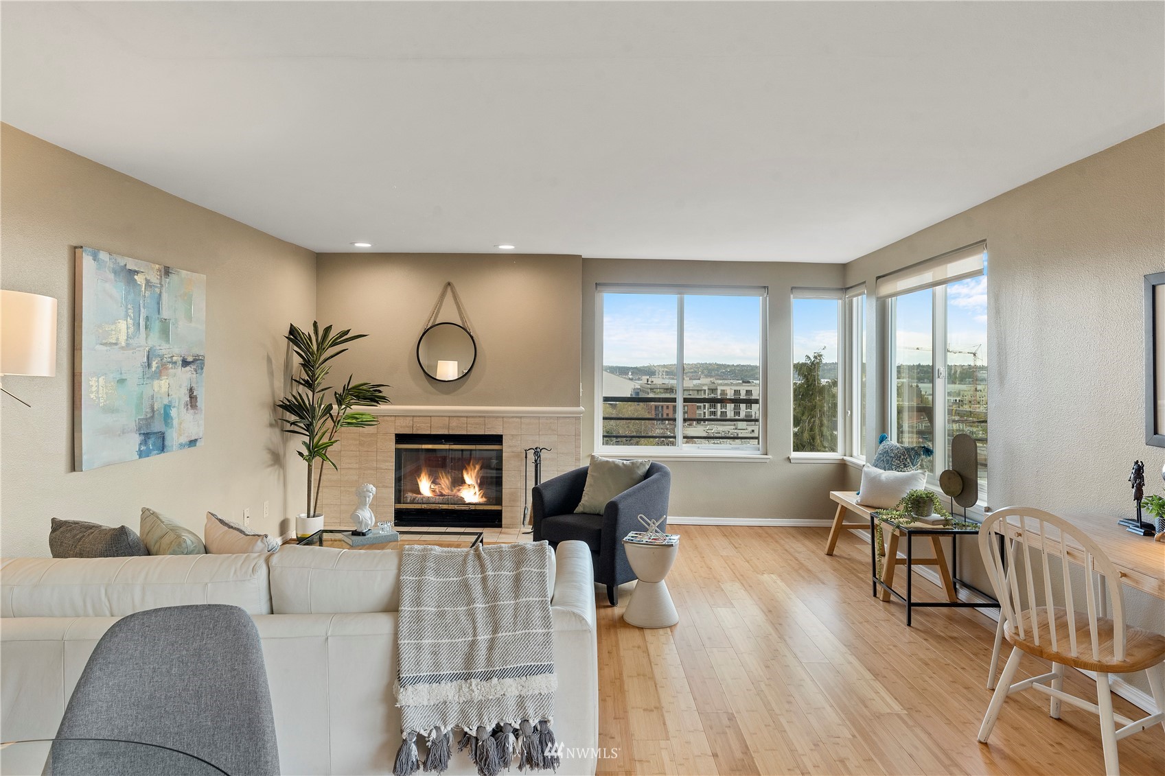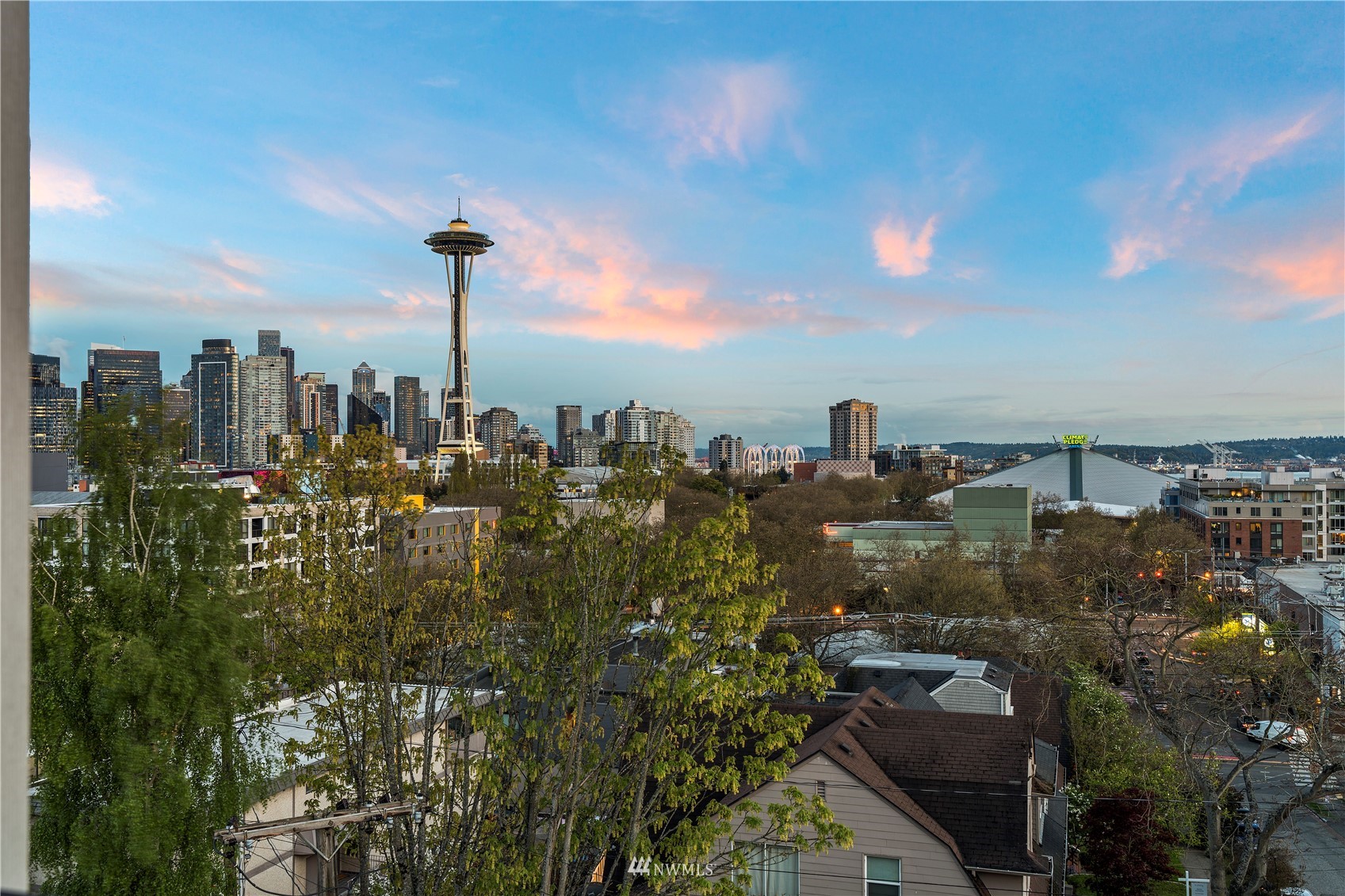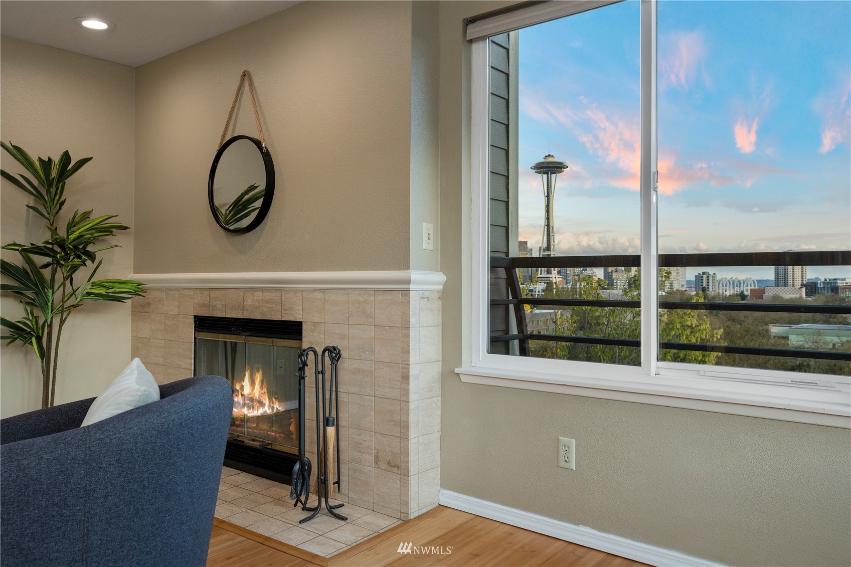 Savor views of the city, Space Needle, Mt Rainier & Elliott Bay from this top floor, SW-facing corner unit in QA! Sunlight bathes the open layout from large windows that frame panoramic views from most rooms! This amazing unit boasts new bamboo floors, a fireplace, efficient radiant heat & in-unit laundry, plus a sleek updated kitchen w/quartz counters & stainless appliances. Enjoy twinkling city lights from the primary suite complete w/ 2 closets & ensuite bath. 2nd bdrm for guests or an office. Relax on the private view balcony. Small 8-unit pet-friendly bldg w/ storage, parking & no rental cap. Building exterior reclad in 2011 included new roof, HardiePlank siding & windows. Dining, shops, parks -all right outside your door! 96 walkscore