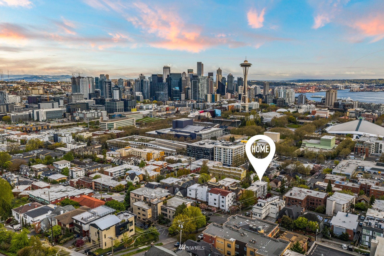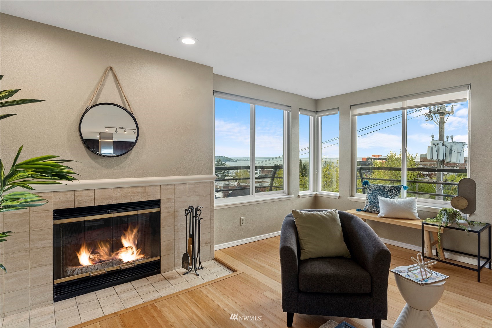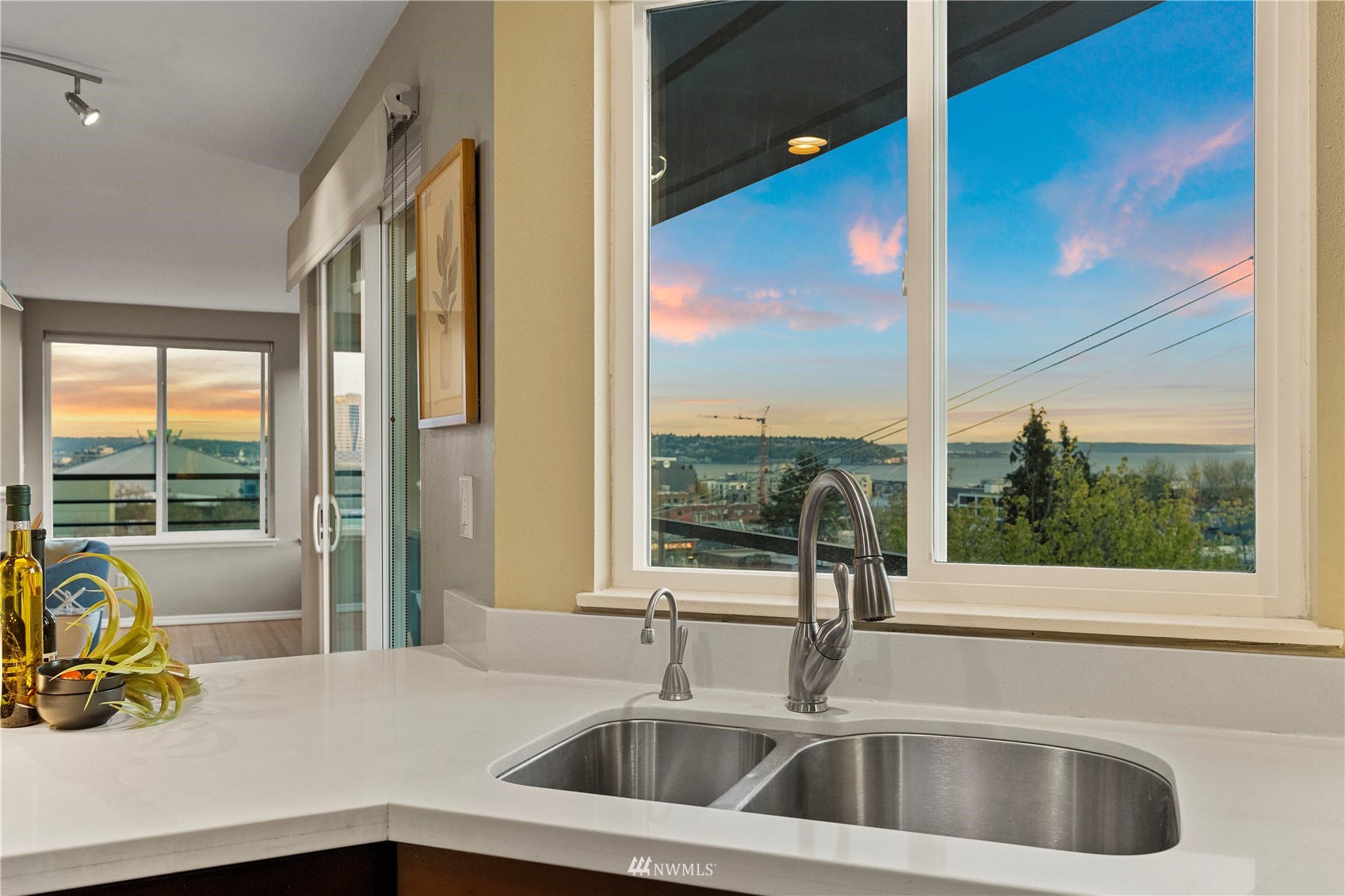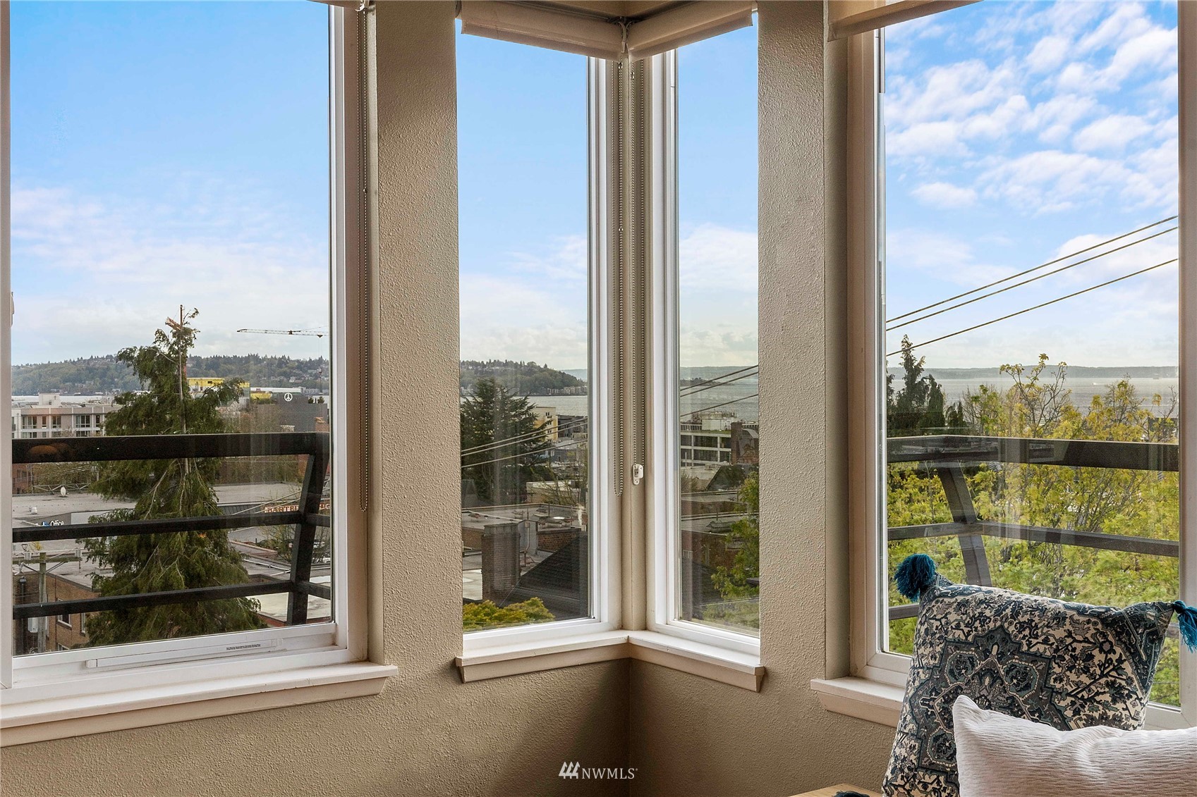 Savor views of the city, Space Needle, Mt Rainier & Elliott Bay from this top floor, SW-facing corner unit in QA! Sunlight bathes the open layout from large windows that frame panoramic views from most rooms! This amazing unit boasts new bamboo floors, a fireplace, efficient radiant heat & in-unit laundry, plus a sleek updated kitchen w/quartz counters & stainless appliances. Enjoy twinkling city lights from the primary suite complete w/ 2 closets & ensuite bath. 2nd bdrm for guests or an office. Relax on the private view balcony. Small 8-unit pet-friendly bldg w/ storage, parking & no rental cap. Building exterior reclad in 2011 included new roof, HardiePlank siding & windows. Dining, shops, parks -all right outside your door! 96 walkscore