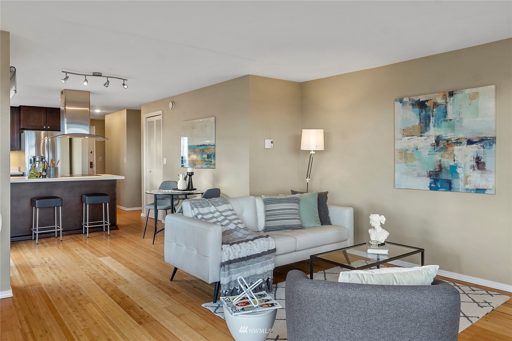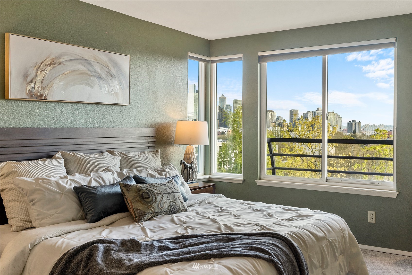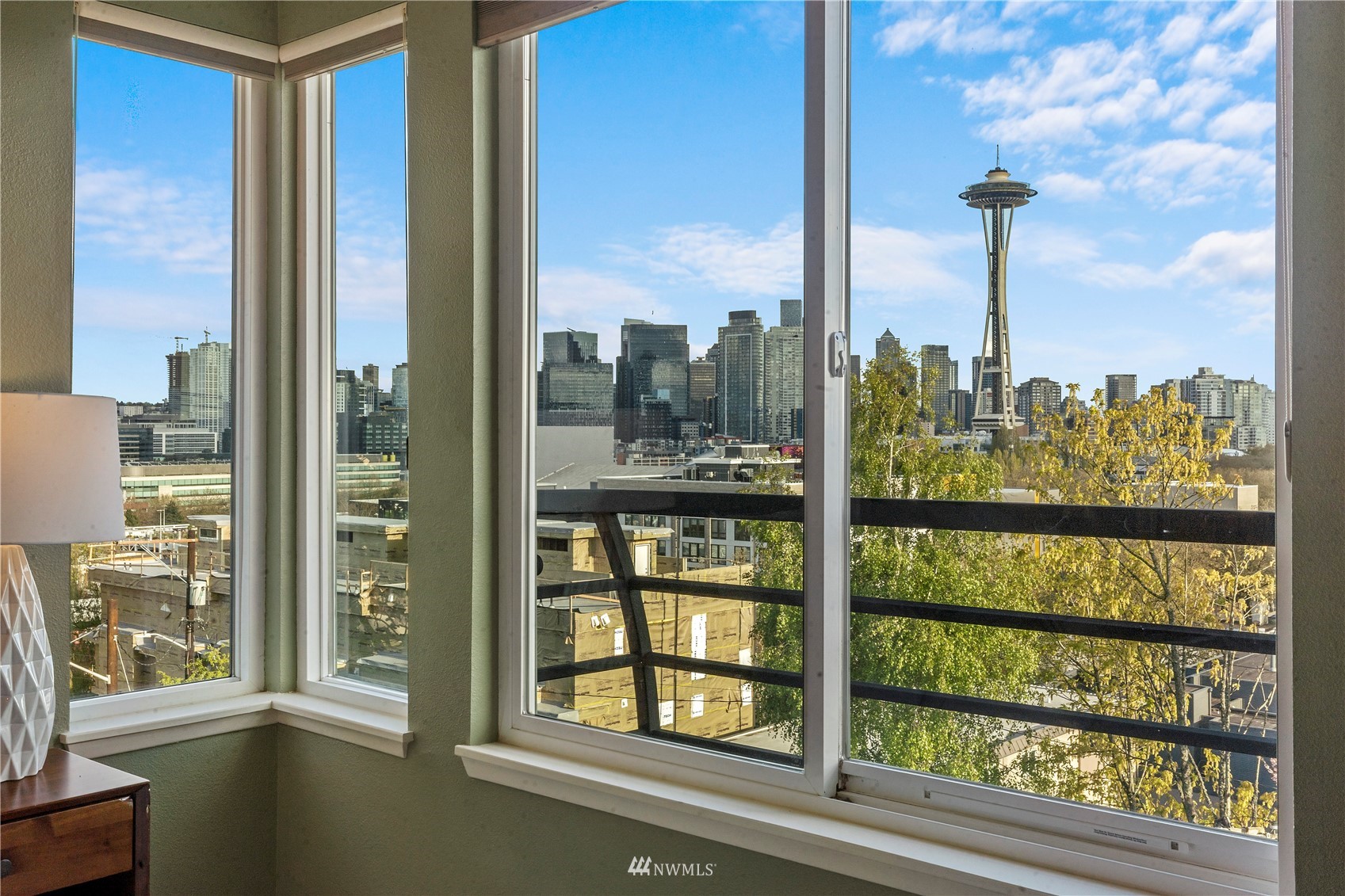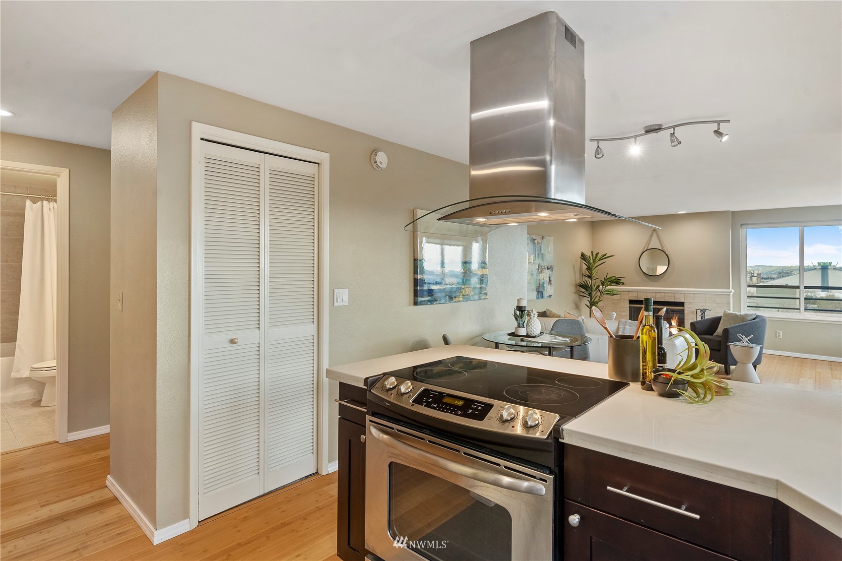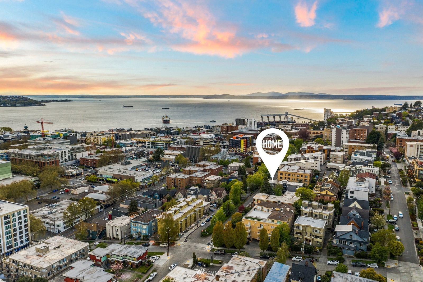 Savor views of the city, Space Needle, Mt Rainier & Elliott Bay from this top floor, SW-facing corner unit in QA! Sunlight bathes the open layout from large windows that frame panoramic views from most rooms! This amazing unit boasts new bamboo floors, a fireplace, efficient radiant heat & in-unit laundry, plus a sleek updated kitchen w/quartz counters & stainless appliances. Enjoy twinkling city lights from the primary suite complete w/ 2 closets & ensuite bath. 2nd bdrm for guests or an office. Relax on the private view balcony. Small 8-unit pet-friendly bldg w/ storage, parking & no rental cap. Building exterior reclad in 2011 included new roof, HardiePlank siding & windows. Dining, shops, parks -all right outside your door! 96 walkscore