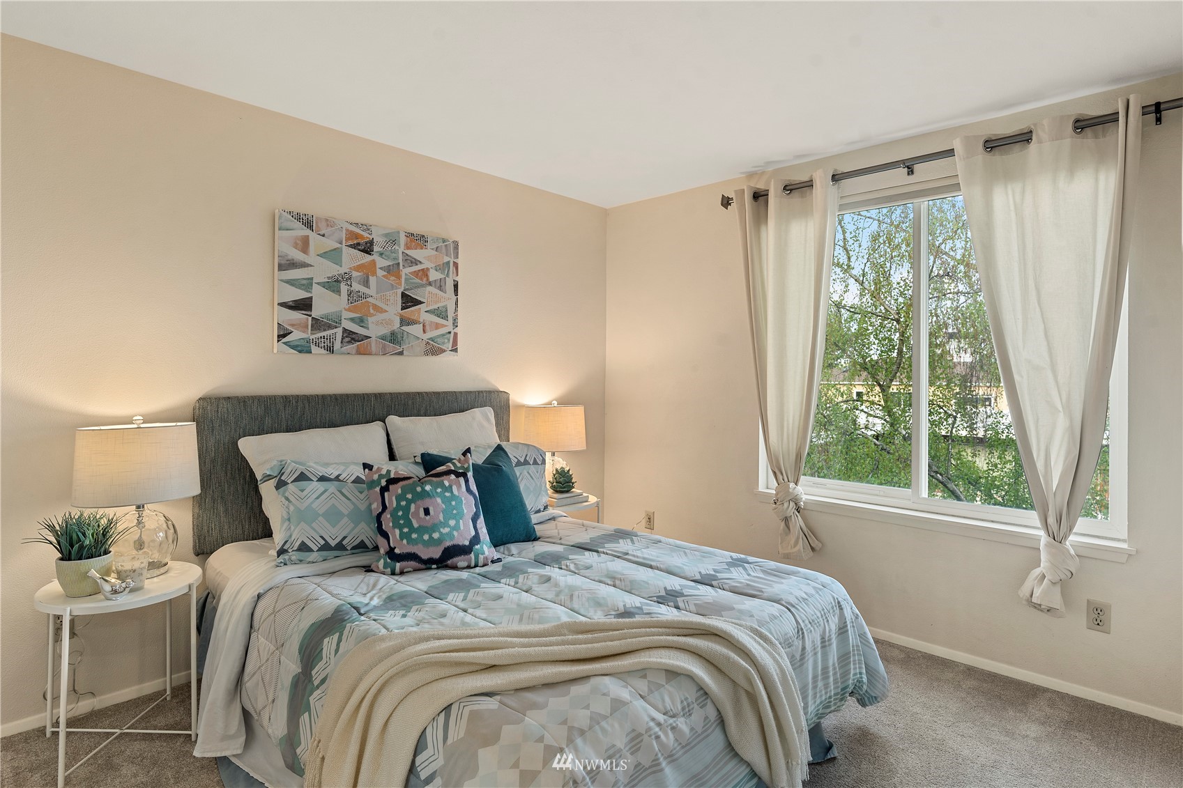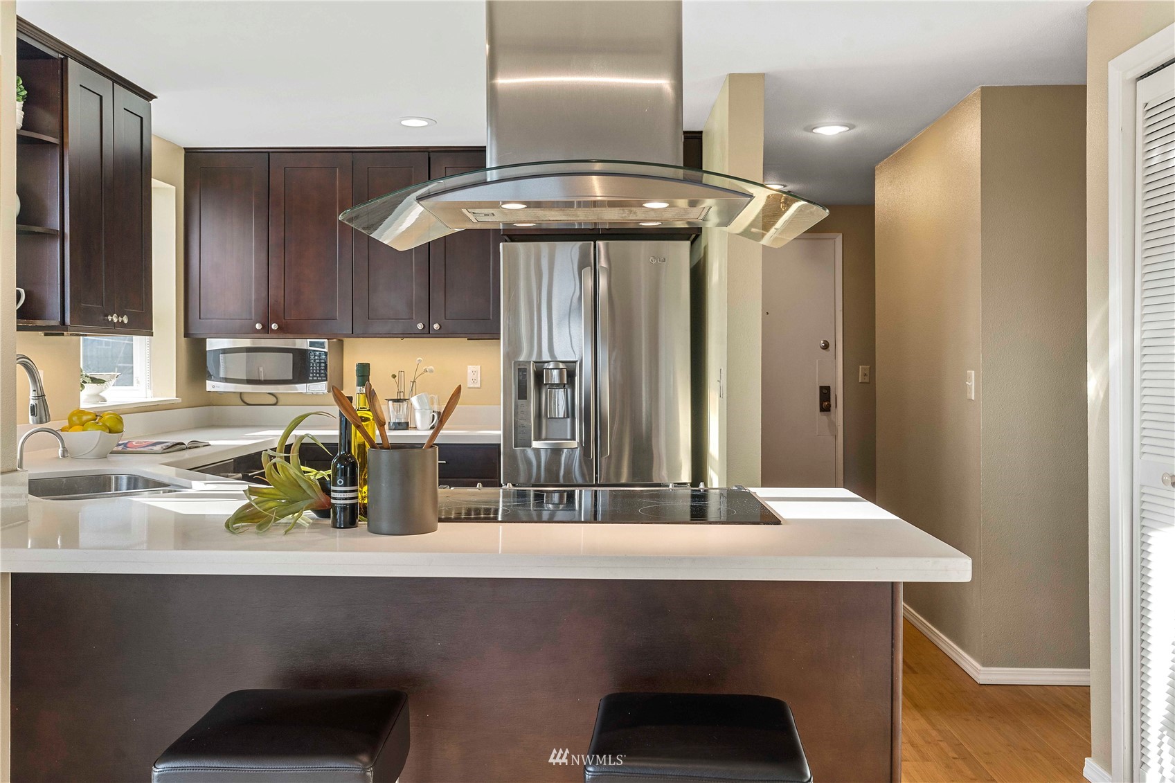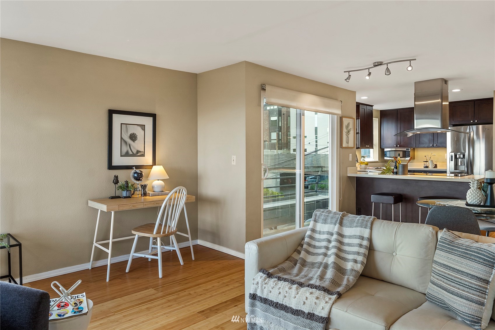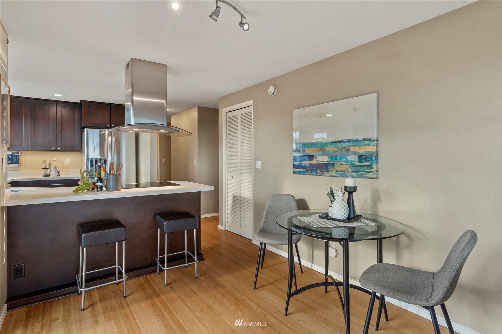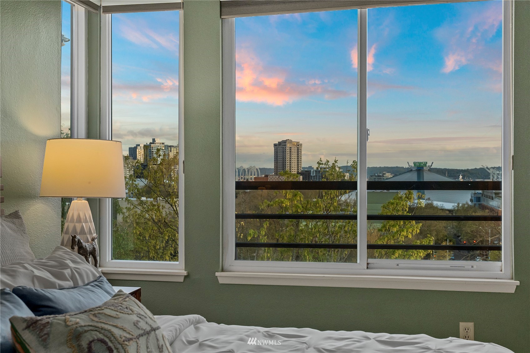 Savor views of the city, Space Needle, Mt Rainier & Elliott Bay from this top floor, SW-facing corner unit in QA! Sunlight bathes the open layout from large windows that frame panoramic views from most rooms! This amazing unit boasts new bamboo floors, a fireplace, efficient radiant heat & in-unit laundry, plus a sleek updated kitchen w/quartz counters & stainless appliances. Enjoy twinkling city lights from the primary suite complete w/ 2 closets & ensuite bath. 2nd bdrm for guests or an office. Relax on the private view balcony. Small 8-unit pet-friendly bldg w/ storage, parking & no rental cap. Building exterior reclad in 2011 included new roof, HardiePlank siding & windows. Dining, shops, parks -all right outside your door! 96 walkscore