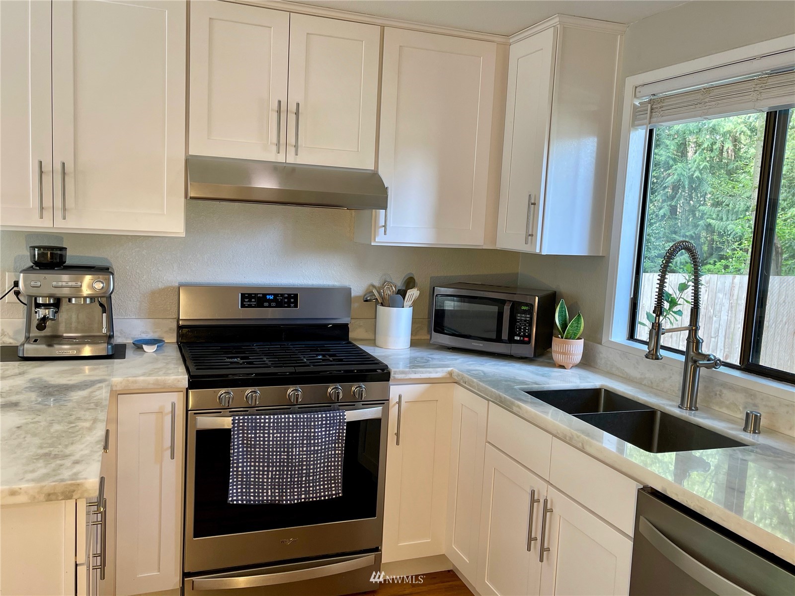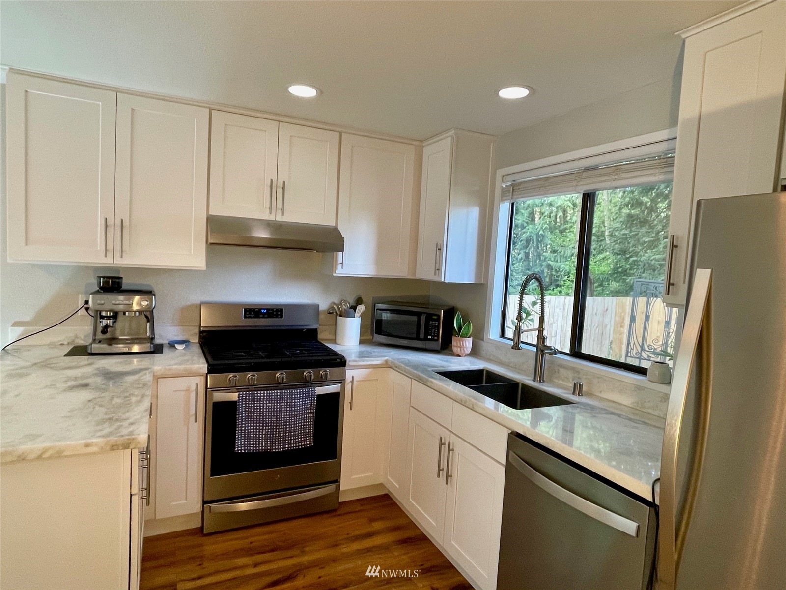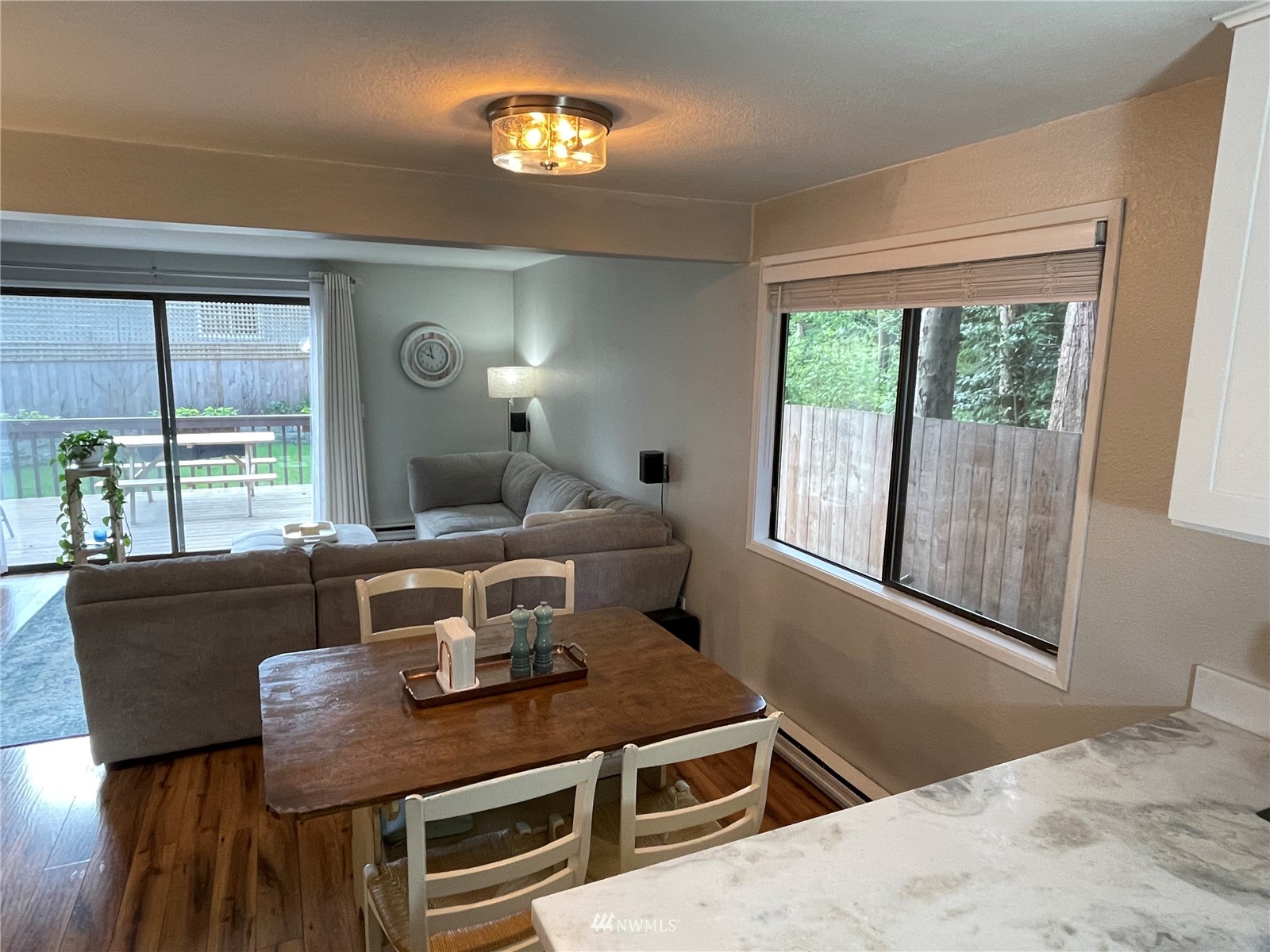 Updated! 2 bedroom, 1.5 bath condo in great neighborhood with private wooded setting. New kitchen with stainless appliances, including gas range. Kitchen has large pantry and opens to dining area and family room with sliders to spacious deck. Gas fireplace sets the mood and warms you on those cooler days. All new yard, fencing, drainage and garden beds. New roof, newer hot water tank. Upstairs features 2 sizable bedrooms. Master features walk-in closet. Huge linen closet in hall. Both baths have been updated. Extra long garage offers generous laundry area and assess to fully fenced back yard.
