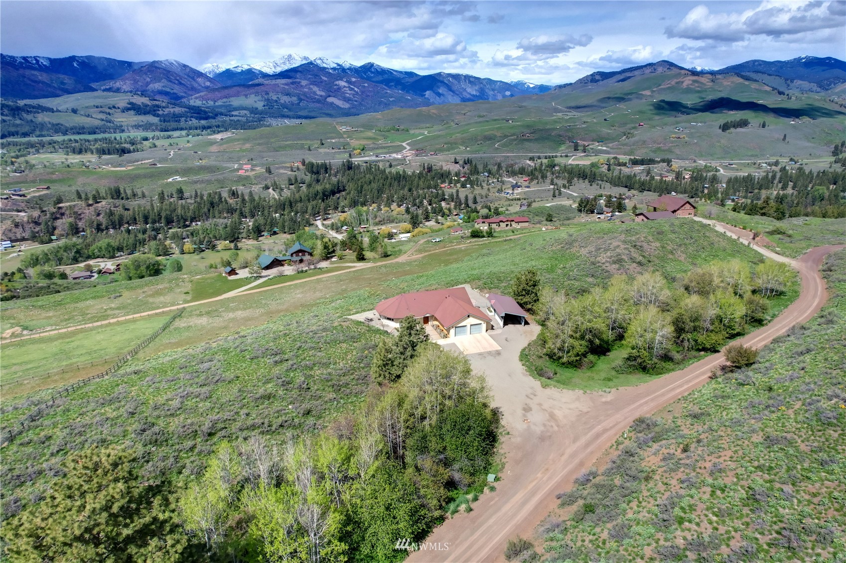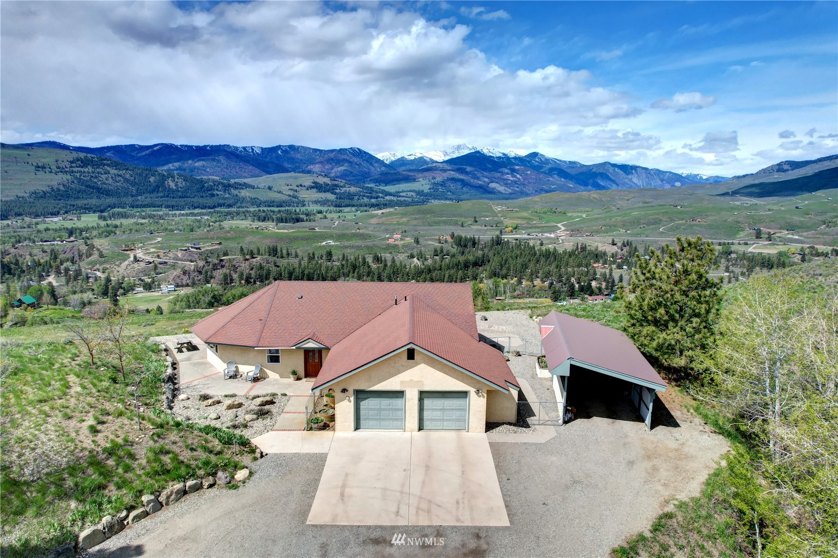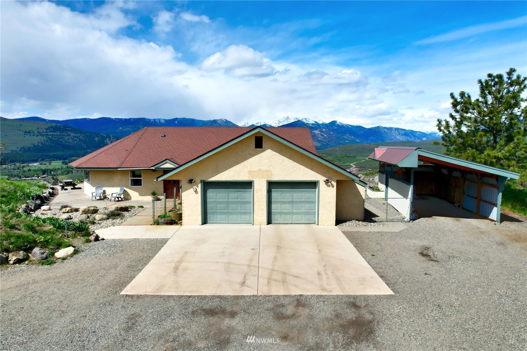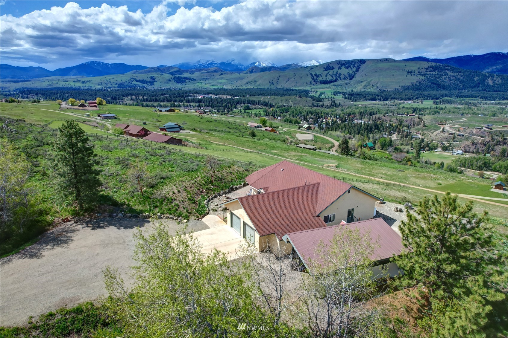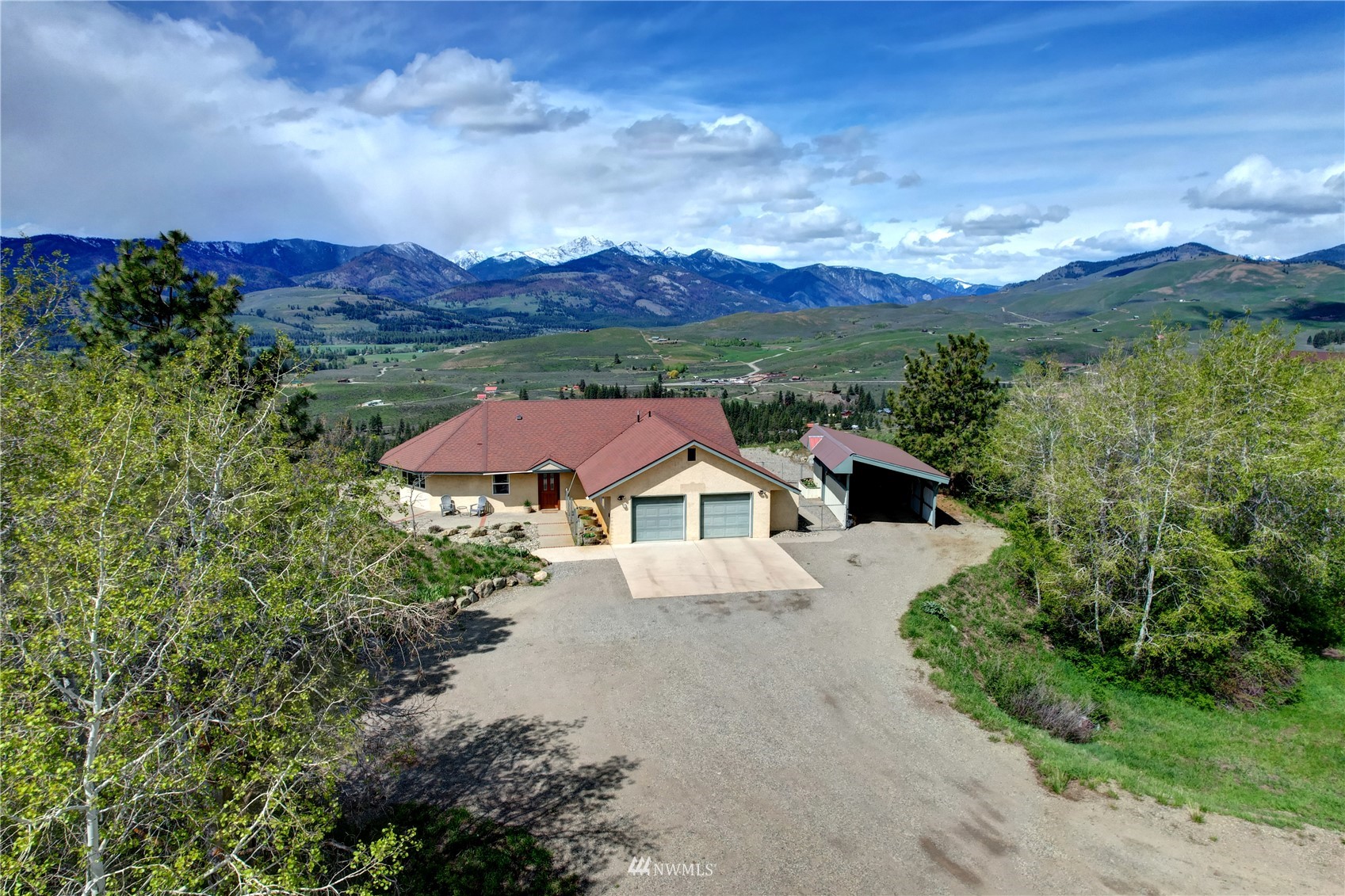 It's all about the VIEW!!! Savor the peace & quiet on 6+ acres w/ lush aspens & scattered pines on quiet country lane. Desirable rare location less than 8 minutes to Winthrop amenities & ski trailhead. Efficient single level home w/ low profile blends w setting. EZ maintenance stucco siding. Primary bdrm w ensuite bathroom. Glass-wrapped living room-kitchen captures majestic mountain views...Spectacular! 2nd bdrm & bath plus den/office. Sunny open floorplan. Custom cabinets w lots of kitchen storage. Handsome built-in desks & bookcase. Attached 2 car garage w 1/2 used as art studio. Storage rm & carport for gear & extra vehicles. Drought tolerant landscaping & sprinkler system. One of a kind exceptional Methow Valley location!