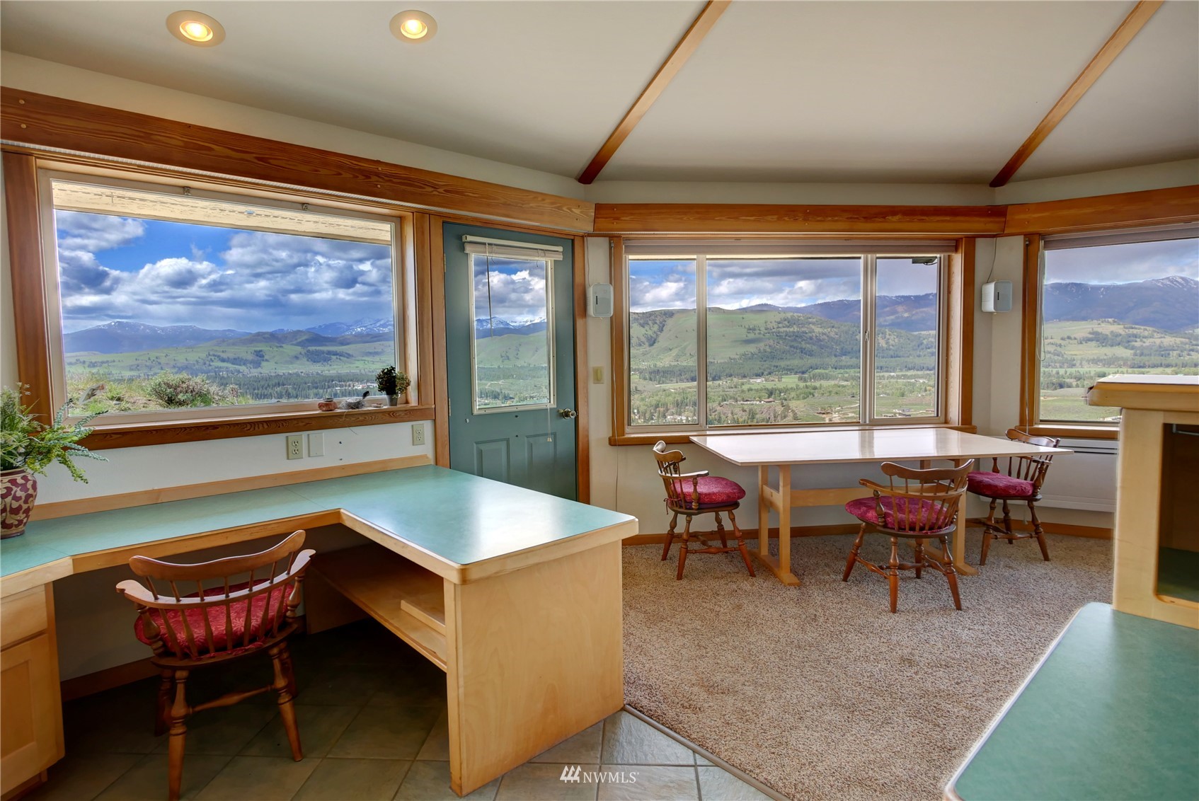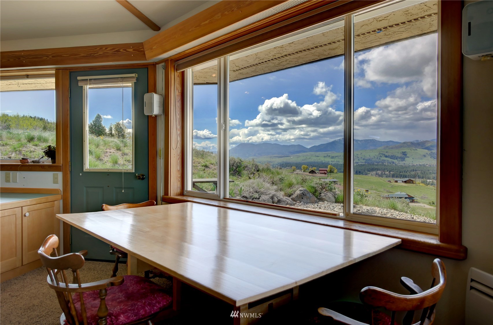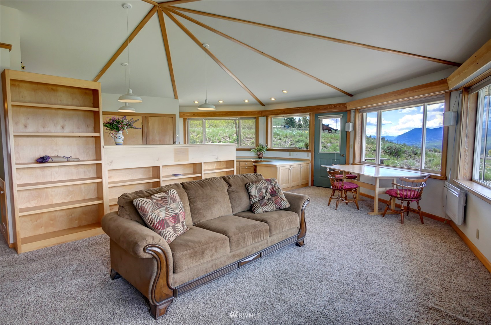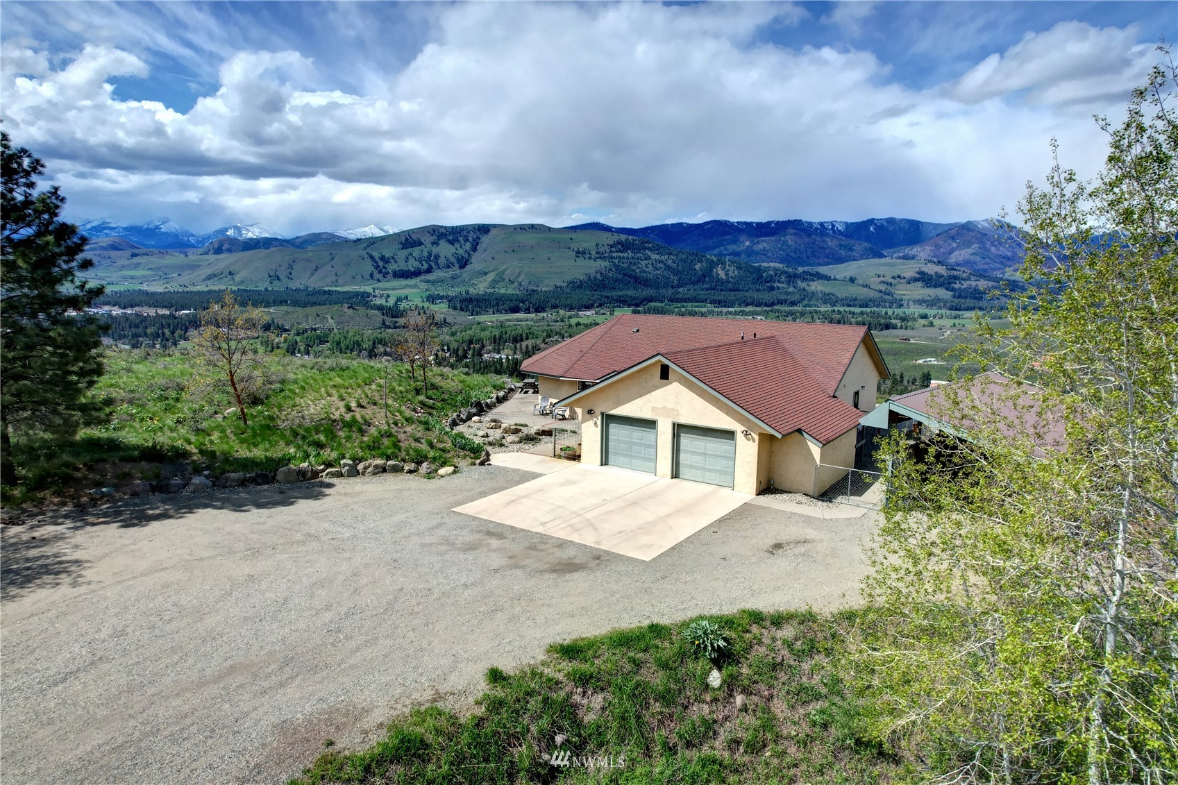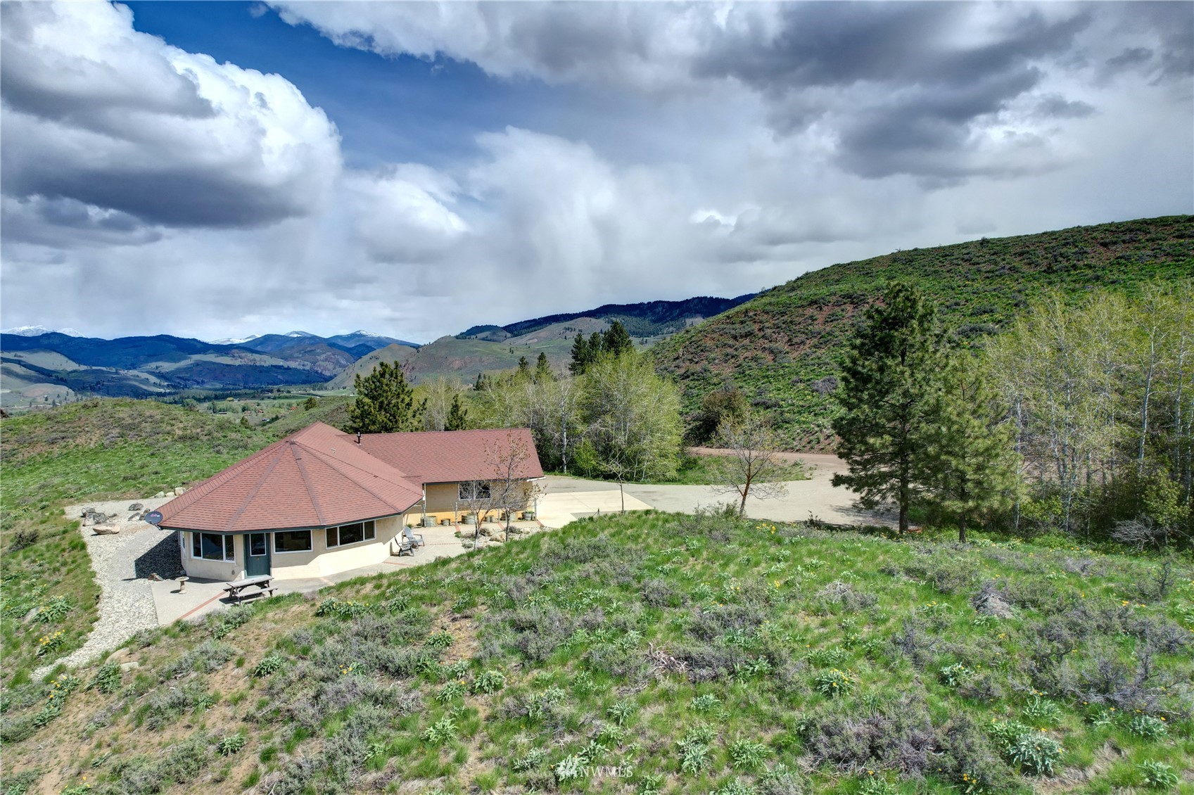 It's all about the VIEW!!! Savor the peace & quiet on 6+ acres w/ lush aspens & scattered pines on quiet country lane. Desirable rare location less than 8 minutes to Winthrop amenities & ski trailhead. Efficient single level home w/ low profile blends w setting. EZ maintenance stucco siding. Primary bdrm w ensuite bathroom. Glass-wrapped living room-kitchen captures majestic mountain views...Spectacular! 2nd bdrm & bath plus den/office. Sunny open floorplan. Custom cabinets w lots of kitchen storage. Handsome built-in desks & bookcase. Attached 2 car garage w 1/2 used as art studio. Storage rm & carport for gear & extra vehicles. Drought tolerant landscaping & sprinkler system. One of a kind exceptional Methow Valley location!