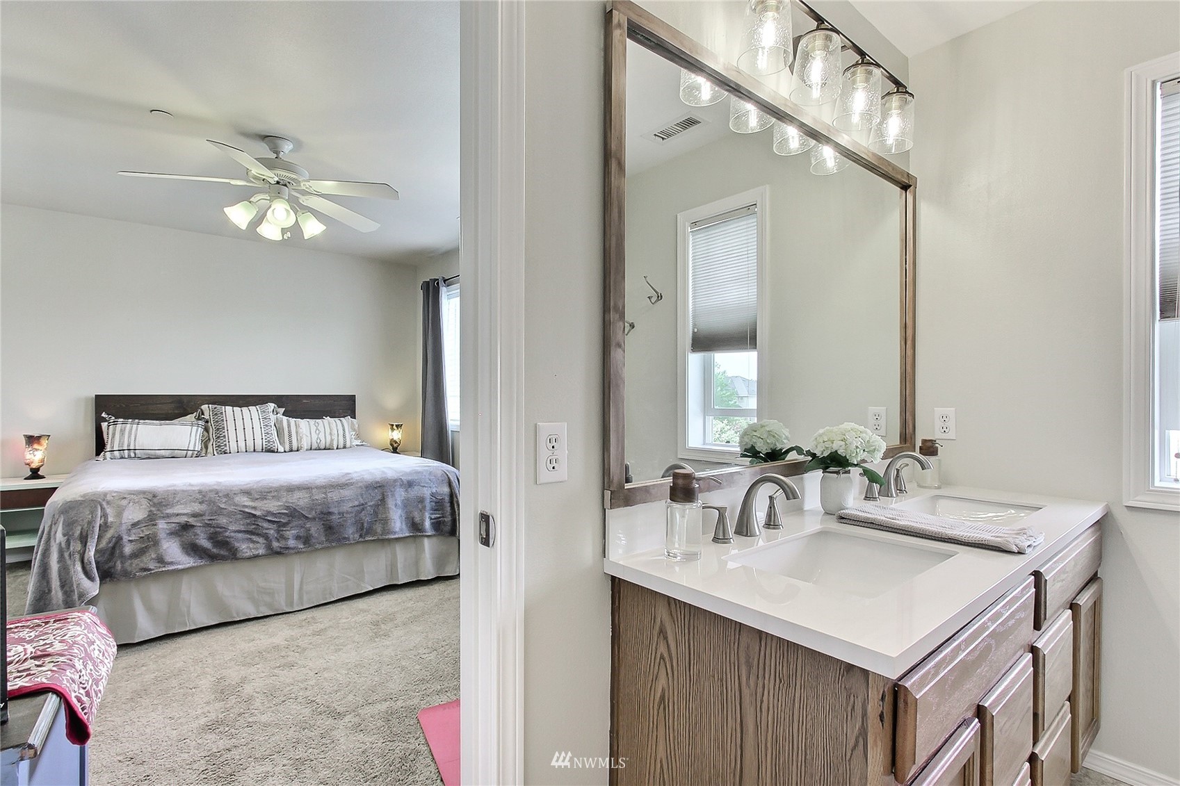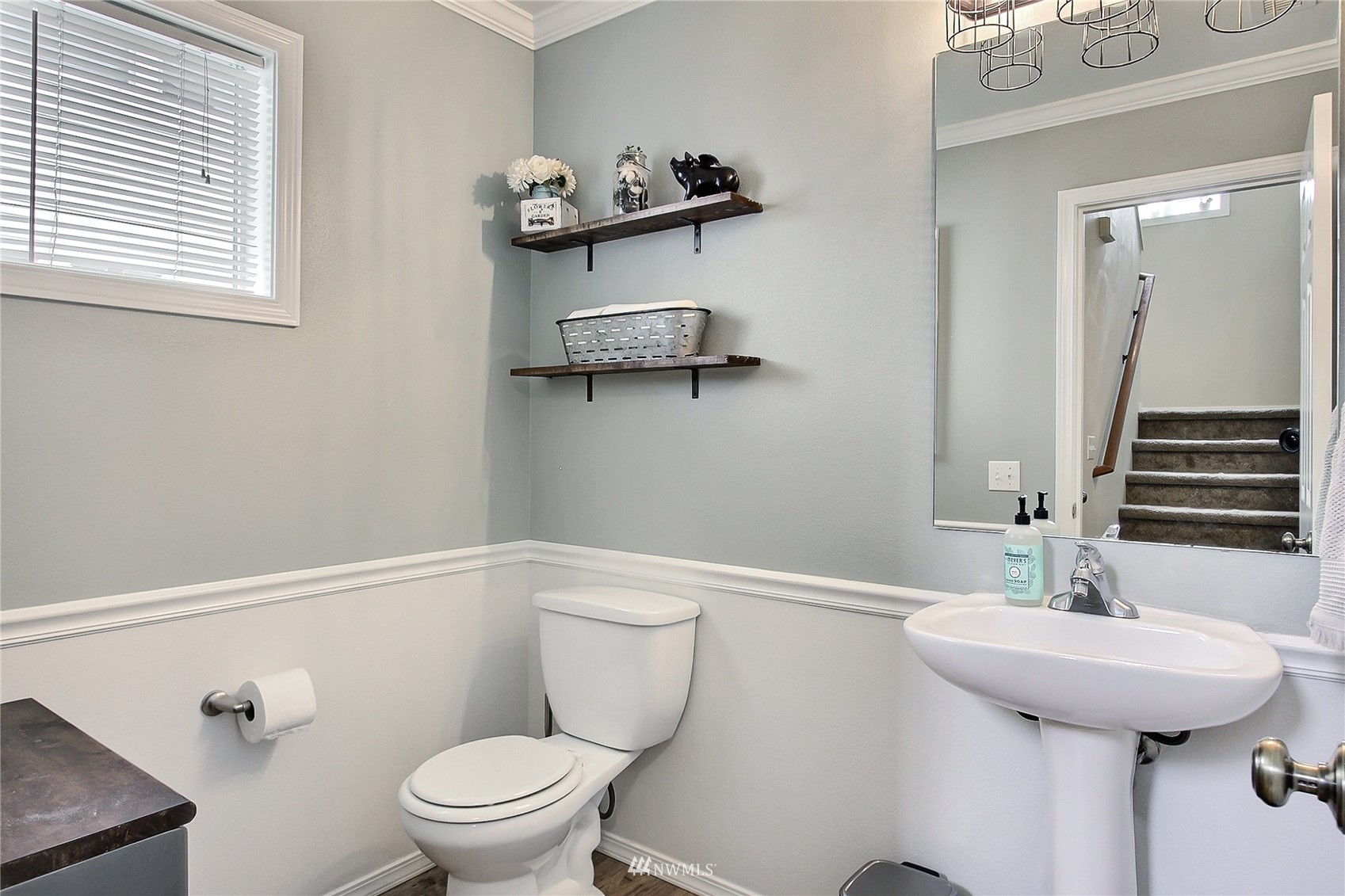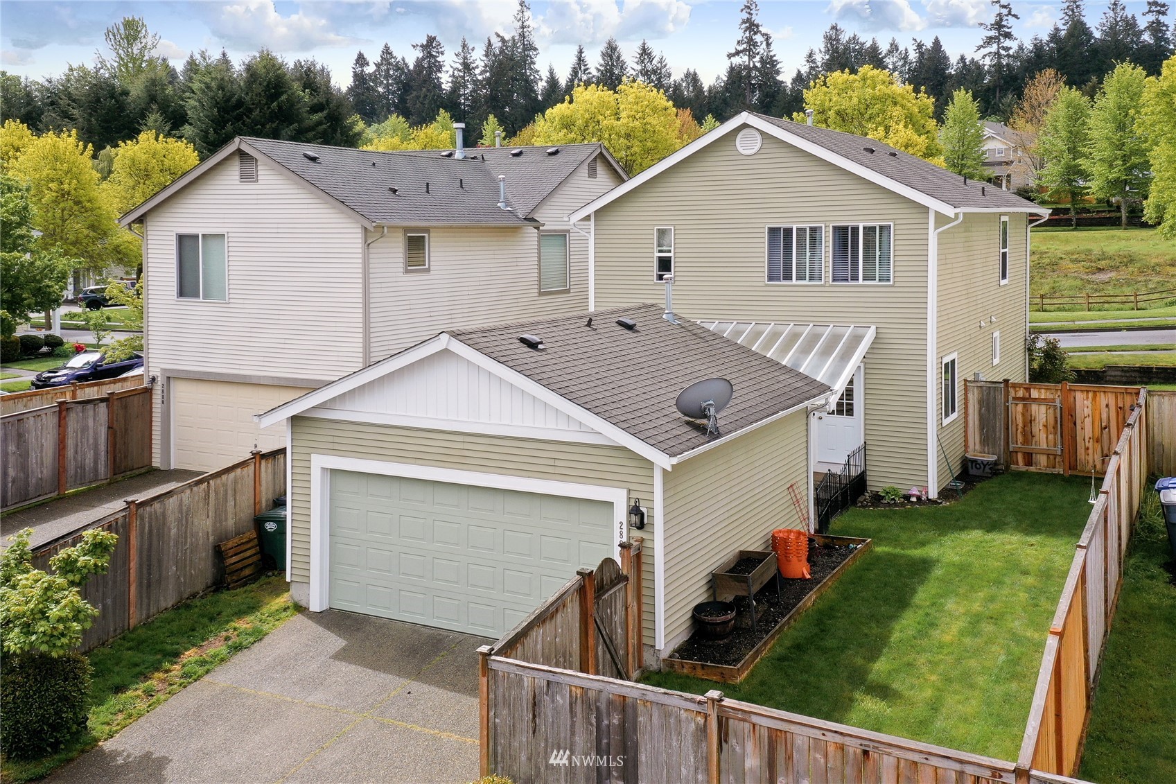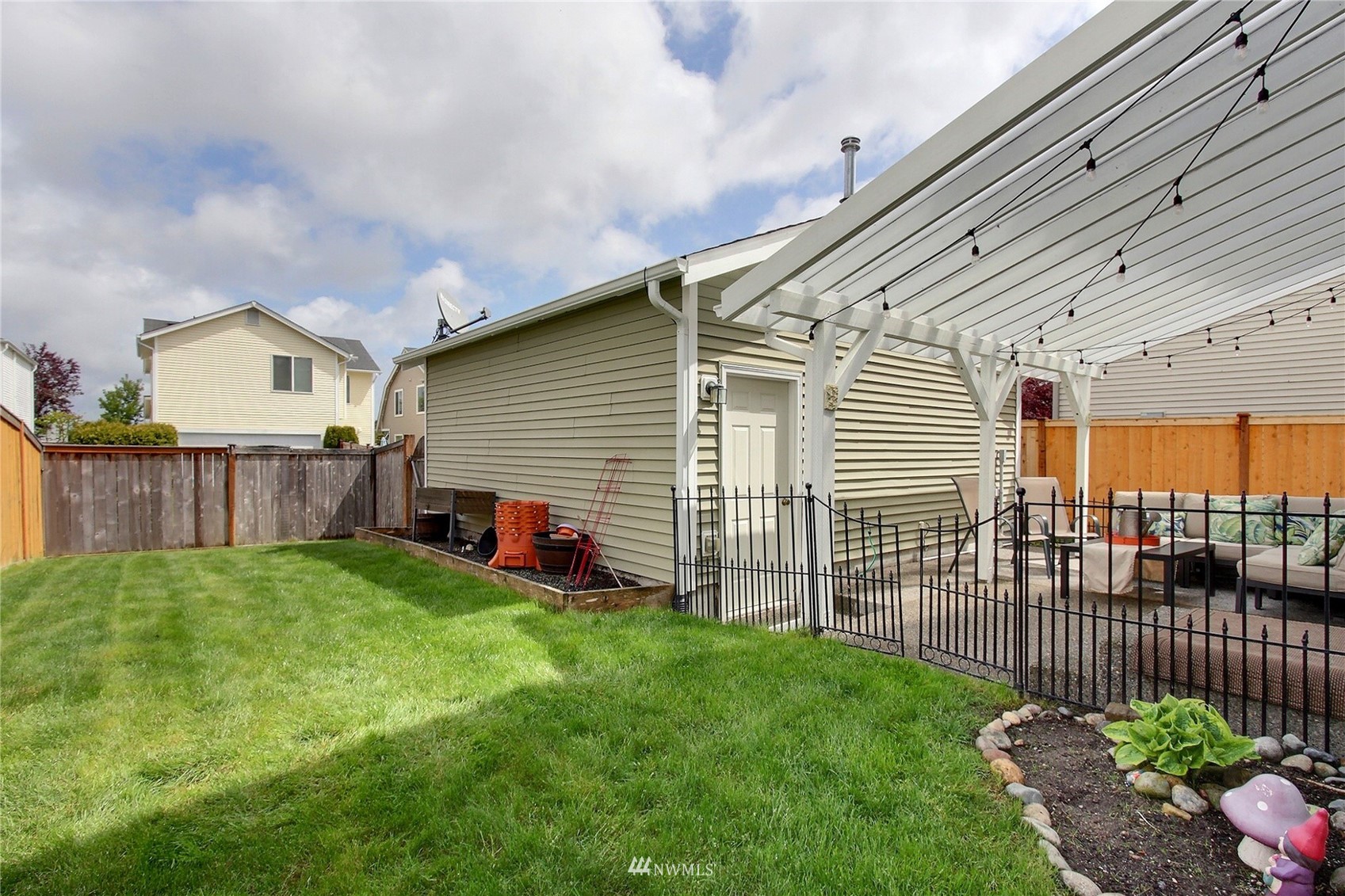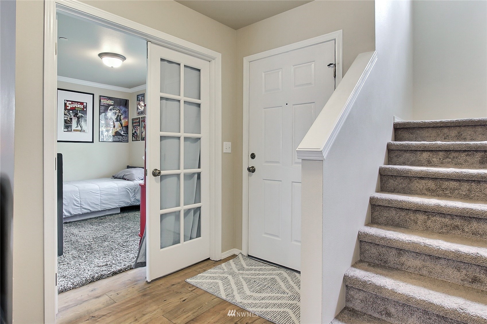 DuPont Stunner - beautiful laminate flooring throughout lower level on one of the most popular open and inviting floorplans. 1711 SF, 3 bedrooms, 2.5 baths and den with french doors downstairs. Kitchen with eating bar plus room for large dining table. Primary suite features double vanities, shower and large linen closet with separate walk in closet. White doors and trim, full wrap windows, crown molding! Stainless appliances and quartz counters in kitchen. Ceiling fans, remodeled bath. Outside discover the all season covered patio connecting to your 2-car detached garage. Fully fenced yard with irrigation system front and back. Gas furnace. Don't miss this one. Centrally located across from community greenspace with park and trails nearby.