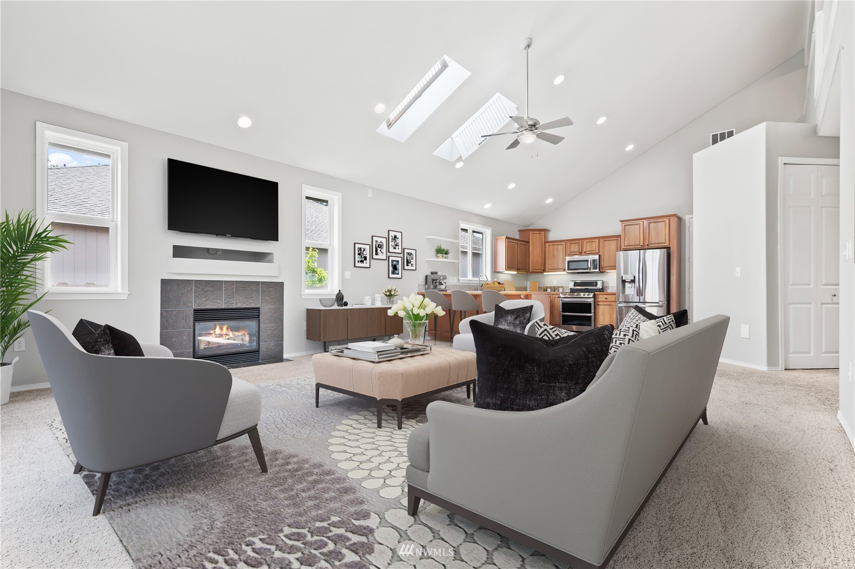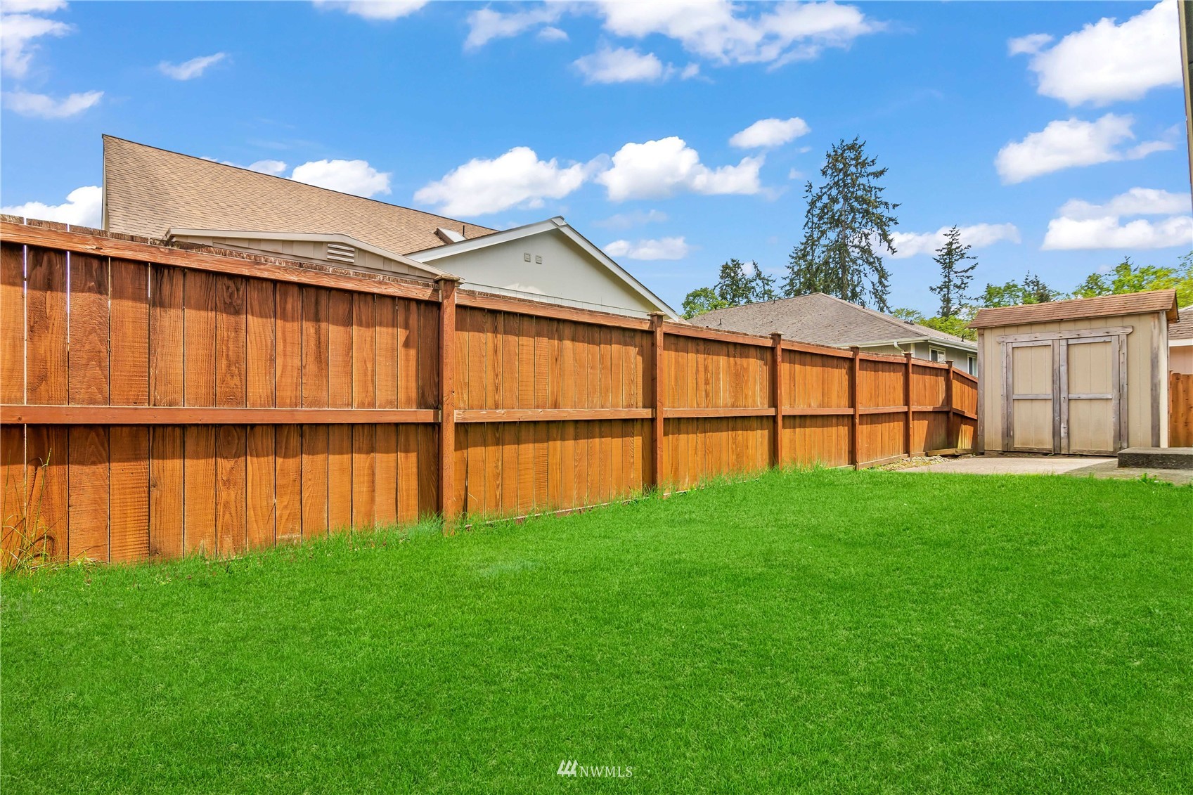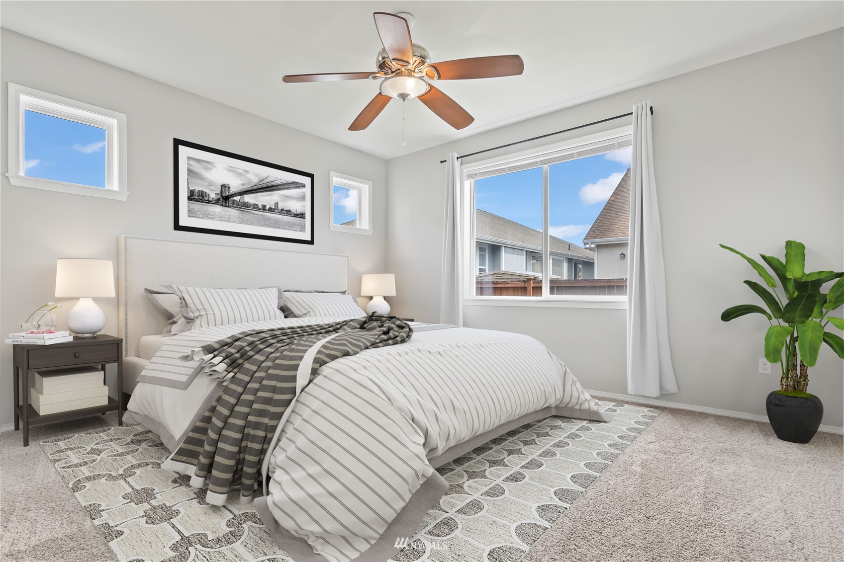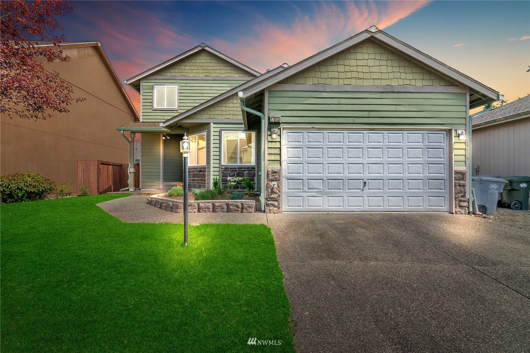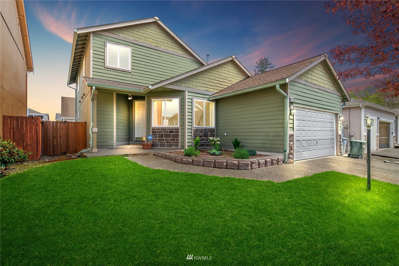 Welcome home to this light and bright 3 bedroom + 2.5 bathroom open floor plan property located in the ever sought-after gated community of Rainier View Court! With vaulted ceilings, cozy gas fireplace and A/C for the upcoming summer heat, this home has everything that you have been searching for. The main floor primary suite includes two walk-in closets and a huge connected bathroom. Upstairs you'll find two nice sized bedrooms that share a Jack and Jill bathroom, as well as an office with a built-in desk. Enjoy the low maintenance yard with a shed for added storage in the back. This home is close to shops, parks and minutes from JBLM!