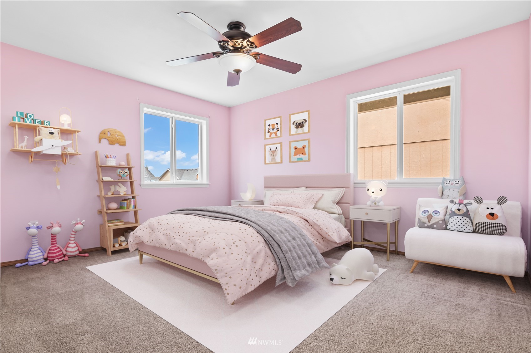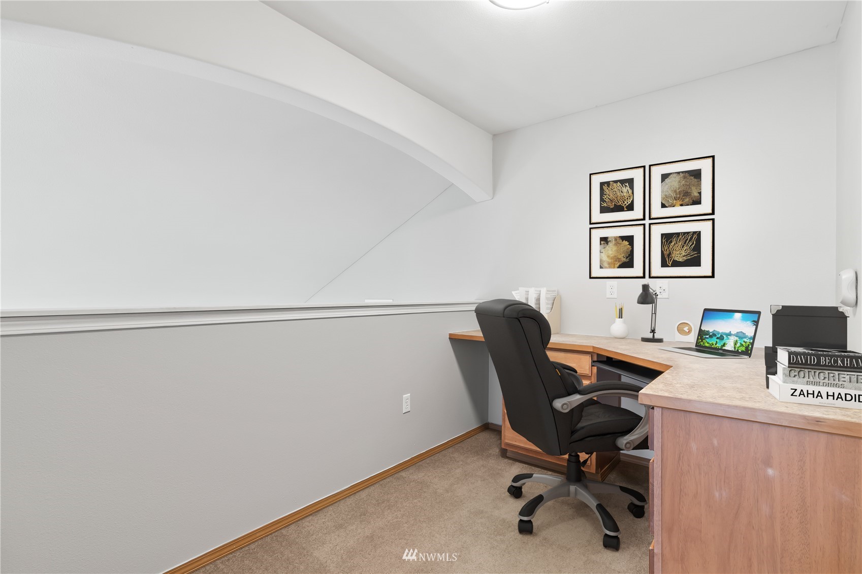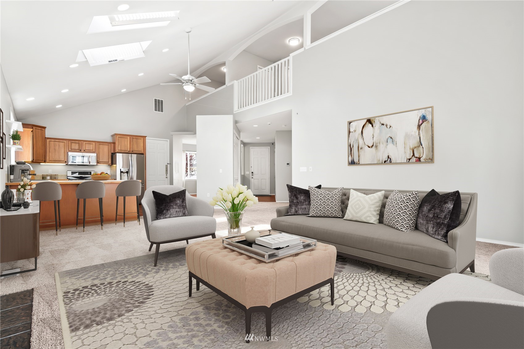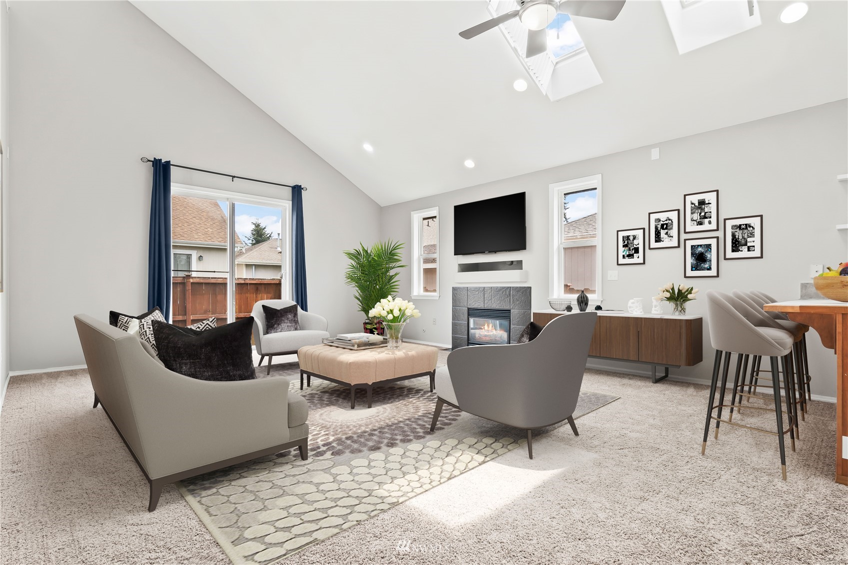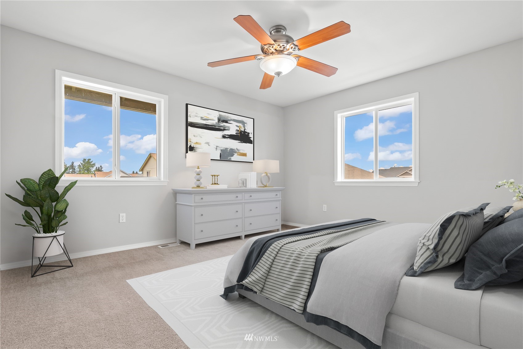 Welcome home to this light and bright 3 bedroom + 2.5 bathroom open floor plan property located in the ever sought-after gated community of Rainier View Court! With vaulted ceilings, cozy gas fireplace and A/C for the upcoming summer heat, this home has everything that you have been searching for. The main floor primary suite includes two walk-in closets and a huge connected bathroom. Upstairs you'll find two nice sized bedrooms that share a Jack and Jill bathroom, as well as an office with a built-in desk. Enjoy the low maintenance yard with a shed for added storage in the back. This home is close to shops, parks and minutes from JBLM!