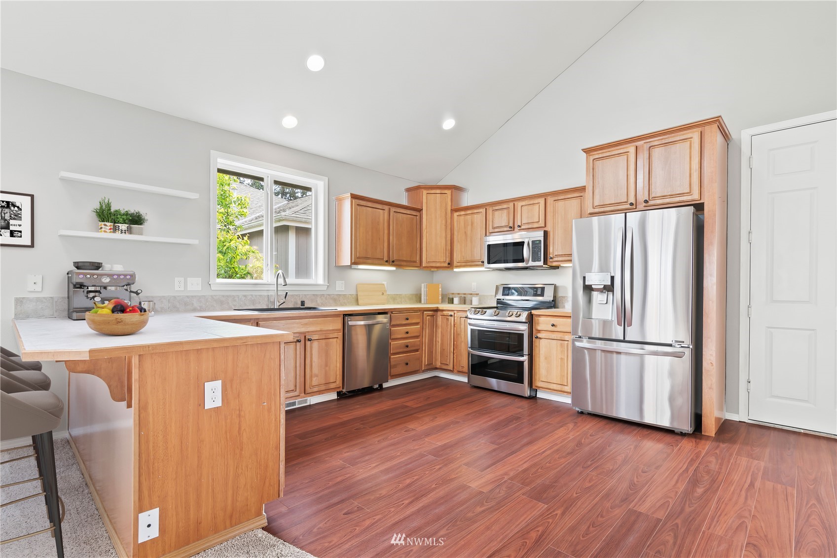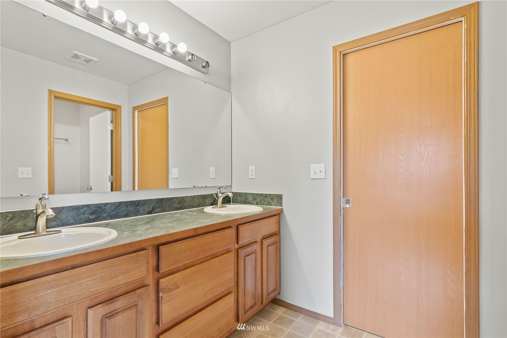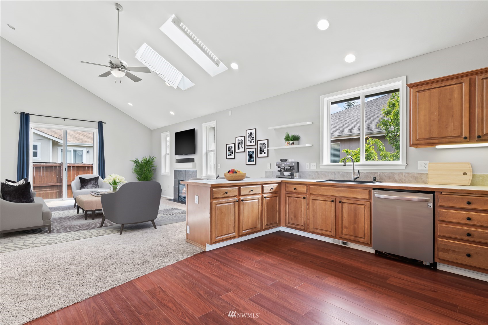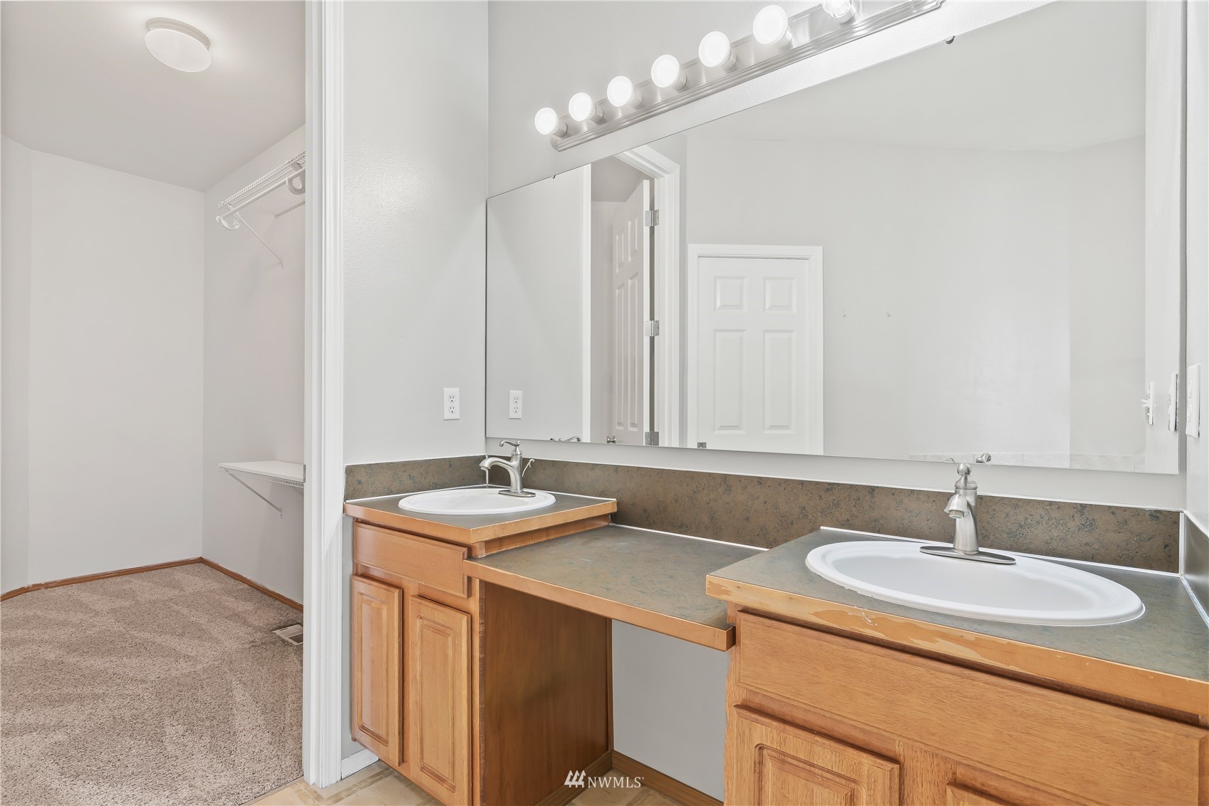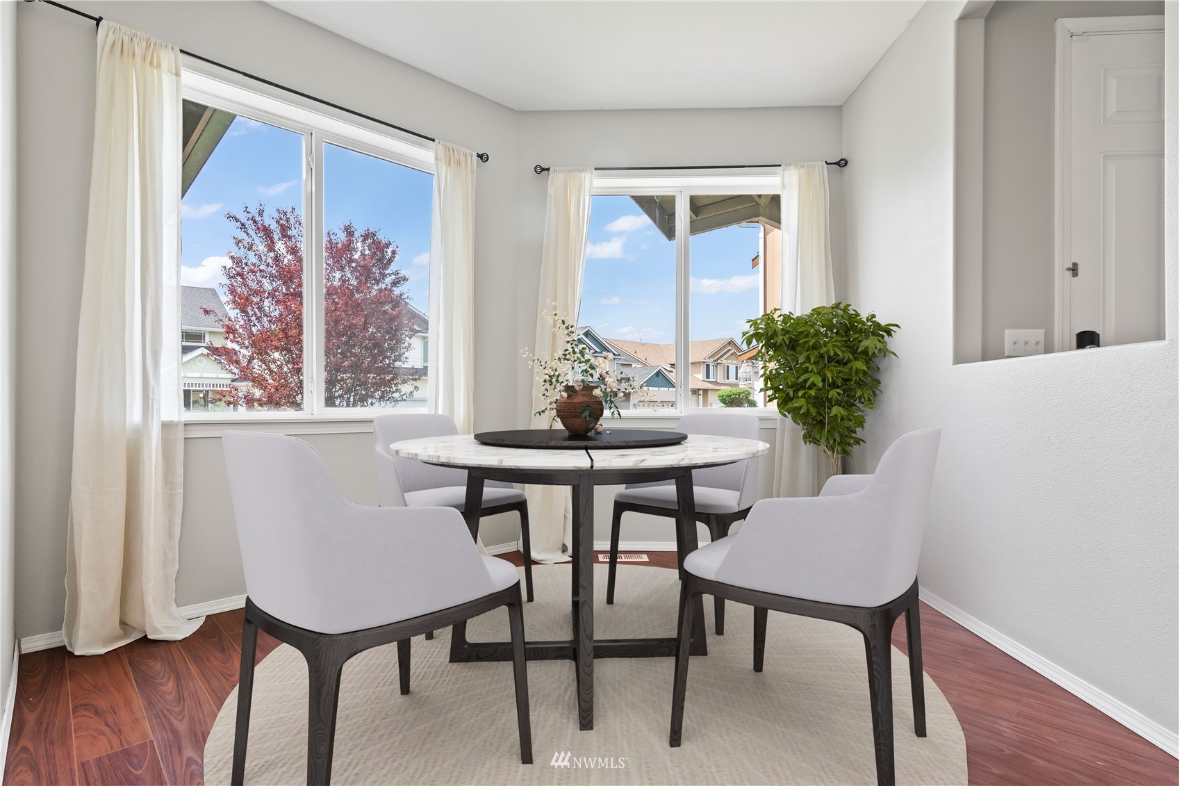 Welcome home to this light and bright 3 bedroom + 2.5 bathroom open floor plan property located in the ever sought-after gated community of Rainier View Court! With vaulted ceilings, cozy gas fireplace and A/C for the upcoming summer heat, this home has everything that you have been searching for. The main floor primary suite includes two walk-in closets and a huge connected bathroom. Upstairs you'll find two nice sized bedrooms that share a Jack and Jill bathroom, as well as an office with a built-in desk. Enjoy the low maintenance yard with a shed for added storage in the back. This home is close to shops, parks and minutes from JBLM!