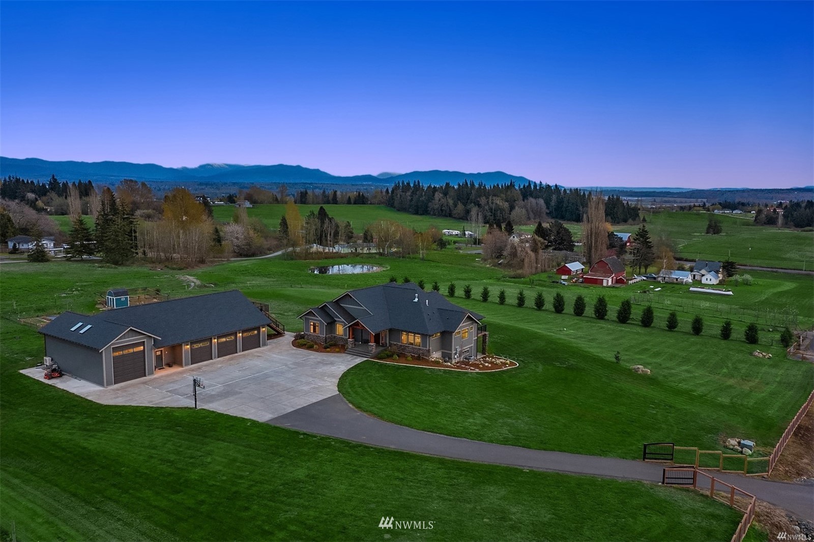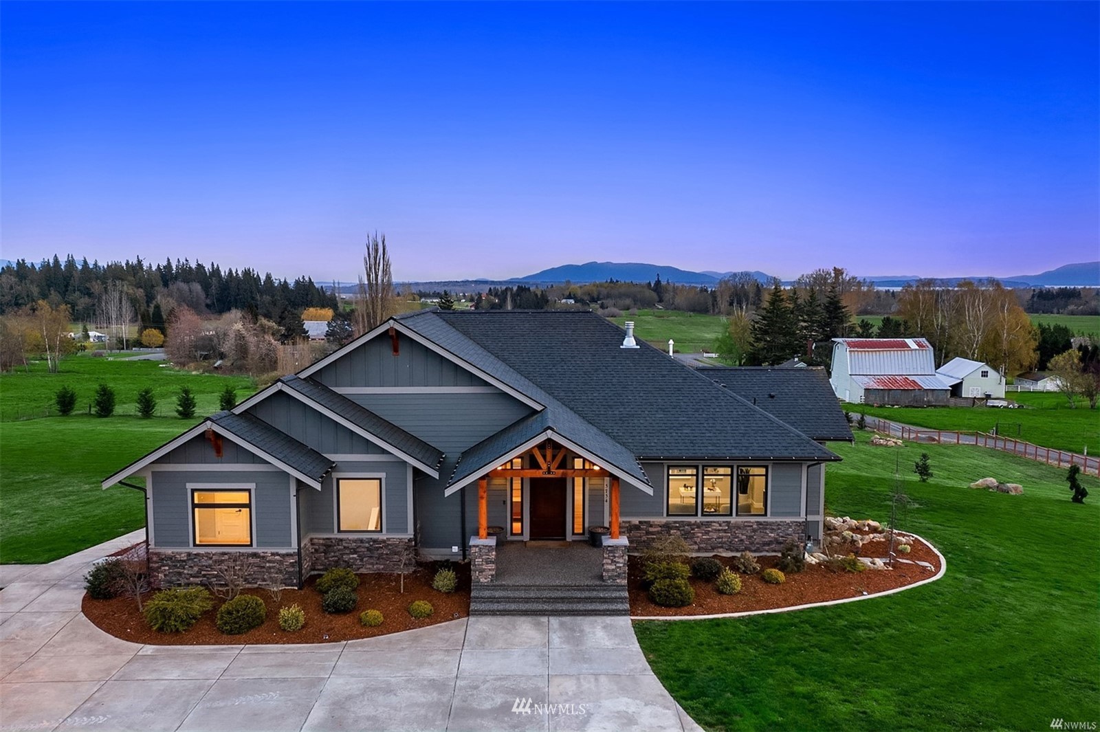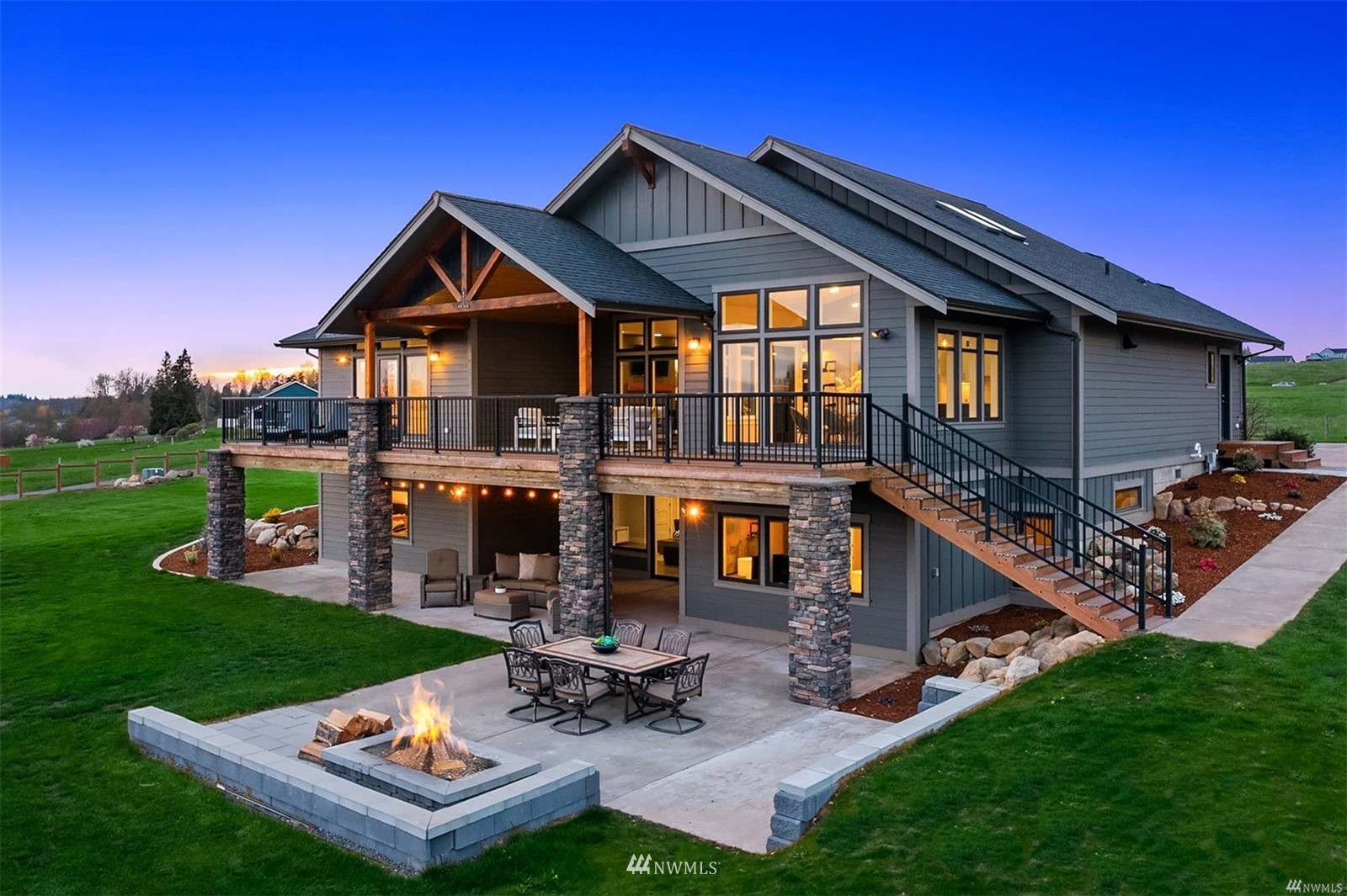 Quintessential Pacific Northwest country oasis on 5 acres of picturesque land. This 5BR, 4BA home boasts dramatic interior spaces including true great room with soaring vaulted ceiling, rich hardwoods + inviting fireplace. Views are spectacular. Chef’s kitchen features large island, wet bar, shaker cabinets, dual-oven, range + walk-in pantry. Spacious owner’s suite has floor-to-ceiling windows leading to deck. Spa-like bath with soaking tub + large walk-in closet. Bonus room can be used as home office or den. Separate living area + sprawling covered deck on lower level. Two decks + firepit make outdoor entertaining easy. Large 3-car garage plus room for oversized vehicle. Two full ADUs. Newer home with careful attention to design details.