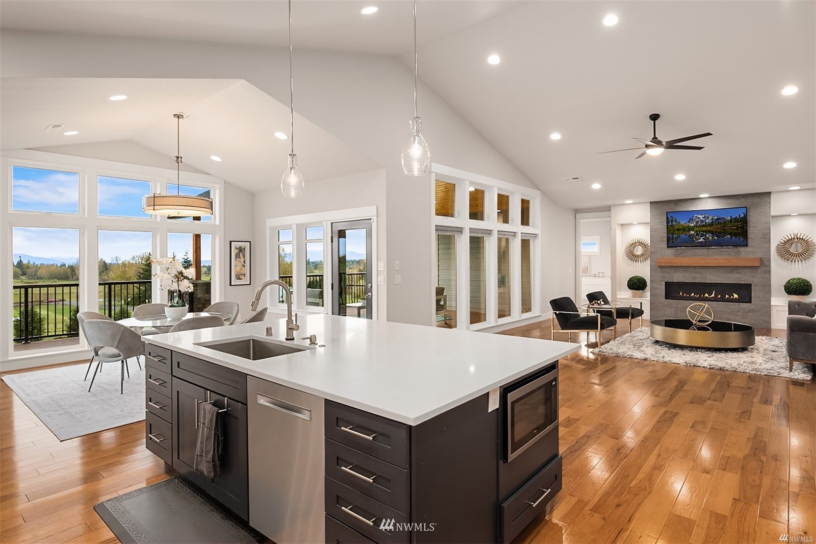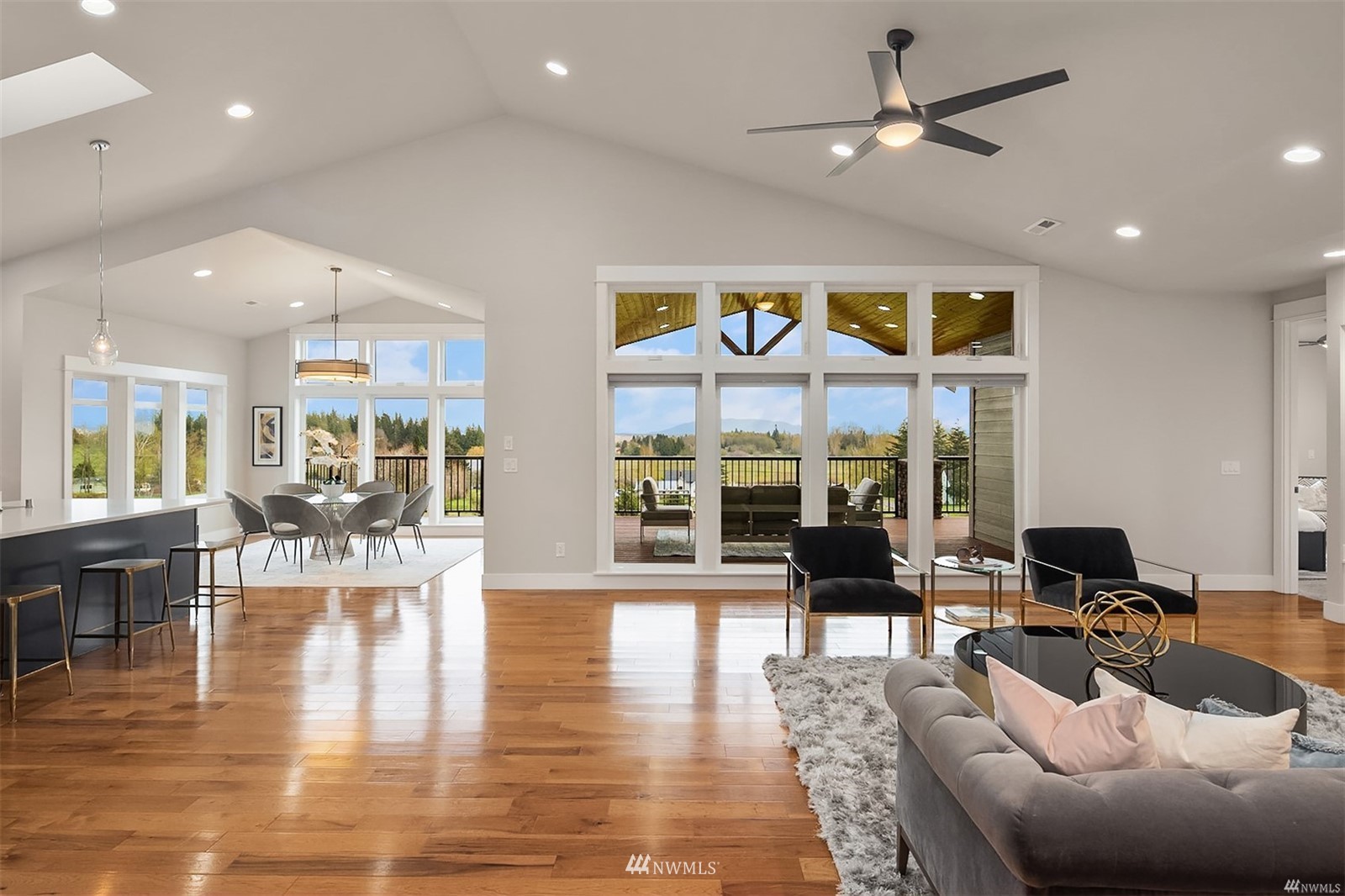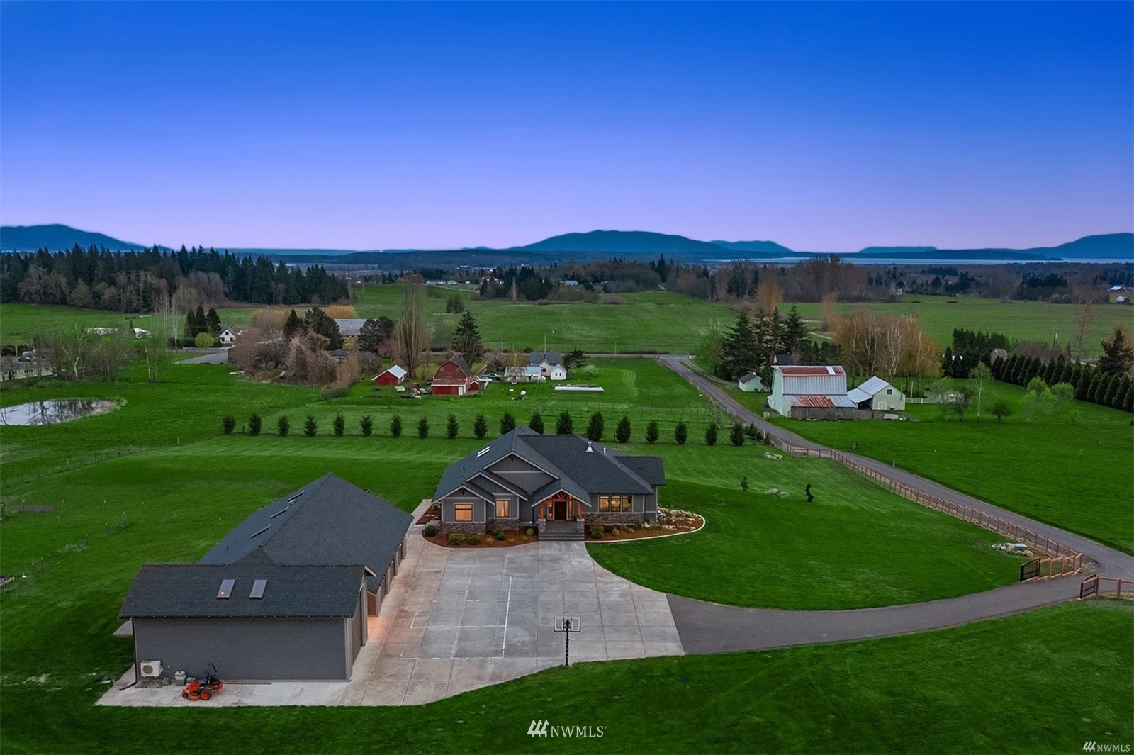 Quintessential Pacific Northwest country oasis on 5 acres of picturesque land. This 5BR, 4BA home boasts dramatic interior spaces including true great room with soaring vaulted ceiling, rich hardwoods + inviting fireplace. Views are spectacular. Chef’s kitchen features large island, wet bar, shaker cabinets, dual-oven, range + walk-in pantry. Spacious owner’s suite has floor-to-ceiling windows leading to deck. Spa-like bath with soaking tub + large walk-in closet. Bonus room can be used as home office or den. Separate living area + sprawling covered deck on lower level. Two decks + firepit make outdoor entertaining easy. Large 3-car garage plus room for oversized vehicle. Two full ADUs. Newer home with careful attention to design details.