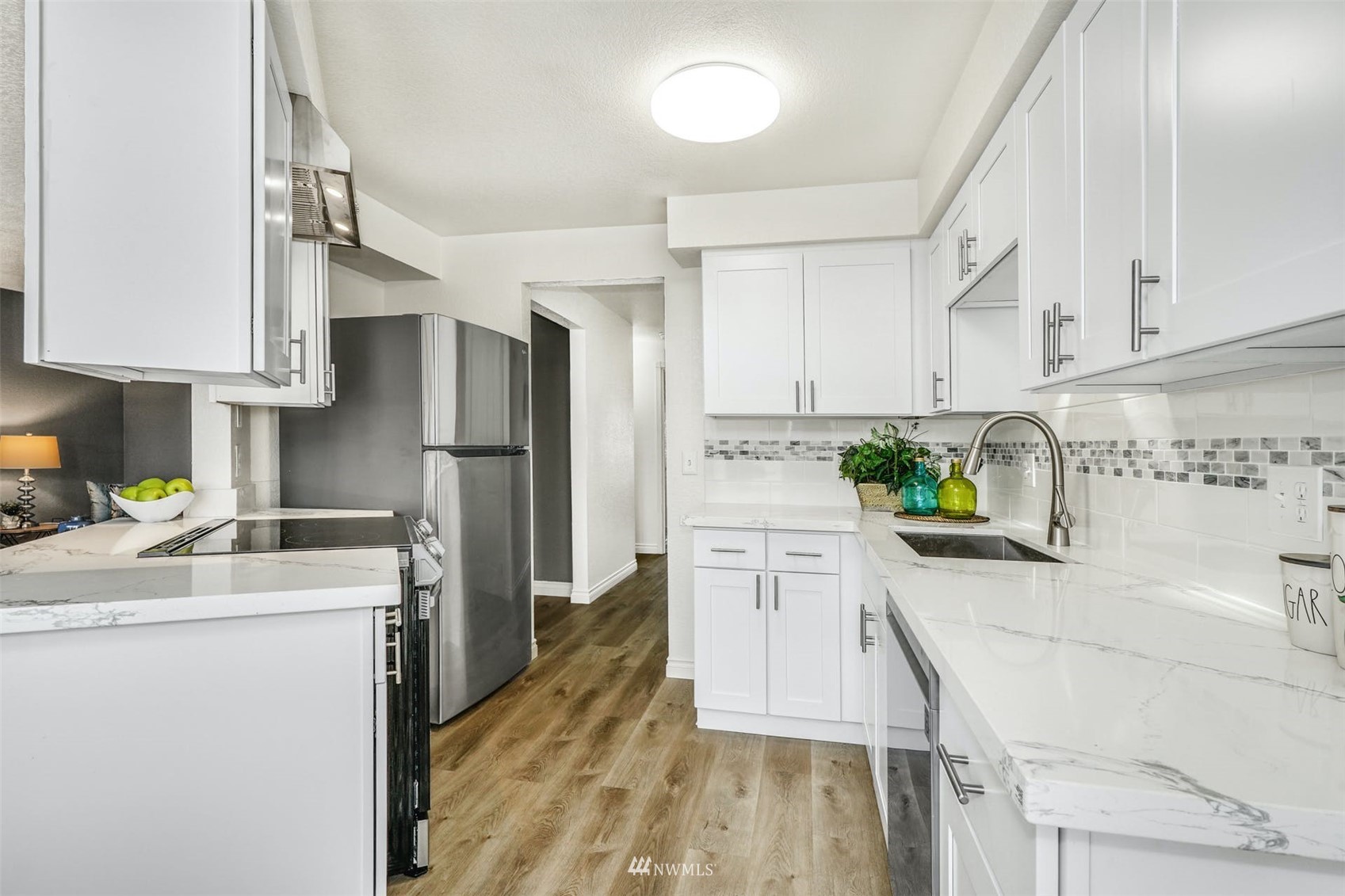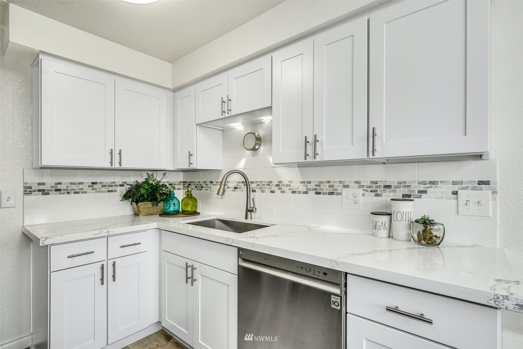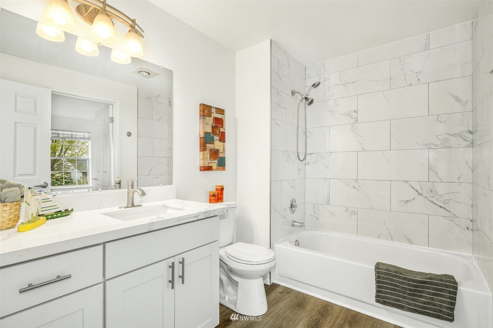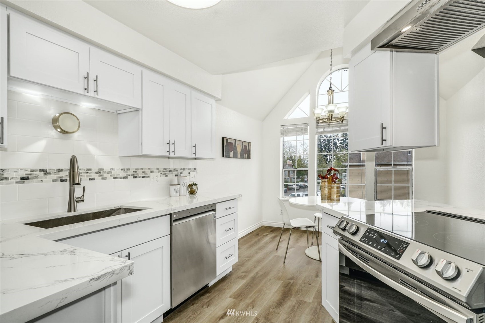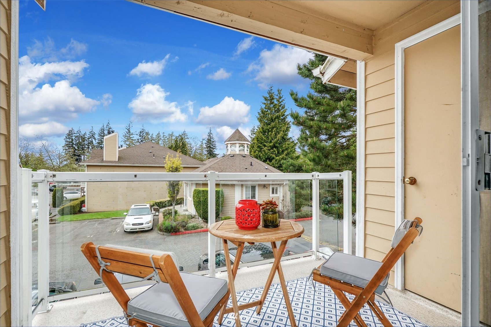 Impeccably updated Top Floor, 2 BR/2 Full Bath Condo in convenient location. Over $40k in top to bottom updates, Like New! All laminated HW floor, fresh paint, & new molding. New kitchen with white cabinets, granite countertop, tile backsplash, hood, & SS appliances. End unit features inviting, vaulted ceiling and large wall windows that bring in lots of natural light. Sliding doors open out to sizable balcony for BBQ or relaxing view out into green space. Jack-n-Jill-style full bathroom connected to 2nd BR. Side by side Washer/Dryer too! Next to Bus Stop. Minutes to P&R, future Light Rail Station, I-5, I-405, Costco, Alderwood Mall, & Boeing. Low HOD includes W/S/G. Thinking of inventing? No Rental Caps & 2 parking spaces. Don't miss out!