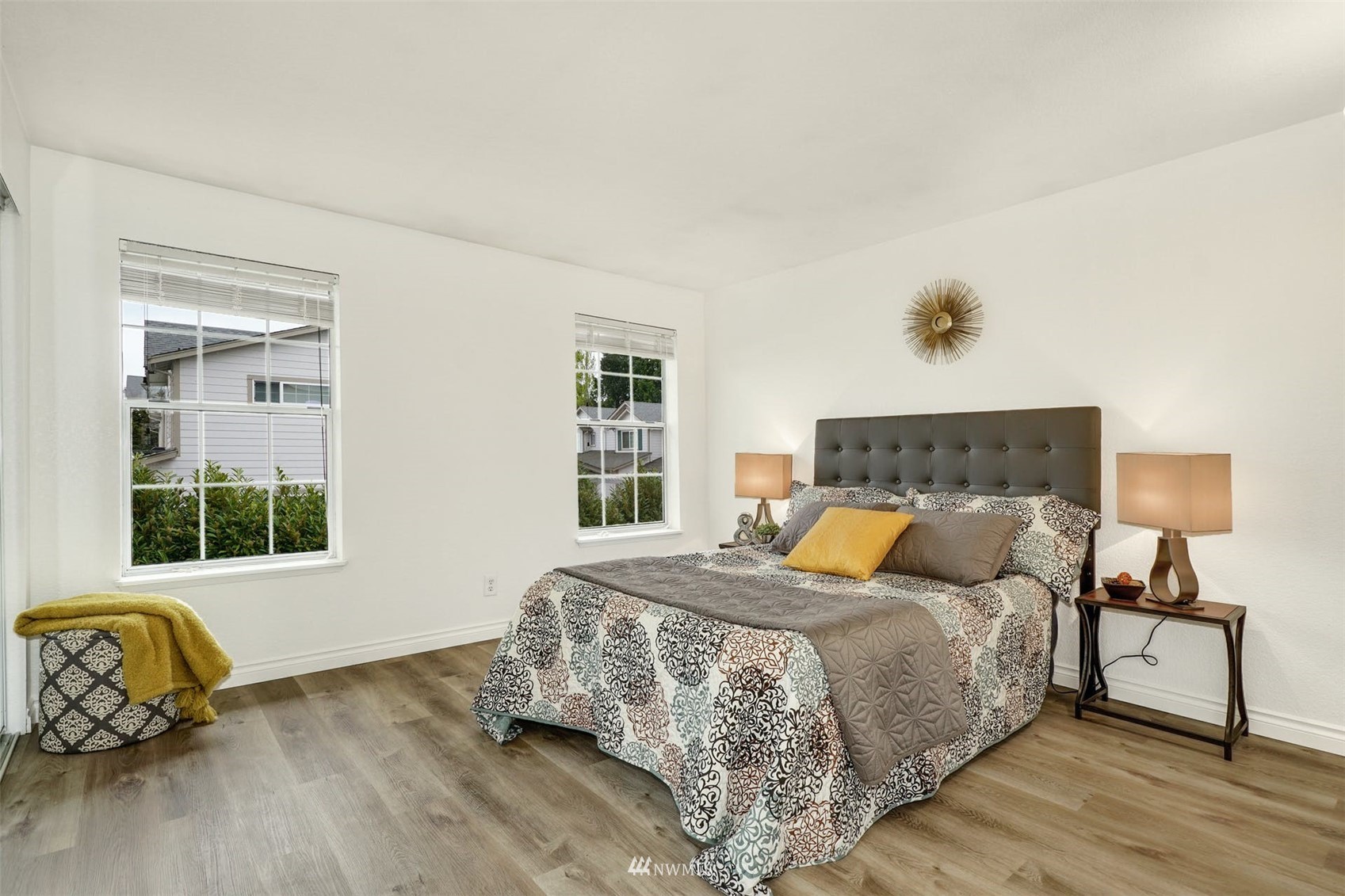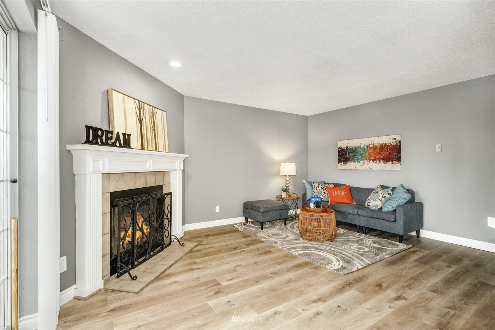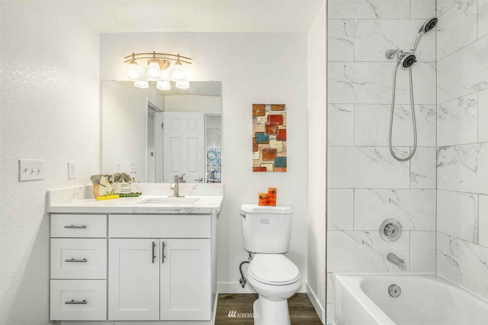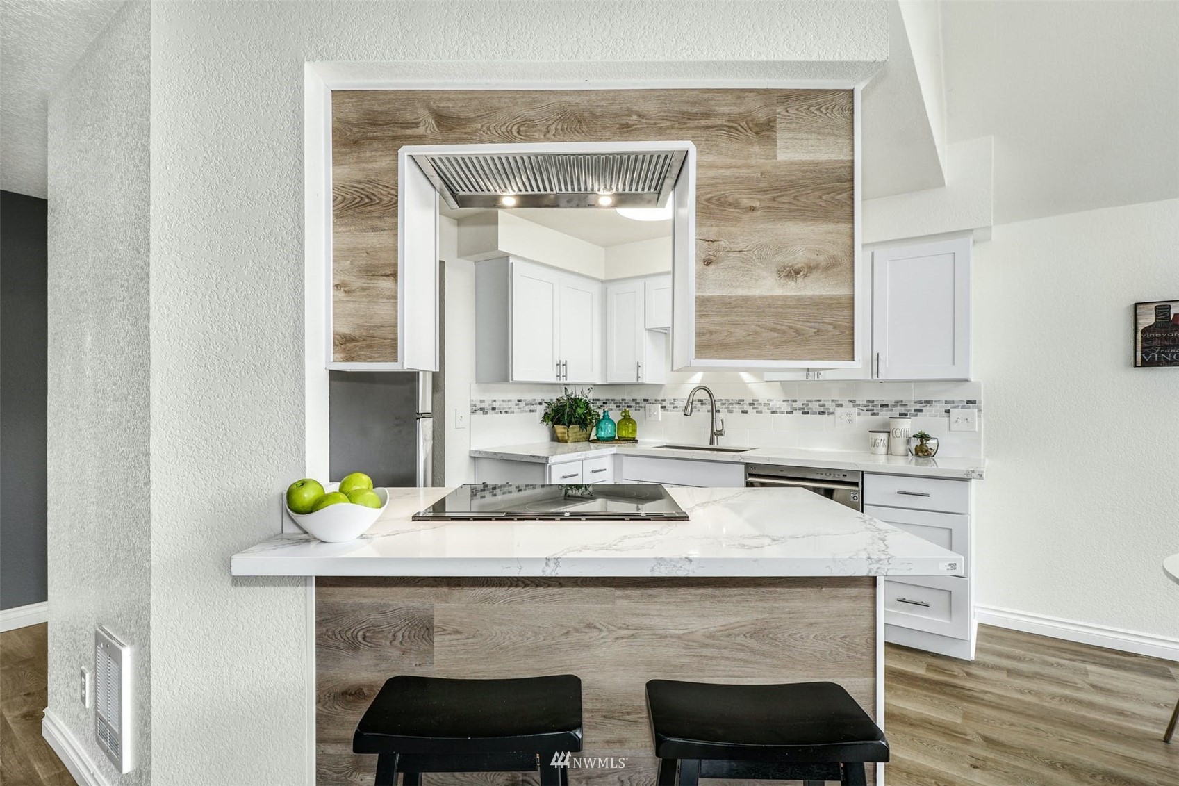 Impeccably updated Top Floor, 2 BR/2 Full Bath Condo in convenient location. Over $40k in top to bottom updates, Like New! All laminated HW floor, fresh paint, & new molding. New kitchen with white cabinets, granite countertop, tile backsplash, hood, & SS appliances. End unit features inviting, vaulted ceiling and large wall windows that bring in lots of natural light. Sliding doors open out to sizable balcony for BBQ or relaxing view out into green space. Jack-n-Jill-style full bathroom connected to 2nd BR. Side by side Washer/Dryer too! Next to Bus Stop. Minutes to P&R, future Light Rail Station, I-5, I-405, Costco, Alderwood Mall, & Boeing. Low HOD includes W/S/G. Thinking of inventing? No Rental Caps & 2 parking spaces. Don't miss out!