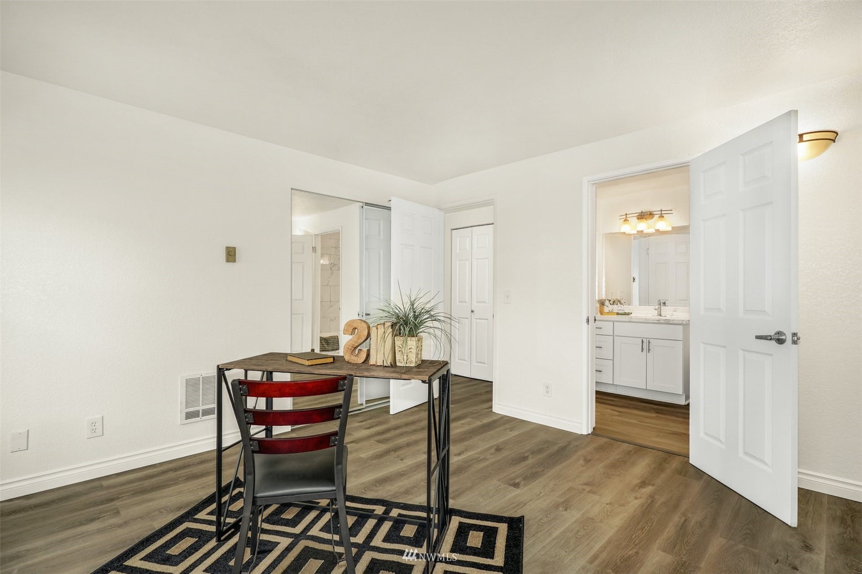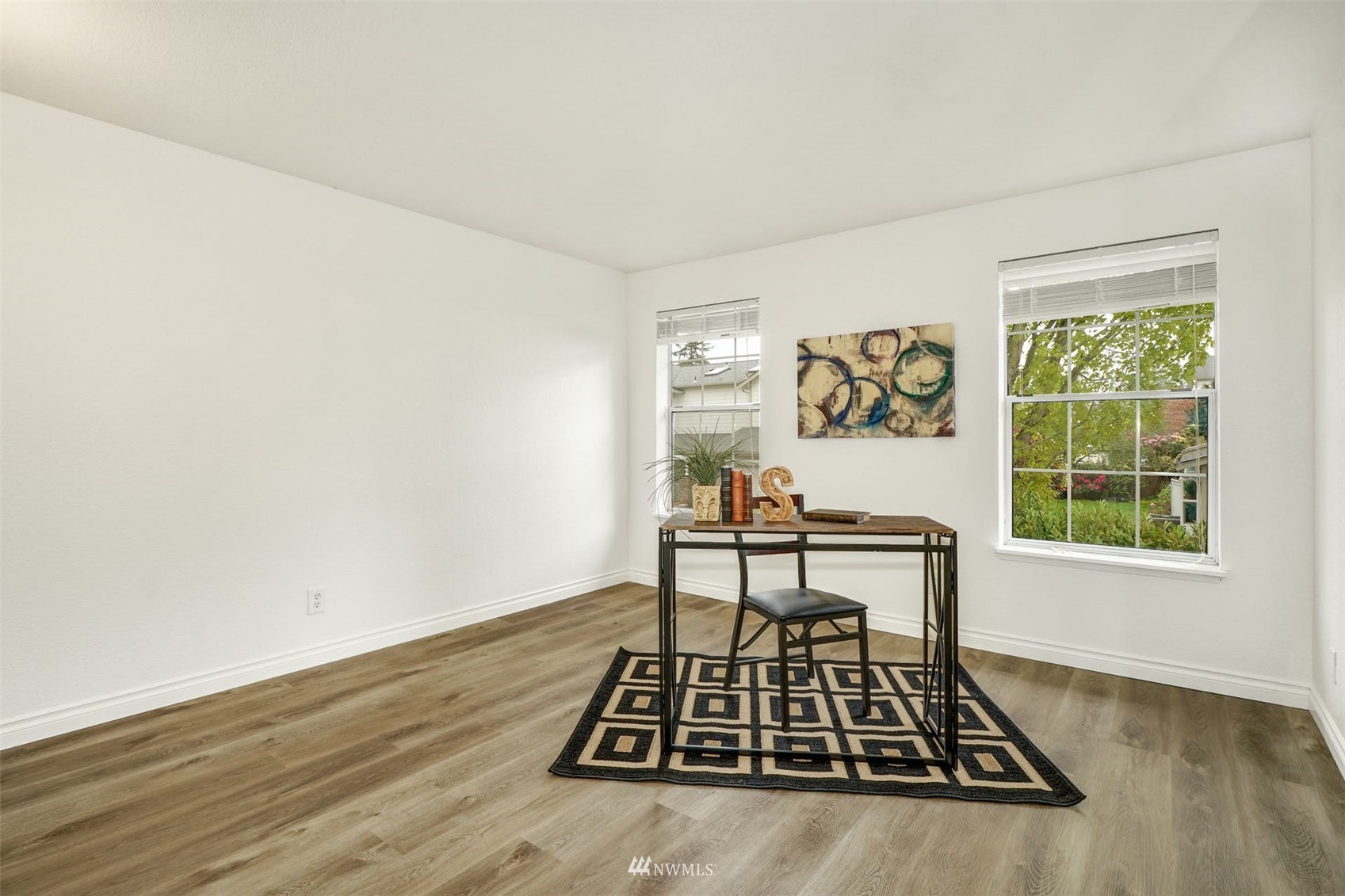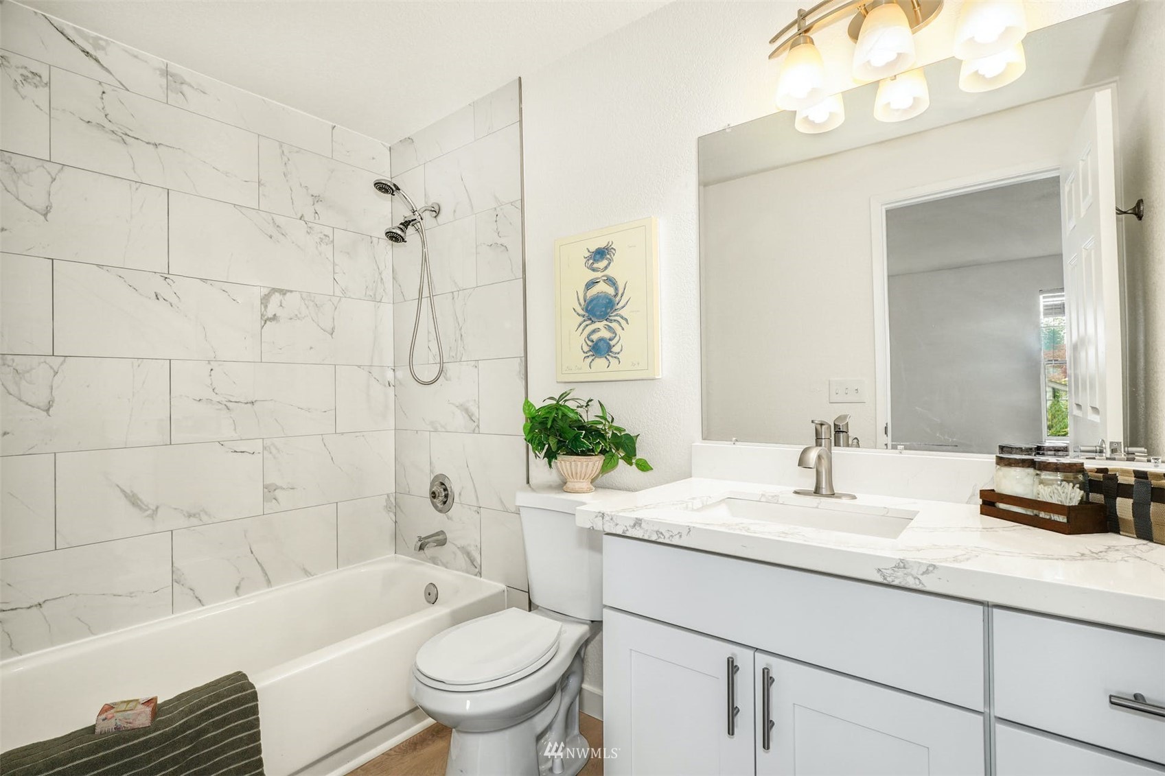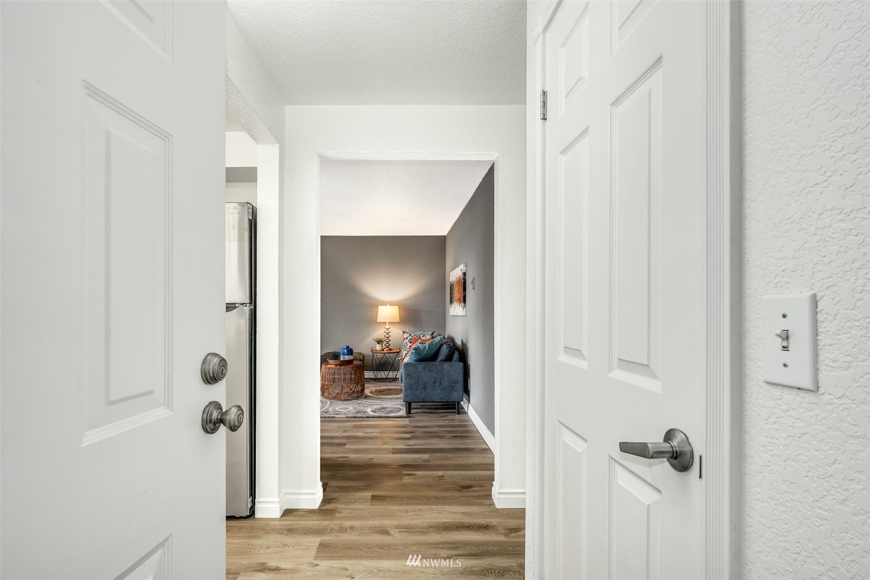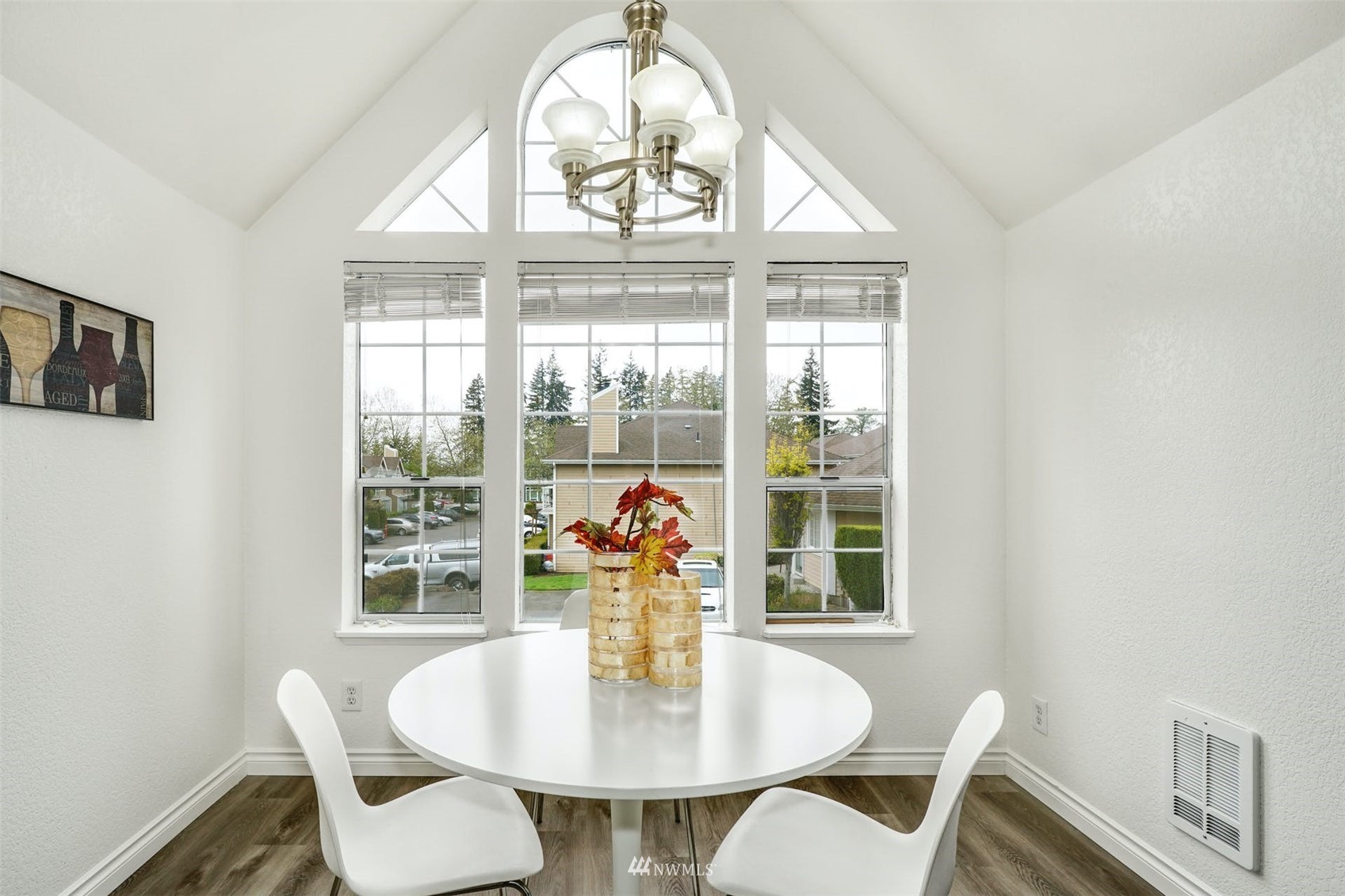 Impeccably updated Top Floor, 2 BR/2 Full Bath Condo in convenient location. Over $40k in top to bottom updates, Like New! All laminated HW floor, fresh paint, & new molding. New kitchen with white cabinets, granite countertop, tile backsplash, hood, & SS appliances. End unit features inviting, vaulted ceiling and large wall windows that bring in lots of natural light. Sliding doors open out to sizable balcony for BBQ or relaxing view out into green space. Jack-n-Jill-style full bathroom connected to 2nd BR. Side by side Washer/Dryer too! Next to Bus Stop. Minutes to P&R, future Light Rail Station, I-5, I-405, Costco, Alderwood Mall, & Boeing. Low HOD includes W/S/G. Thinking of inventing? No Rental Caps & 2 parking spaces. Don't miss out!