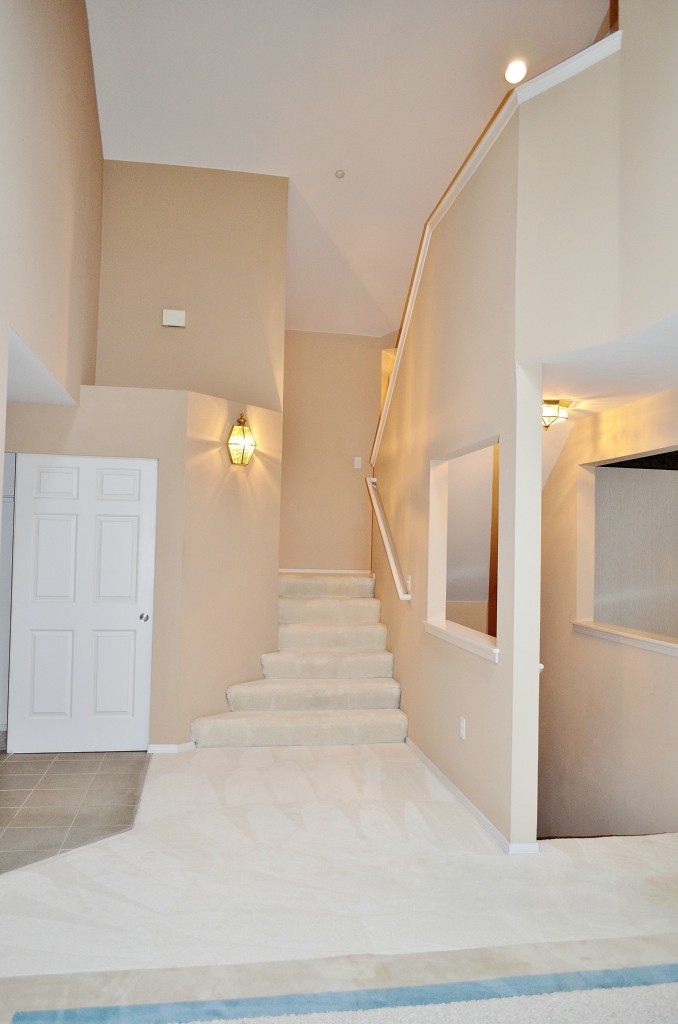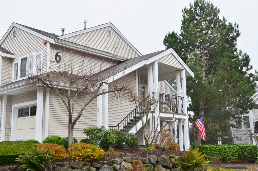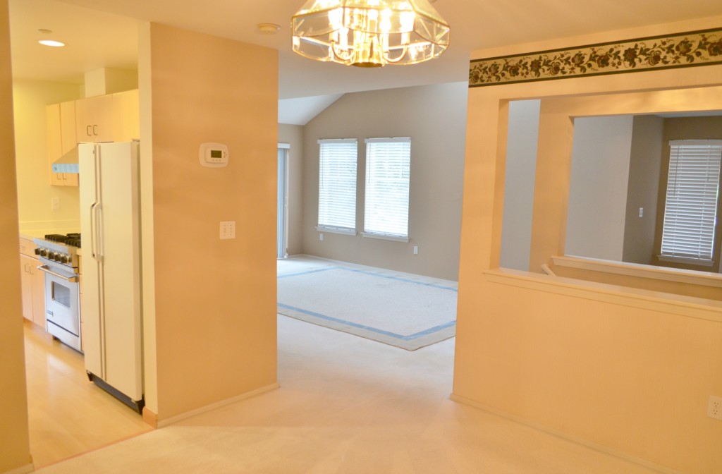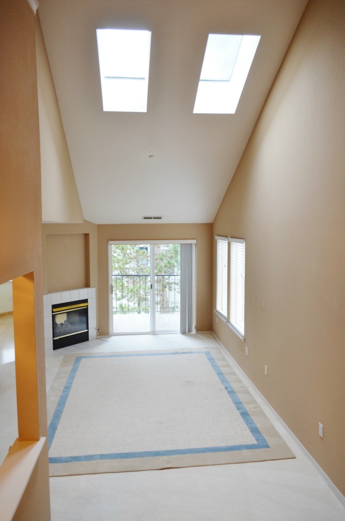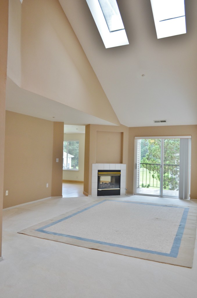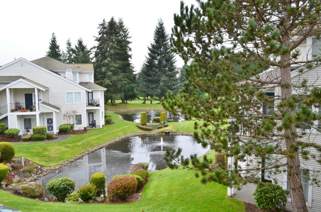 Wonderful 2nd-owner 3-BR end unit w/nearly 1700sf. Tranquil setting w/pond views, dual decks, soaring ceilings, large BR's, abundant storage PLUS attached 2-car garage! Formal LR + fam room share dual sided gaslog FP, all appliances, white millwork, 6-panel doors. Tile entry at front & garage, skylights, neutral colors, phenomenal windows. Viking gas range & Bosch D/W. Master suite is oversized with full fountain view and walk in closet. Secondary BR's are generous - one with walk-in closet.