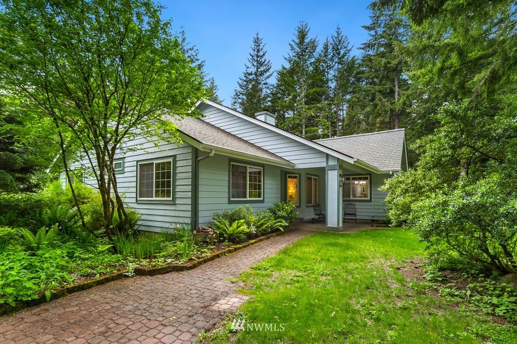 Spacious rambler surrounded by 5 acres of gardens and meandering forest trails. The home’s circular layout allows for separate living spaces while maintaining an open feel. Large primary suite has a spa-like bath with gorgeous wooden soaking tub. Office could be converted to 3rd bedroom. Formal living room w/gas fireplace, plus large family room with vaulted ceilings, skylights, and wood burning fireplace. Large kitchen has newer ss appliances, breakfast bar and butler’s pantry for extra storage. Seller has continued the previous owner’s commitment to organic gardening on the property, including fenced veggie/flower gardening area. Garden shed and covered outdoor storage area. Solar panels and generator stay. New exterior paint 2021.