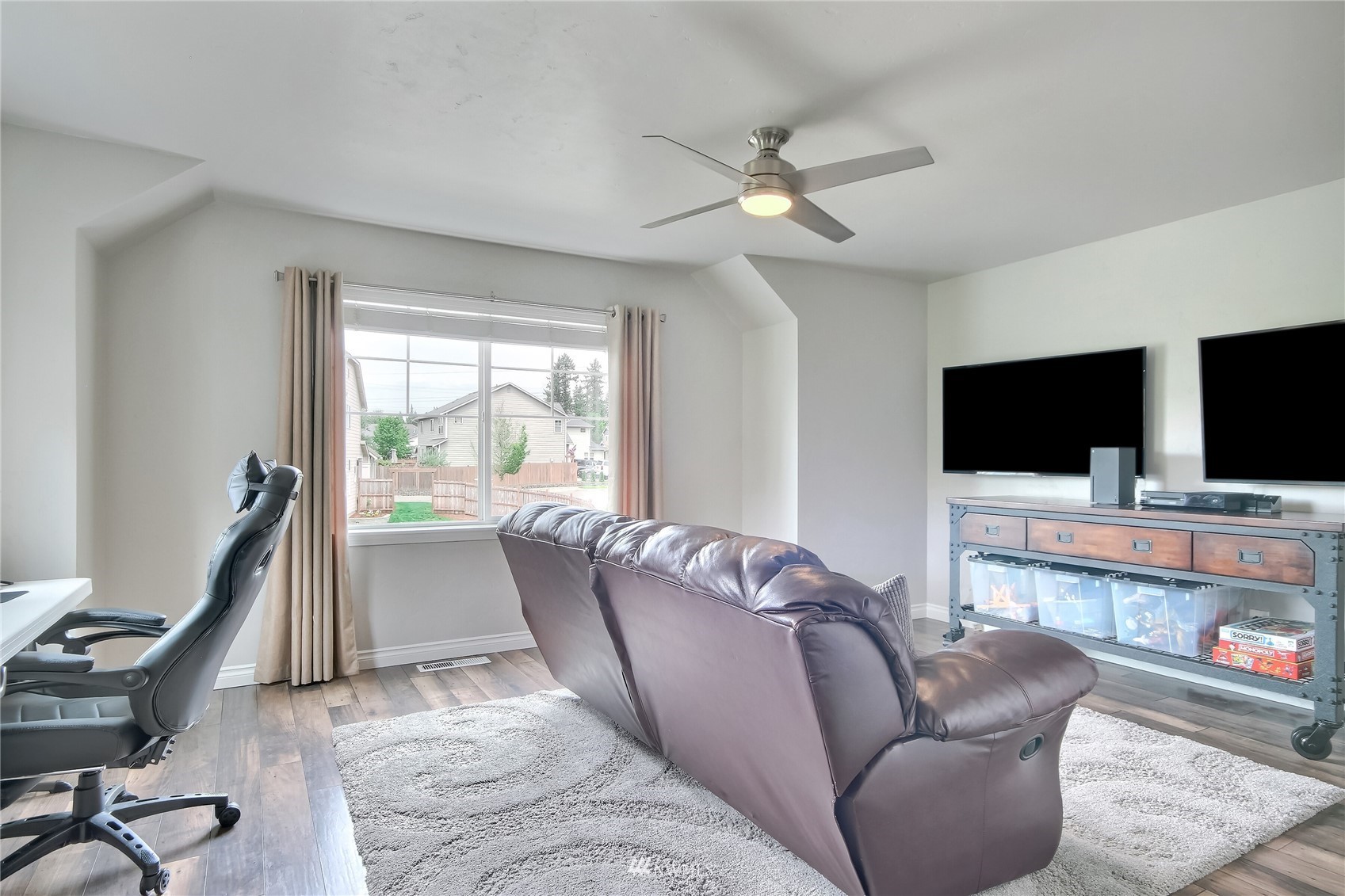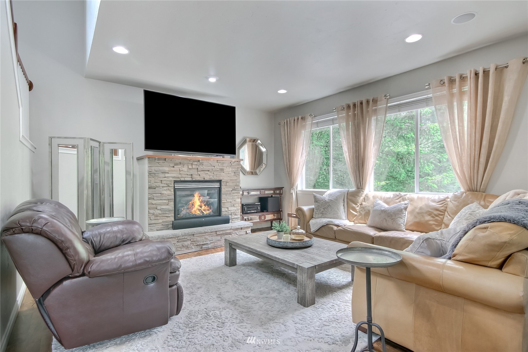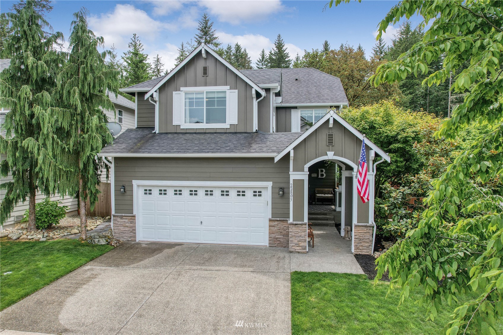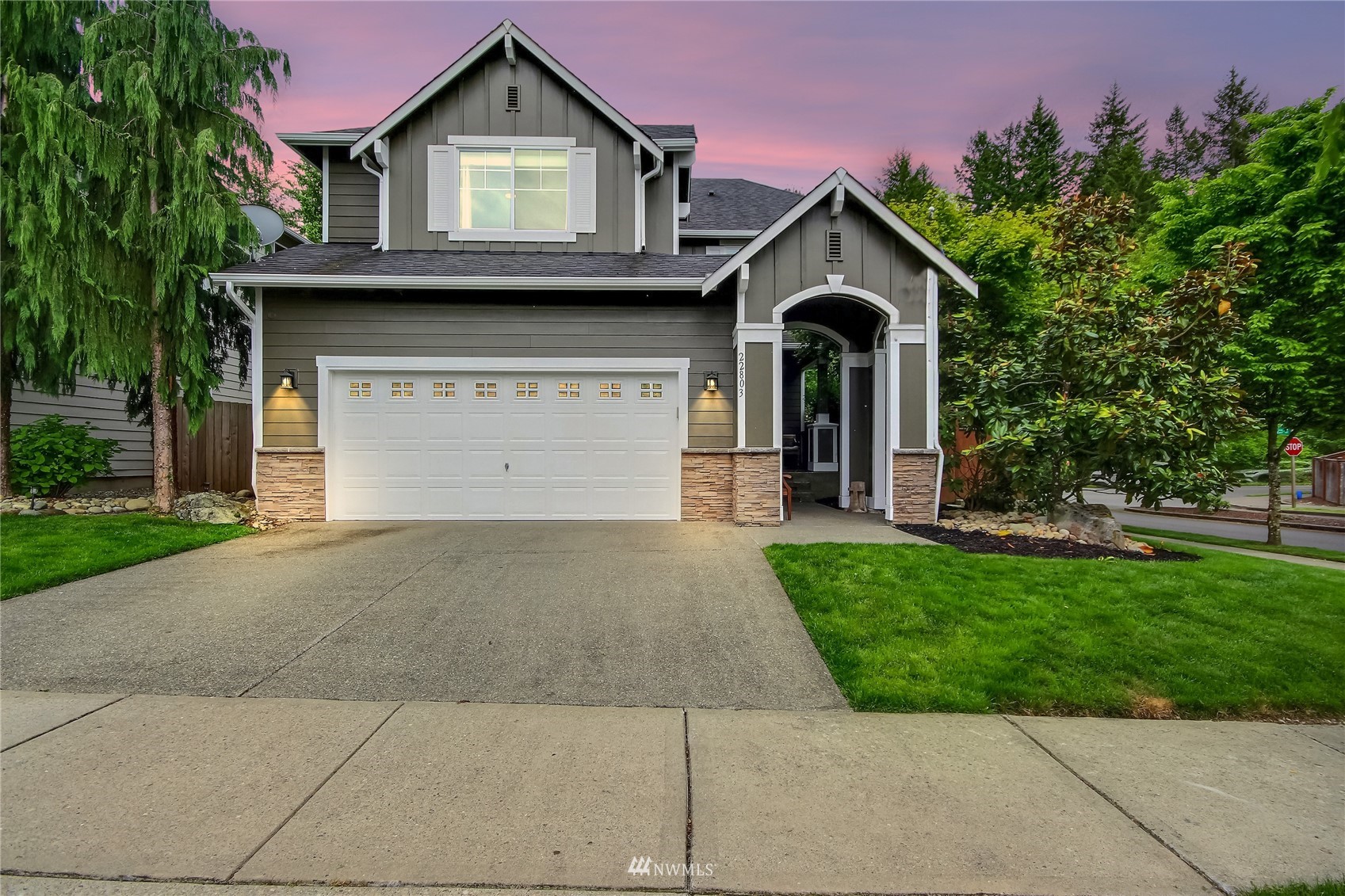 Pride of ownership abounds in this beautiful corner lot home in desirable Pebble Creek across from a park! 3 bd, 2.5 bath, A/C, bonus, den and formal living and dining room. Gourmet kitchen has granite, stainless steel appliances, pantry, double ovens, surround sound. White millwork, gorgeous imperfect wall texture finish and hardwoods throughout home. Primary bedroom with double sided fireplace to it's own private retreat and 5 piece bath. Huge bonus room upstairs. Doggie "hotel" under stairs with pet door exiting to side yard dog run. Backyard is an entertainers dream with giant fire pit and covered live Edgewood bar. Extra storage and additional lighting in garage. New exterior paint, fence and side sheds. Award winning Tahoma schools!