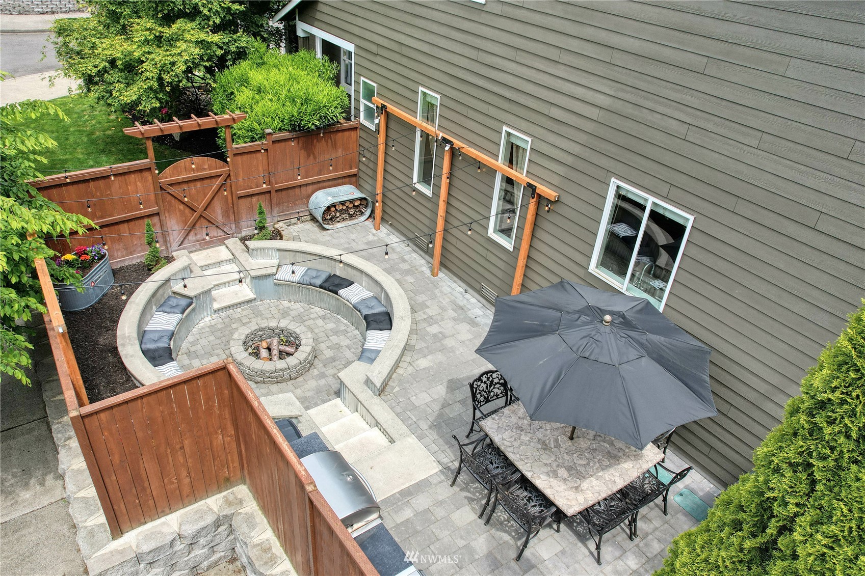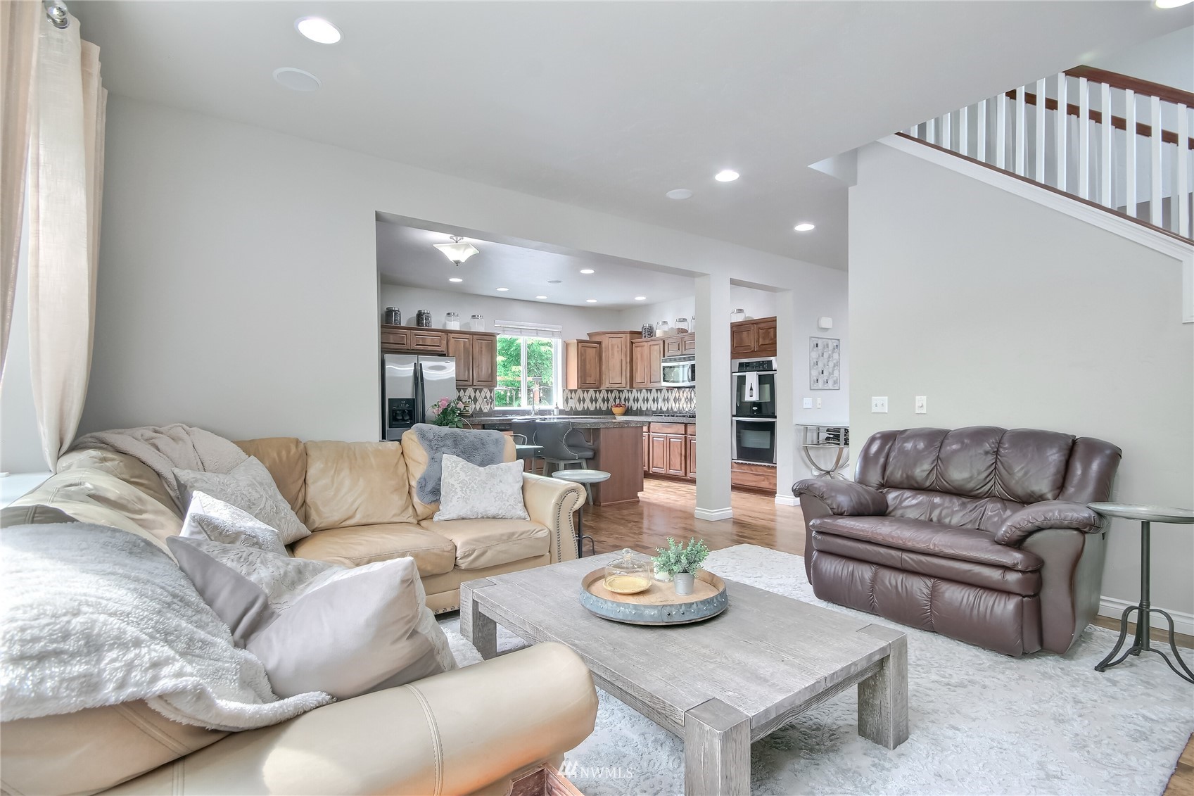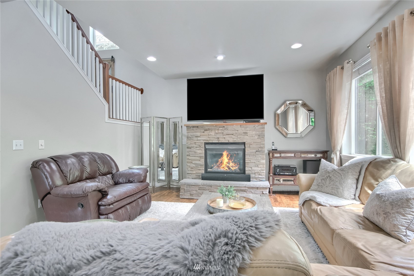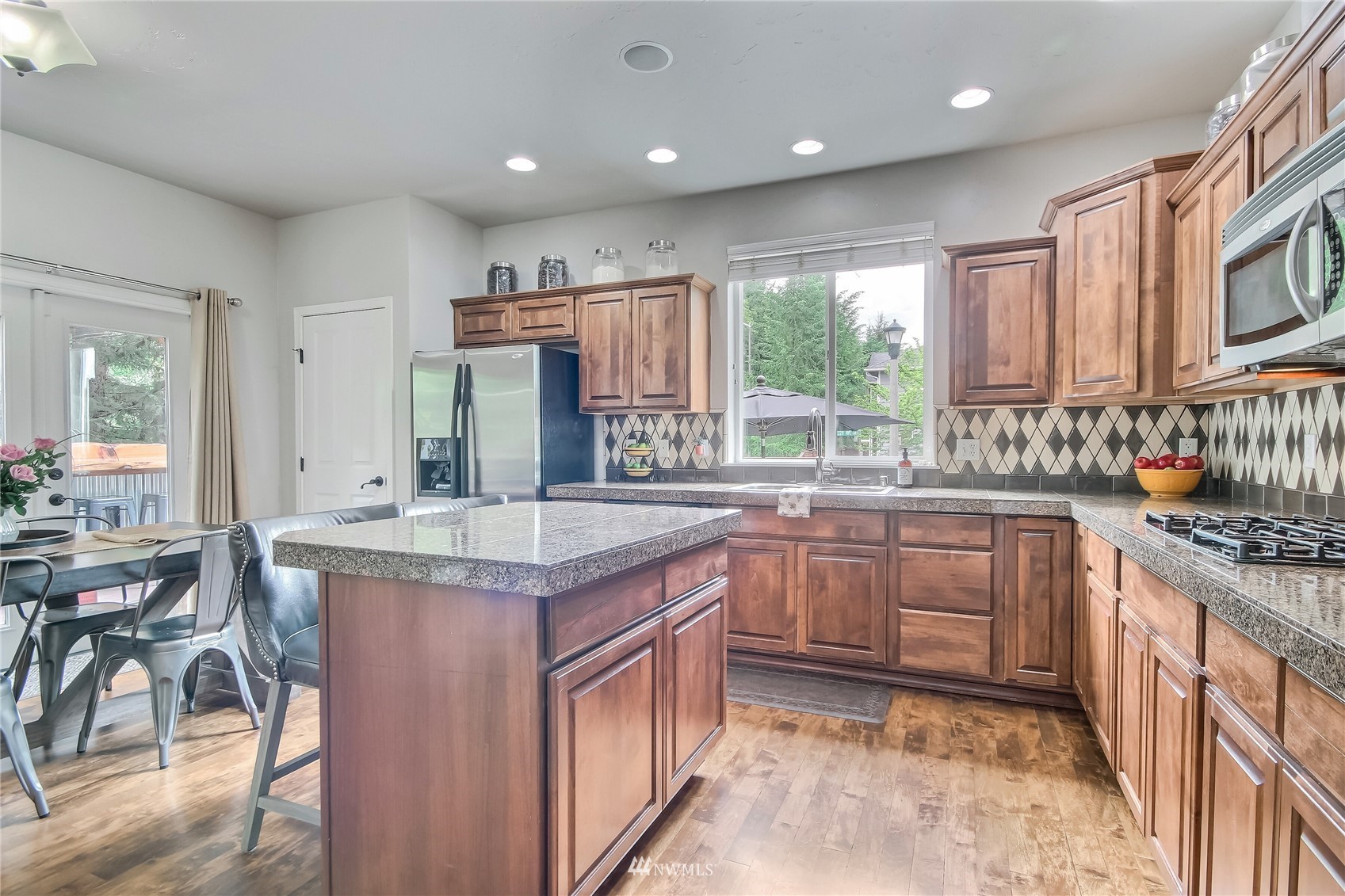 Pride of ownership abounds in this beautiful corner lot home in desirable Pebble Creek across from a park! 3 bd, 2.5 bath, A/C, bonus, den and formal living and dining room. Gourmet kitchen has granite, stainless steel appliances, pantry, double ovens, surround sound. White millwork, gorgeous imperfect wall texture finish and hardwoods throughout home. Primary bedroom with double sided fireplace to it's own private retreat and 5 piece bath. Huge bonus room upstairs. Doggie "hotel" under stairs with pet door exiting to side yard dog run. Backyard is an entertainers dream with giant fire pit and covered live Edgewood bar. Extra storage and additional lighting in garage. New exterior paint, fence and side sheds. Award winning Tahoma schools!