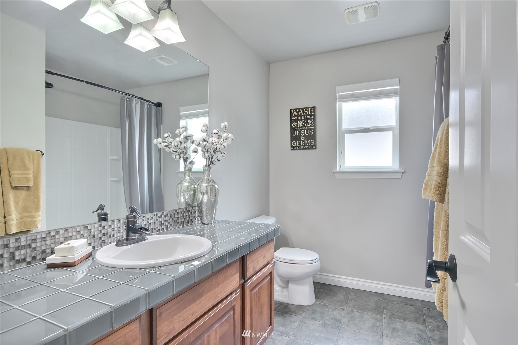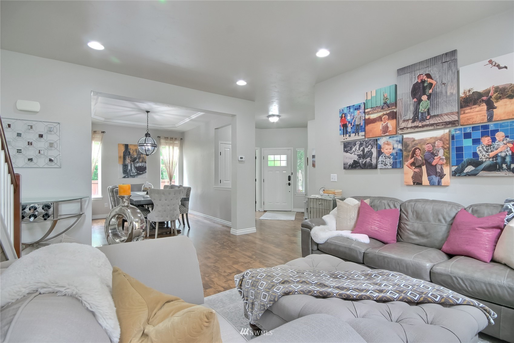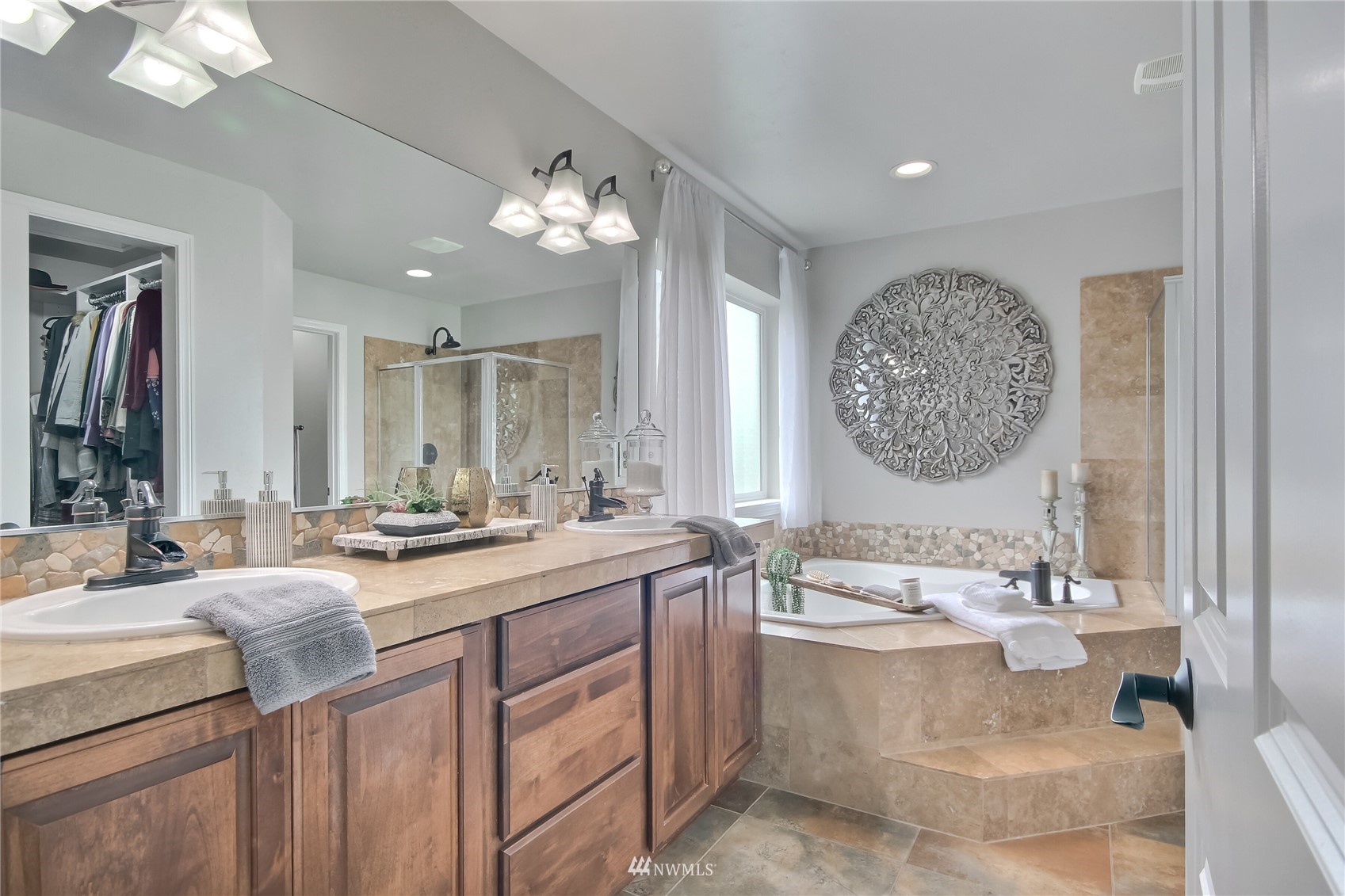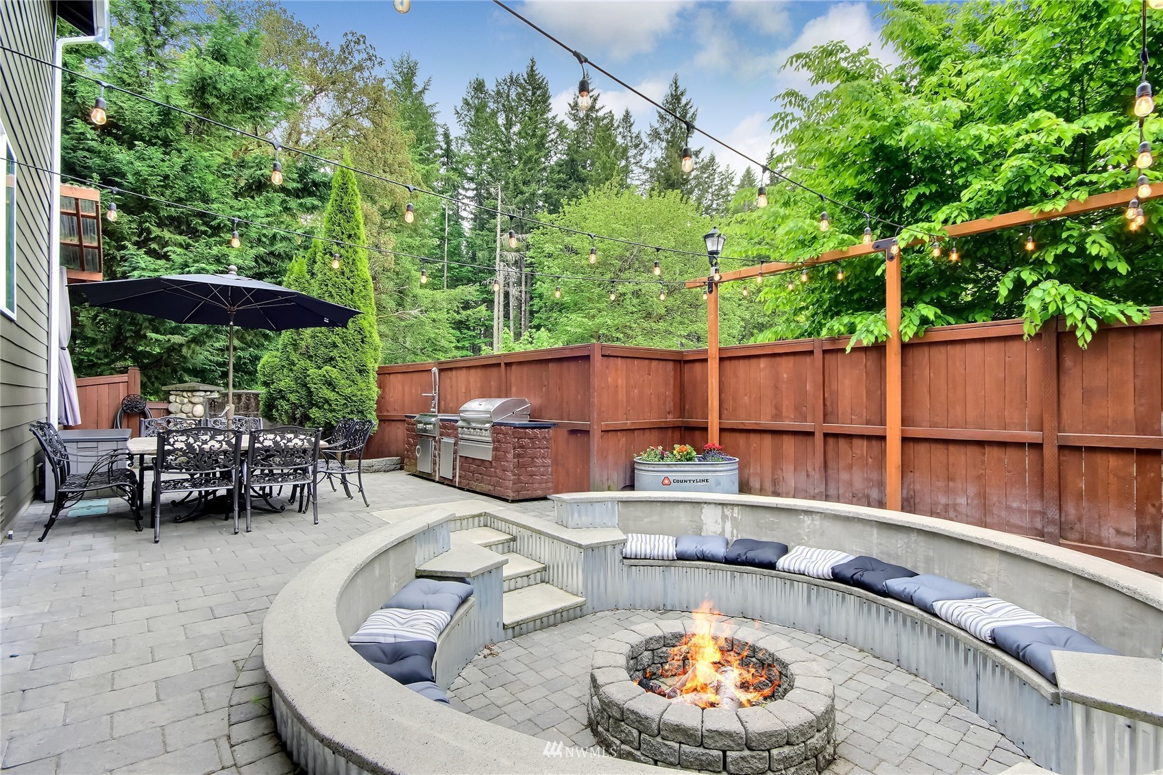 Pride of ownership abounds in this beautiful corner lot home in desirable Pebble Creek across from a park! 3 bd, 2.5 bath, A/C, bonus, den and formal living and dining room. Gourmet kitchen has granite, stainless steel appliances, pantry, double ovens, surround sound. White millwork, gorgeous imperfect wall texture finish and hardwoods throughout home. Primary bedroom with double sided fireplace to it's own private retreat and 5 piece bath. Huge bonus room upstairs. Doggie "hotel" under stairs with pet door exiting to side yard dog run. Backyard is an entertainers dream with giant fire pit and covered live Edgewood bar. Extra storage and additional lighting in garage. New exterior paint, fence and side sheds. Award winning Tahoma schools!