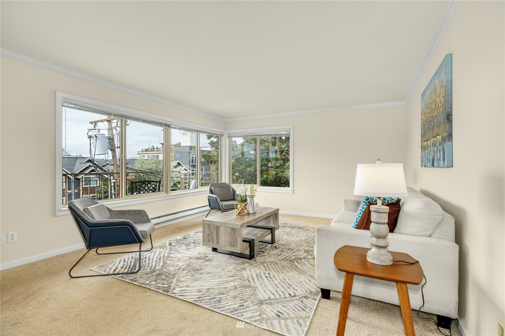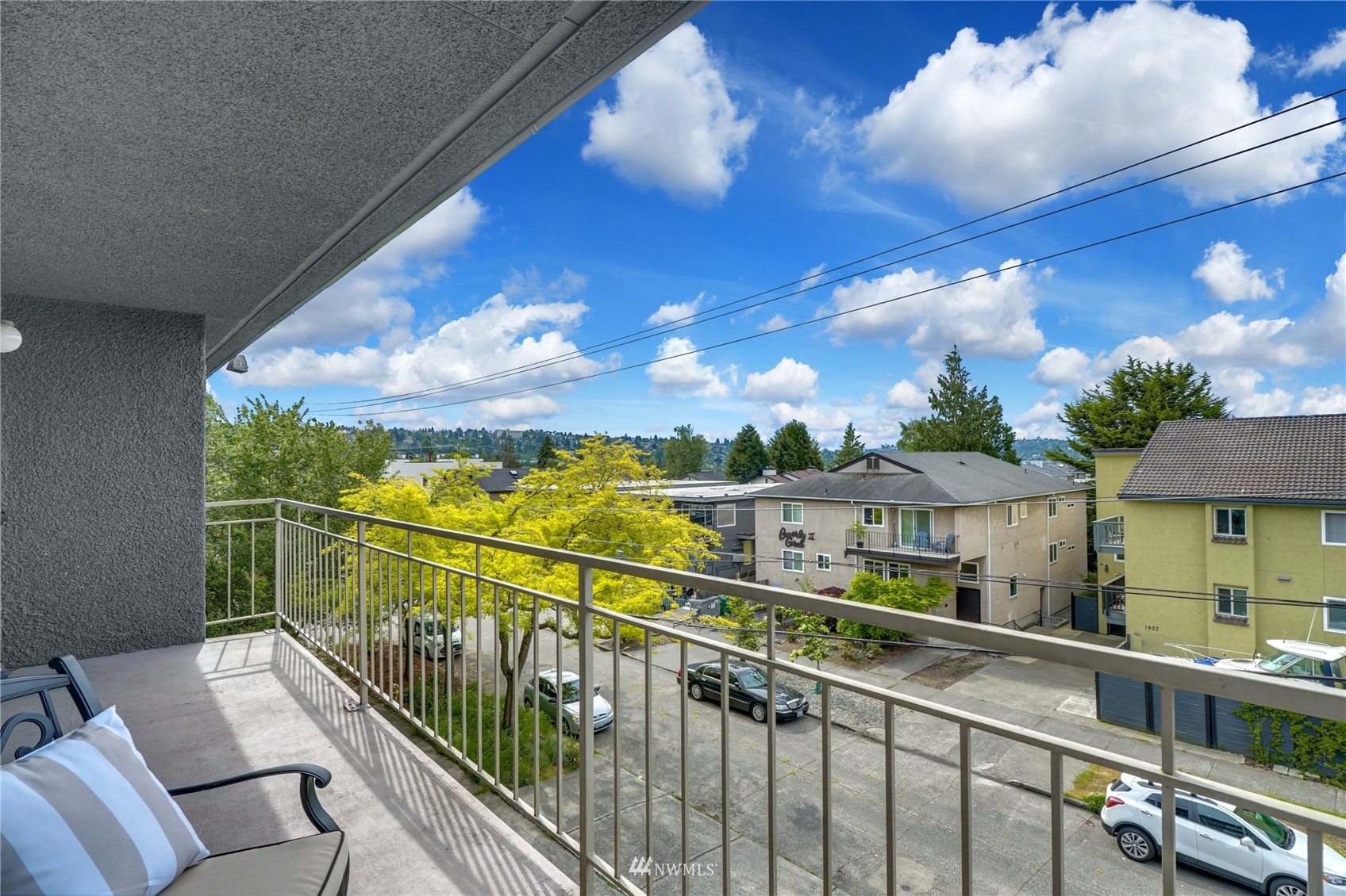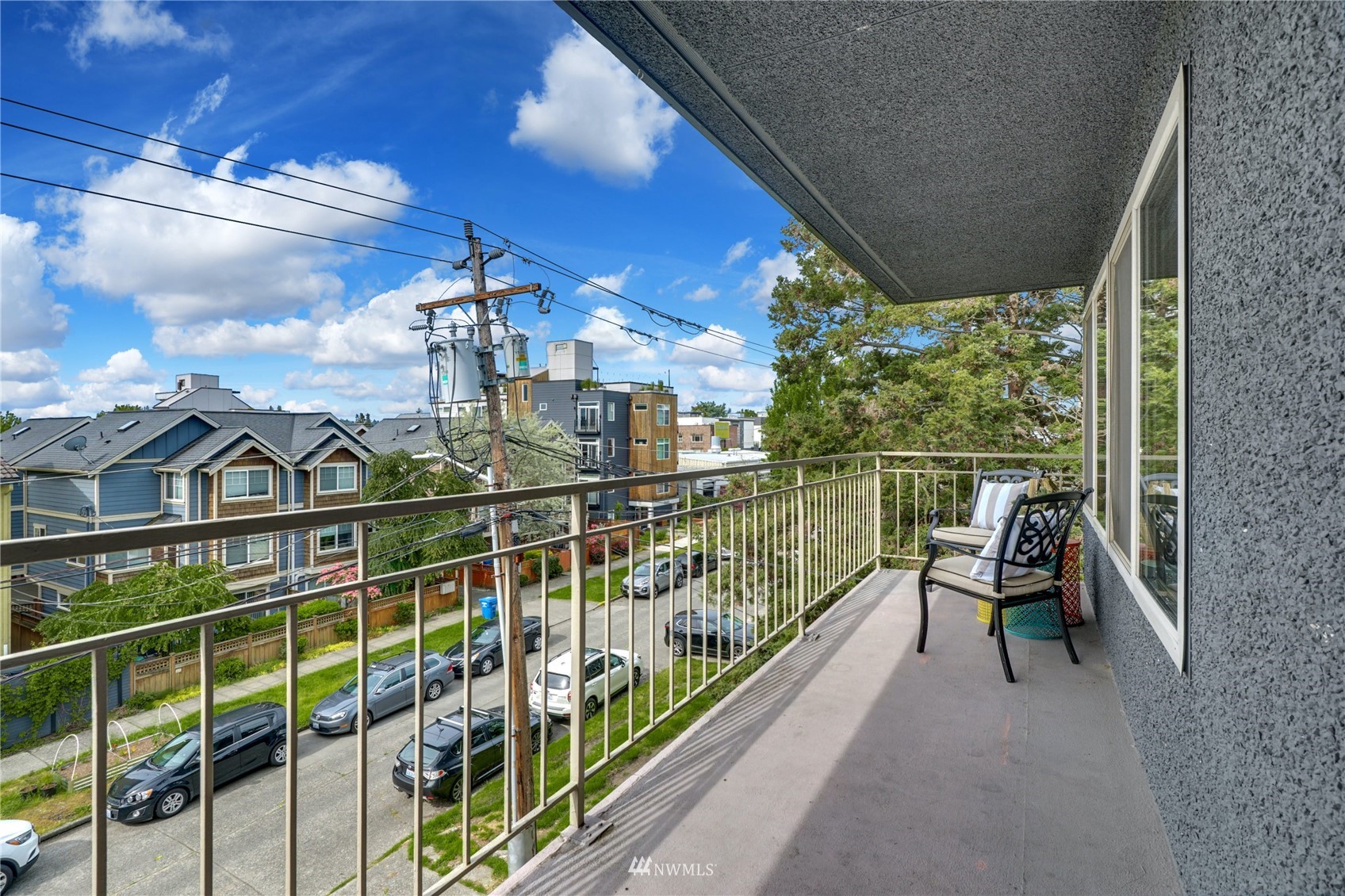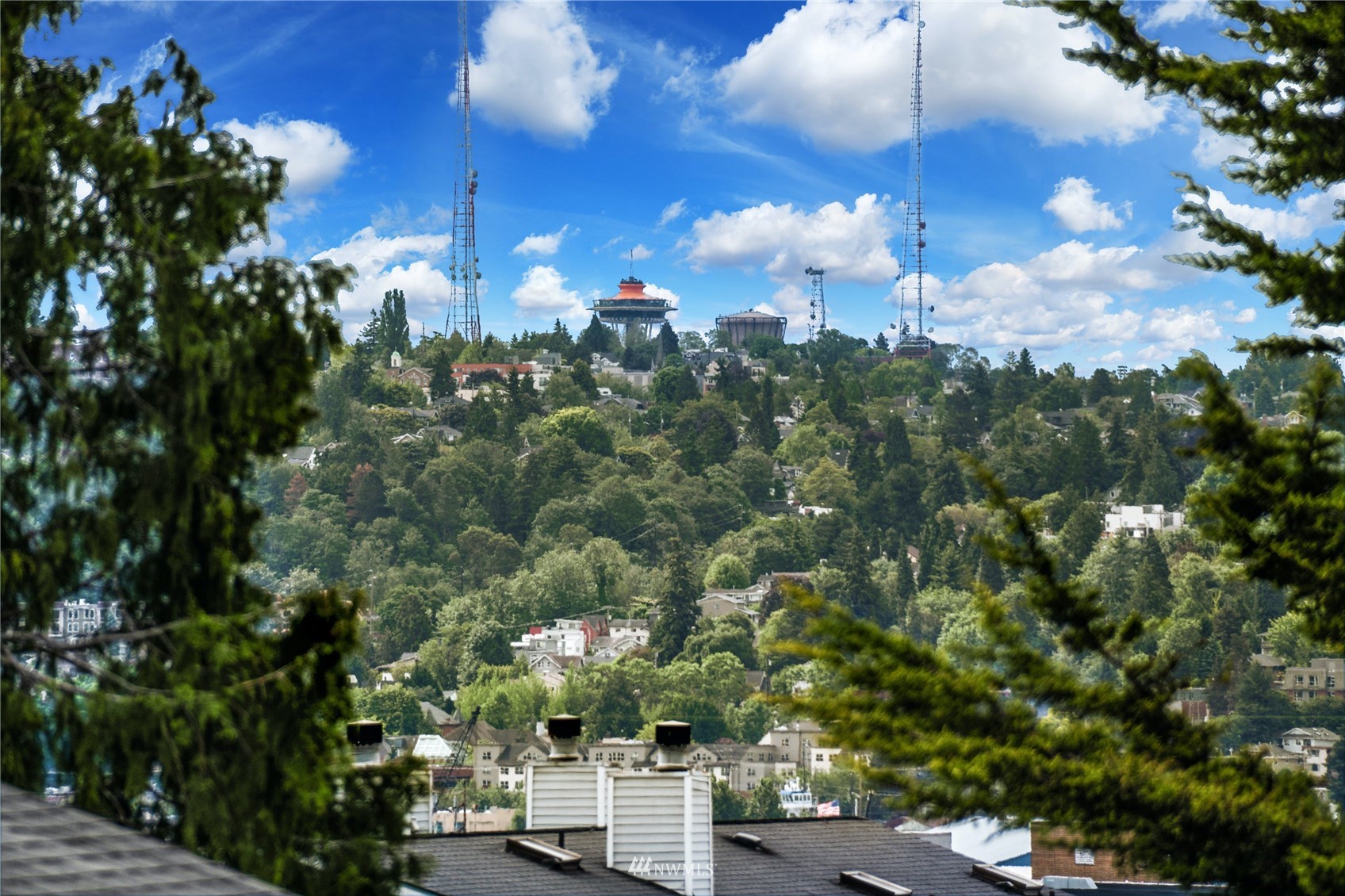 South facing PENTHOUSE 3 bedroom VIEW unit, filled in natural light! Enjoy Mt. Rainier & expansive views. Superior Ballard location! Top floor, corner unit, dreamy open layout, spacious living area & bedrooms. Small home office space off entry! Granite slab kitchen, honed travertine backsplash, new refrigerator & dishwasher. Updated baths, light fixtures & closets. NEW roof in 2019! Newer HWHeater. New washing machine, all appliances stay. Secured #403 storage & bike storage rooms. 2 tandem parking #6. Great HOA, no special assess, strong reserves, mid-century bldg in prime shape. Mainly owner-occupied, but no rental cap! 92 walk score-grocery, downtown, breweries & dining. Entertain or relax from the covered deck while enjoying the views!