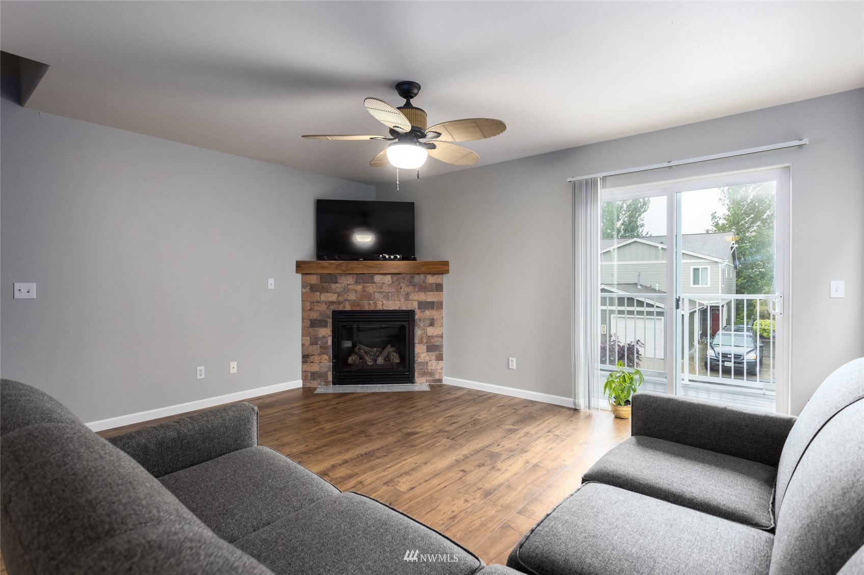 City of Oak Harbor Condo living! This beautifully maintained end unit condominium has walking trails, parks, beaches, shops & amenities a walk out your front door! Open floor plan with luxury plank flooring, great use of kitchen space, matching appliances & access to the private backyard patio for entertaining. Dining and Living room flow with cozy gas fireplace, convenient ½ bath & your own private deck. Upstairs offers a generous guest bedroom w/ full bath, washer/dryer & Primary suite w/ peek-a-boo water views, & private full bath. Large tandem 2 car garage & storage for all your needs. Dues $195 per month, include exterior maintenance, exterior insurance and lawn care. **Unit is in process of exterior maintenance by association**.