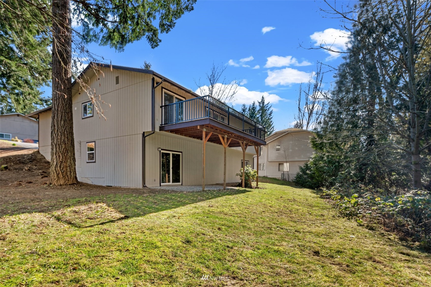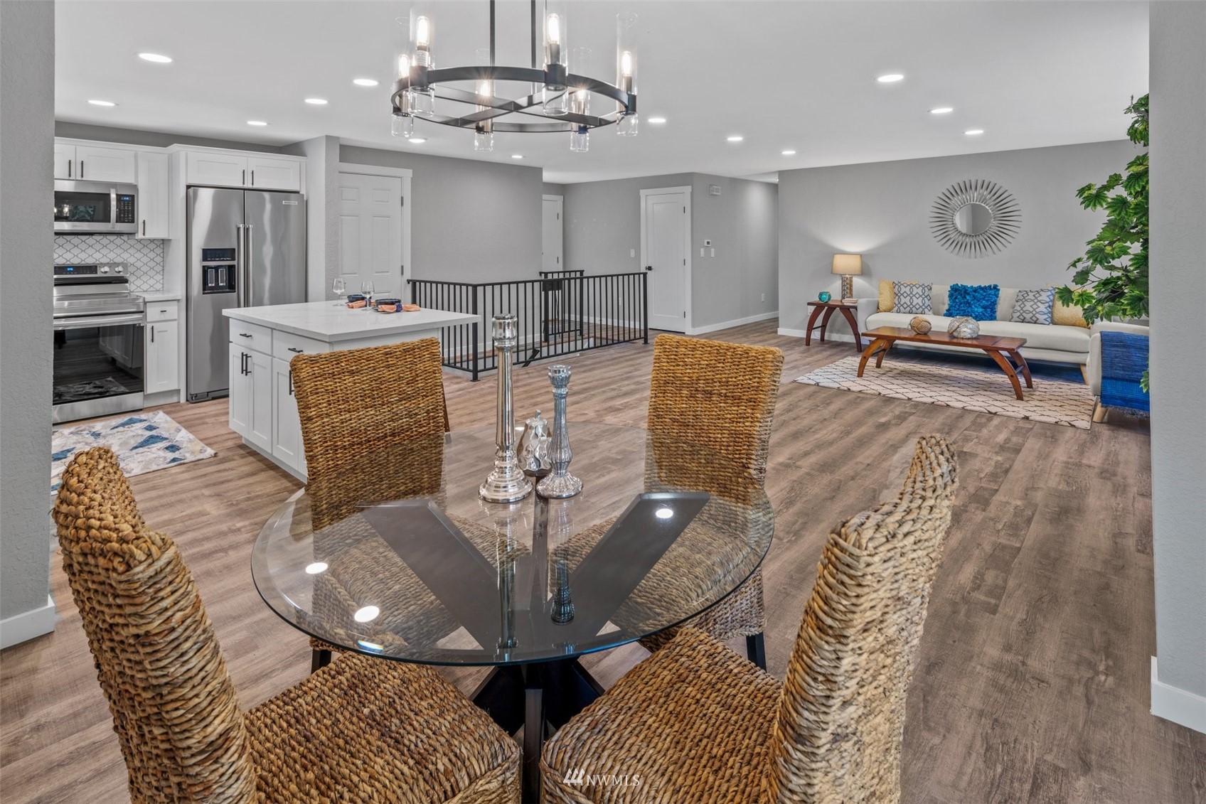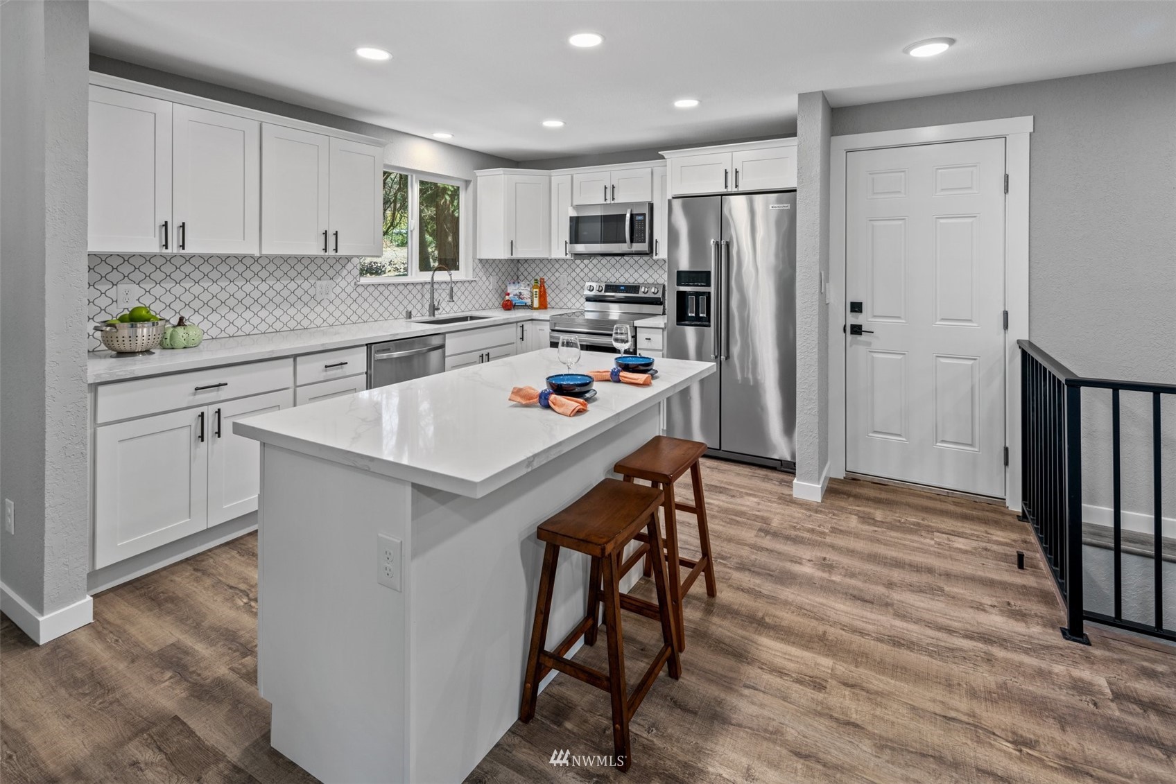 Move in ready! Beautifully refreshed 3 bed/2.5 bath home features new kitchen, new waterproof laminate, new carpet, new paint inside out, new ss appliances, quartz countertops . Lots of storage space downstairs features: bedroom, bath, laundry, wet bar, and separate entrance. Rental opportunity or MIL! Huge deck, attached two car garage and driveway parking. Extra laundry in garage. Easy access to Hwy, shopping and restaurants. Don't miss this one. Close to everything but yet private!