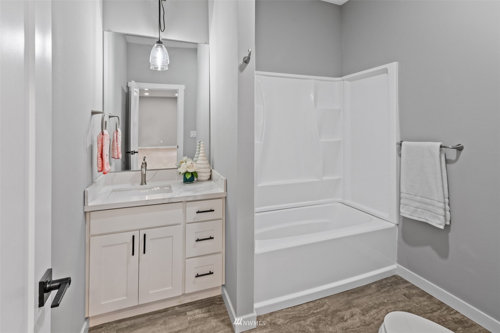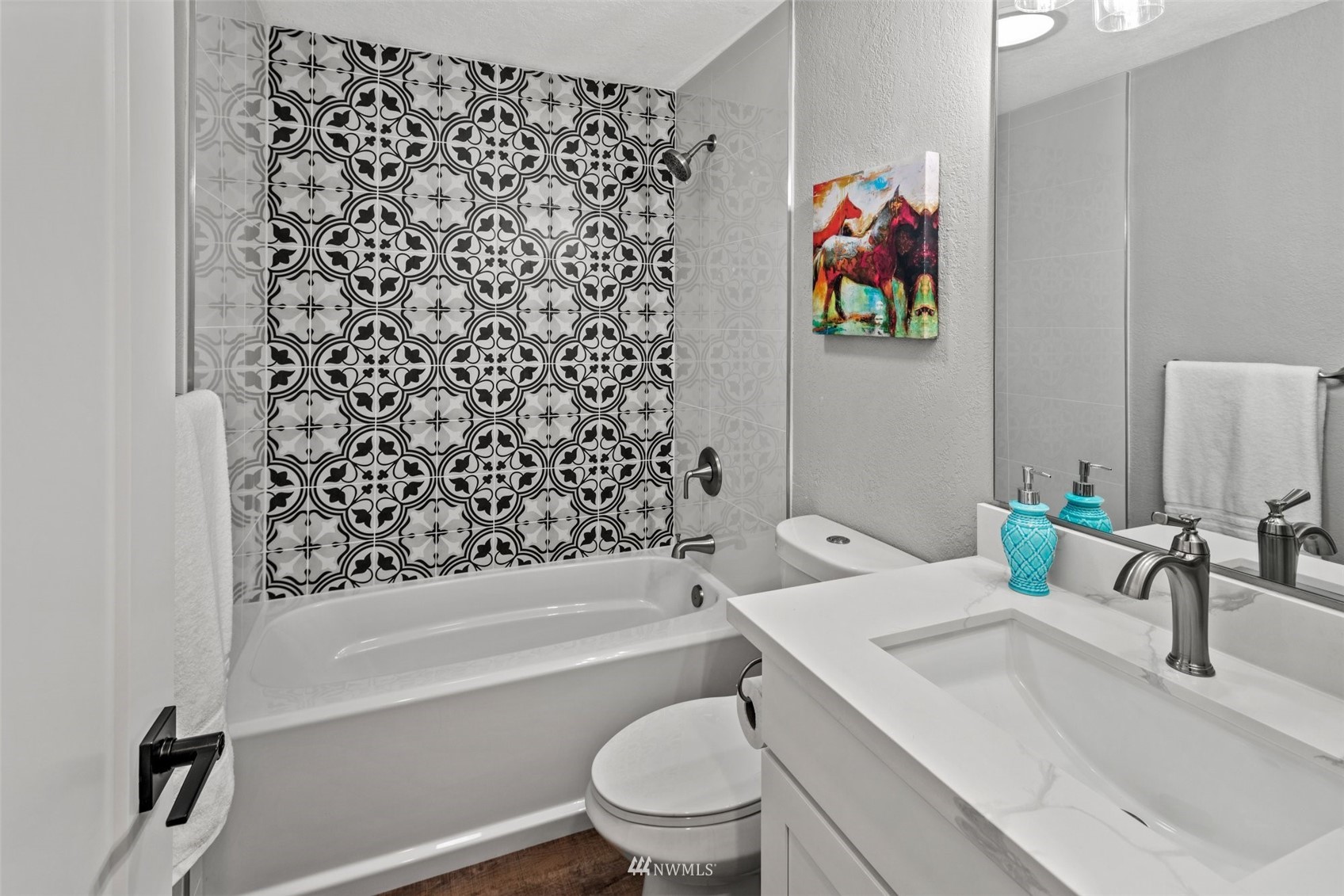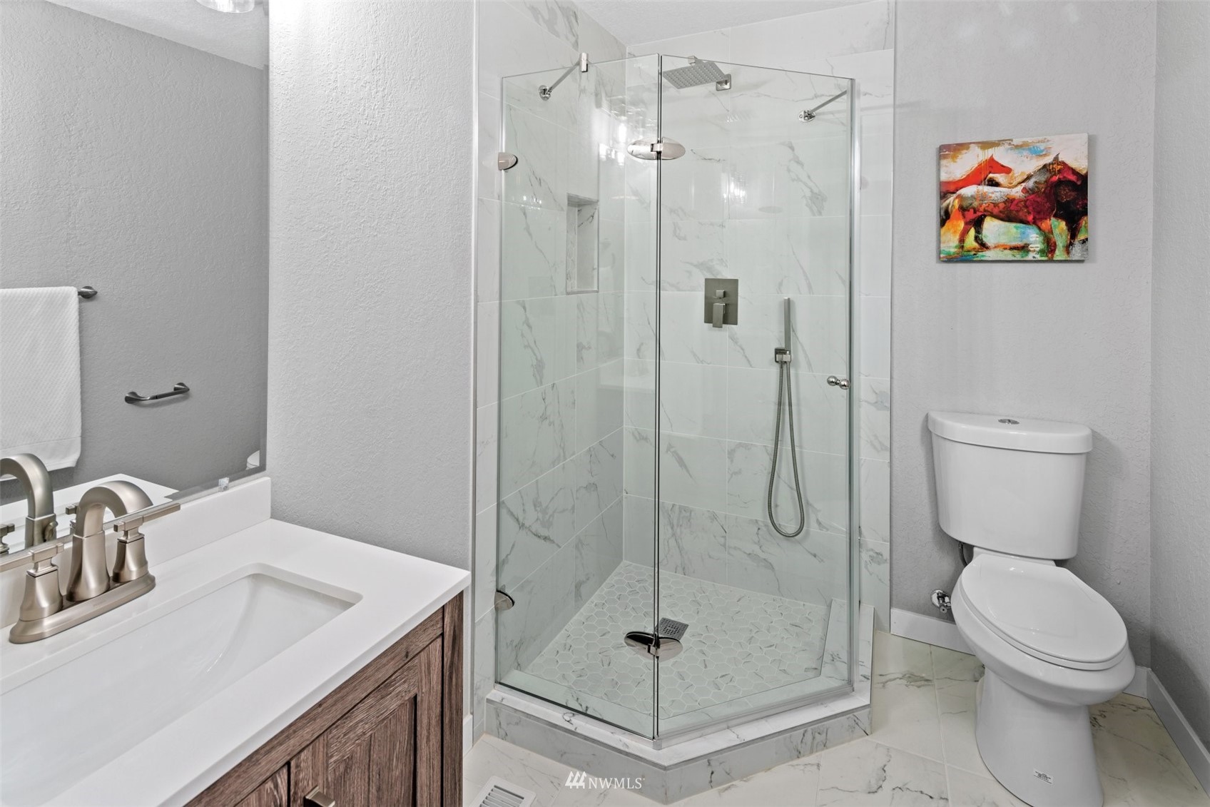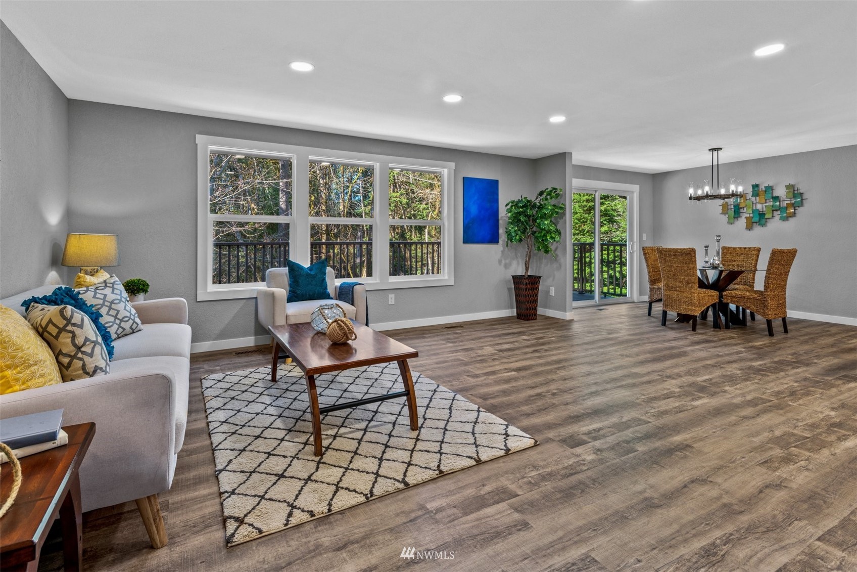 Move in ready! Beautifully refreshed 3 bed/2.5 bath home features new kitchen, new waterproof laminate, new carpet, new paint inside out, new ss appliances, quartz countertops . Lots of storage space downstairs features: bedroom, bath, laundry, wet bar, and separate entrance. Rental opportunity or MIL! Huge deck, attached two car garage and driveway parking. Extra laundry in garage. Easy access to Hwy, shopping and restaurants. Don't miss this one. Close to everything but yet private!