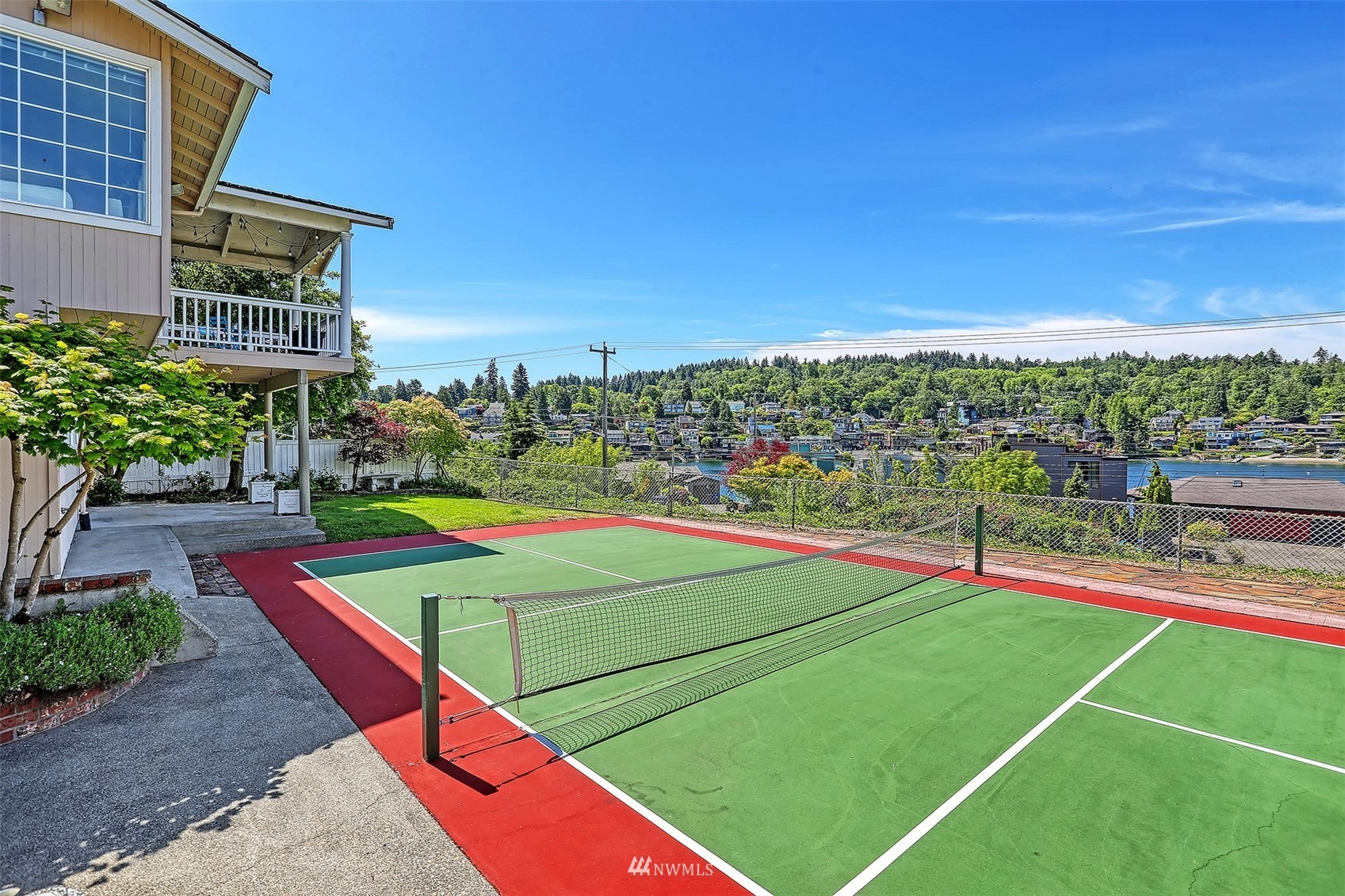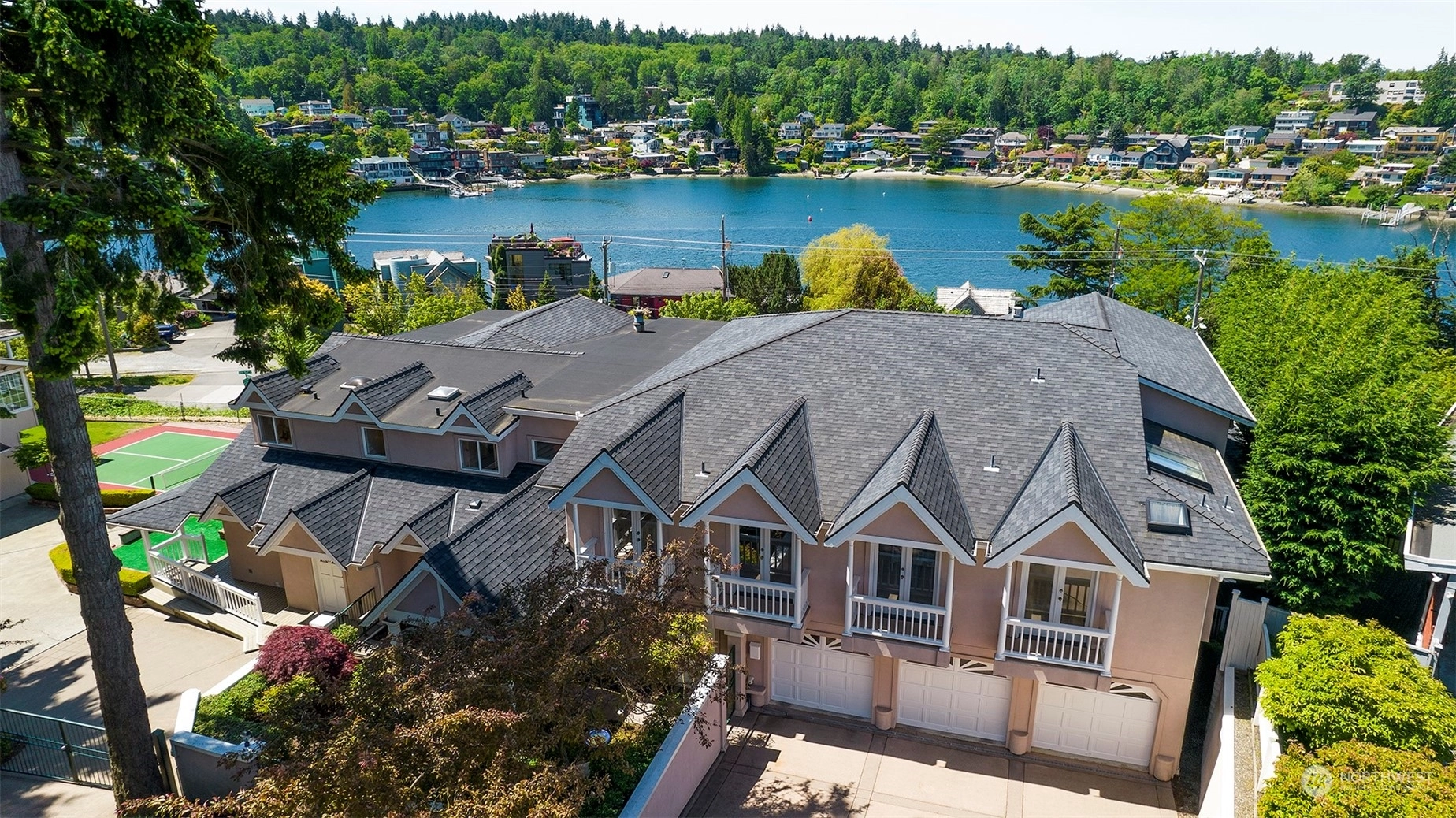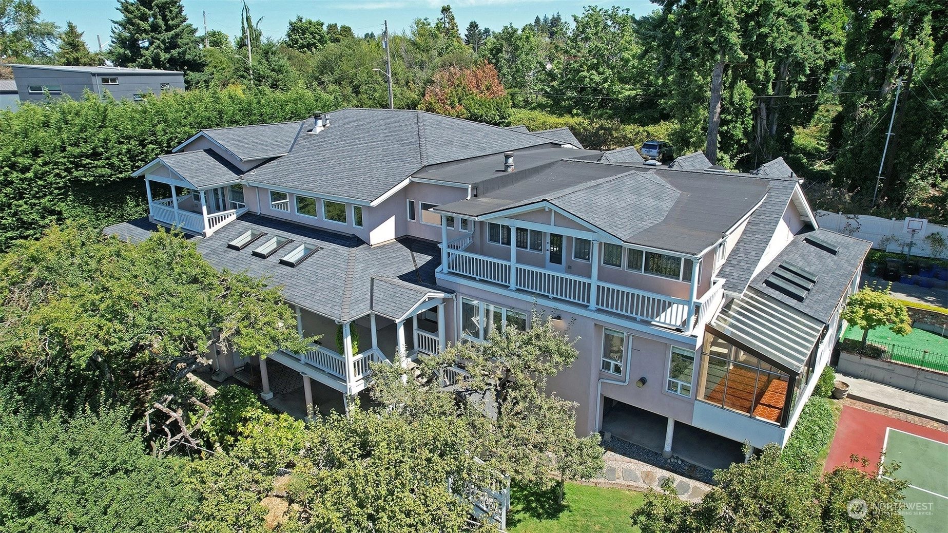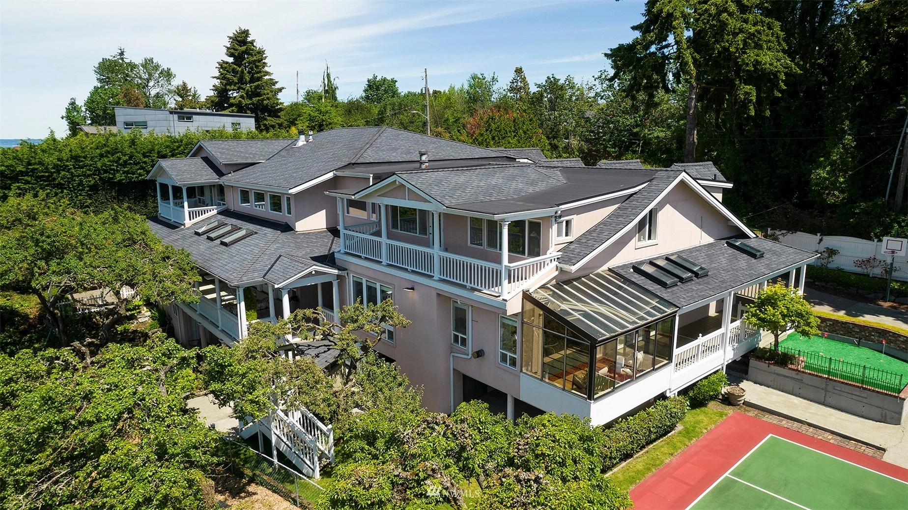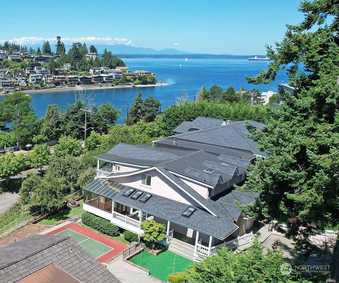 Unbelievable new price for this remarkable estate- 20,237 sq ft lot, custom home, views of the Salmon Bay Waterway, Puget Sound and Olympics and wonderful inside and outside entertaining areas. Property includes main house with rare indoor squash court, guesthouse, pickleball court, putting green, play/garden spaces. Main house features large formal rooms with soaring wood beamed ceilings opening to expansive veranda, kitchen with eating/informal living area, wet bar and gathering hall. Second floor offers view primary suite; five guest bedrooms, flex room for office/den, laundry. Lower level rec room, party kitchen, gallery area overlook squash court. Guest space over detached garage with kitchen, living, bedroom, 3/4 bath. 6 garage spaces
