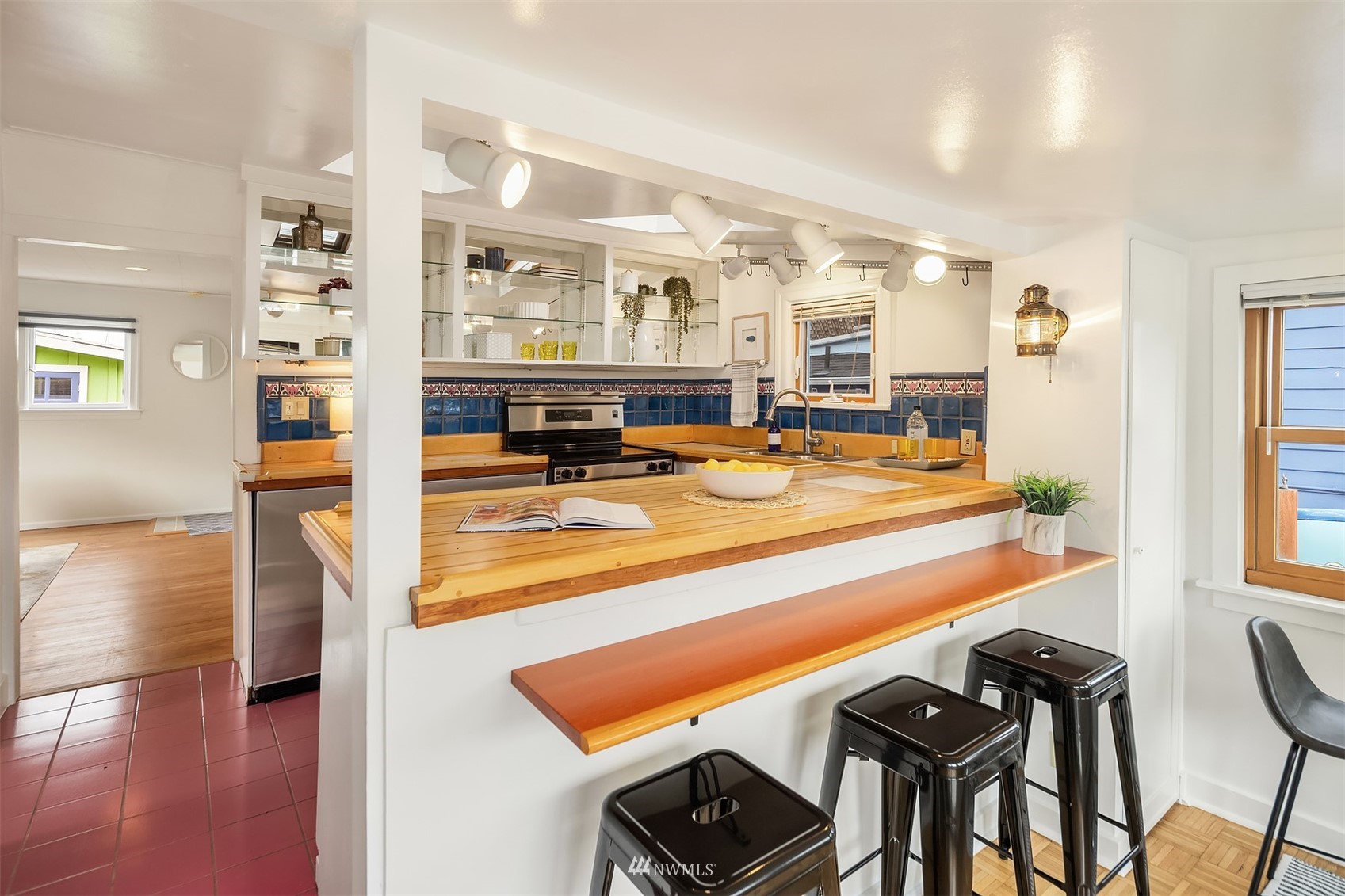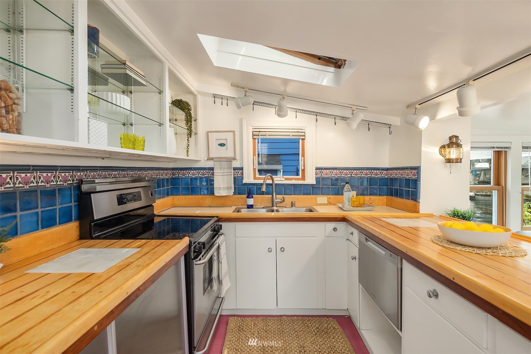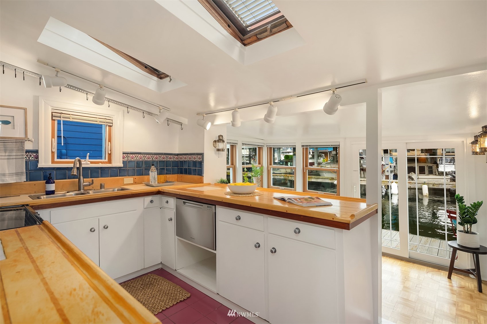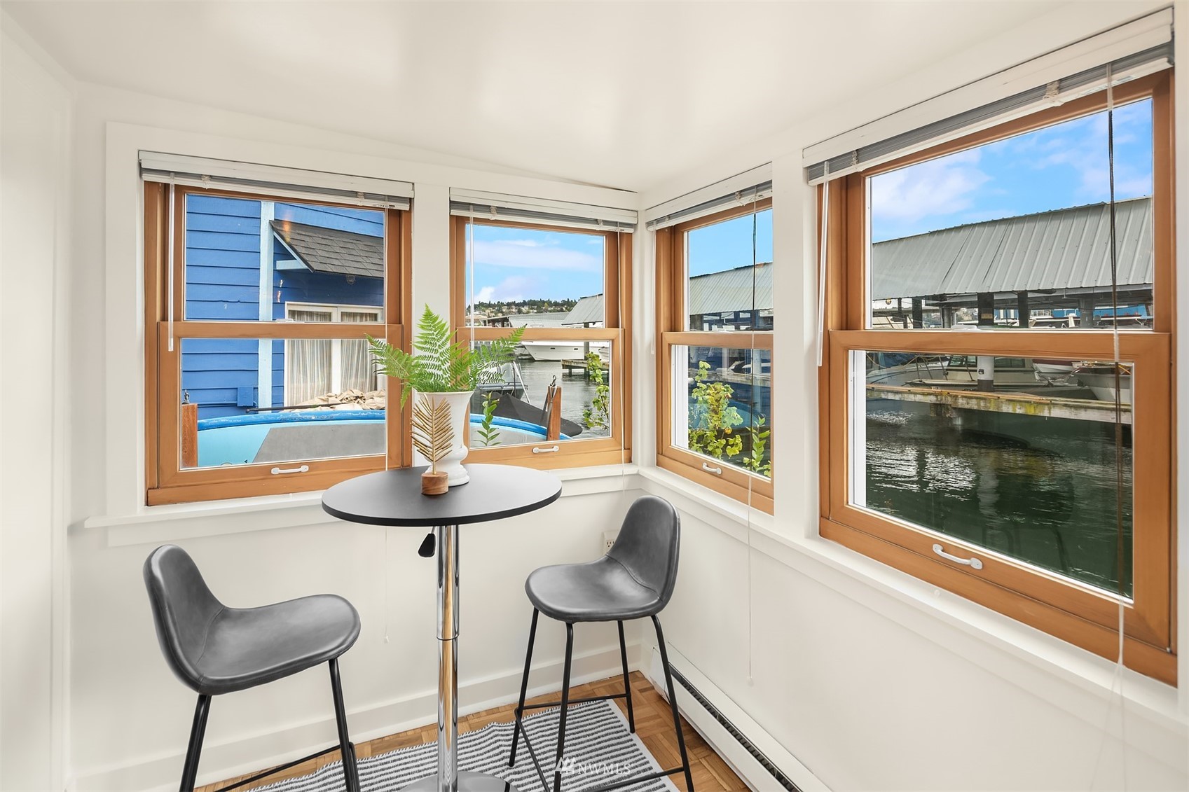 Charming floating home on Lake Union! This light and bright cottage is quintessential Seattle living. Whether you’re looking to get into the water on your paddle board or kayak, sit on your deck to take in the peace & quiet and the ever changing views of the lake, or entertain guests (think 4th of July fireworks), you can do it all here. This cozy home offers a spacious living room, galley kitchen with butcher block countertops and stainless steel appliances, sun room, two bedrooms, and roomy bathroom with washer/dryer. Enjoy fresh paint throughout, hardwood floors, additional storage on dock, energy efficient ductless mini-split, and more. Friendly co-op community and pets allowed. Close to all Fremont, SLU and Downtown have to offer.