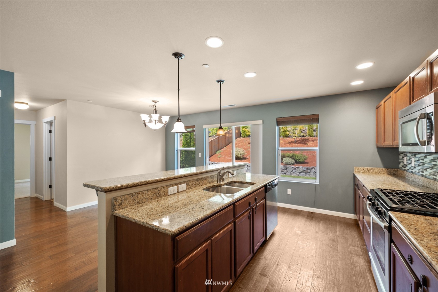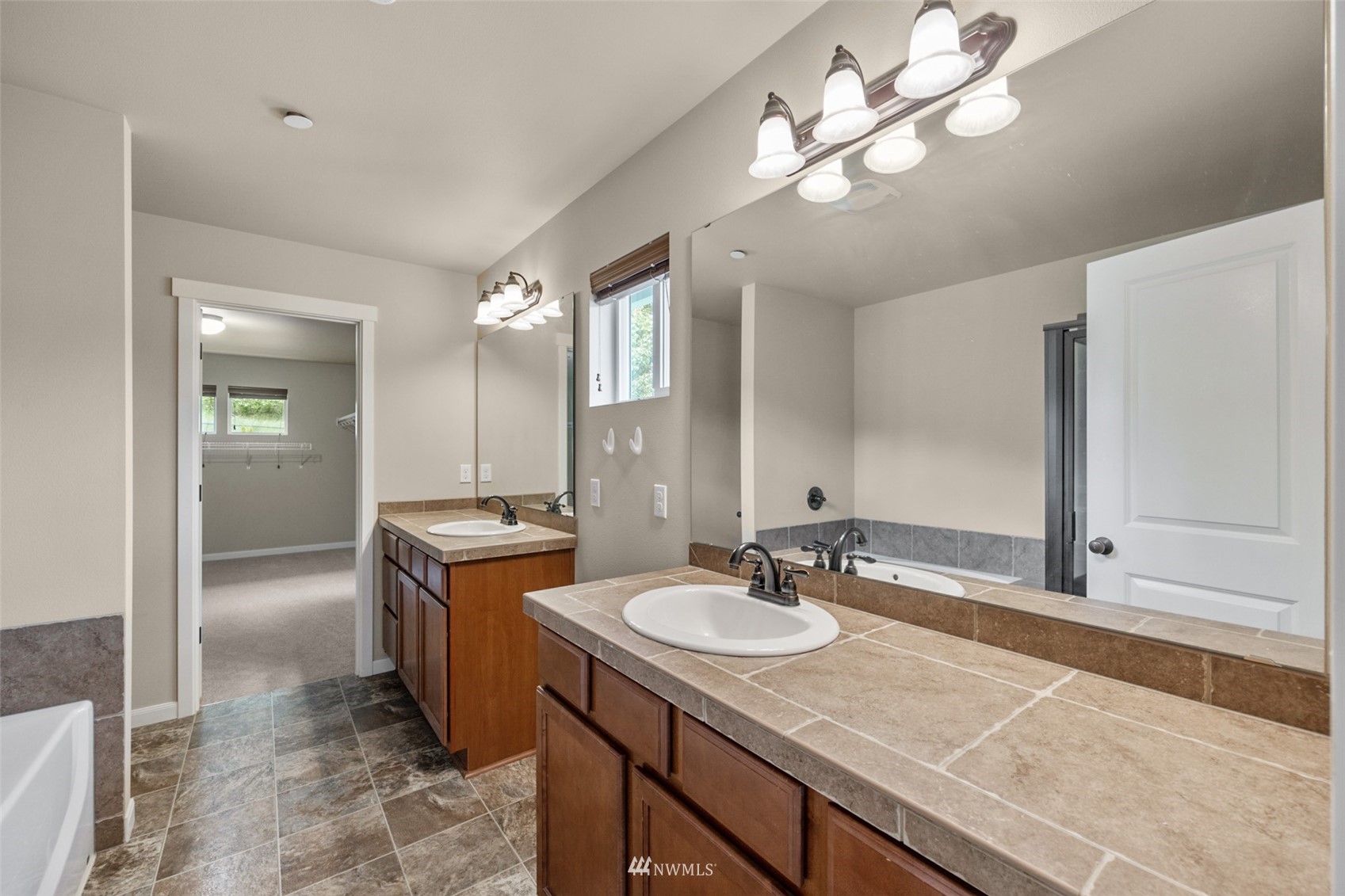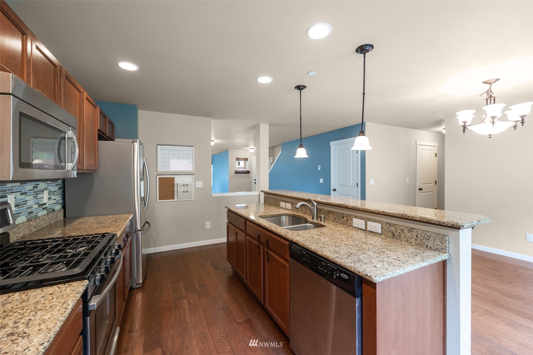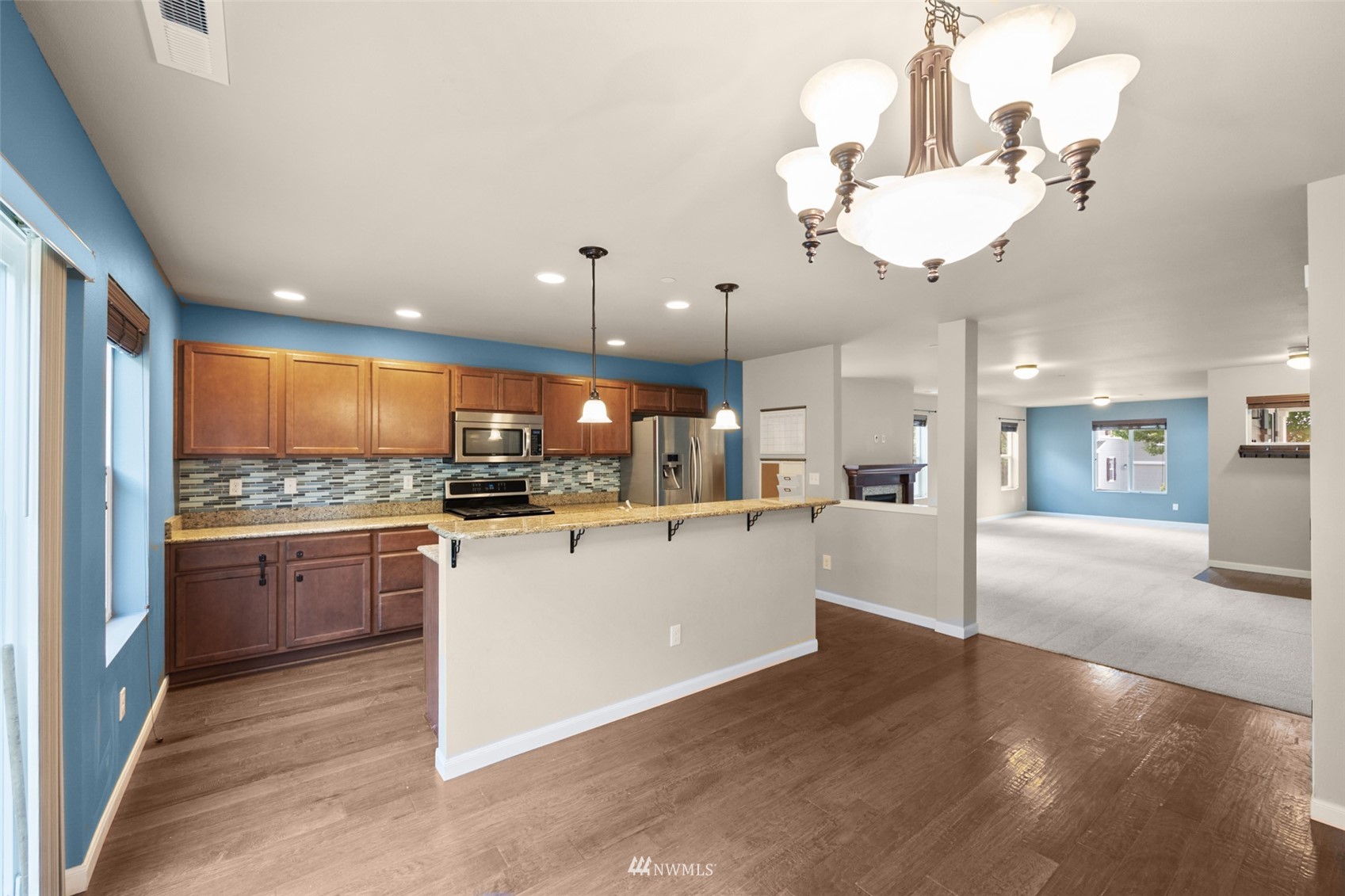 If space & privacy is what you’re looking for, this property is it! Enter into the spacious great room w/ gas fireplace, perfect for entertaining or relaxing! Enjoy the beautiful kitchen w/ granite countertops, tile backsplash, stainless steel appliances, breakfast bar, dining area & engineered hardwood floors. Expansive back patio with beautifully landscaped, fully fenced backyard that backs up to the walking trail. Main floor bedroom + full bathroom! Upstairs features a large loft area, secluded primary bedroom + 5-piece bath w/ soaker tub & huge walk-in closet! 2 additional guest bedrooms + full bathroom & laundry for convenience. 2 car garage w/ storage space & utility sink. Tankless water heater. Close to JBLM, I-5, shopping & dining.