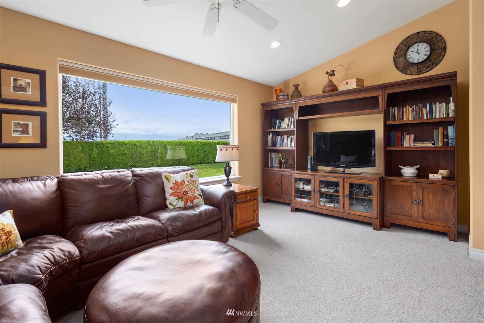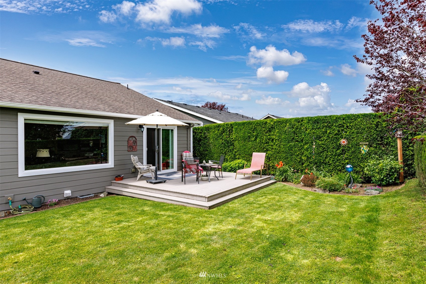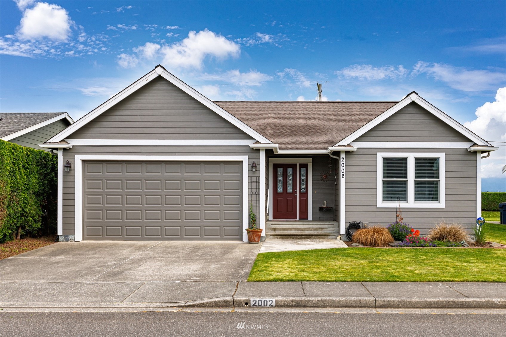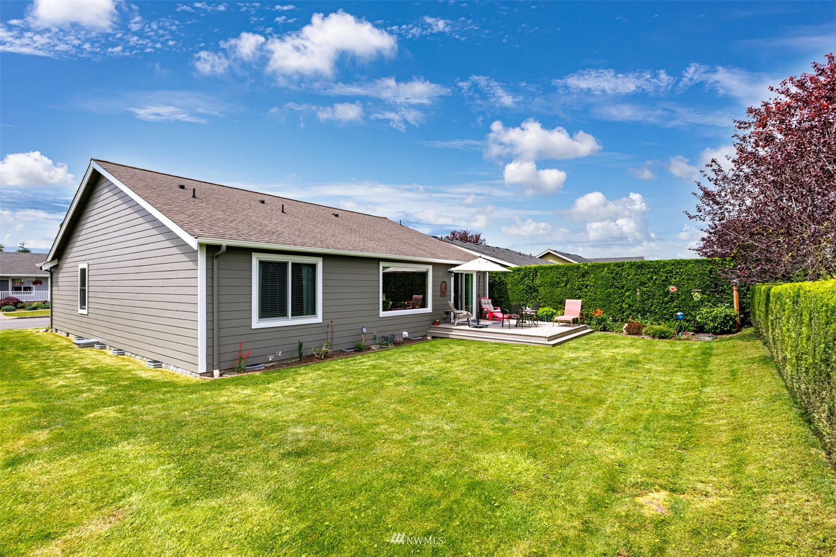 This pristine single level home has an open floor plan with magnificent Mount Baker views, and is on a large level lot with easily maintained landscaping surrounded by a private hedge. The living room is open to the dining and kitchen and has vaulted ceilings and large windows looking out to the views of Mt Baker and the Twin Sisters. The master is very spacious and also takes in those views, while the other two bedrooms are on the opposite side of the home giving privacy. There is an attached, oversized 2 car garage with pull-down stairs and attic storage. The kitchen has a large eating bar and an abundance of cabinets and counter space. This home has been meticulously maintained and there's secured RV parking available in this community.